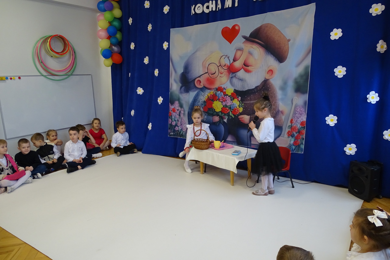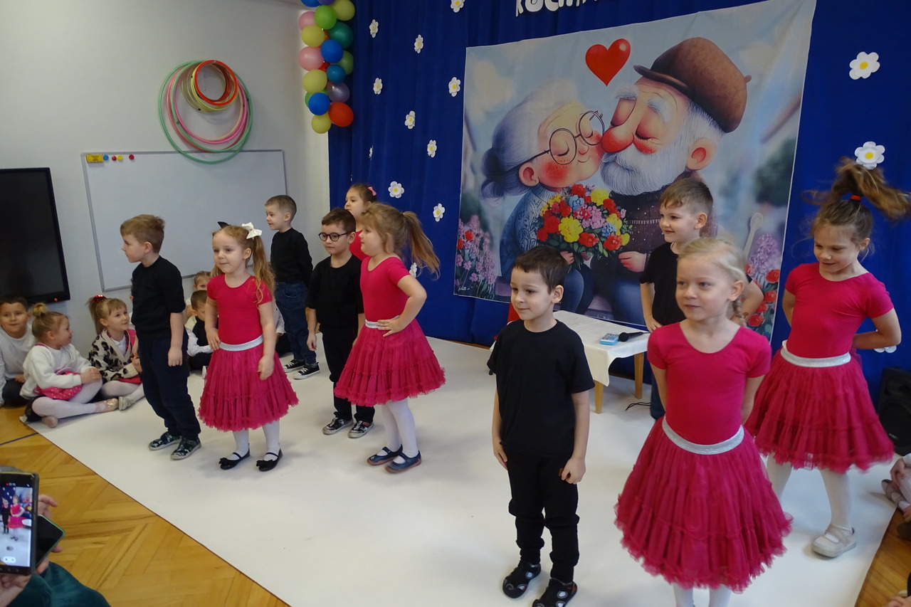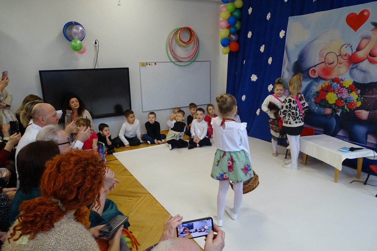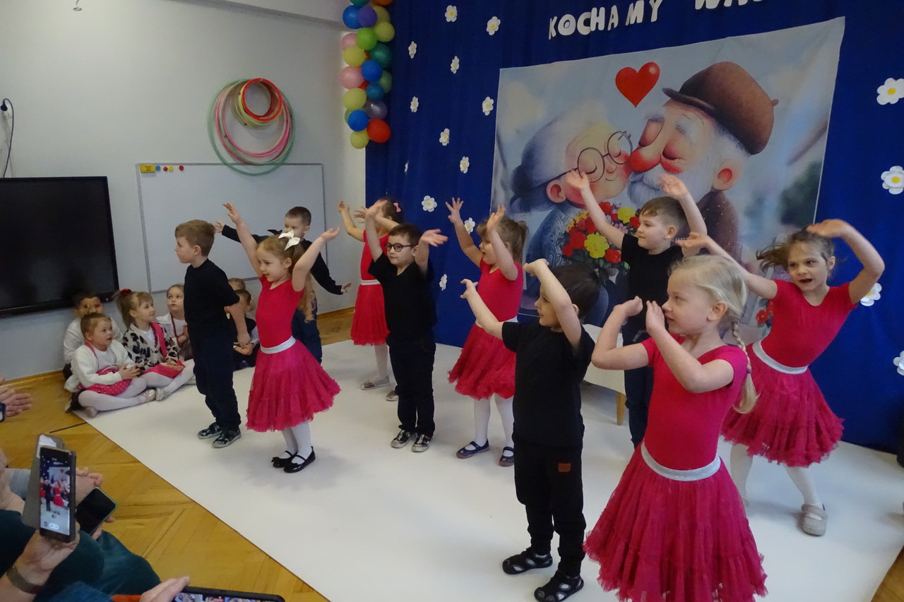 Dzieciaki pod czujnym okiem wychowawczyń zaprezentowały wiersze, piosenki oraz tańce. Każdy wnuczek i wnuczka własnoręcznie wykonały również dla swoich ukochanych dziadków drobny upominek. W przepięknej scenografii oraz wyjątkowej atmosferze, wnuczęta wspaniale wystąpiły przed bliskimi, wyrażając w ten sposób swoją miłość i wdzięczność za ich trud i oddanie. Goście ze wzruszeniem patrzyli na swoje pociechy i brawami dziękowali za występy. To były naprawdę wyjątkowa uroczystość, pełna uśmiechu, radości i dumy. Szczęśliwe i rozpromienione twarze dziadków dały wyraz tego, jak ważne są takie spotkania i chwile spędzone wspólnie z wnukami.