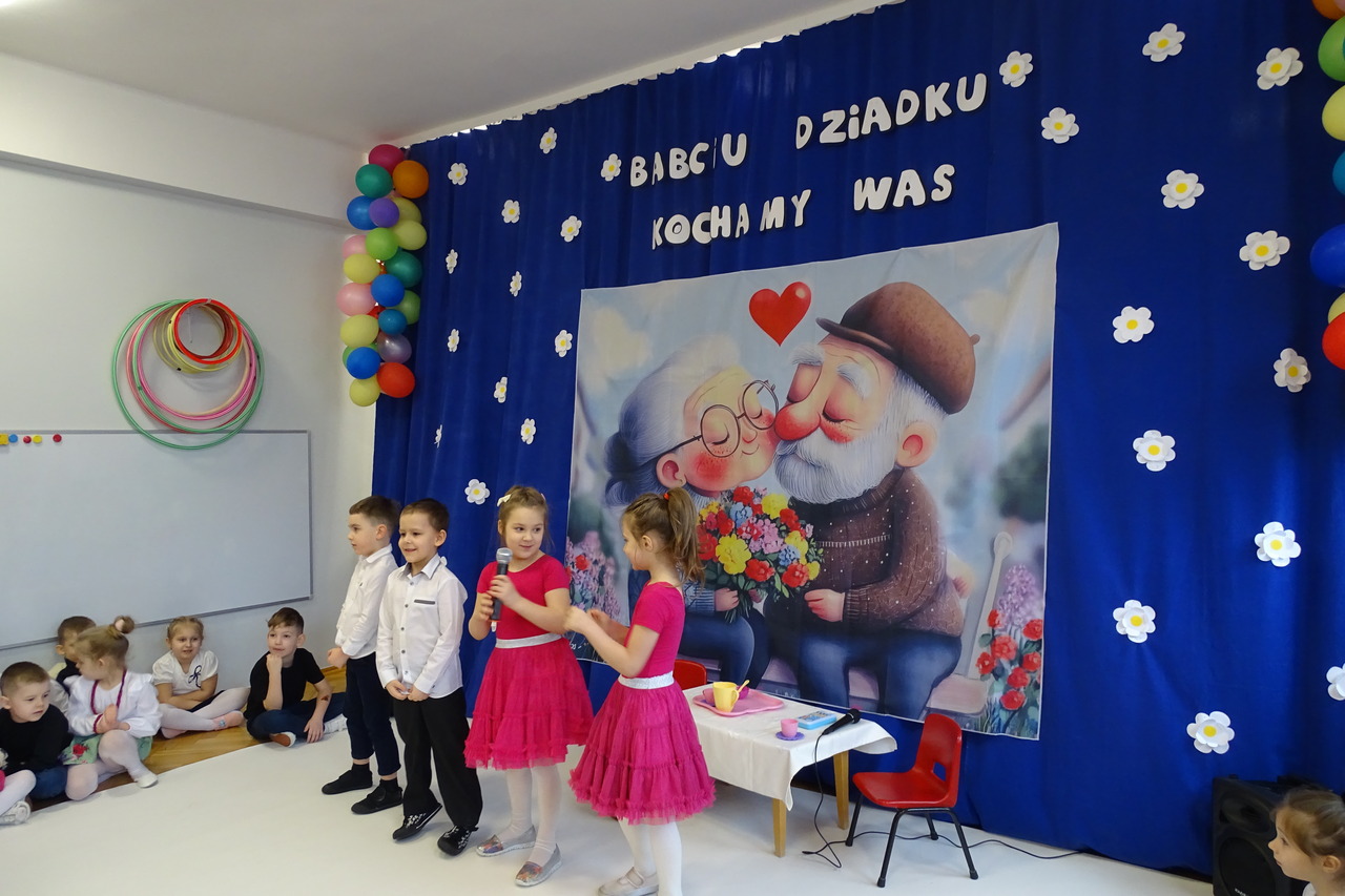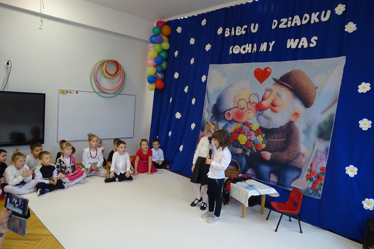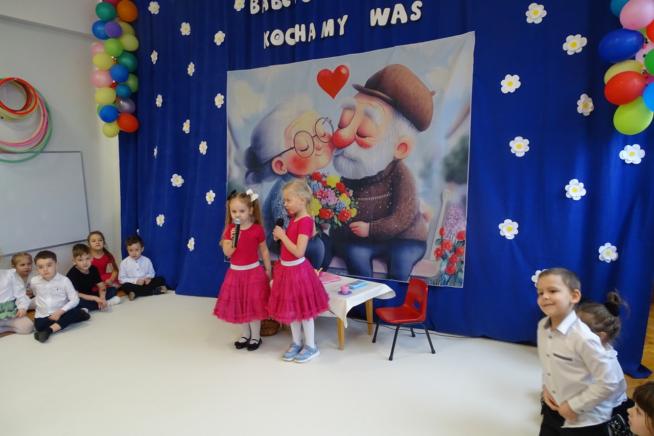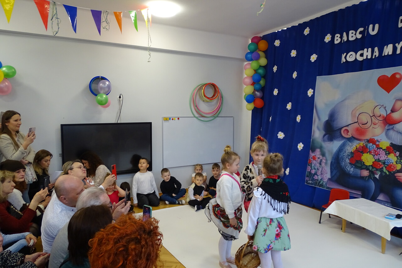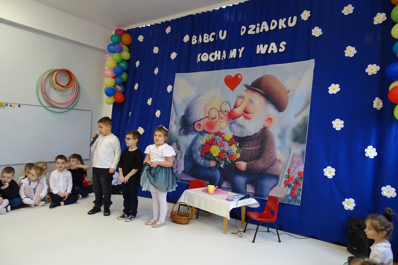 Dzieciaki pod czujnym okiem wychowawczyń zaprezentowały wiersze, piosenki oraz tańce. Każdy wnuczek i wnuczka własnoręcznie wykonały również dla swoich ukochanych dziadków drobny upominek. W przepięknej scenografii oraz wyjątkowej atmosferze, wnuczęta wspaniale wystąpiły przed bliskimi, wyrażając w ten sposób swoją miłość i wdzięczność za ich trud i oddanie. Goście ze wzruszeniem patrzyli na swoje pociechy i brawami dziękowali za występy. To były naprawdę wyjątkowa uroczystość, pełna uśmiechu, radości i dumy. Szczęśliwe i rozpromienione twarze dziadków dały wyraz tego, jak ważne są takie spotkania i chwile spędzone wspólnie z wnukami.