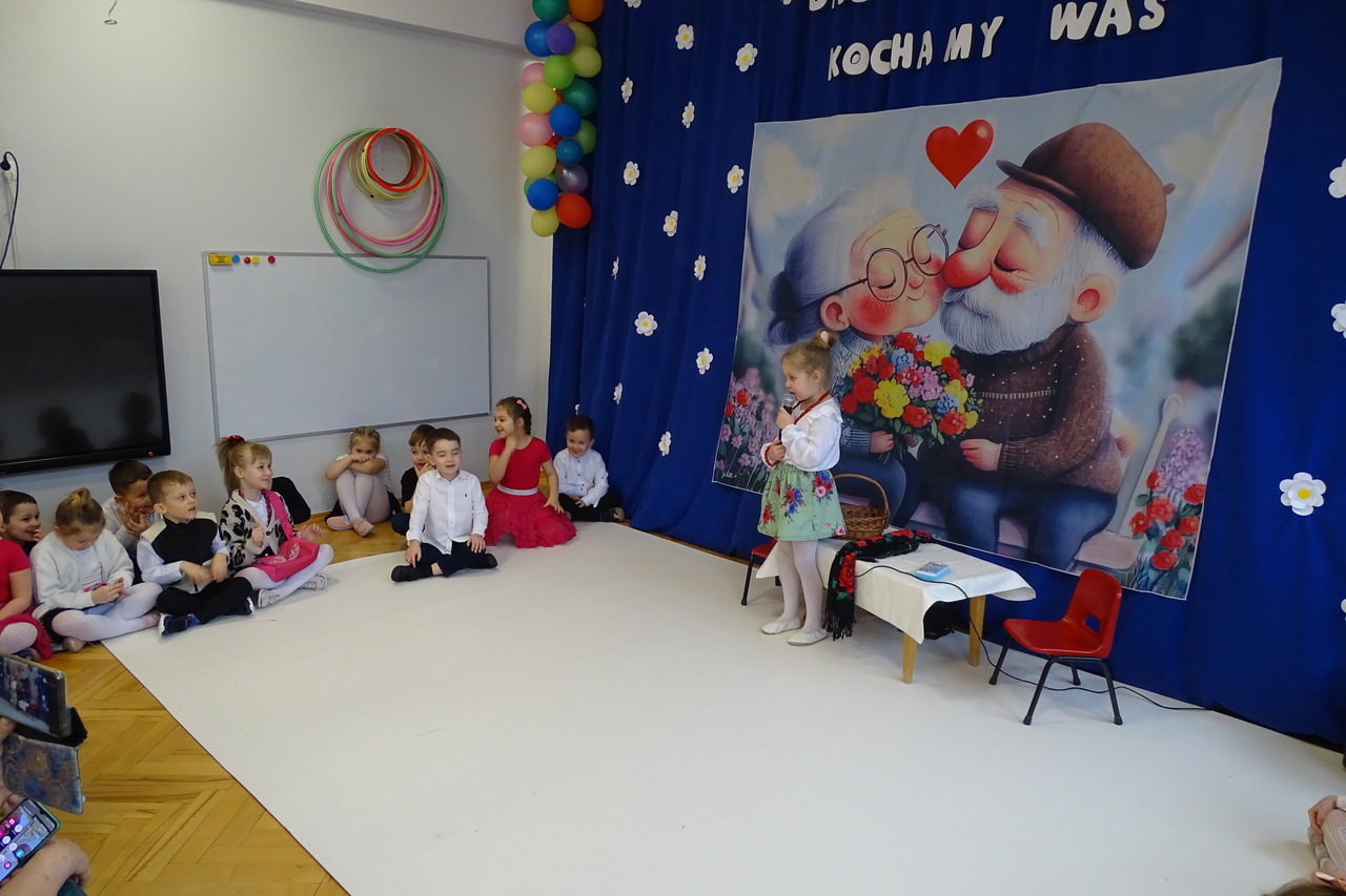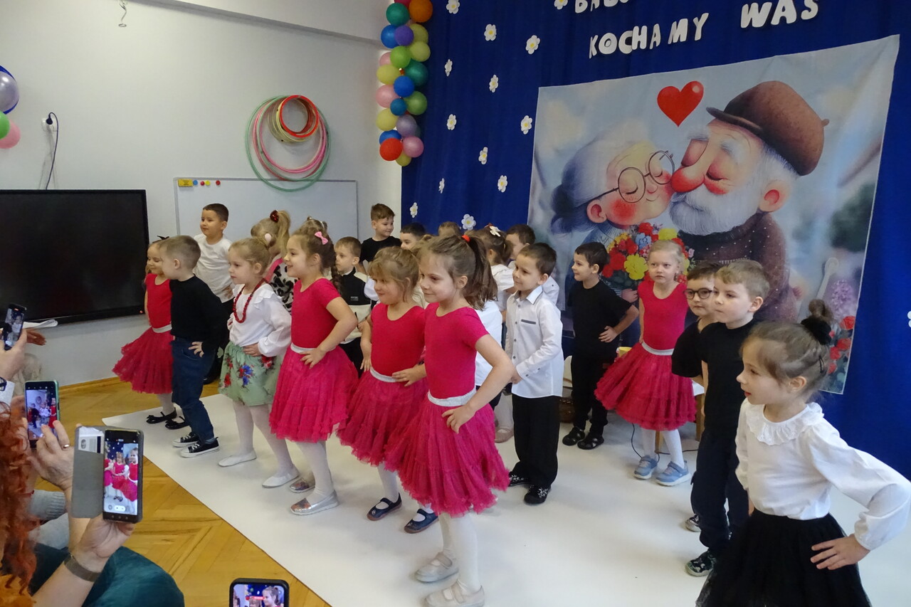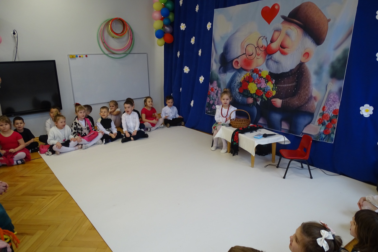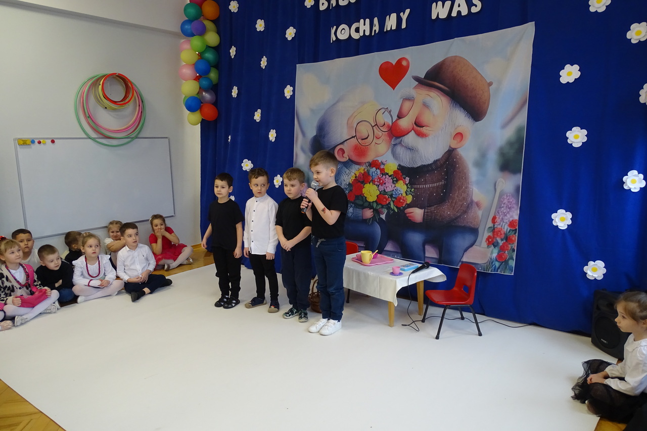 Dzieciaki pod czujnym okiem wychowawczyń zaprezentowały wiersze, piosenki oraz tańce. Każdy wnuczek i wnuczka własnoręcznie wykonały również dla swoich ukochanych dziadków drobny upominek. W przepięknej scenografii oraz wyjątkowej atmosferze, wnuczęta wspaniale wystąpiły przed bliskimi, wyrażając w ten sposób swoją miłość i wdzięczność za ich trud i oddanie. Goście ze wzruszeniem patrzyli na swoje pociechy i brawami dziękowali za występy. To były naprawdę wyjątkowa uroczystość, pełna uśmiechu, radości i dumy. Szczęśliwe i rozpromienione twarze dziadków dały wyraz tego, jak ważne są takie spotkania i chwile spędzone wspólnie z wnukami.