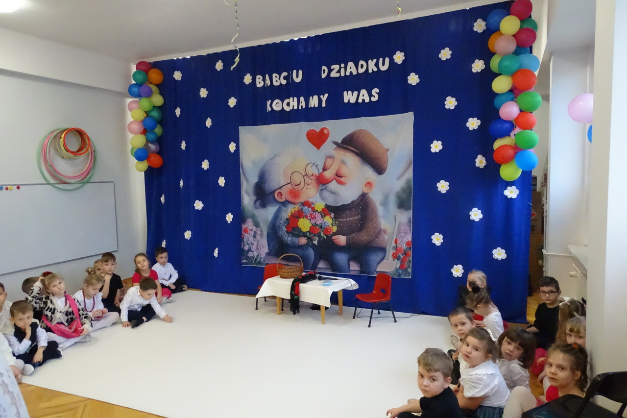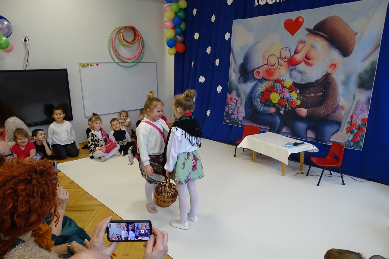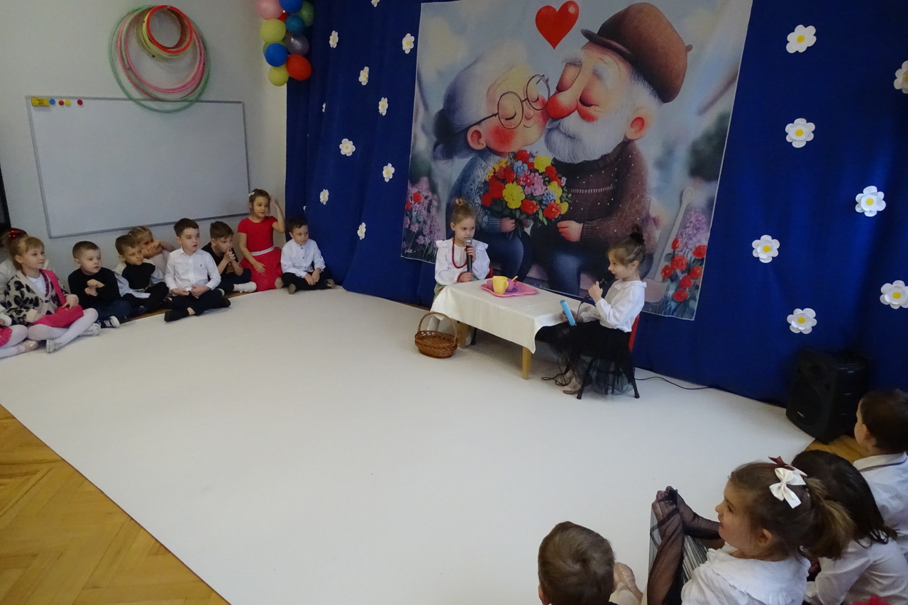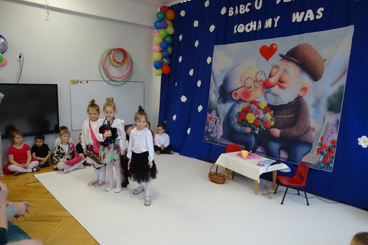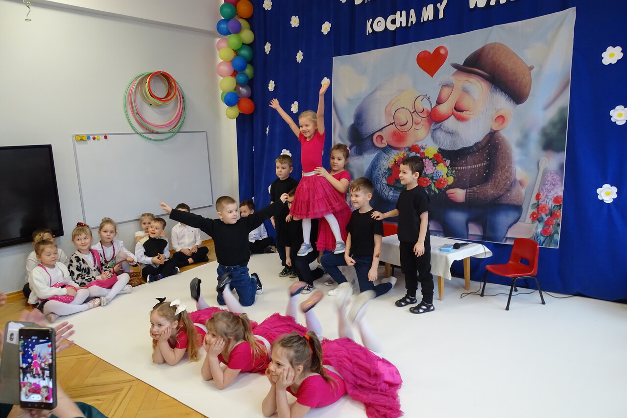 Dzieciaki pod czujnym okiem wychowawczyń zaprezentowały wiersze, piosenki oraz tańce. Każdy wnuczek i wnuczka własnoręcznie wykonały również dla swoich ukochanych dziadków drobny upominek. W przepięknej scenografii oraz wyjątkowej atmosferze, wnuczęta wspaniale wystąpiły przed bliskimi, wyrażając w ten sposób swoją miłość i wdzięczność za ich trud i oddanie. Goście ze wzruszeniem patrzyli na swoje pociechy i brawami dziękowali za występy. To były naprawdę wyjątkowa uroczystość, pełna uśmiechu, radości i dumy. Szczęśliwe i rozpromienione twarze dziadków dały wyraz tego, jak ważne są takie spotkania i chwile spędzone wspólnie z wnukami.