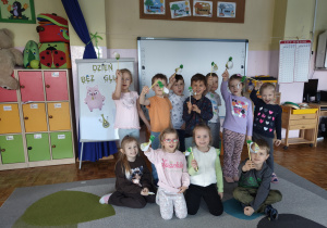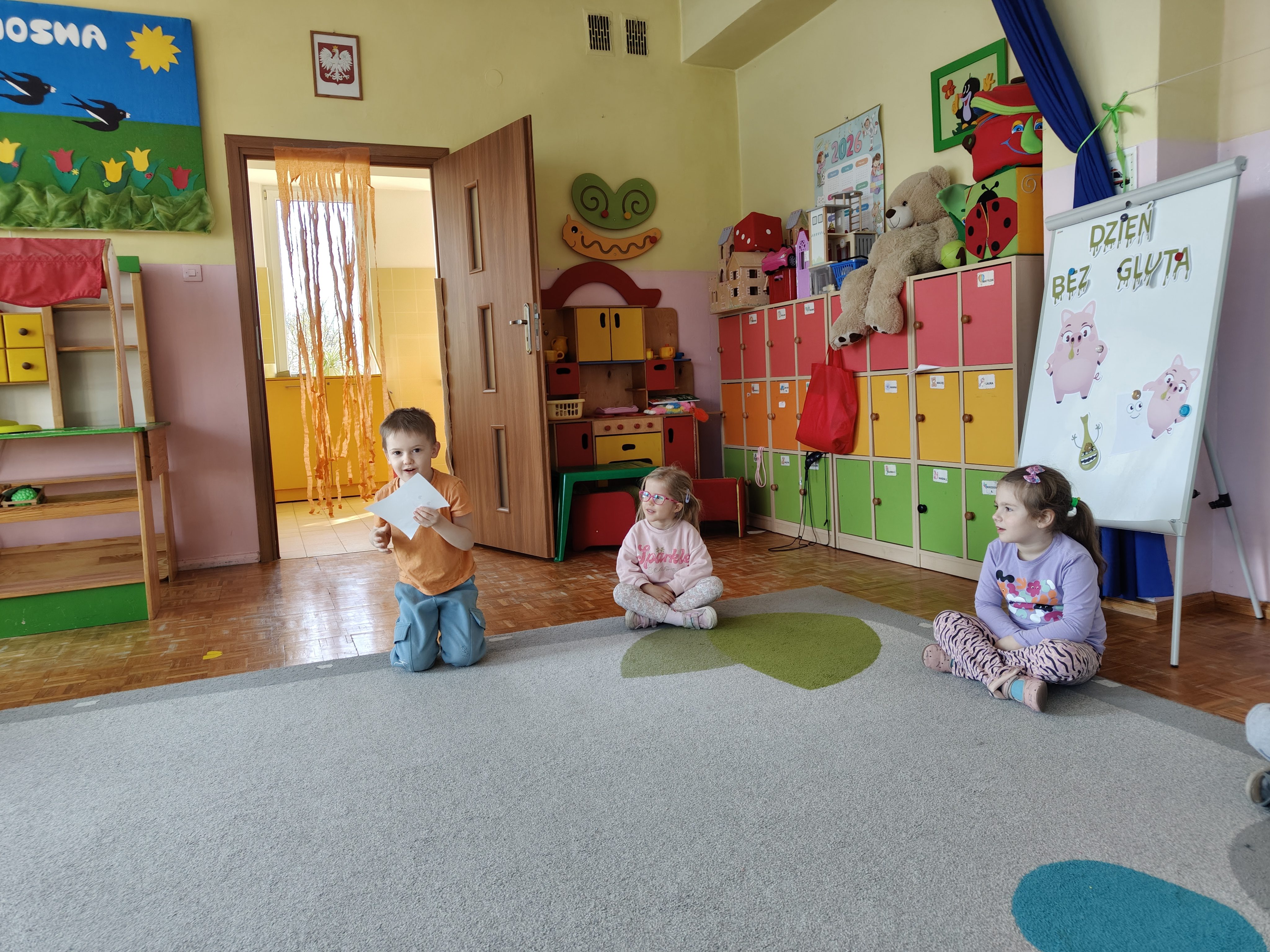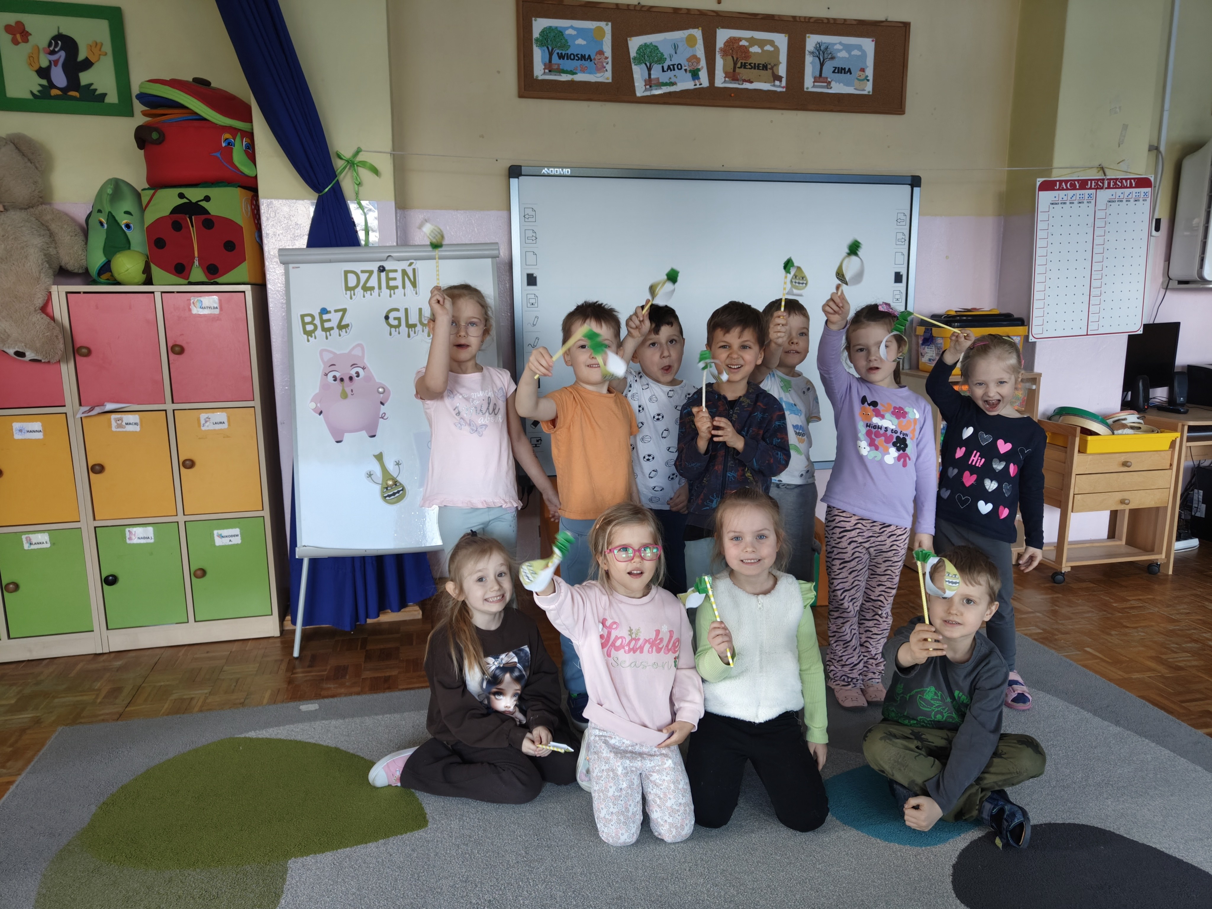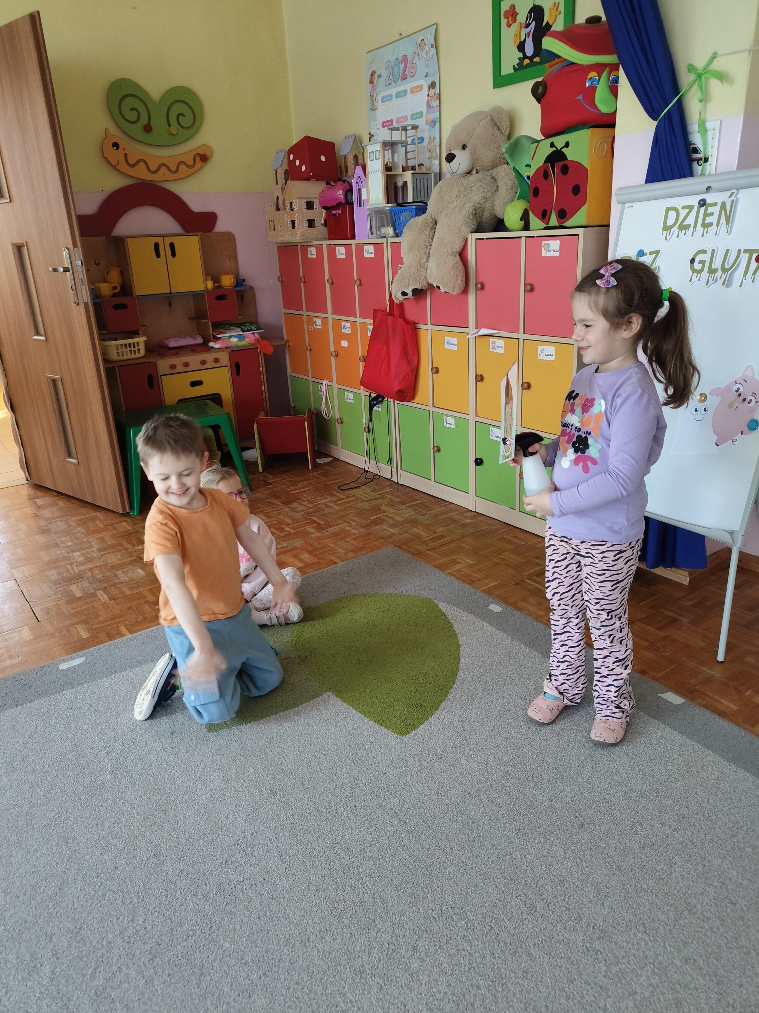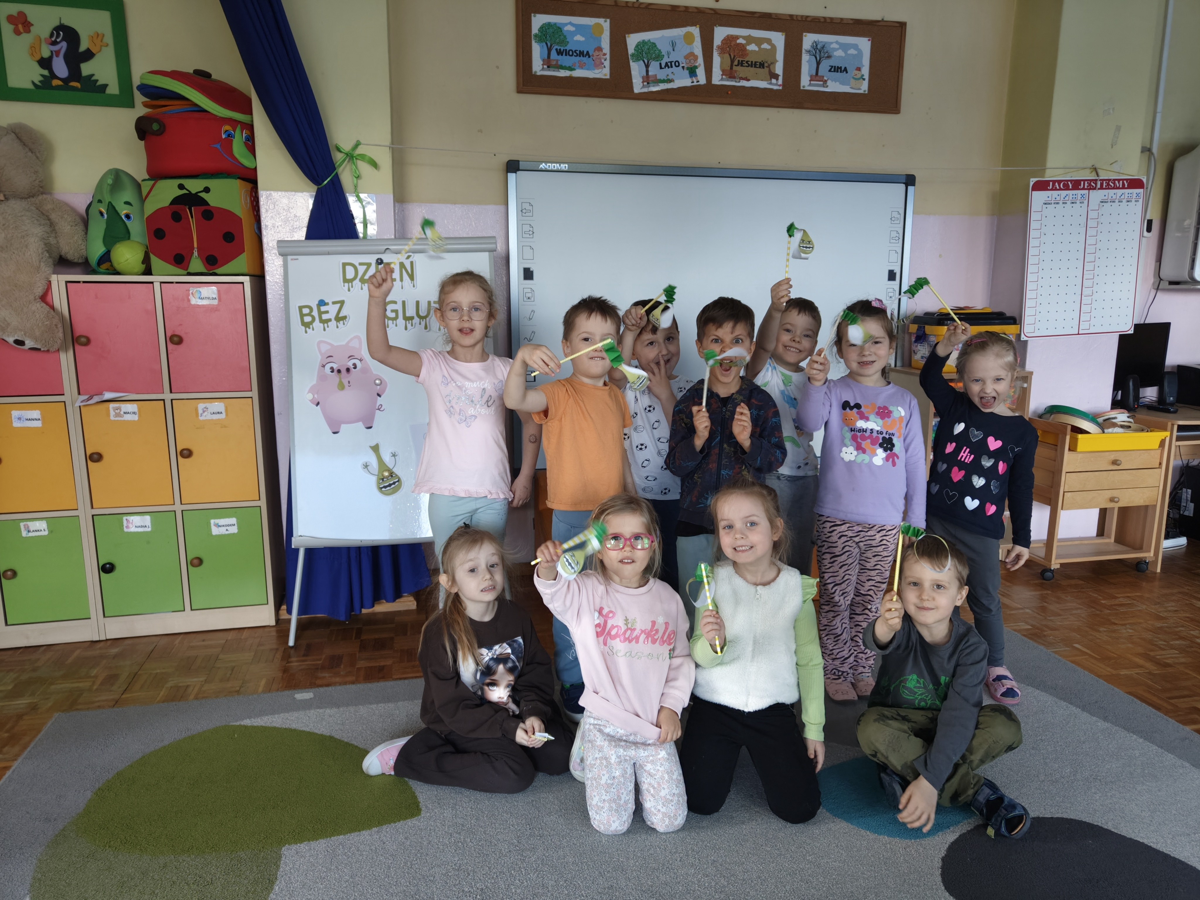 Podczas realizacji „Dnia bez gluta” w ramach programu Czyściochów organizowanego przez Rossmann, dzieci w ciekawy i angażujący sposób poznawały zasady higieny związane z katarem i kichaniem. W trakcie zajęć przedszkolaki dowiedziały się, jak prawidłowo dbać o higienę nosa – ćwiczyły samodzielne oczyszczanie nosa przy użyciu chusteczki oraz uczyły się poprawnego dmuchania, raz jedną, raz drugą dziurką. Zrozumiały także, jak rozprzestrzeniają się choroby oraz dlaczego nie powinno się przychodzić do przedszkola podczas infekcji. Szczególny nacisk położono na znaczenie higieny nosa i rąk w zapobieganiu chorobom. Zajęcia miały również formę zabawy – dzieci z radością uczestniczyły w „glutozie”, która wzbudziła wiele śmiechu i pozytywnych emocji. Na zakończenie każde dziecko wykonało własną „glutową różdżkę”, mającą symbolicznie odstraszać katar. Był to dzień pełen nauki poprzez zabawę, który pomógł dzieciom lepiej zrozumieć, jak dbać o zdrowie swoje i innych.