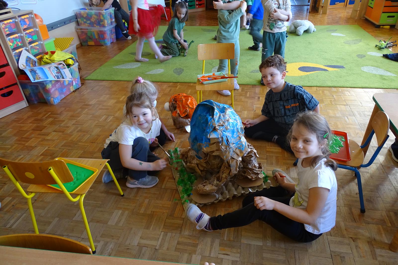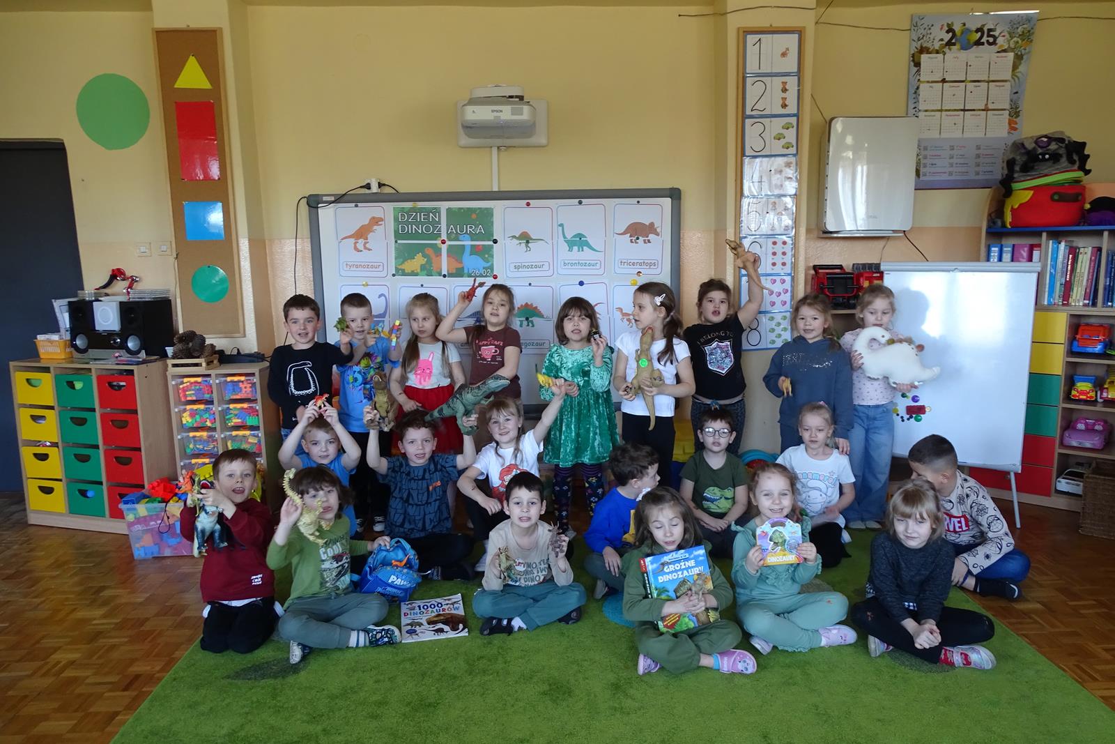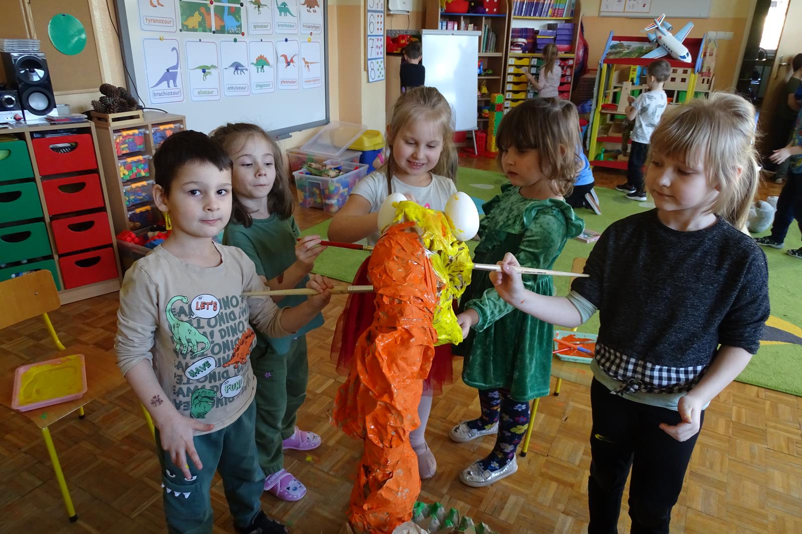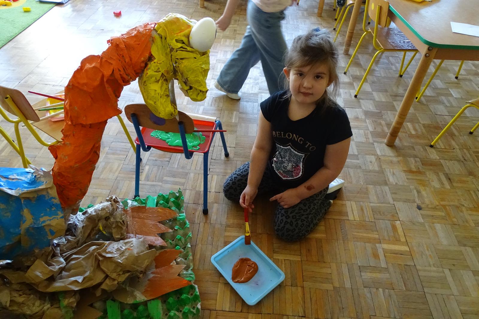 Ten dzień w przedszkolu był pełen emocji, ciekawych doświadczeń i niezwykłych odkryć. Dzieci wyruszyły w podróż do bardzo odległej przeszłości – do czasów, gdy po Ziemi chodziły dinozaury. Podczas rozmowy i wspólnych aktywności przedszkolaki poznawały różne gatunki tych prehistorycznych zwierząt. Dowiedziały się, jak wyglądały, czym się żywiły oraz jakie były przyczyny ich wyginięcia. Temat wzbudził wśród dzieci ogromne zainteresowanie i wiele pytań. W trakcie zajęć nie zabrakło także kreatywnych działań. Dzieci wspólnie wykonały dużego dinozaura z papieru – wycinały, przyklejały i ozdabiały poszczególne elementy, tworząc barwną pracę plastyczną. Była to świetna okazja do rozwijania wyobraźni oraz umiejętności manualnych. Dużo radości przyniosła również zabawa związana z orientacją w przestrzeni. Przedszkolaki tworzyły na chodniku „dinozaurową drogę”, po której poruszały się zgodnie z podanymi wskazówkami, utrwalając kierunki takie jak: w prawo, w lewo, do przodu czy do tyłu. Dzieci uczyły się przy tym współpracy, koncentracji oraz uważnego słuchania poleceń. Nie zabrakło także czasu na prezentację własnych dinozaurów, które dzieci przyniosły z domu i z dumą pokazywały kolegom oraz koleżankom. Każde dziecko mogło opowiedzieć o swoim ulubionym dinozaurze. Przedszkolaki wyruszyły także na poszukiwanie ukrytych dinozaurów na przedszkolnym placu zabaw. Z wielkim zaangażowaniem przeszukiwały różne zakamarki, a odnalezienie każdej figurki wywoływało dużo radości i śmiechu.