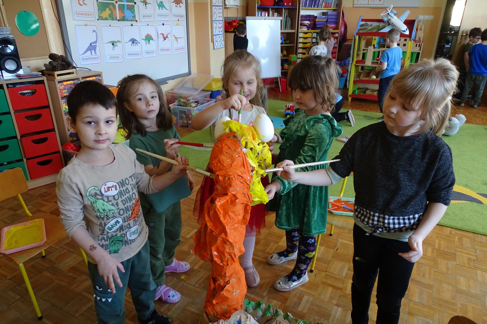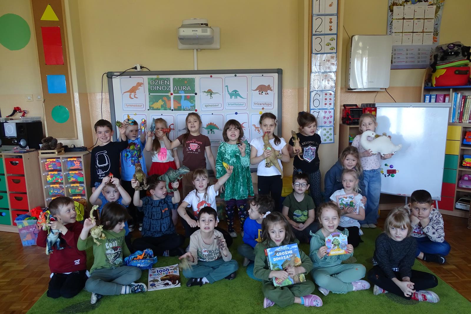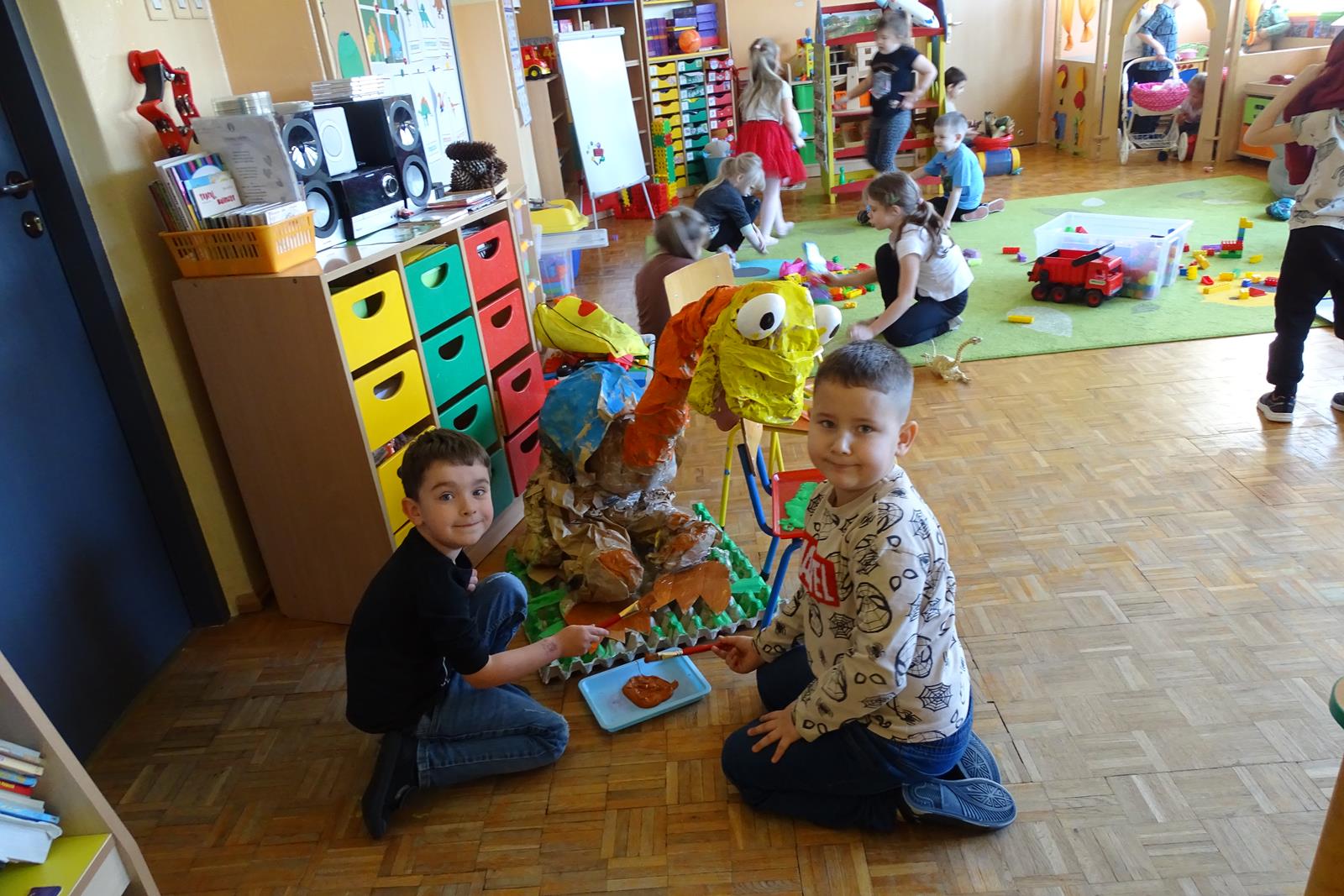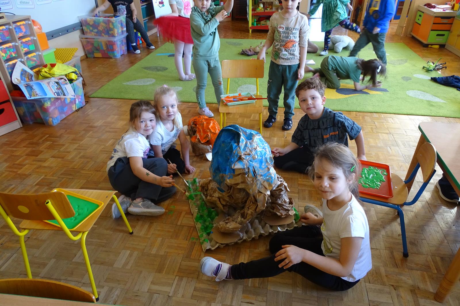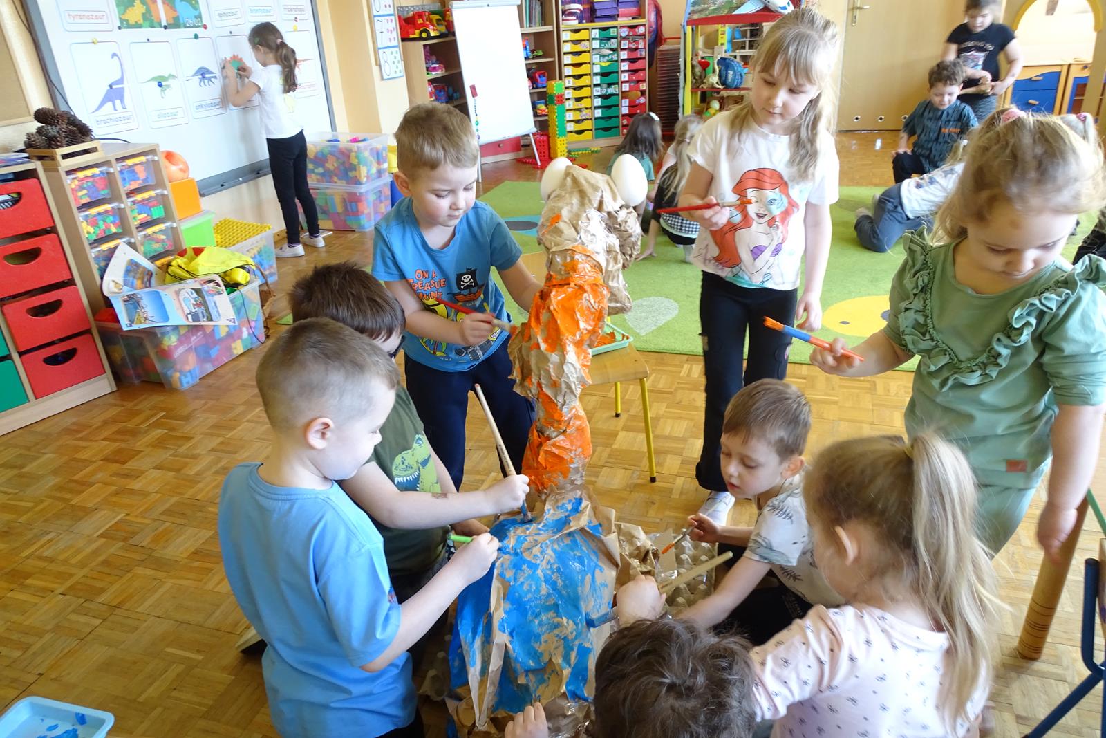 Ten dzień w przedszkolu był pełen emocji, ciekawych doświadczeń i niezwykłych odkryć. Dzieci wyruszyły w podróż do bardzo odległej przeszłości – do czasów, gdy po Ziemi chodziły dinozaury. Podczas rozmowy i wspólnych aktywności przedszkolaki poznawały różne gatunki tych prehistorycznych zwierząt. Dowiedziały się, jak wyglądały, czym się żywiły oraz jakie były przyczyny ich wyginięcia. Temat wzbudził wśród dzieci ogromne zainteresowanie i wiele pytań. W trakcie zajęć nie zabrakło także kreatywnych działań. Dzieci wspólnie wykonały dużego dinozaura z papieru – wycinały, przyklejały i ozdabiały poszczególne elementy, tworząc barwną pracę plastyczną. Była to świetna okazja do rozwijania wyobraźni oraz umiejętności manualnych. Dużo radości przyniosła również zabawa związana z orientacją w przestrzeni. Przedszkolaki tworzyły na chodniku „dinozaurową drogę”, po której poruszały się zgodnie z podanymi wskazówkami, utrwalając kierunki takie jak: w prawo, w lewo, do przodu czy do tyłu. Dzieci uczyły się przy tym współpracy, koncentracji oraz uważnego słuchania poleceń. Nie zabrakło także czasu na prezentację własnych dinozaurów, które dzieci przyniosły z domu i z dumą pokazywały kolegom oraz koleżankom. Każde dziecko mogło opowiedzieć o swoim ulubionym dinozaurze. Przedszkolaki wyruszyły także na poszukiwanie ukrytych dinozaurów na przedszkolnym placu zabaw. Z wielkim zaangażowaniem przeszukiwały różne zakamarki, a odnalezienie każdej figurki wywoływało dużo radości i śmiechu.