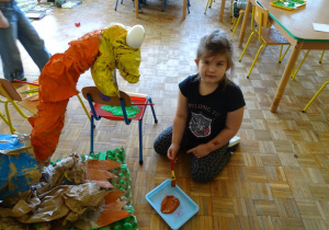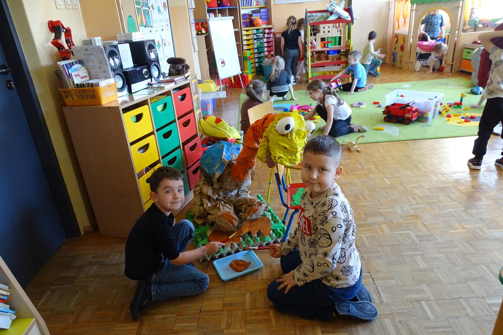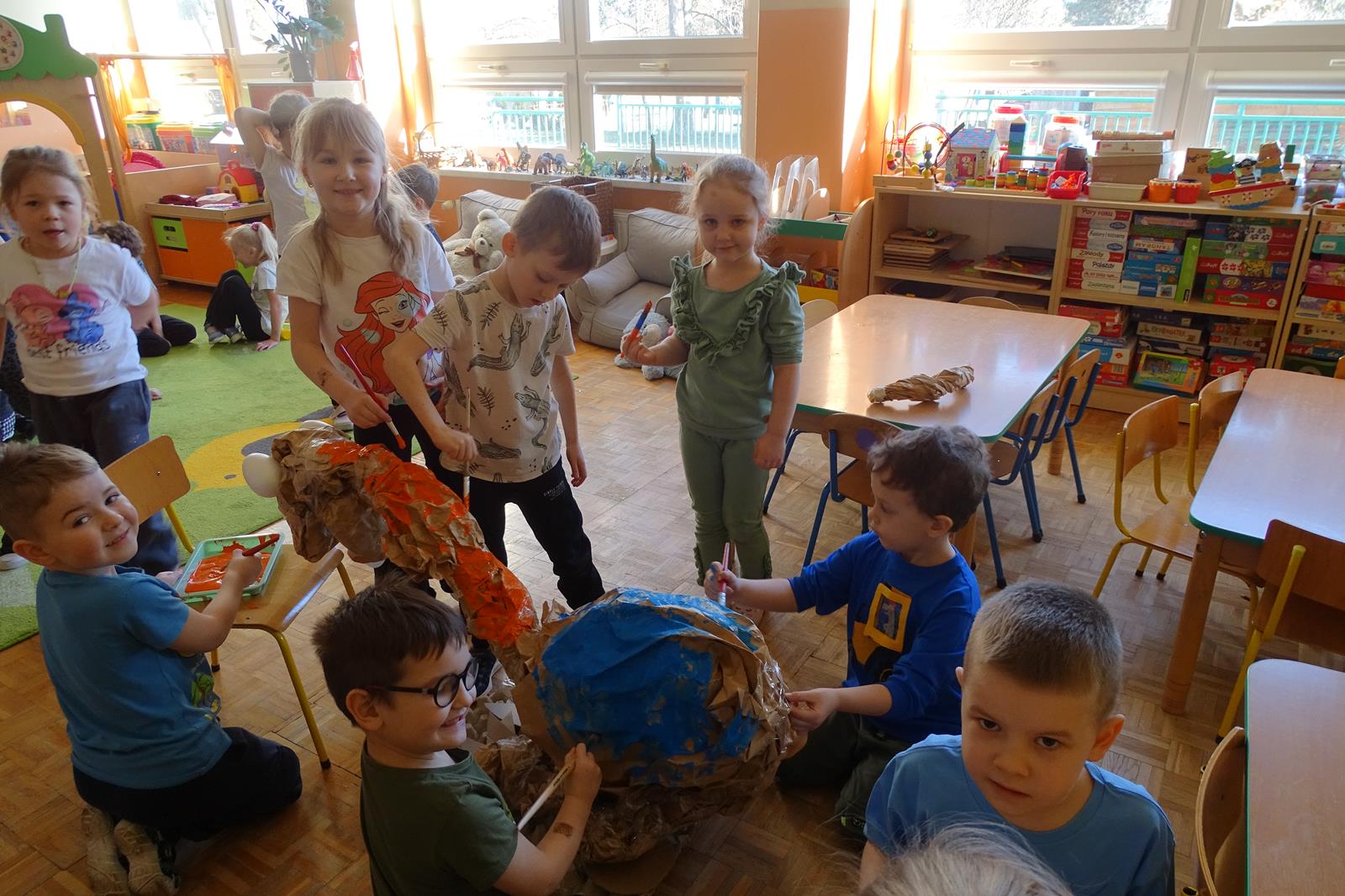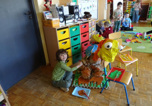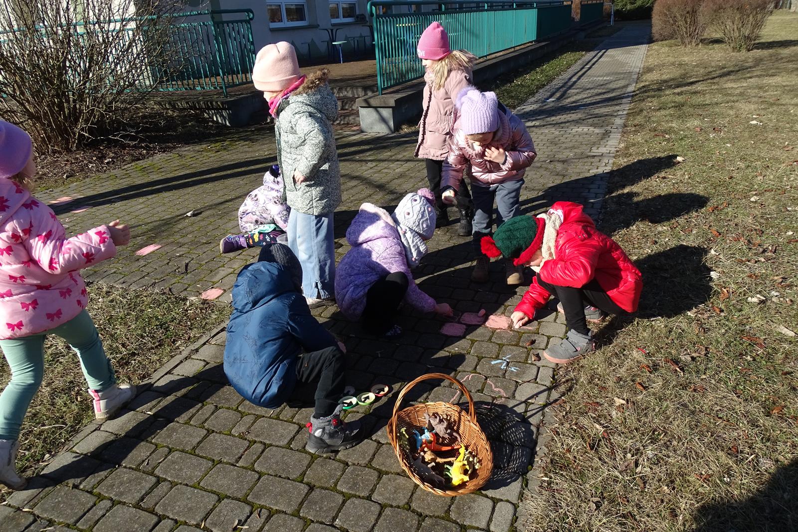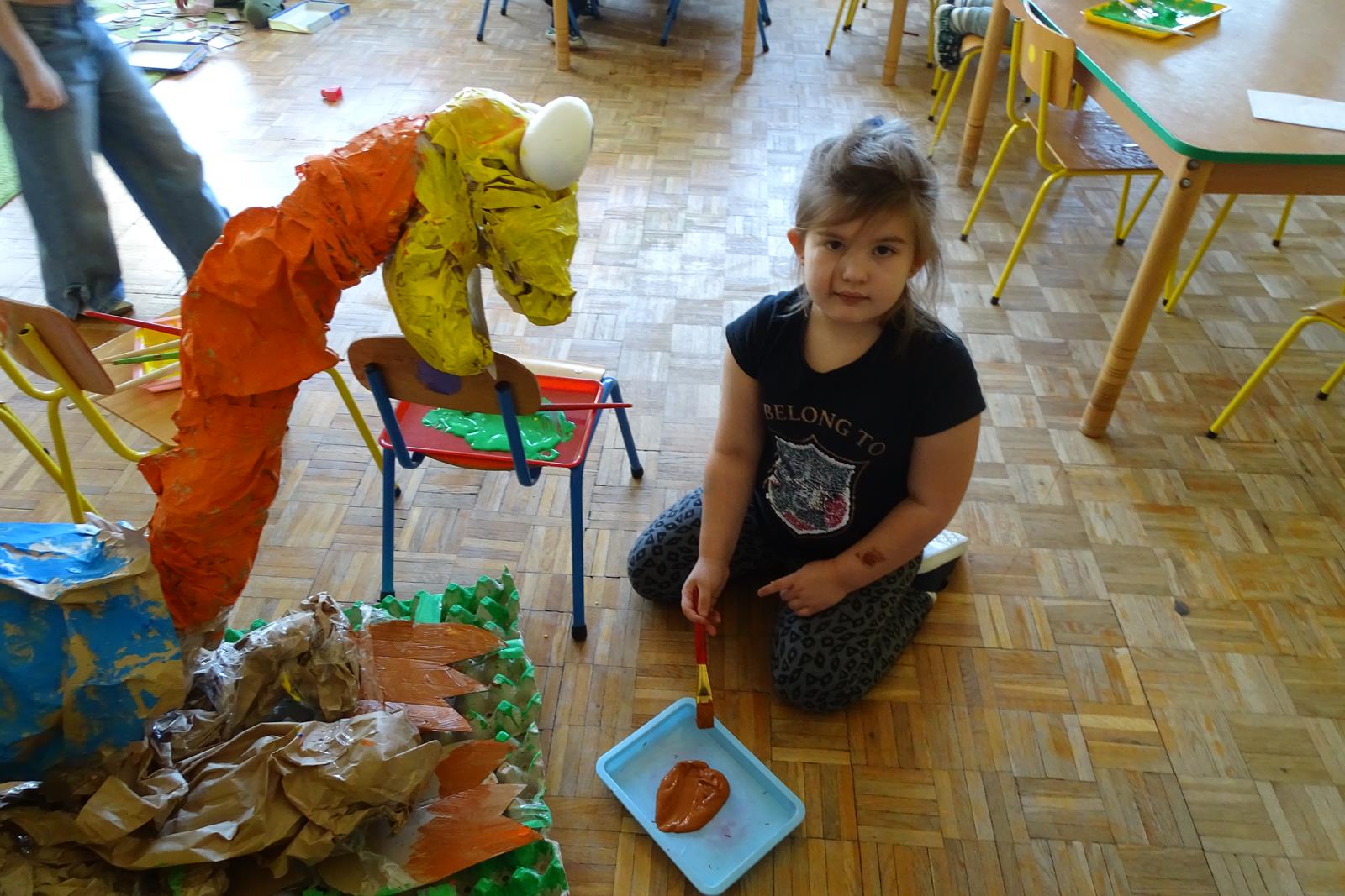 Ten dzień w przedszkolu był pełen emocji, ciekawych doświadczeń i niezwykłych odkryć. Dzieci wyruszyły w podróż do bardzo odległej przeszłości – do czasów, gdy po Ziemi chodziły dinozaury. Podczas rozmowy i wspólnych aktywności przedszkolaki poznawały różne gatunki tych prehistorycznych zwierząt. Dowiedziały się, jak wyglądały, czym się żywiły oraz jakie były przyczyny ich wyginięcia. Temat wzbudził wśród dzieci ogromne zainteresowanie i wiele pytań. W trakcie zajęć nie zabrakło także kreatywnych działań. Dzieci wspólnie wykonały dużego dinozaura z papieru – wycinały, przyklejały i ozdabiały poszczególne elementy, tworząc barwną pracę plastyczną. Była to świetna okazja do rozwijania wyobraźni oraz umiejętności manualnych. Dużo radości przyniosła również zabawa związana z orientacją w przestrzeni. Przedszkolaki tworzyły na chodniku „dinozaurową drogę”, po której poruszały się zgodnie z podanymi wskazówkami, utrwalając kierunki takie jak: w prawo, w lewo, do przodu czy do tyłu. Dzieci uczyły się przy tym współpracy, koncentracji oraz uważnego słuchania poleceń. Nie zabrakło także czasu na prezentację własnych dinozaurów, które dzieci przyniosły z domu i z dumą pokazywały kolegom oraz koleżankom. Każde dziecko mogło opowiedzieć o swoim ulubionym dinozaurze. Przedszkolaki wyruszyły także na poszukiwanie ukrytych dinozaurów na przedszkolnym placu zabaw. Z wielkim zaangażowaniem przeszukiwały różne zakamarki, a odnalezienie każdej figurki wywoływało dużo radości i śmiechu.