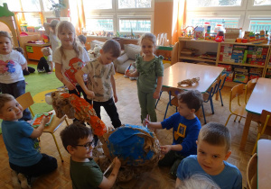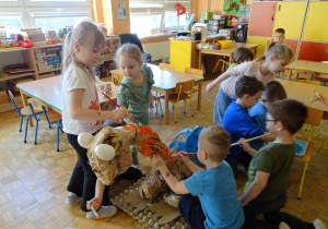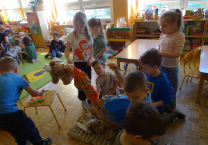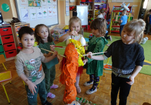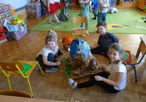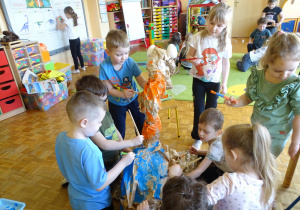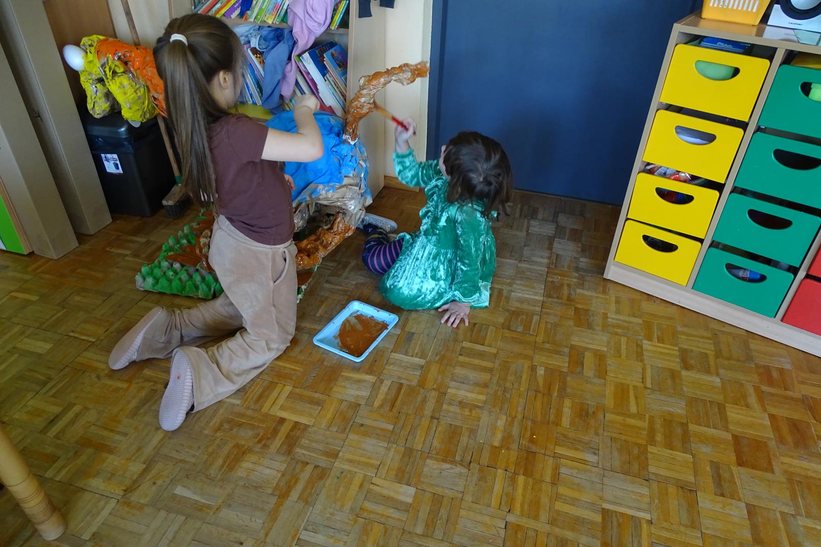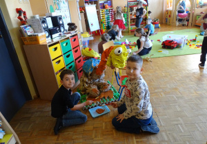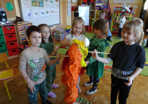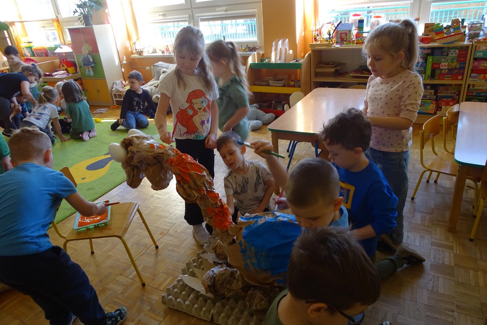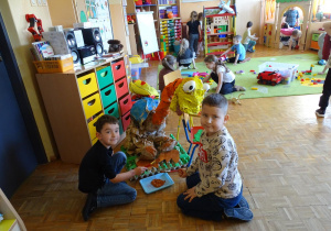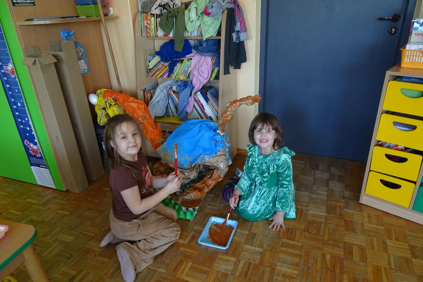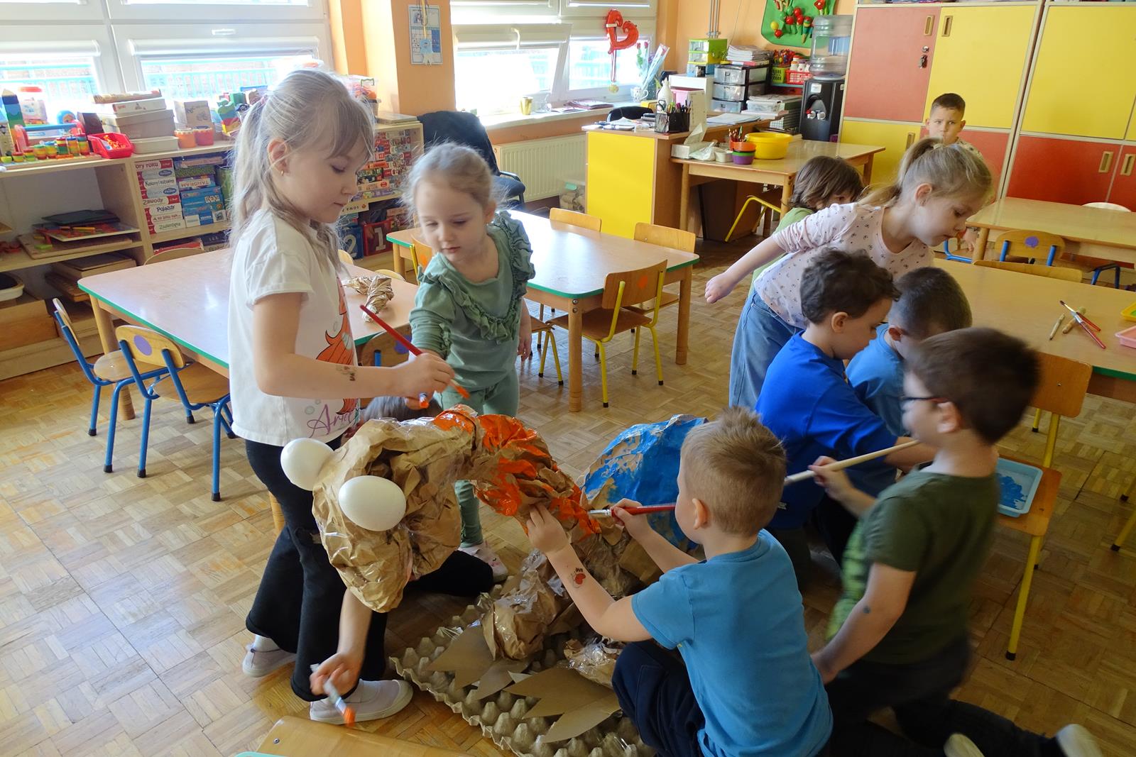 Ten dzień w przedszkolu był pełen emocji, ciekawych doświadczeń i niezwykłych odkryć. Dzieci wyruszyły w podróż do bardzo odległej przeszłości – do czasów, gdy po Ziemi chodziły dinozaury. Podczas rozmowy i wspólnych aktywności przedszkolaki poznawały różne gatunki tych prehistorycznych zwierząt. Dowiedziały się, jak wyglądały, czym się żywiły oraz jakie były przyczyny ich wyginięcia. Temat wzbudził wśród dzieci ogromne zainteresowanie i wiele pytań. W trakcie zajęć nie zabrakło także kreatywnych działań. Dzieci wspólnie wykonały dużego dinozaura z papieru – wycinały, przyklejały i ozdabiały poszczególne elementy, tworząc barwną pracę plastyczną. Była to świetna okazja do rozwijania wyobraźni oraz umiejętności manualnych. Dużo radości przyniosła również zabawa związana z orientacją w przestrzeni. Przedszkolaki tworzyły na chodniku „dinozaurową drogę”, po której poruszały się zgodnie z podanymi wskazówkami, utrwalając kierunki takie jak: w prawo, w lewo, do przodu czy do tyłu. Dzieci uczyły się przy tym współpracy, koncentracji oraz uważnego słuchania poleceń. Nie zabrakło także czasu na prezentację własnych dinozaurów, które dzieci przyniosły z domu i z dumą pokazywały kolegom oraz koleżankom. Każde dziecko mogło opowiedzieć o swoim ulubionym dinozaurze. Przedszkolaki wyruszyły także na poszukiwanie ukrytych dinozaurów na przedszkolnym placu zabaw. Z wielkim zaangażowaniem przeszukiwały różne zakamarki, a odnalezienie każdej figurki wywoływało dużo radości i śmiechu.