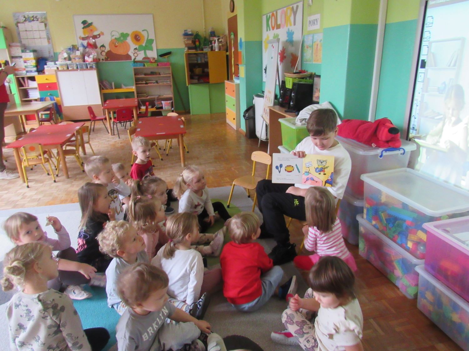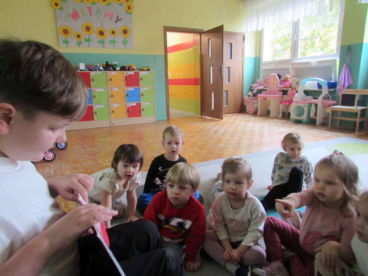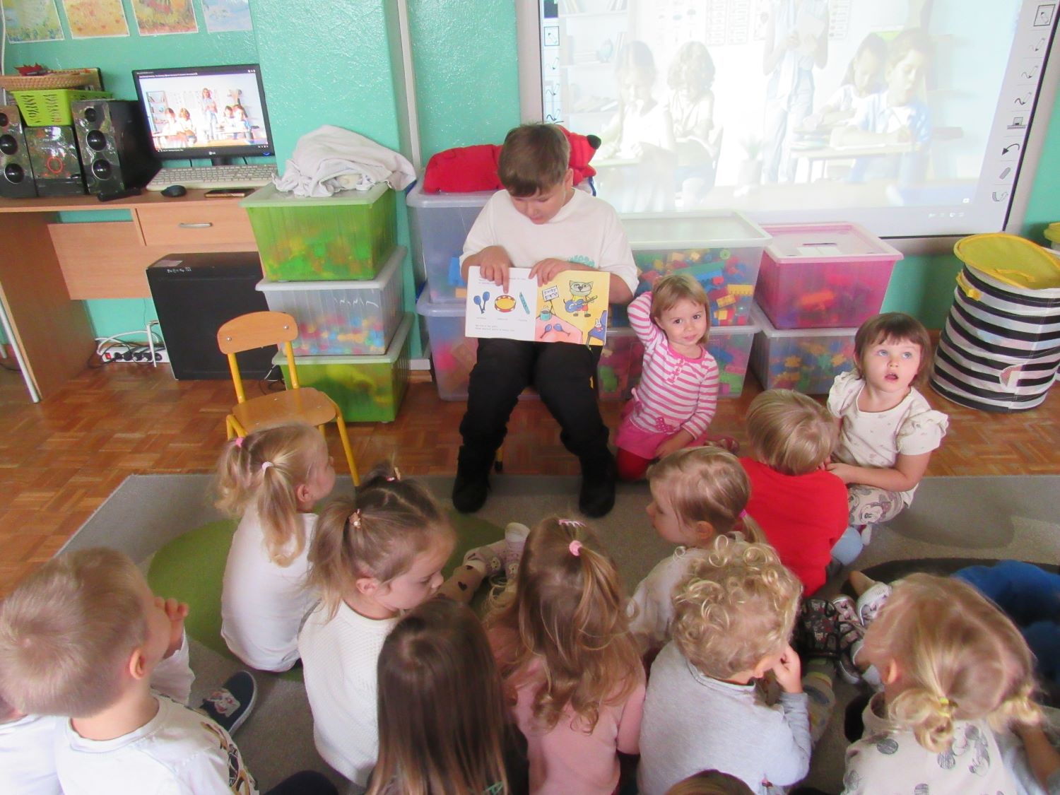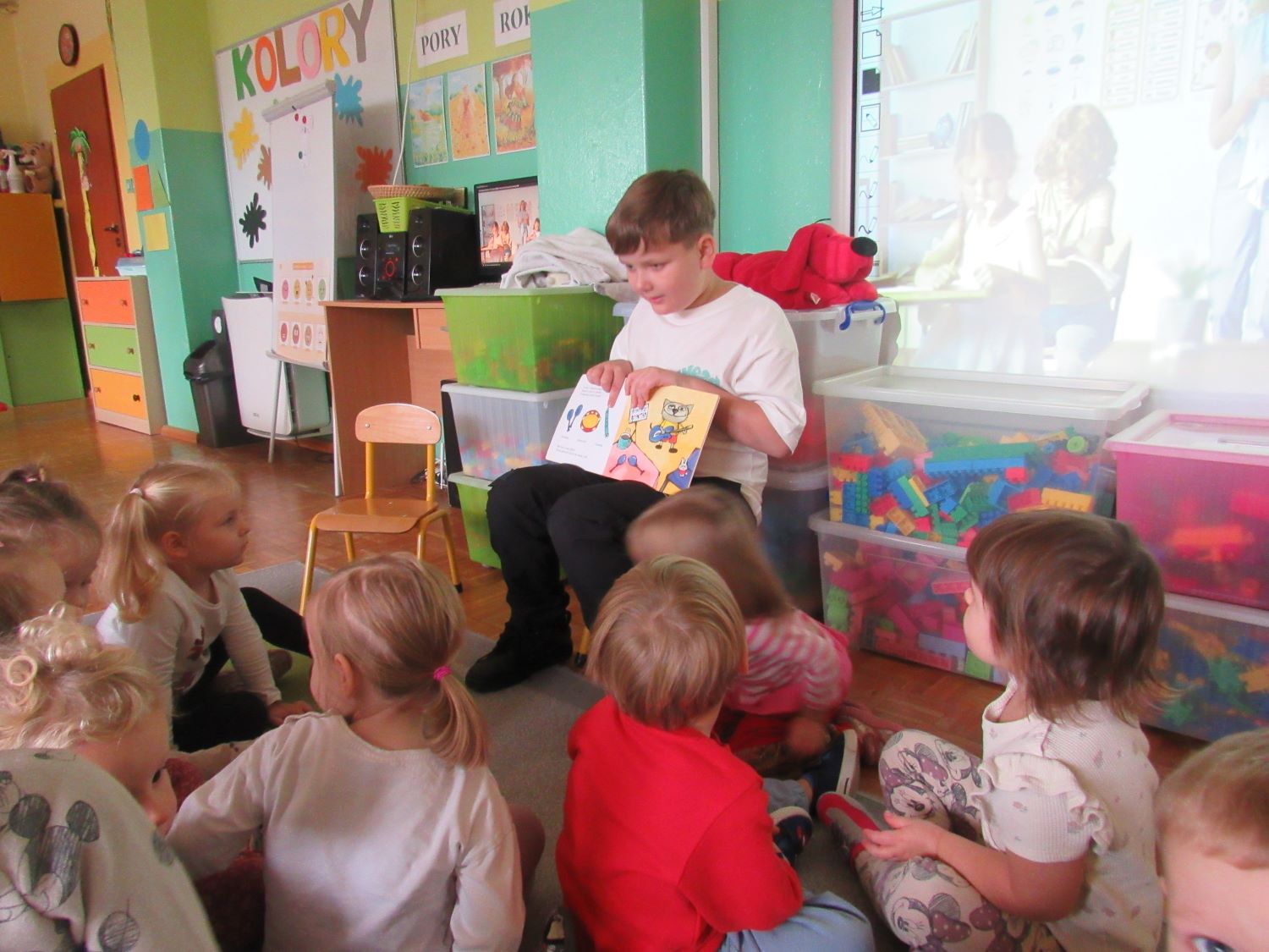 W Dniu Edukacji Narodowej dzieciaczki odwiedził gość o imieniu Leoś - uczeń IV klasy podstawowej. Leoś przeczytał bajeczkę pt. "Kicia Kocia - zawody", dzieciaczki z wielkim zainteresowaniem słuchały swoje gościa. Leoś opowiedział dlaczego warto pilnie się uczyć, bo uczenie to ciekawa przygoda, że każdego dnia dzieciaczki mogą odkrywać coś nowego. Na koniec pęknie podsumował, że opaci się uczyć, bo wiedza to ogromny skarb, którego nikt Ci nie zabierze. Dzieciaczki w tym dniu poznały znaczenia święta Edukacji Narodowej, dlaczego nauczyciele są tak ważni w życiu każdego dzieciaczka i z tej okazji przygotowały piękne laurki dla wszystkich pań oraz pracowników przedszkola.