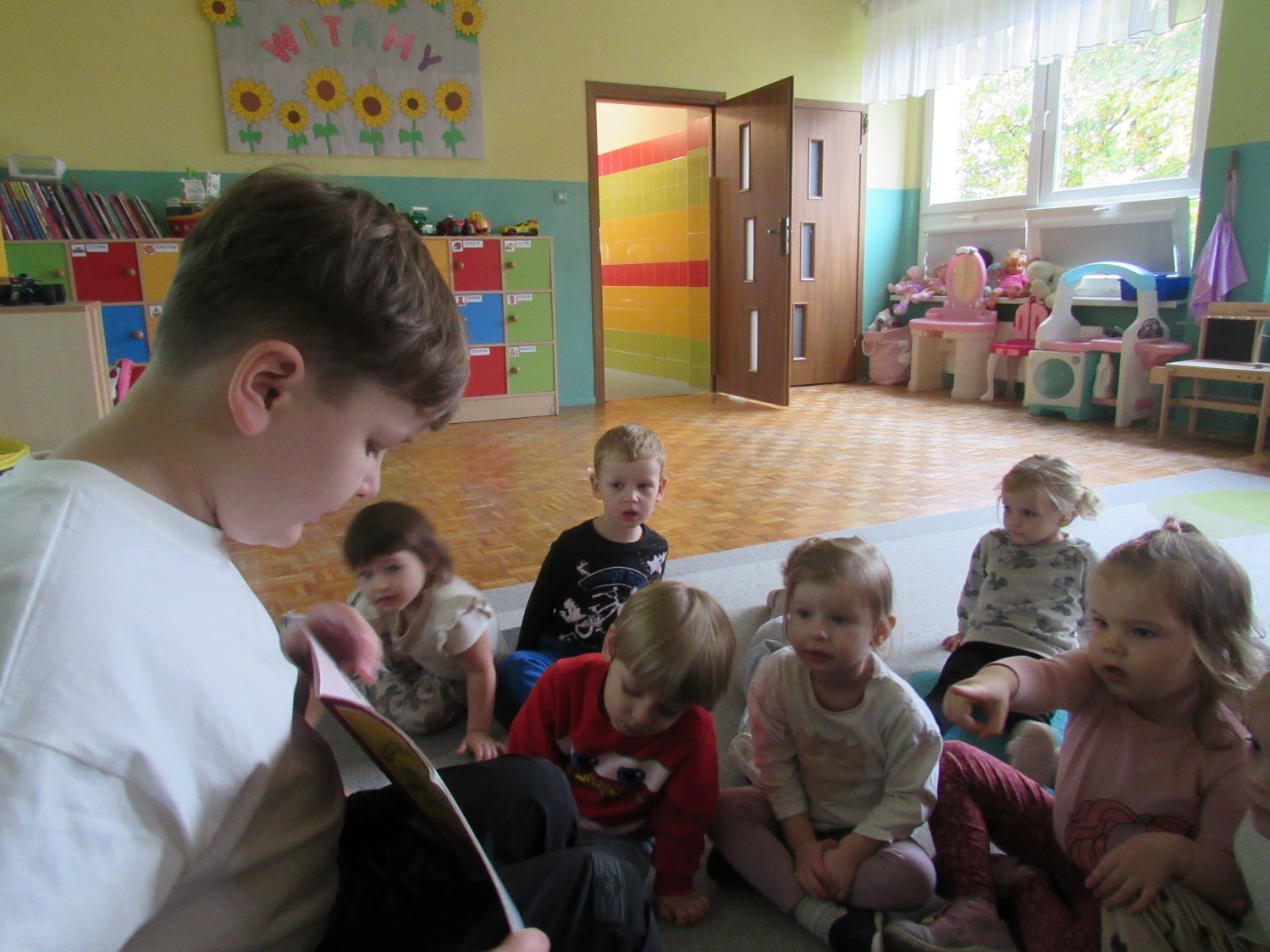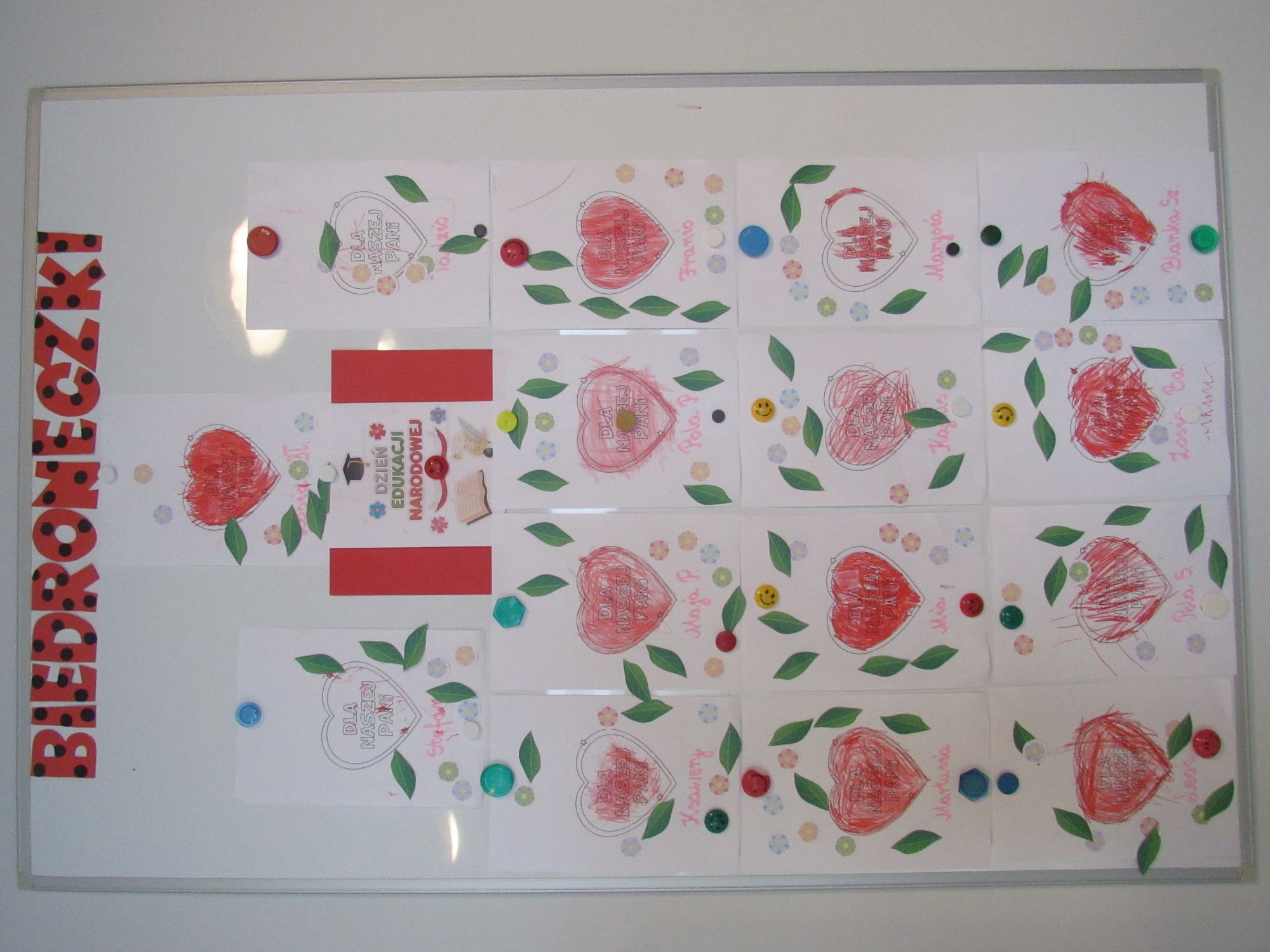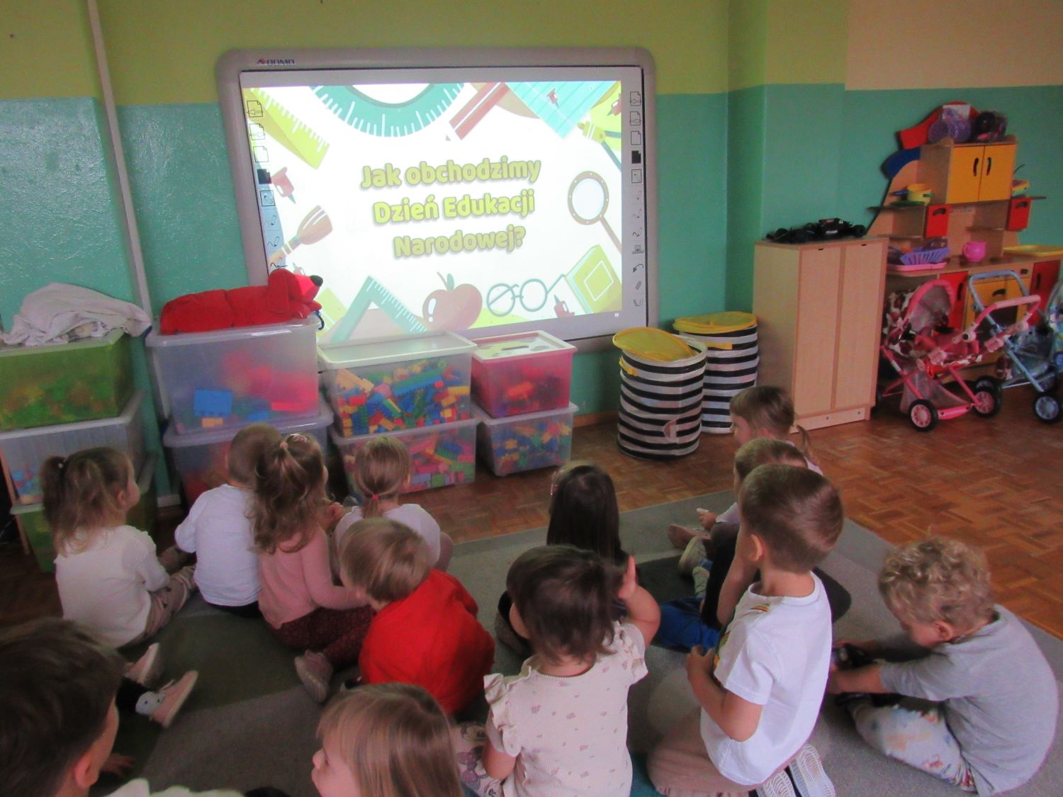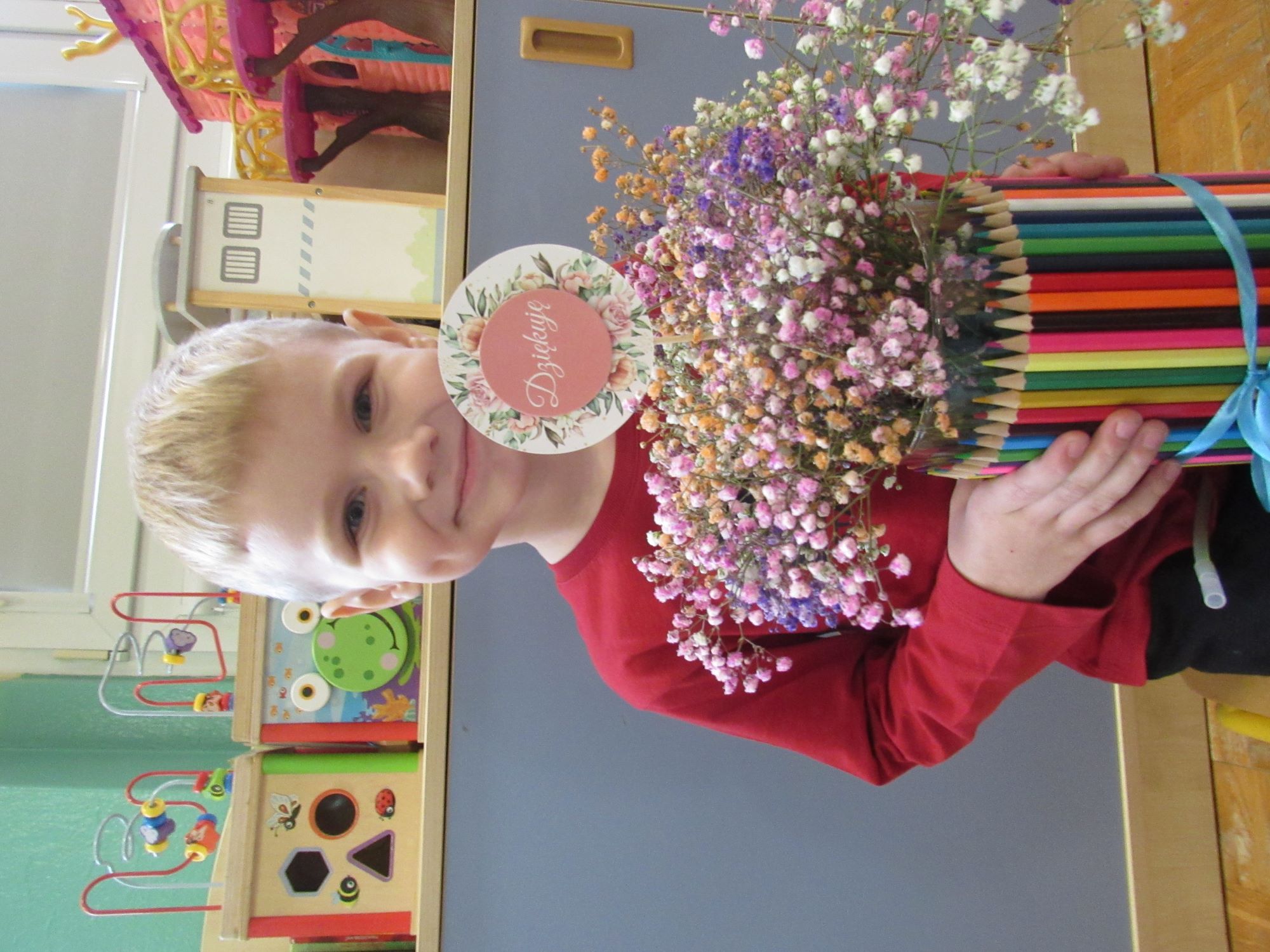 W Dniu Edukacji Narodowej dzieciaczki odwiedził gość o imieniu Leoś - uczeń IV klasy podstawowej. Leoś przeczytał bajeczkę pt. "Kicia Kocia - zawody", dzieciaczki z wielkim zainteresowaniem słuchały swoje gościa. Leoś opowiedział dlaczego warto pilnie się uczyć, bo uczenie to ciekawa przygoda, że każdego dnia dzieciaczki mogą odkrywać coś nowego. Na koniec pęknie podsumował, że opaci się uczyć, bo wiedza to ogromny skarb, którego nikt Ci nie zabierze. Dzieciaczki w tym dniu poznały znaczenia święta Edukacji Narodowej, dlaczego nauczyciele są tak ważni w życiu każdego dzieciaczka i z tej okazji przygotowały piękne laurki dla wszystkich pań oraz pracowników przedszkola.