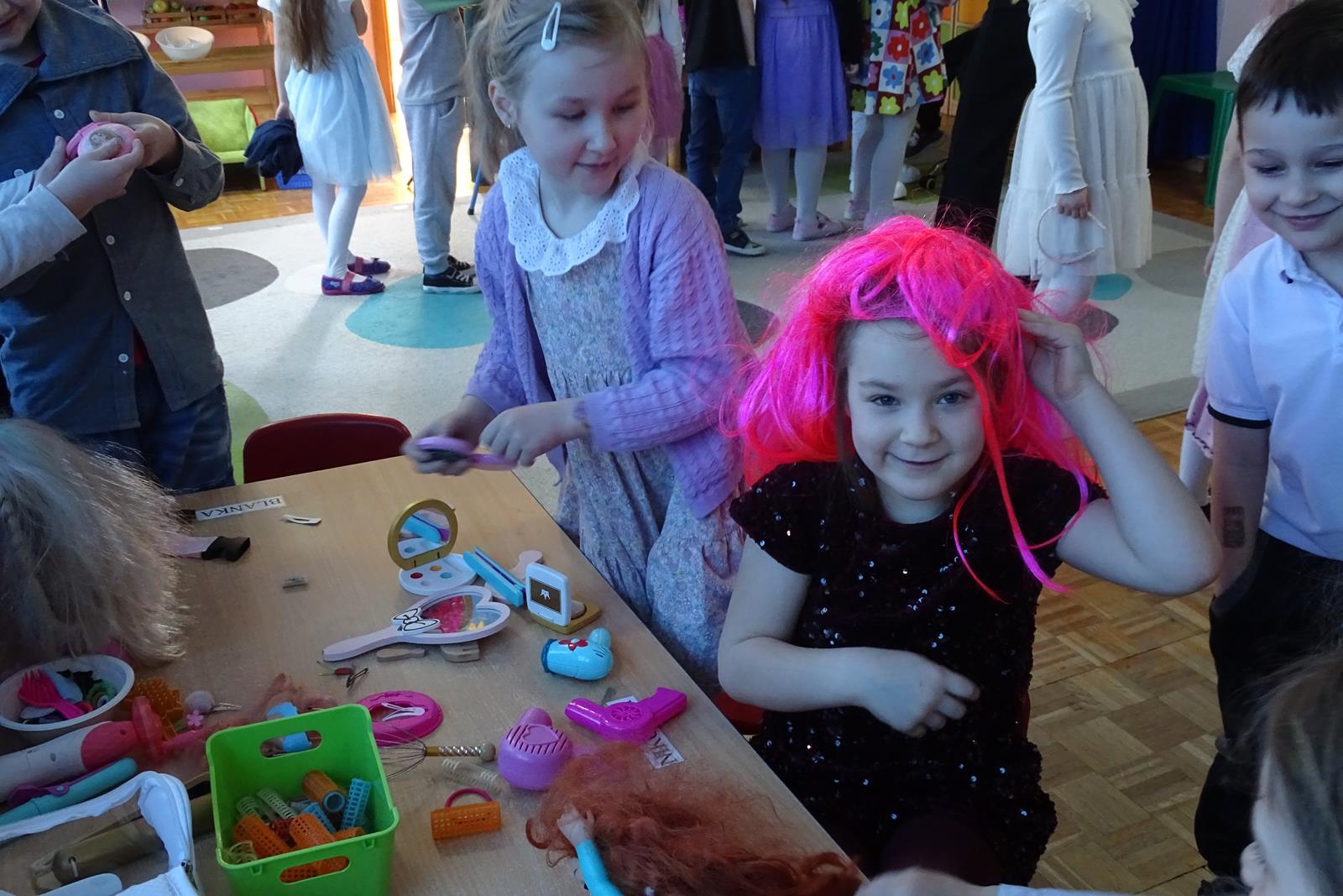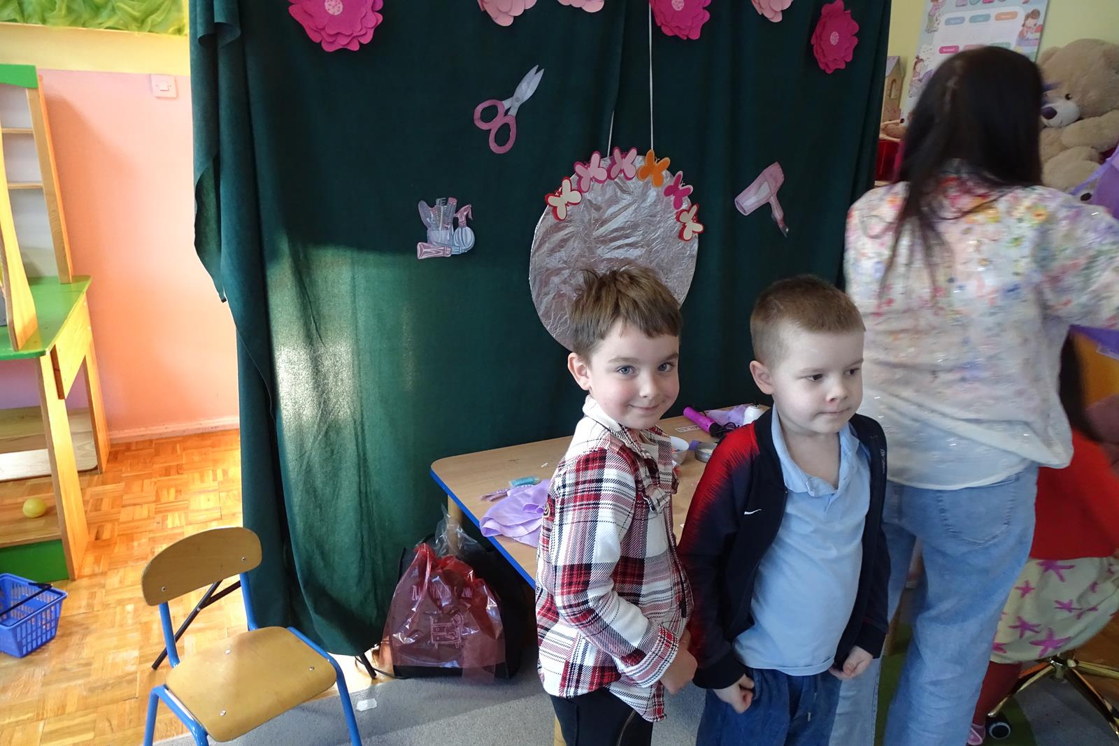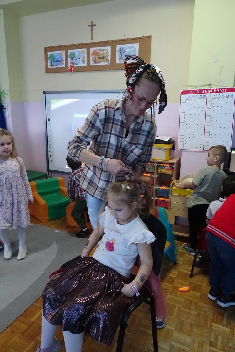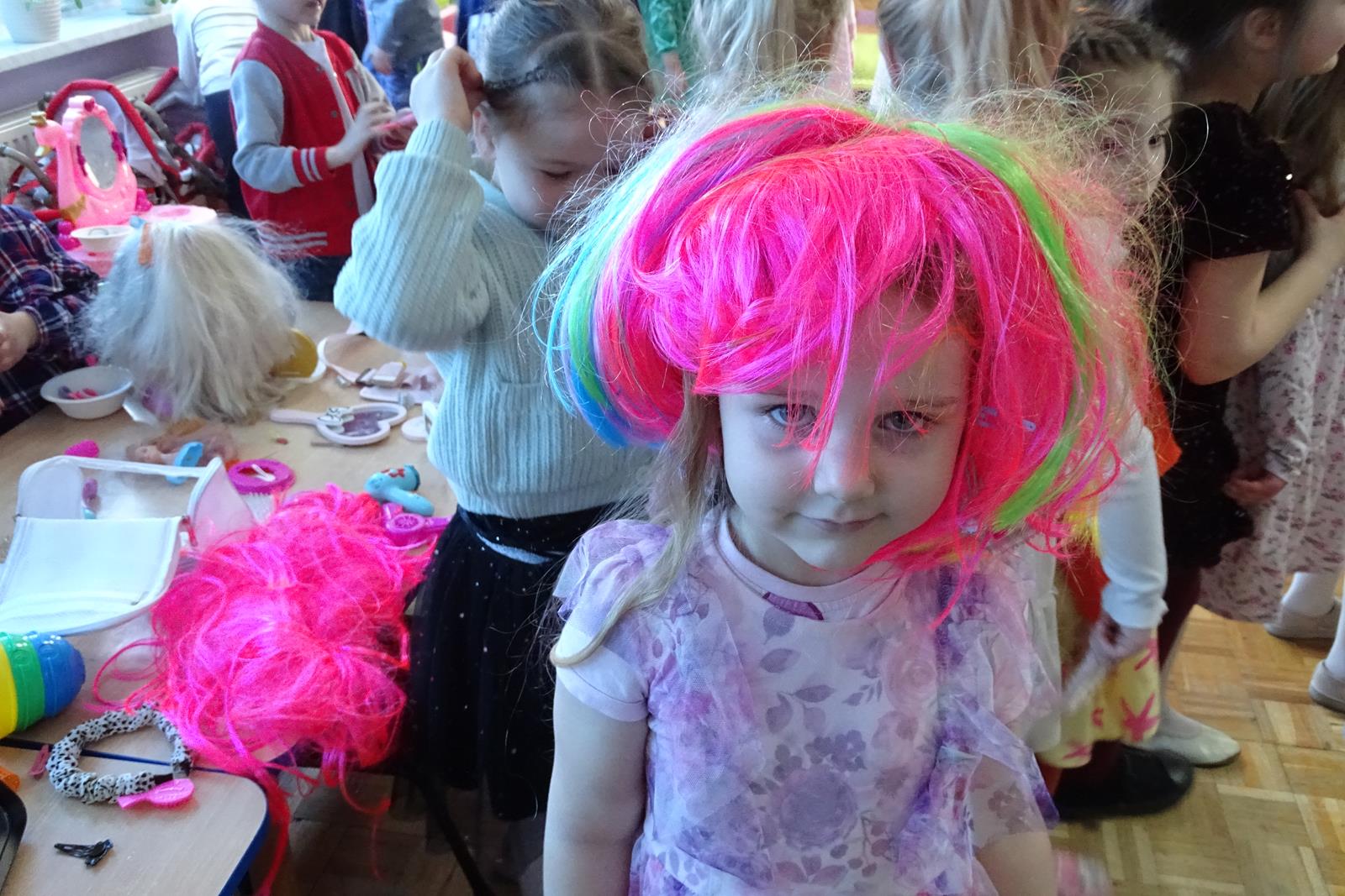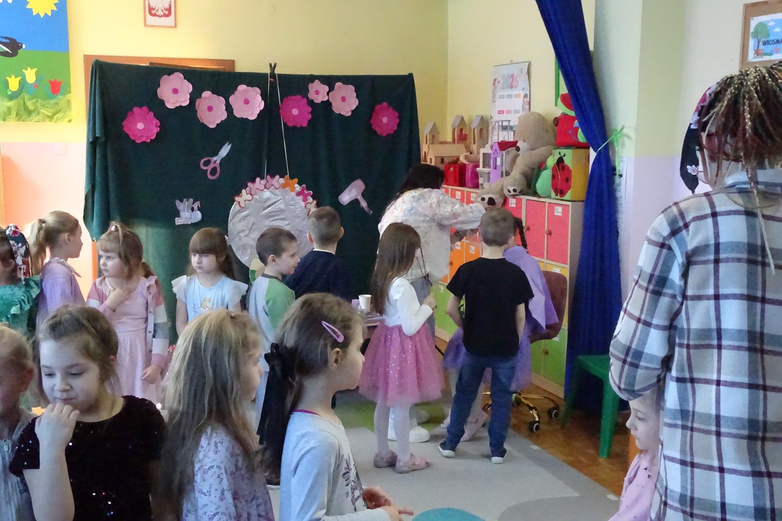 Dzień Kobiet w naszym przedszkolu okazał się niezwykle radosnym i pełnym atrakcji wydarzeniem, które na długo zapadnie w pamięci wszystkich dzieci. Już od samego rana dało się odczuć wyjątkową, ciepłą atmosferę, a dziewczynki mogły poczuć się docenione i wyróżnione. Na początek przygotowano dla nich niecodzienną niespodziankę – wizytę w przedszkolnym SPA. W otoczeniu spokojnej, relaksacyjnej muzyki małe kobietki mogły się wyciszyć i odpocząć, a chłopcy z dużym zaangażowaniem wcielili się w rolę masażystów, wykonując delikatne masaże stóp. Był to moment zarówno odprężenia, jak i świetnej zabawy, który wywołał mnóstwo uśmiechów i pozytywnych emocji.Kolejnym punktem programu była wizyta w „salonie fryzjerskim”, gdzie powstawały niezwykle pomysłowe i kolorowe fryzury. Dziewczynkom zaplatano warkocze, ozdabiano włosy brokatem oraz błyszczącymi dodatkami, dzięki czemu każda z nich mogła poczuć się jak mała księżniczka. Co ciekawe, także chłopcy chętnie wzięli udział w tej zabawie, decydując się na kolorowe stylizacje. Nie zabrakło również innych kreatywnych atrakcji. Dzieci miały możliwość wykonania brokatowych tatuaży oraz ozdabiania paznokci różnorodnymi kolorami i błyszczącymi elementami. Tego typu aktywności rozwijały wyobraźnię i zdolności manualne, a jednocześnie dostarczały mnóstwo radości i okazji do wspólnego spędzania czasu. Na zakończenie tego wyjątkowego dnia na wszystkich czekał słodki poczęstunek przygotowany przez nasze wspaniałe mamy, za co serdecznie dziękujemy.