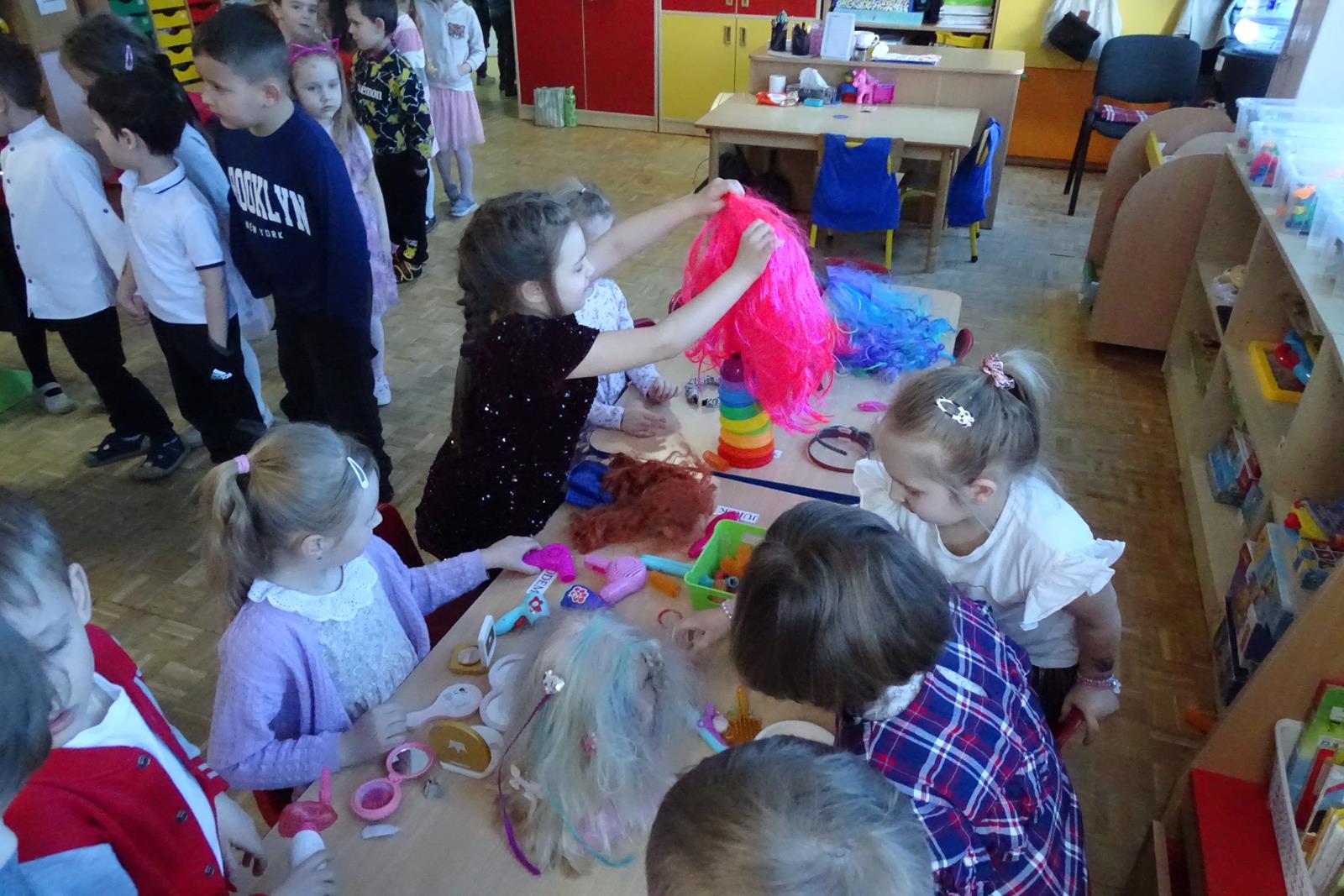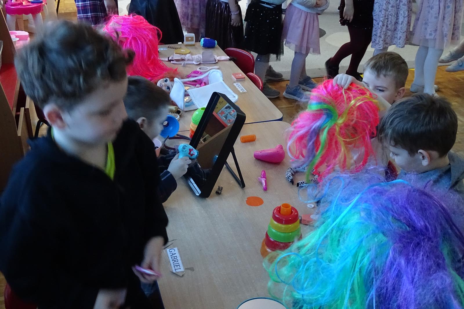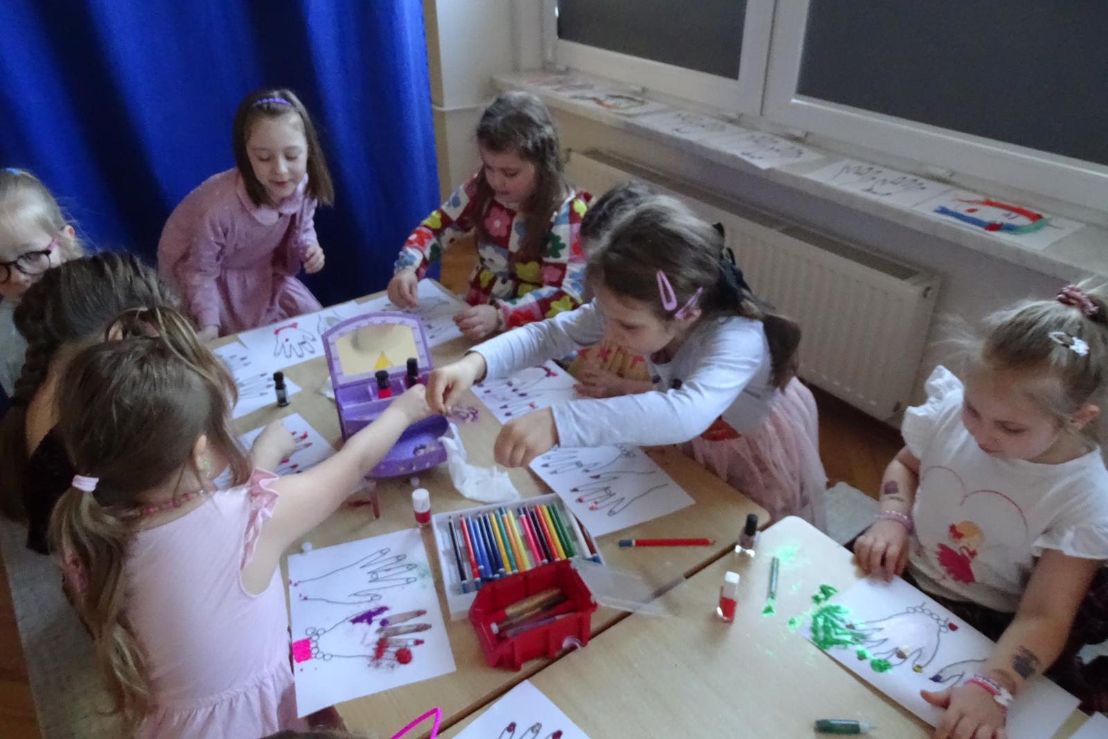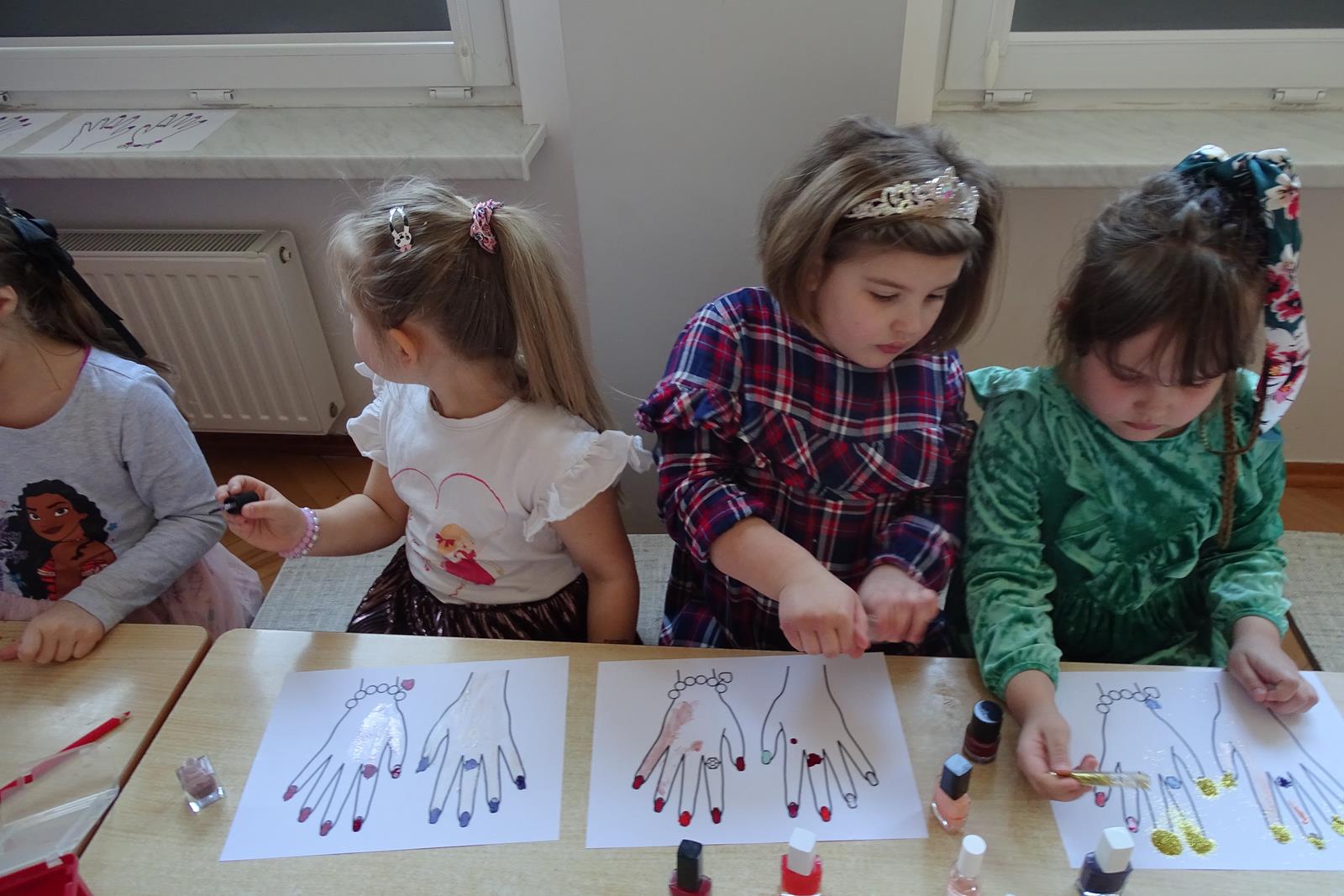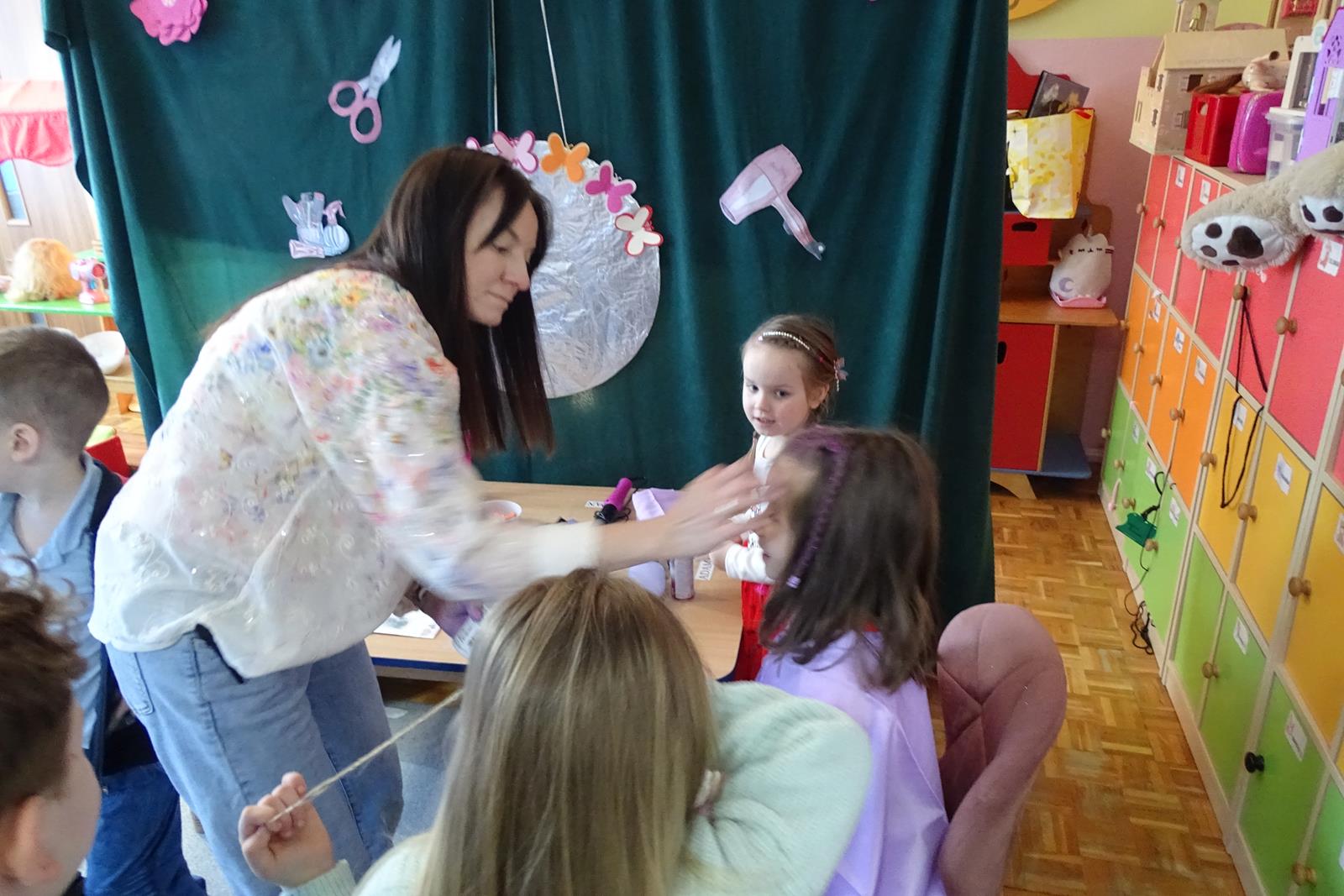 Dzień Kobiet w naszym przedszkolu okazał się niezwykle radosnym i pełnym atrakcji wydarzeniem, które na długo zapadnie w pamięci wszystkich dzieci. Już od samego rana dało się odczuć wyjątkową, ciepłą atmosferę, a dziewczynki mogły poczuć się docenione i wyróżnione. Na początek przygotowano dla nich niecodzienną niespodziankę – wizytę w przedszkolnym SPA. W otoczeniu spokojnej, relaksacyjnej muzyki małe kobietki mogły się wyciszyć i odpocząć, a chłopcy z dużym zaangażowaniem wcielili się w rolę masażystów, wykonując delikatne masaże stóp. Był to moment zarówno odprężenia, jak i świetnej zabawy, który wywołał mnóstwo uśmiechów i pozytywnych emocji.Kolejnym punktem programu była wizyta w „salonie fryzjerskim”, gdzie powstawały niezwykle pomysłowe i kolorowe fryzury. Dziewczynkom zaplatano warkocze, ozdabiano włosy brokatem oraz błyszczącymi dodatkami, dzięki czemu każda z nich mogła poczuć się jak mała księżniczka. Co ciekawe, także chłopcy chętnie wzięli udział w tej zabawie, decydując się na kolorowe stylizacje. Nie zabrakło również innych kreatywnych atrakcji. Dzieci miały możliwość wykonania brokatowych tatuaży oraz ozdabiania paznokci różnorodnymi kolorami i błyszczącymi elementami. Tego typu aktywności rozwijały wyobraźnię i zdolności manualne, a jednocześnie dostarczały mnóstwo radości i okazji do wspólnego spędzania czasu. Na zakończenie tego wyjątkowego dnia na wszystkich czekał słodki poczęstunek przygotowany przez nasze wspaniałe mamy, za co serdecznie dziękujemy.