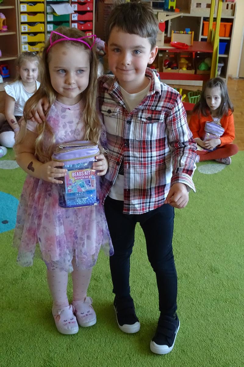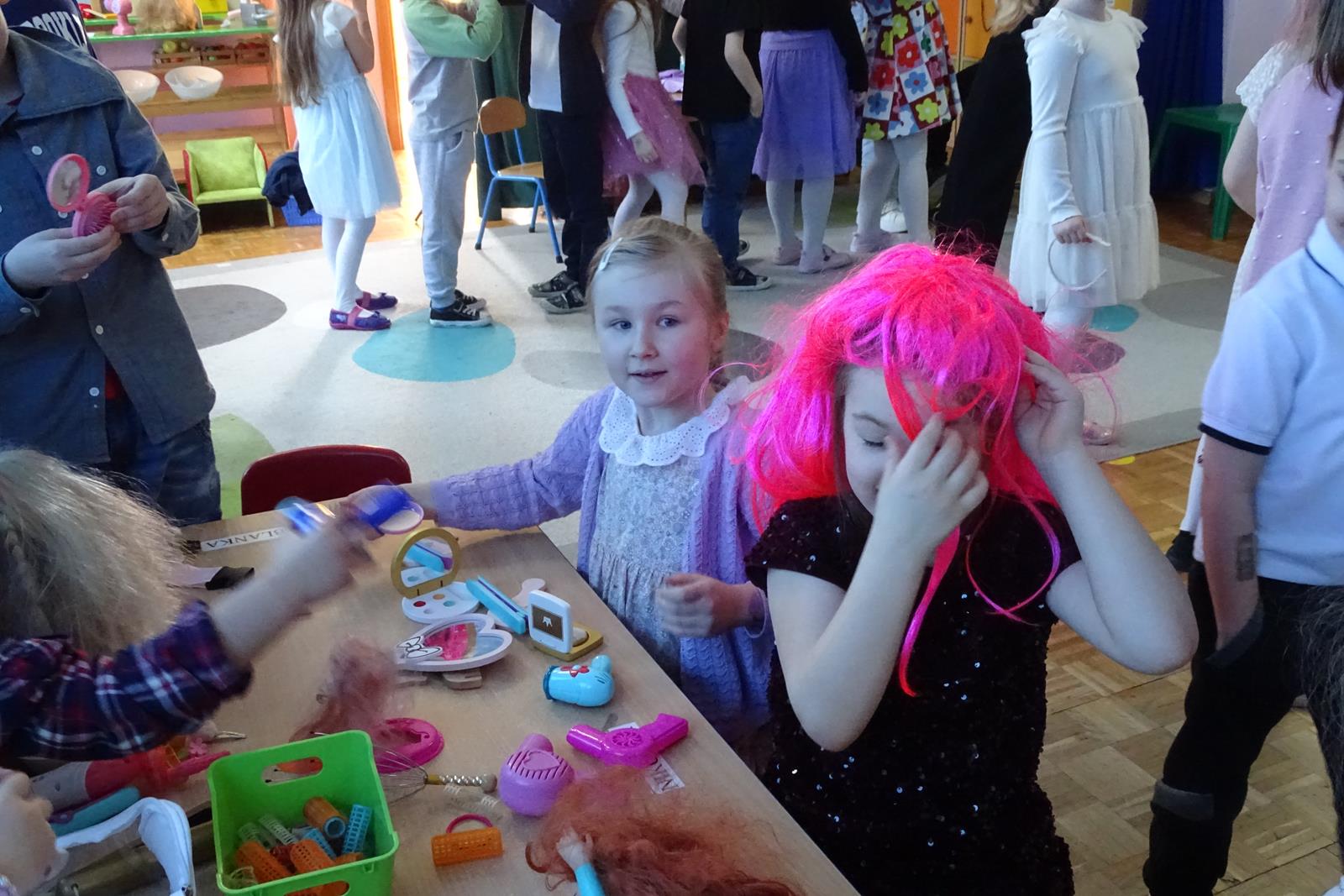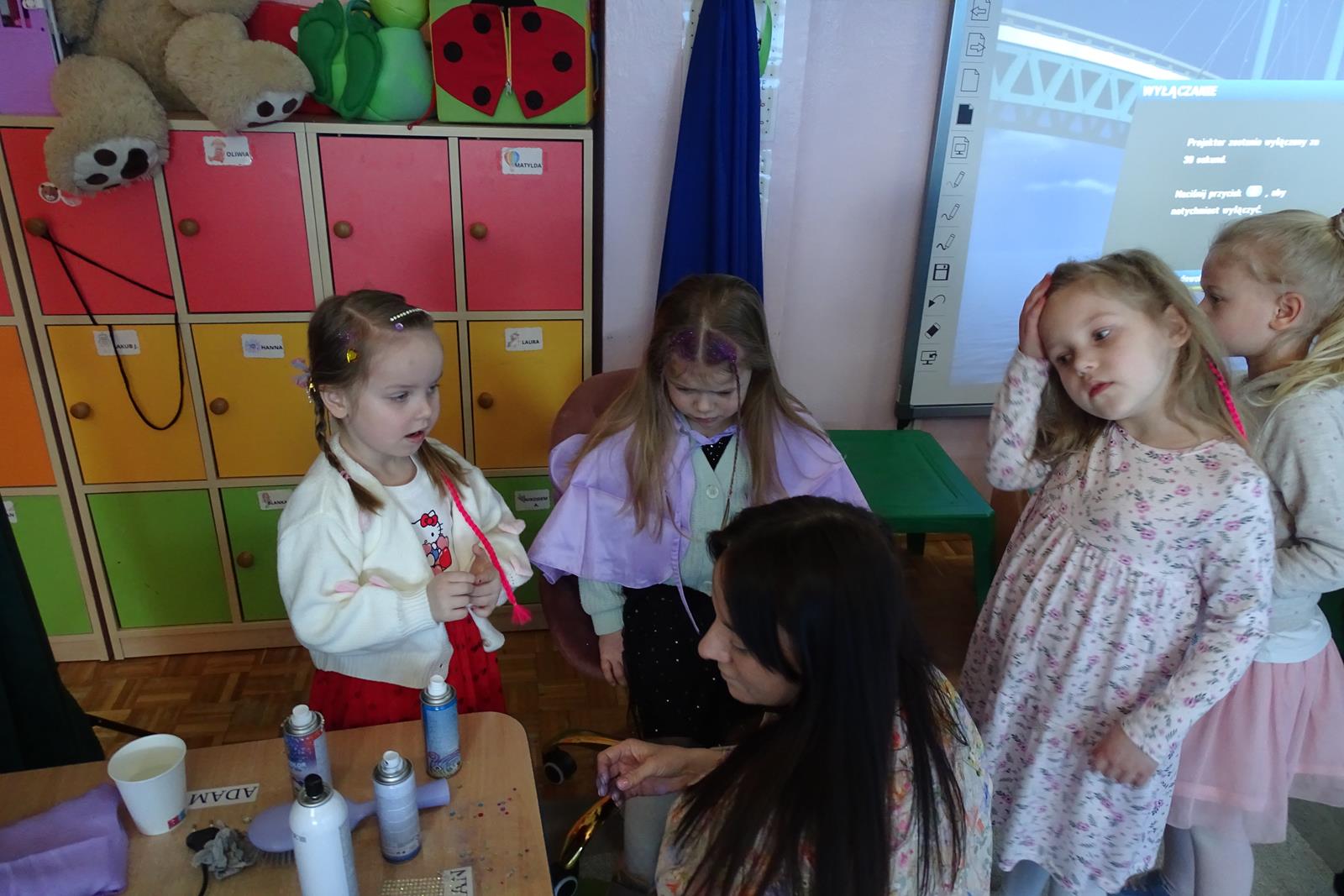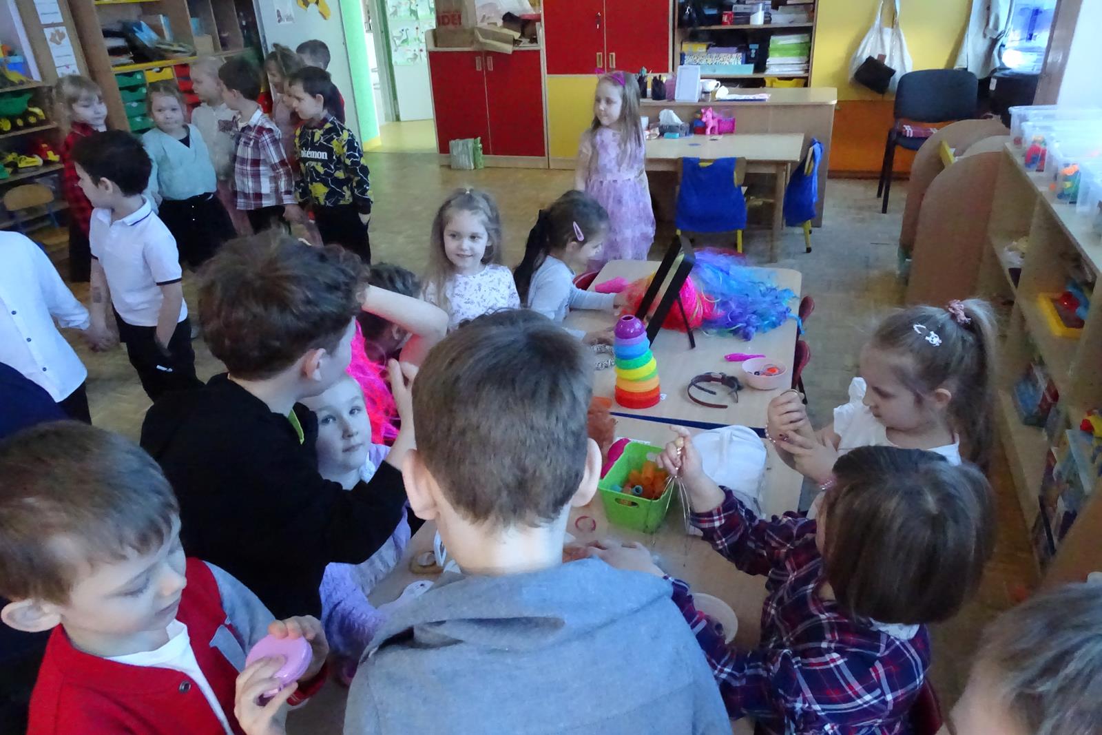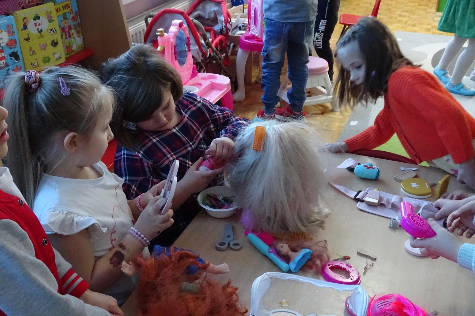 Dzień Kobiet w naszym przedszkolu okazał się niezwykle radosnym i pełnym atrakcji wydarzeniem, które na długo zapadnie w pamięci wszystkich dzieci. Już od samego rana dało się odczuć wyjątkową, ciepłą atmosferę, a dziewczynki mogły poczuć się docenione i wyróżnione. Na początek przygotowano dla nich niecodzienną niespodziankę – wizytę w przedszkolnym SPA. W otoczeniu spokojnej, relaksacyjnej muzyki małe kobietki mogły się wyciszyć i odpocząć, a chłopcy z dużym zaangażowaniem wcielili się w rolę masażystów, wykonując delikatne masaże stóp. Był to moment zarówno odprężenia, jak i świetnej zabawy, który wywołał mnóstwo uśmiechów i pozytywnych emocji.Kolejnym punktem programu była wizyta w „salonie fryzjerskim”, gdzie powstawały niezwykle pomysłowe i kolorowe fryzury. Dziewczynkom zaplatano warkocze, ozdabiano włosy brokatem oraz błyszczącymi dodatkami, dzięki czemu każda z nich mogła poczuć się jak mała księżniczka. Co ciekawe, także chłopcy chętnie wzięli udział w tej zabawie, decydując się na kolorowe stylizacje. Nie zabrakło również innych kreatywnych atrakcji. Dzieci miały możliwość wykonania brokatowych tatuaży oraz ozdabiania paznokci różnorodnymi kolorami i błyszczącymi elementami. Tego typu aktywności rozwijały wyobraźnię i zdolności manualne, a jednocześnie dostarczały mnóstwo radości i okazji do wspólnego spędzania czasu. Na zakończenie tego wyjątkowego dnia na wszystkich czekał słodki poczęstunek przygotowany przez nasze wspaniałe mamy, za co serdecznie dziękujemy.