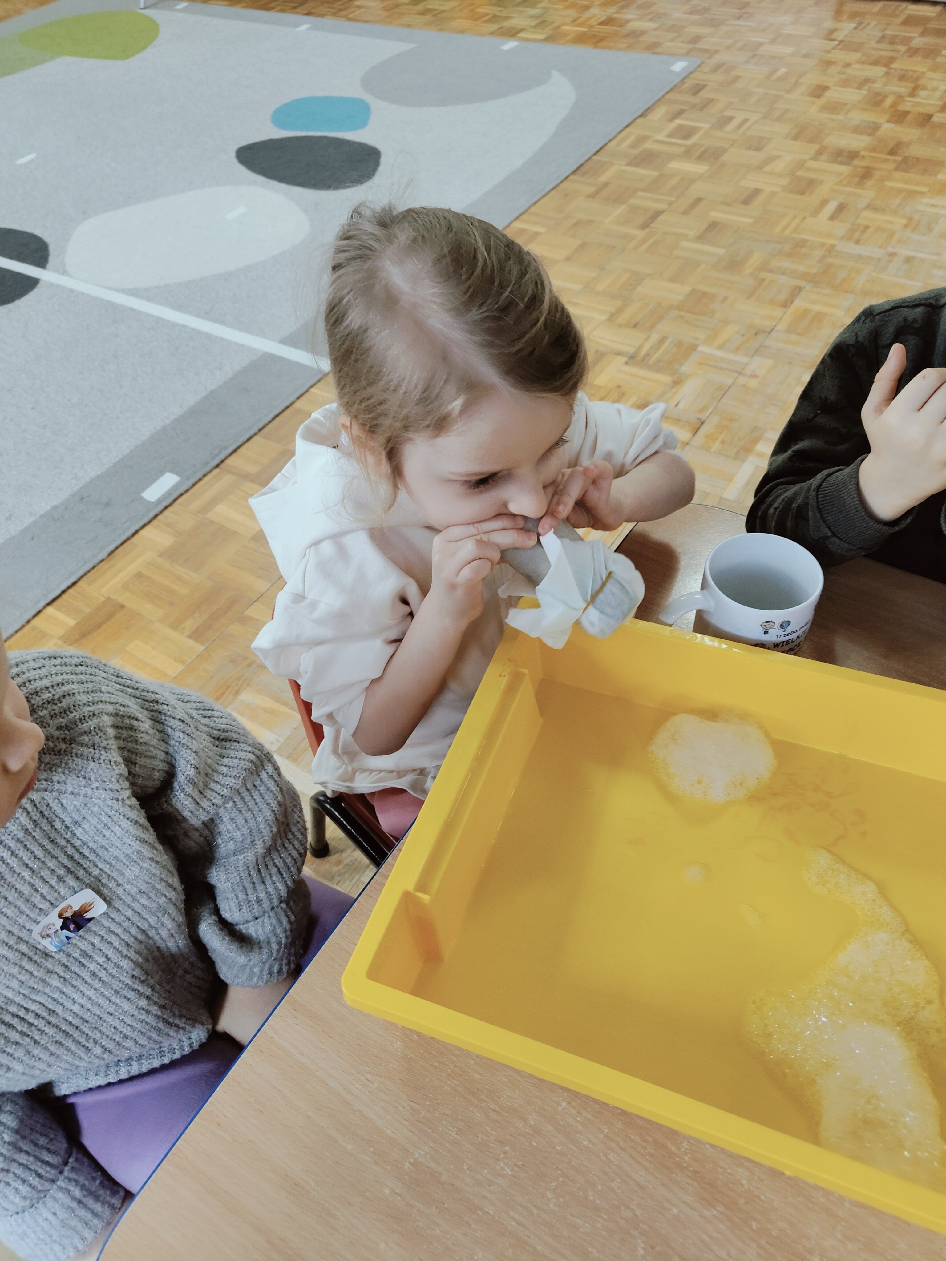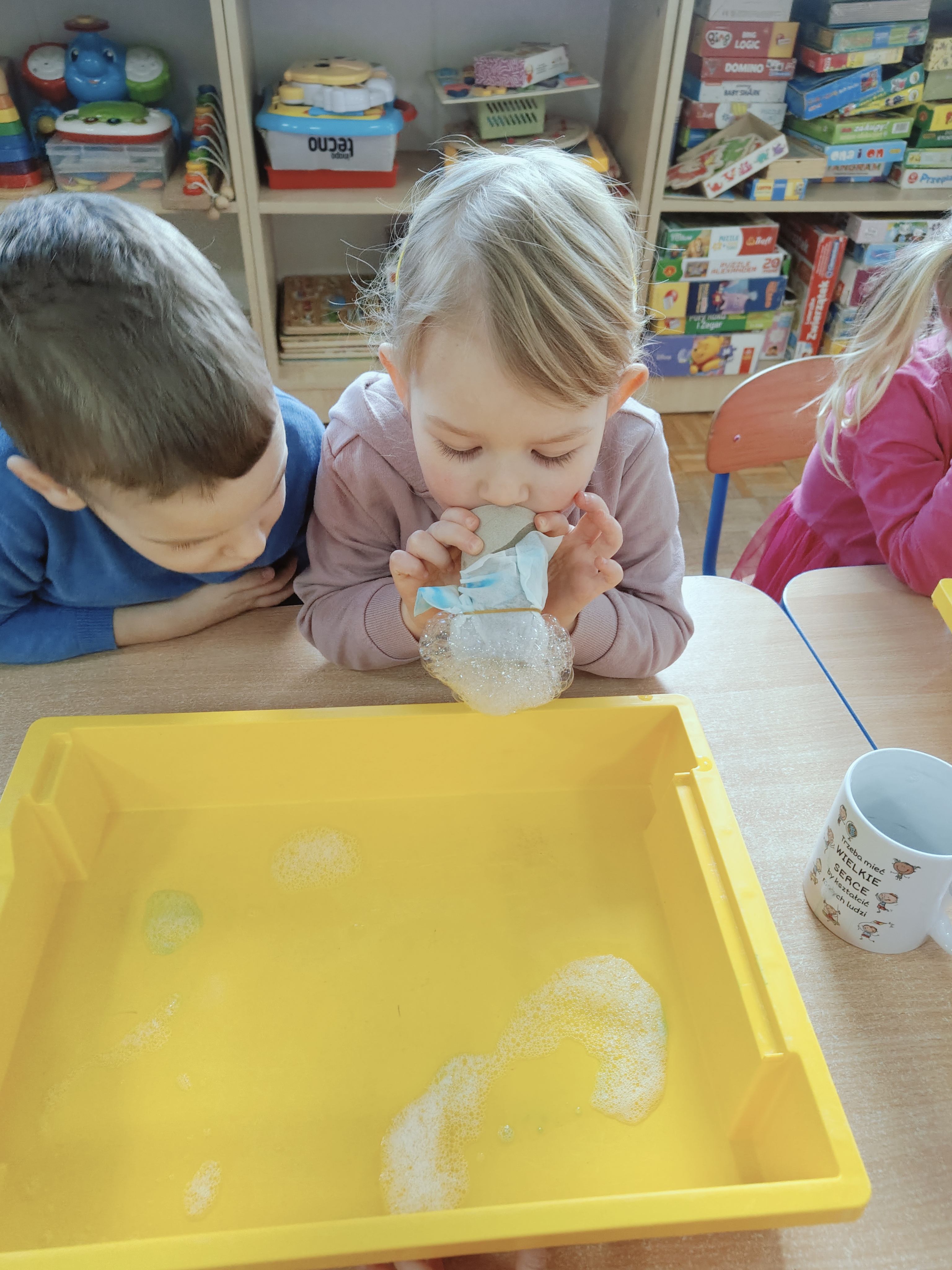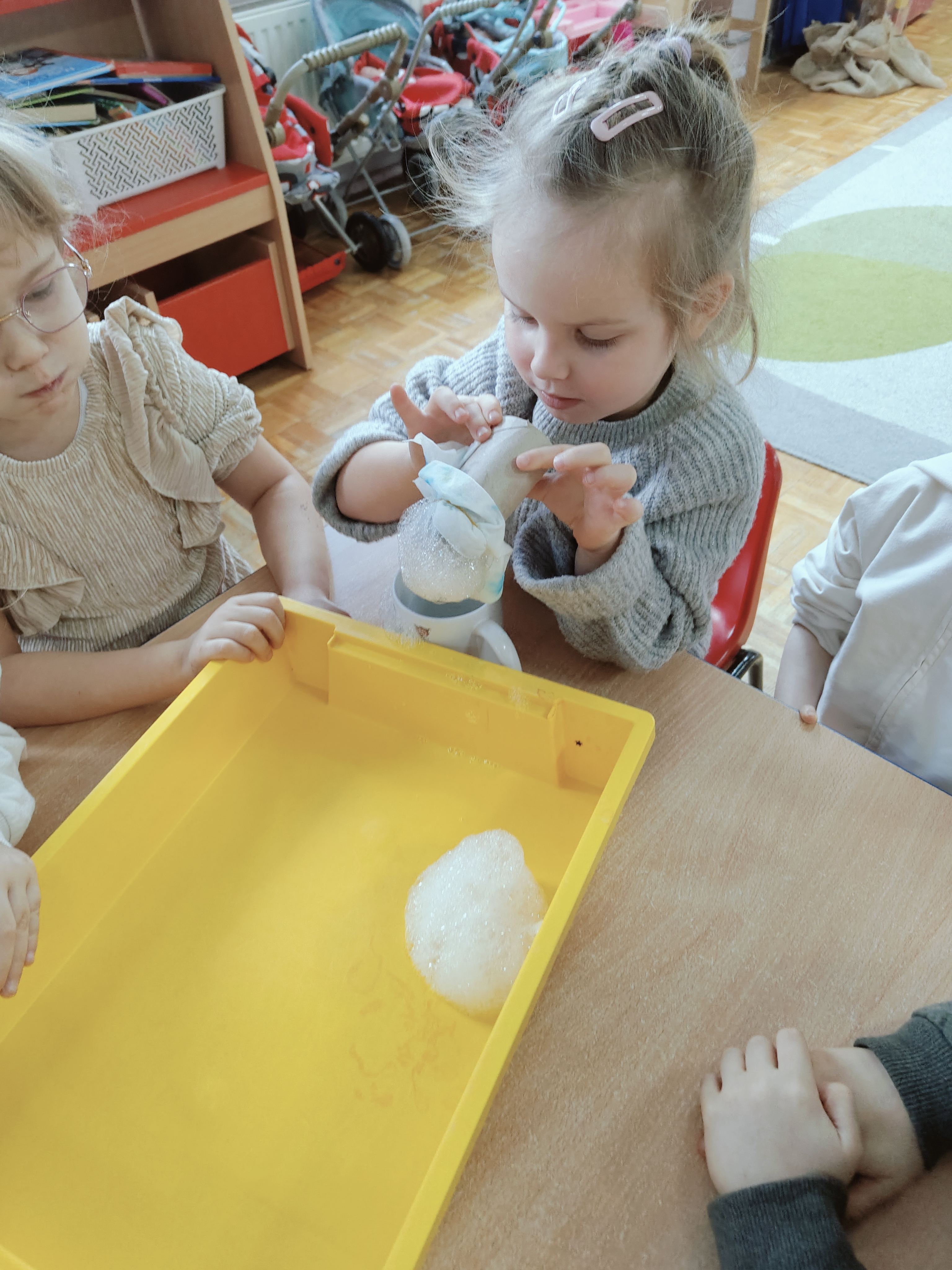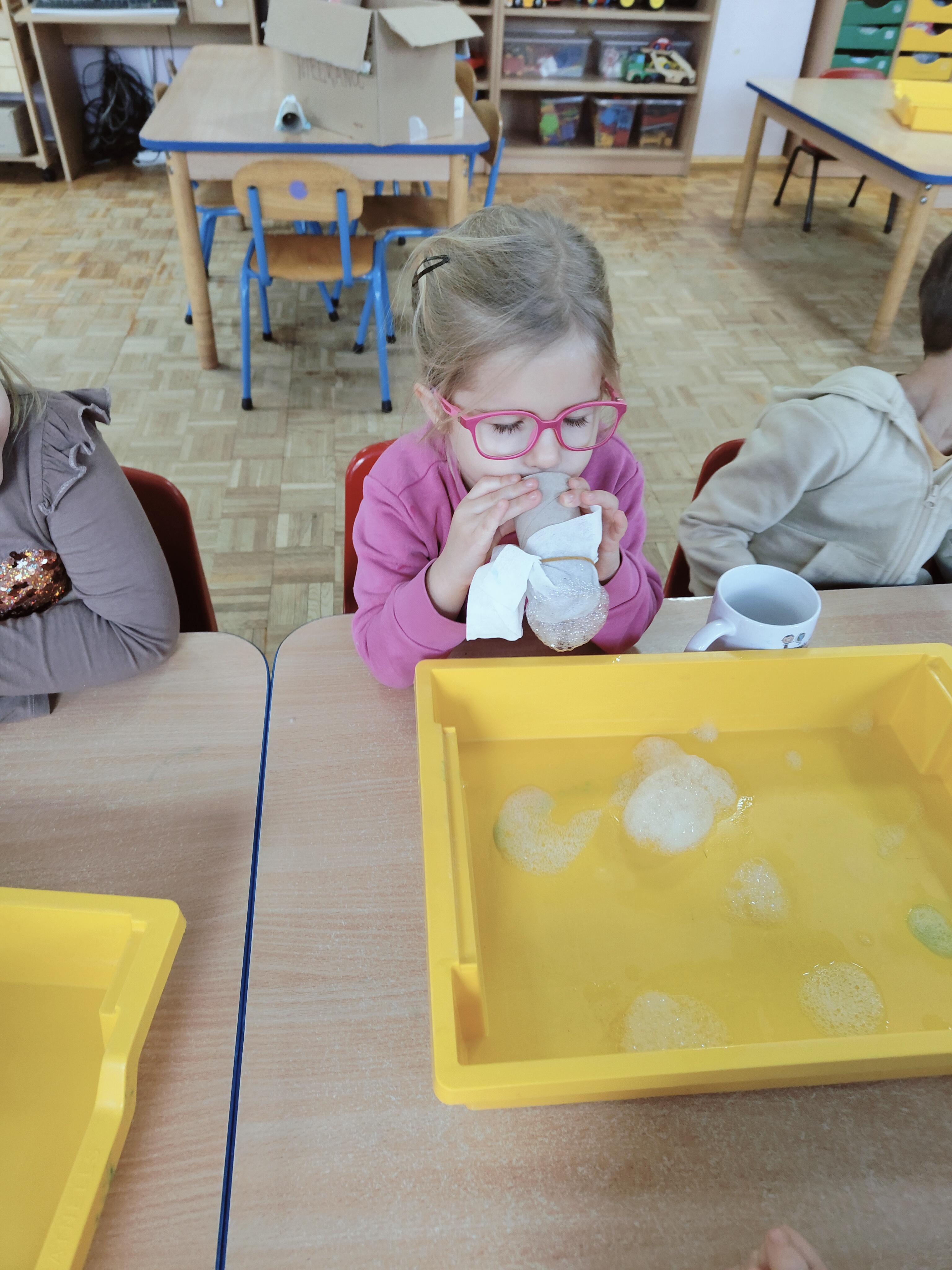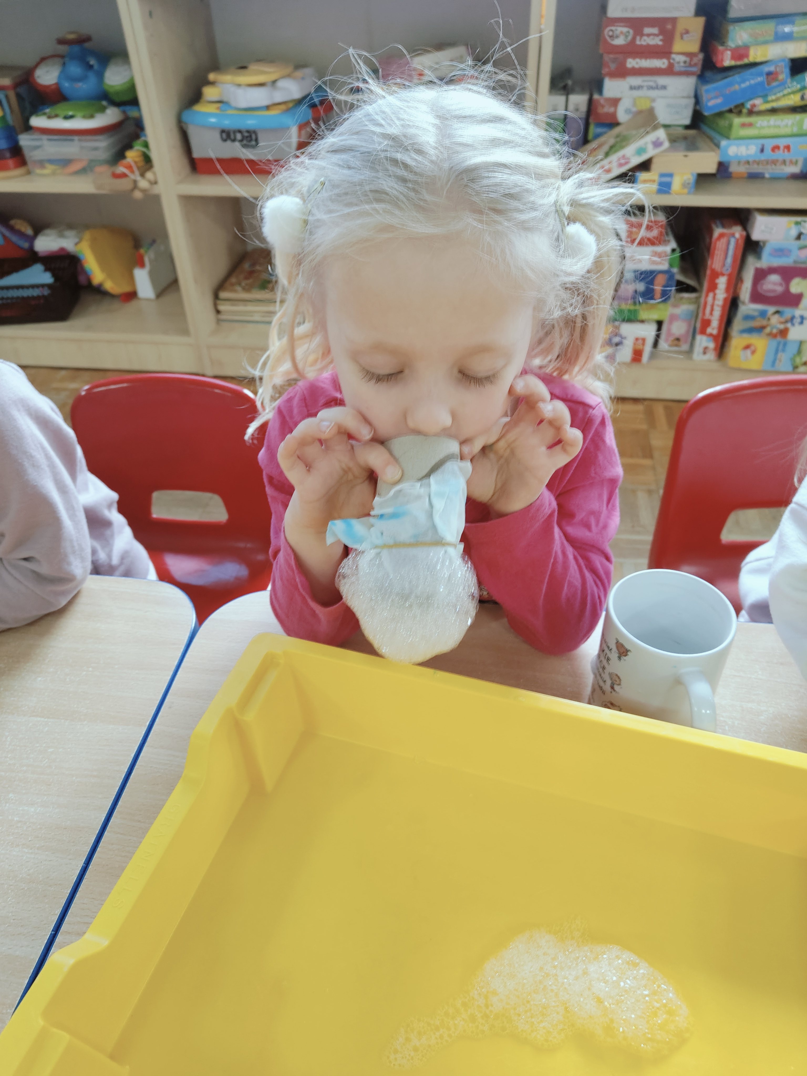 To był dzień pełen radości, śmiechu i kreatywnej zabawy. Poznaiśmy Rudkę- prawdziwego czyściocha, który doskonale wie jak się kąpać, aby zmyć z siebie cały brud. Wykonaliśmy również czyściochową fotoramkę,w której nasze czyściochowe przedszkolaki mogły zrobić sobie pamiątkowe zdjęcia. Przy piosence " Hop do kąpieli" uczyliśmy się nazw części ciała oraz jak prawidłowo je myć. Nie zabrakło też eksperymentów- dzieci z ogromnym zaangażowaniem tworzyły pianą, dmuchając w rolki. Na zakończenie powstała kolorowa piana, która pobudziła dziecięcą wyobraźnię i pozwoliła stworzyć prawdziwe piankowe dzieła sztuki.