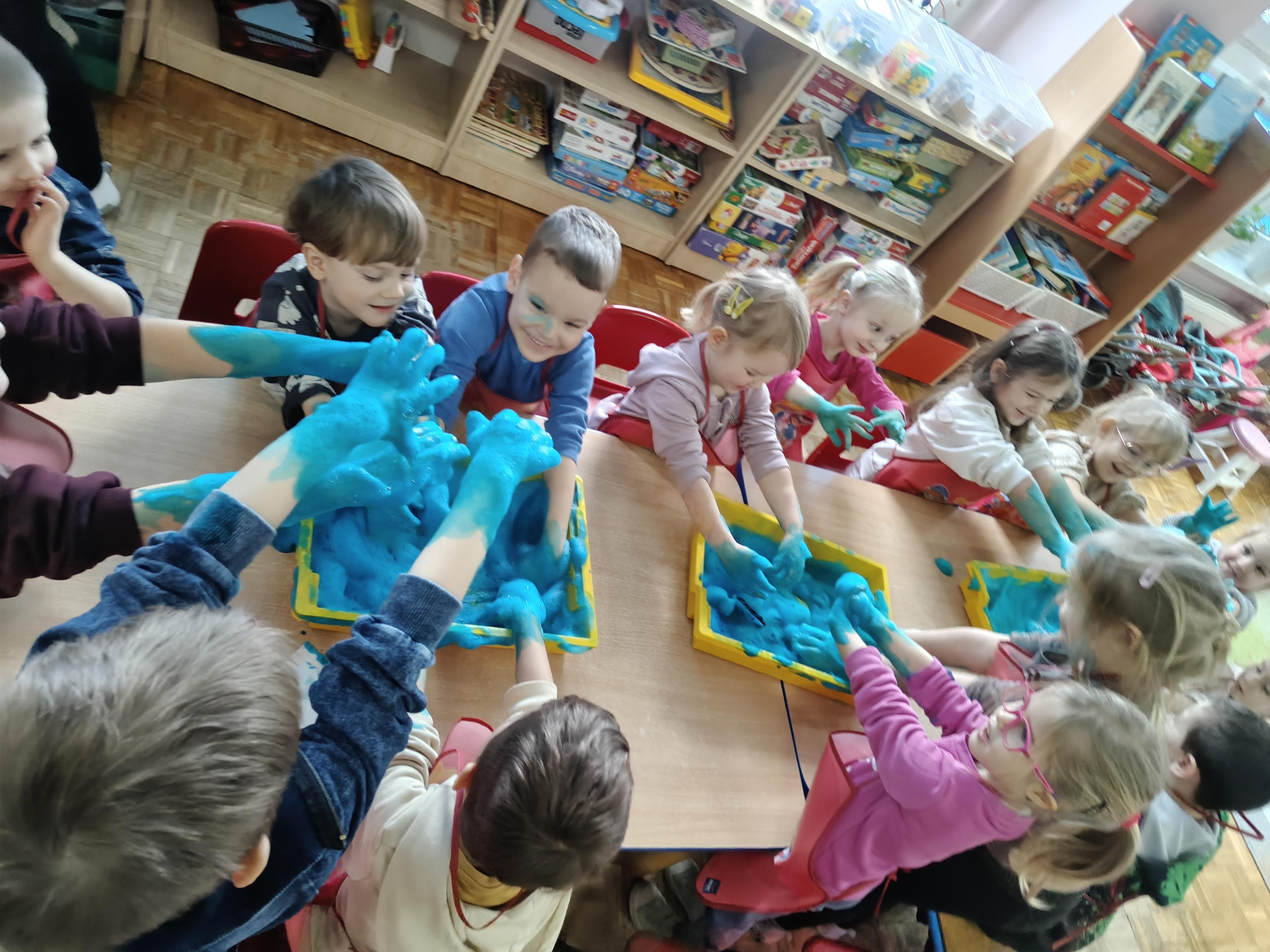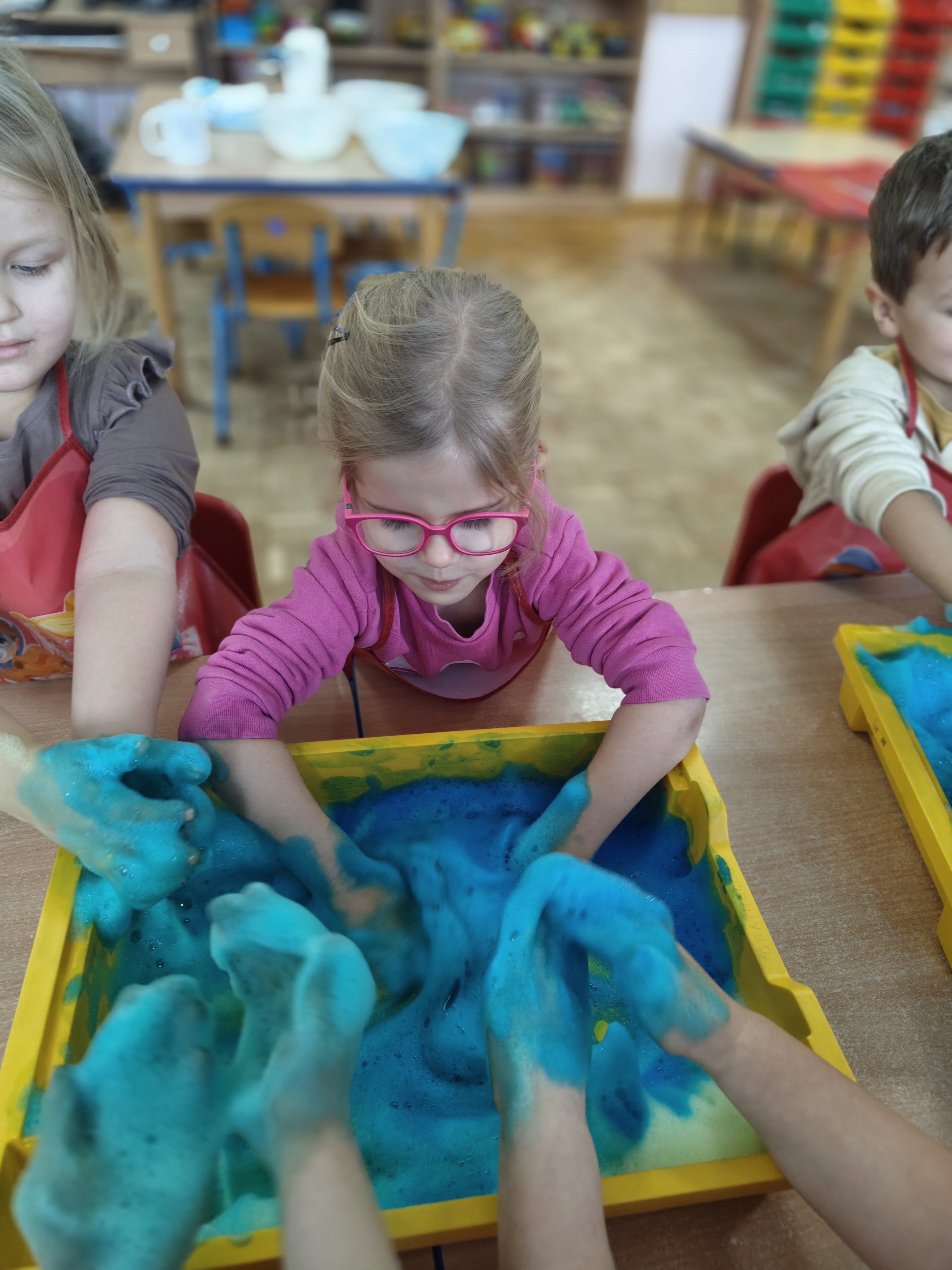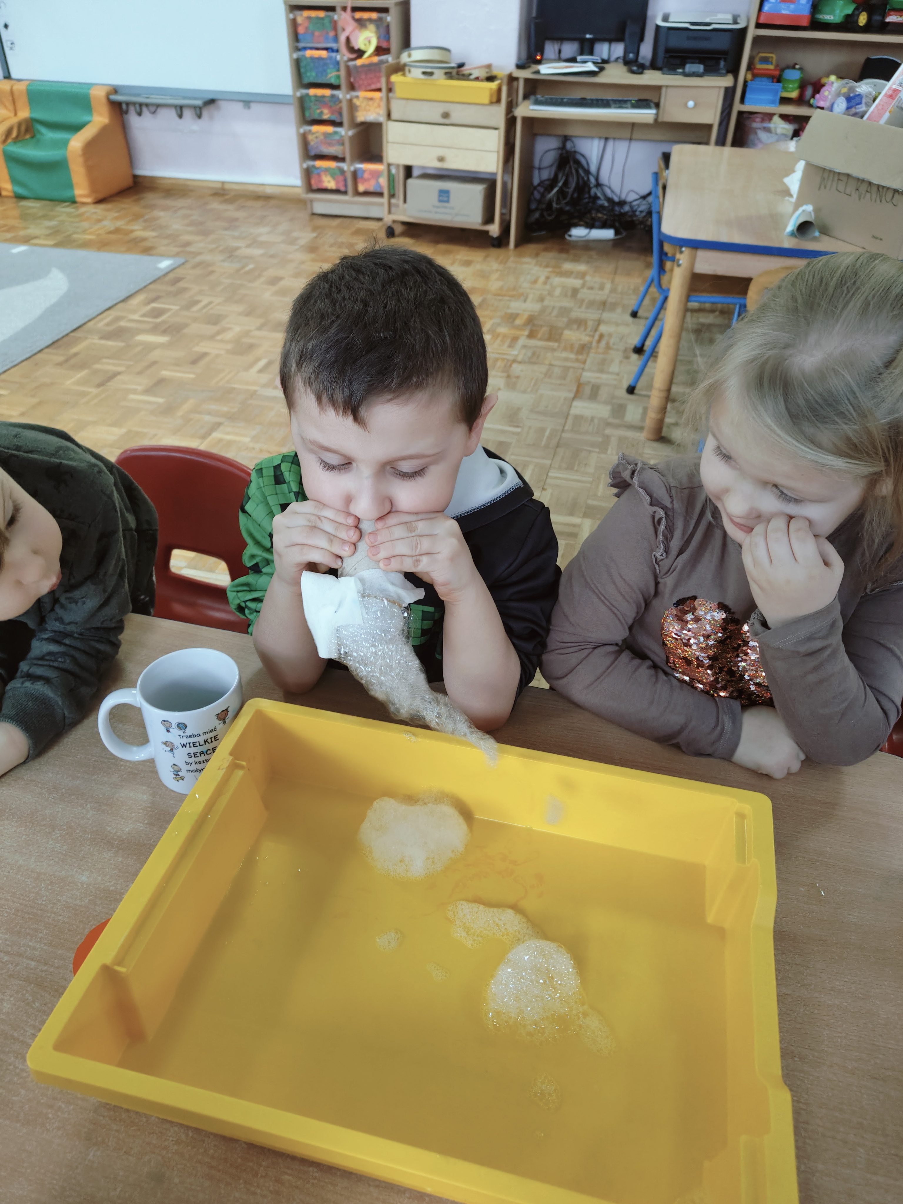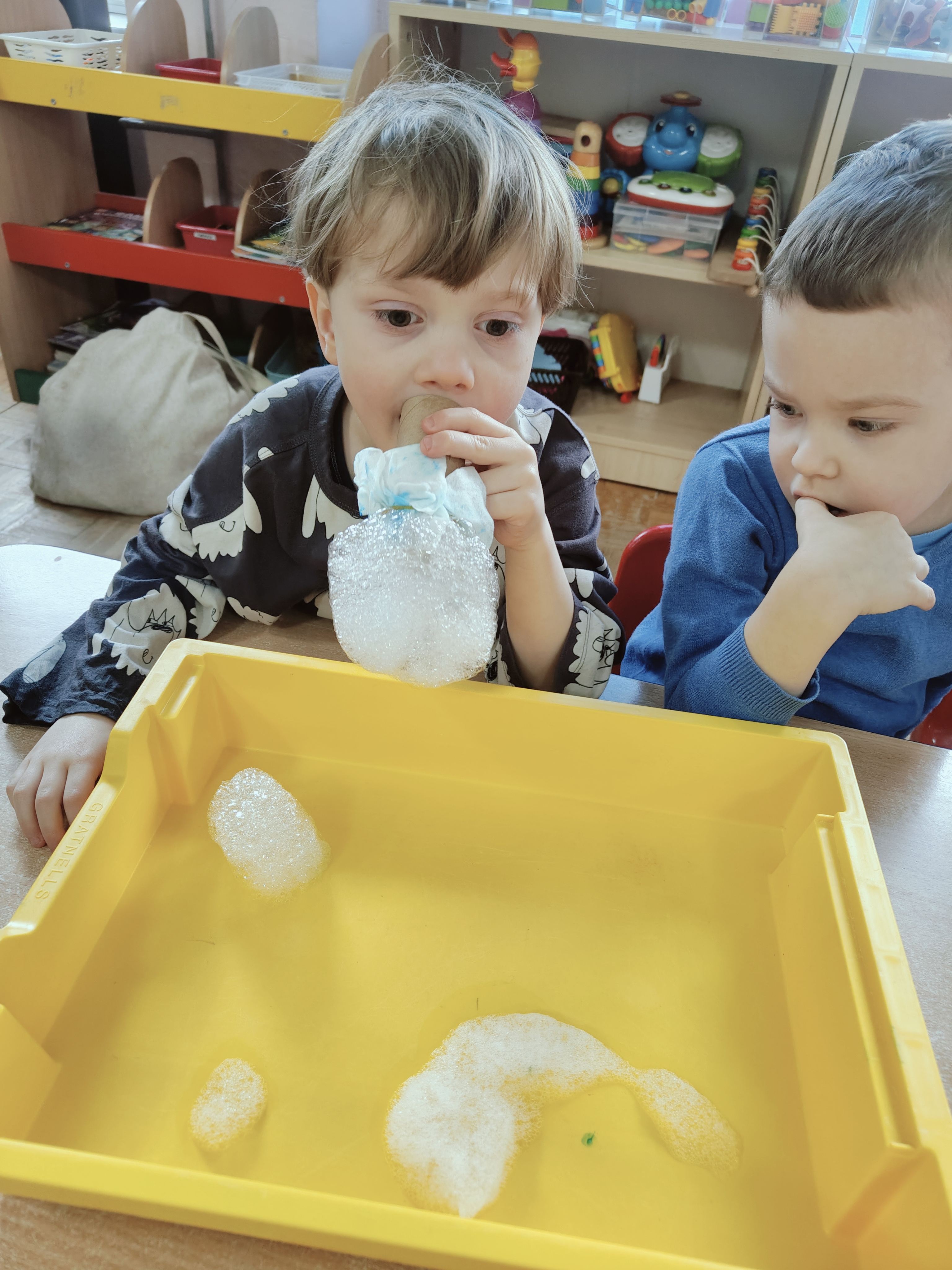 To był dzień pełen radości, śmiechu i kreatywnej zabawy. Poznaiśmy Rudkę- prawdziwego czyściocha, który doskonale wie jak się kąpać, aby zmyć z siebie cały brud. Wykonaliśmy również czyściochową fotoramkę,w której nasze czyściochowe przedszkolaki mogły zrobić sobie pamiątkowe zdjęcia. Przy piosence " Hop do kąpieli" uczyliśmy się nazw części ciała oraz jak prawidłowo je myć. Nie zabrakło też eksperymentów- dzieci z ogromnym zaangażowaniem tworzyły pianą, dmuchając w rolki. Na zakończenie powstała kolorowa piana, która pobudziła dziecięcą wyobraźnię i pozwoliła stworzyć prawdziwe piankowe dzieła sztuki.