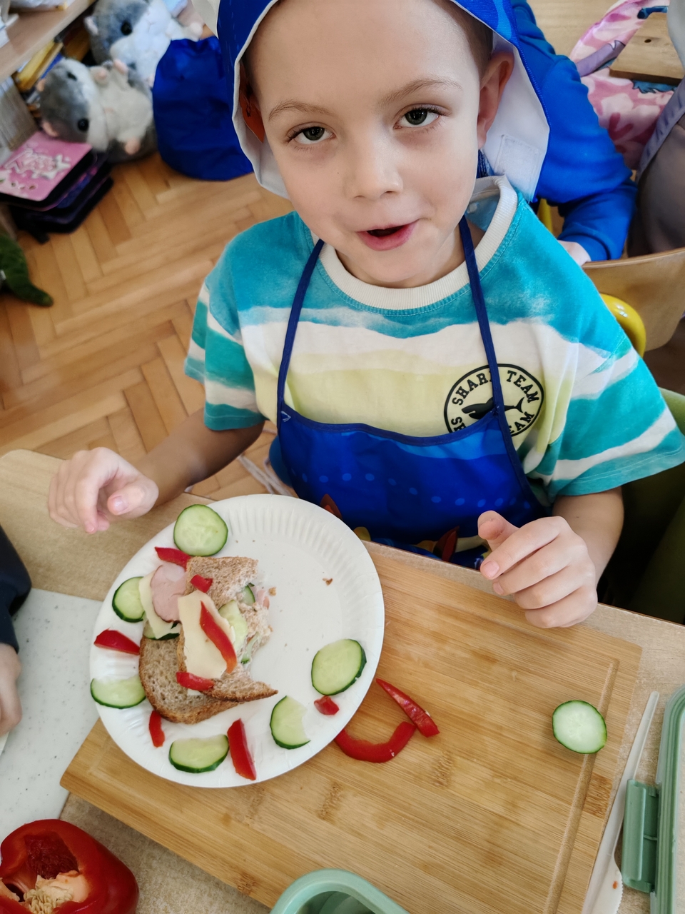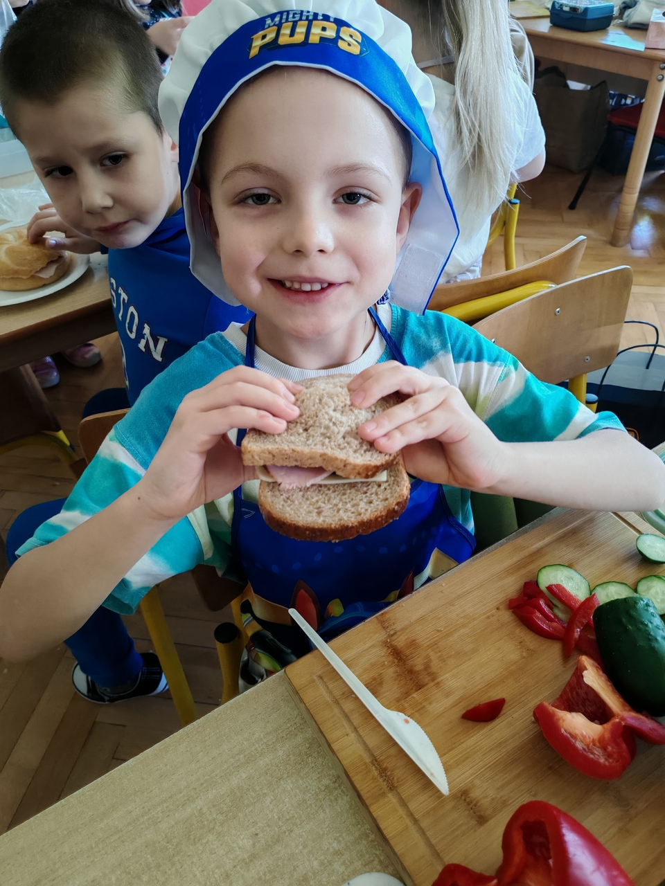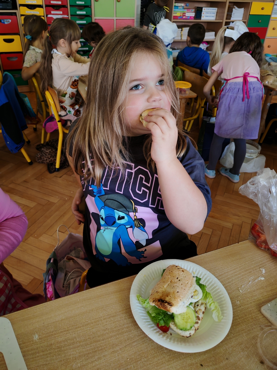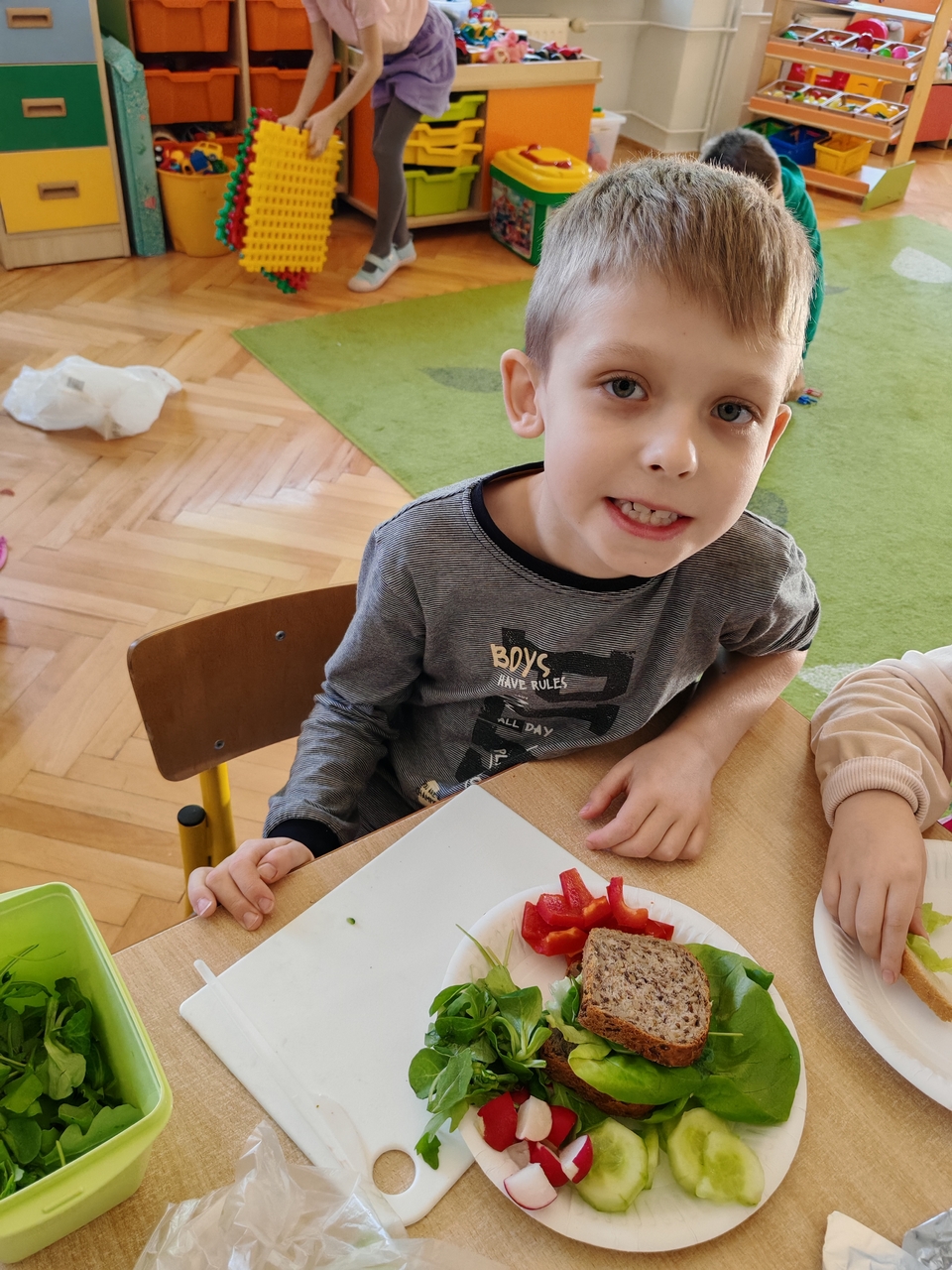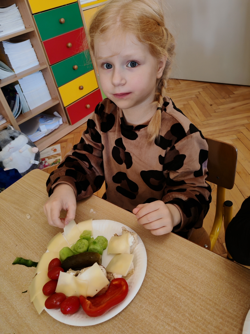 Dzisiaj obchodziliśmy Dzień Zdrowego Jedzenia. Na początku rozmawialiśmy o tym jak ważne są owoce i warzywa, zdrowe odżywianie i czego najlepiej unikać w swojej diecie. Było dużo owocowo- warzywnych zabaw min z ulubioną przez dzieci chustą animacyjną. Na zakończenie dzieci przygotowały z ogromnym zaangażowaniem pyszne kanapeczki ze swoich ulubionych produktów, które później z apetytem zjadły.
