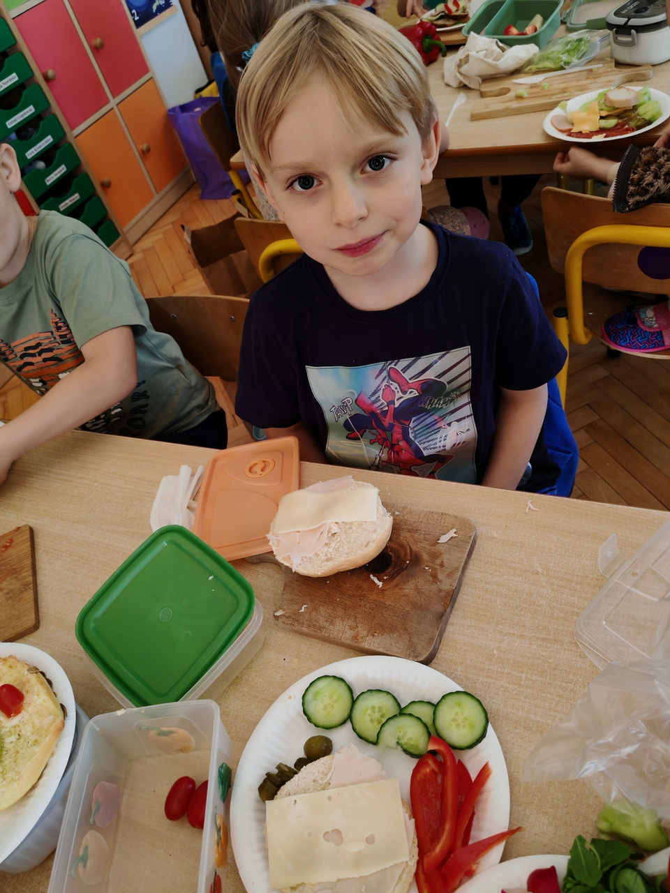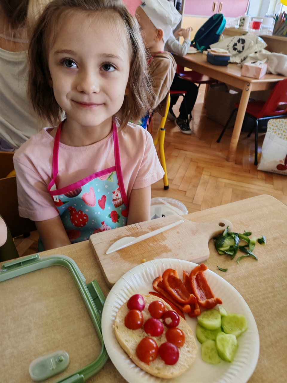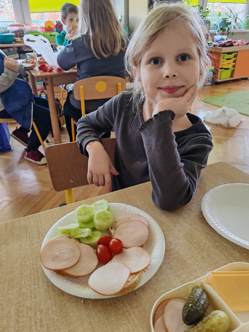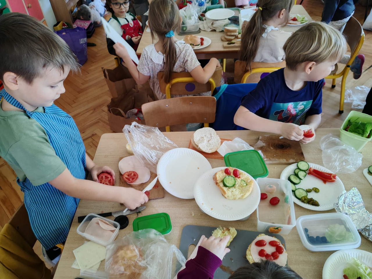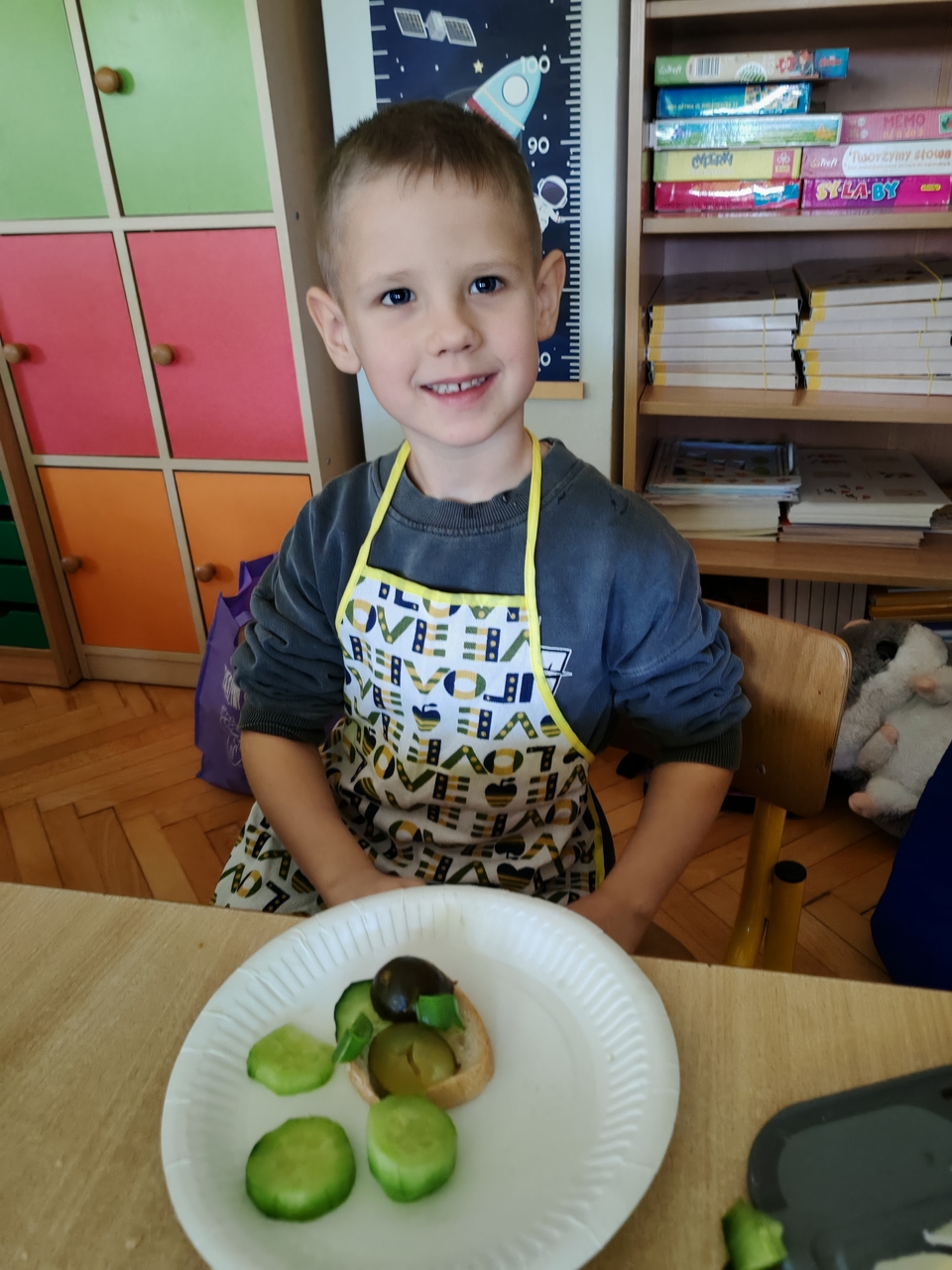 Dzisiaj obchodziliśmy Dzień Zdrowego Jedzenia. Na początku rozmawialiśmy o tym jak ważne są owoce i warzywa, zdrowe odżywianie i czego najlepiej unikać w swojej diecie. Było dużo owocowo- warzywnych zabaw min z ulubioną przez dzieci chustą animacyjną. Na zakończenie dzieci przygotowały z ogromnym zaangażowaniem pyszne kanapeczki ze swoich ulubionych produktów, które później z apetytem zjadły.
