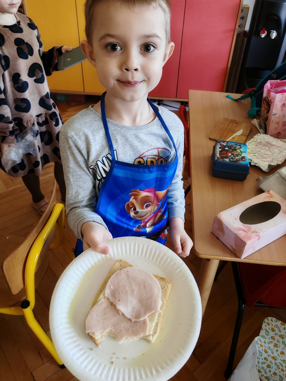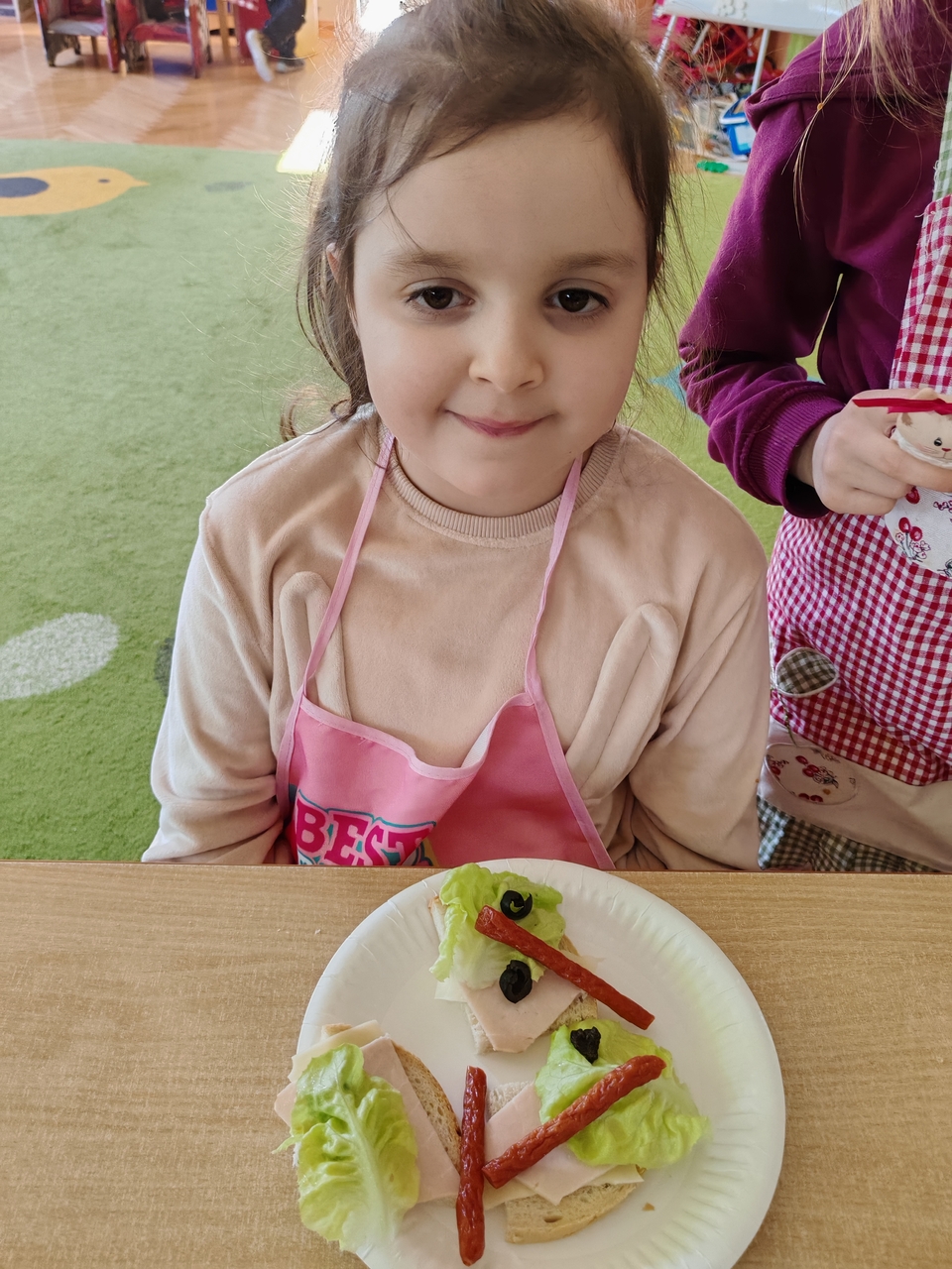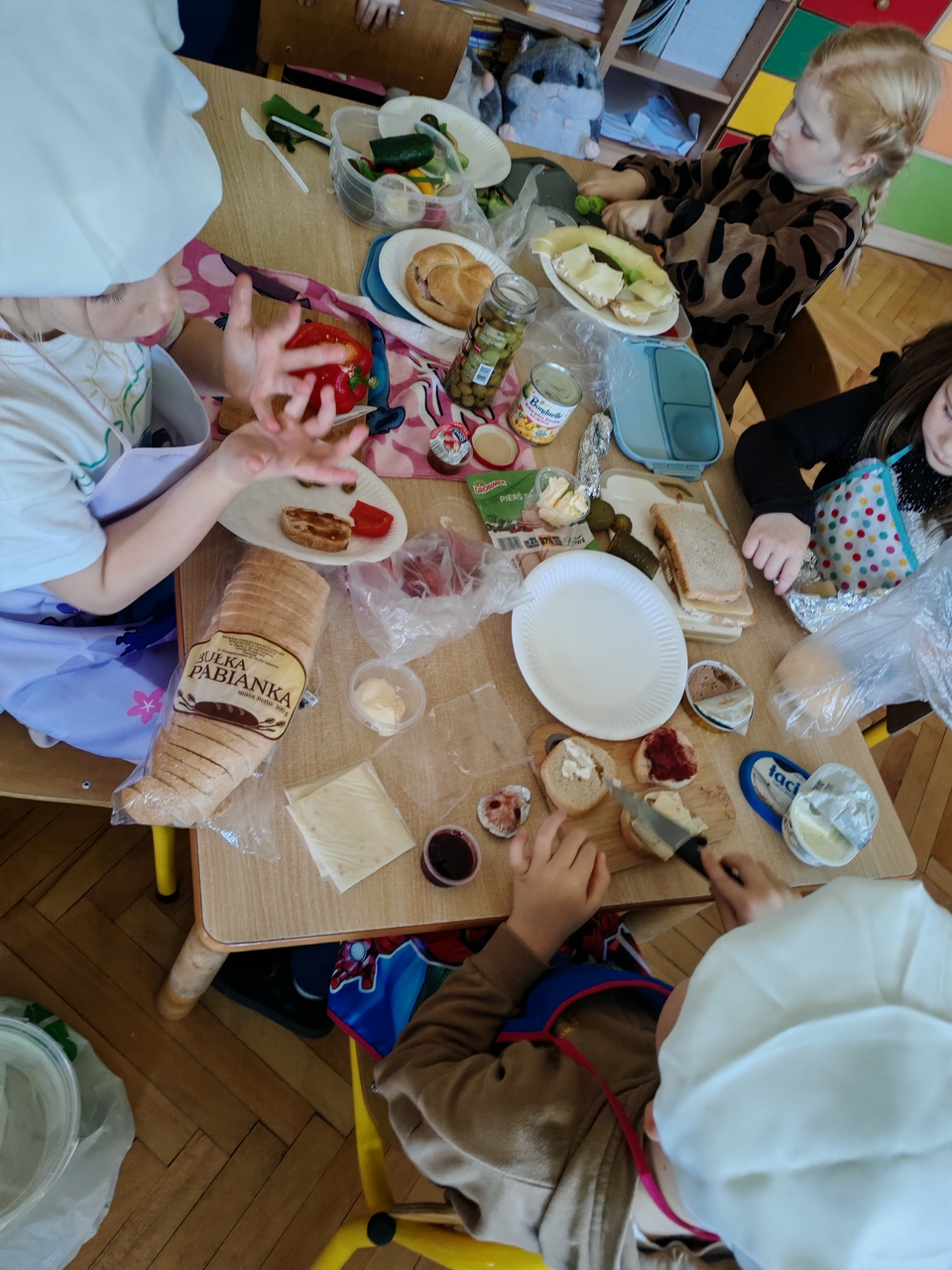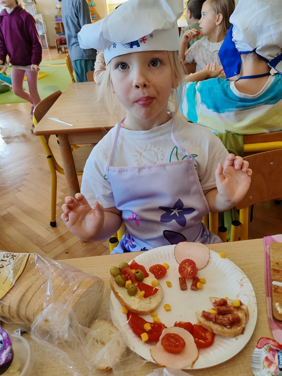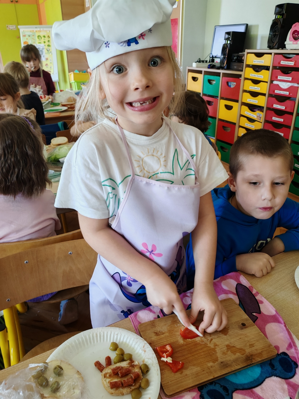 Dzisiaj obchodziliśmy Dzień Zdrowego Jedzenia. Na początku rozmawialiśmy o tym jak ważne są owoce i warzywa, zdrowe odżywianie i czego najlepiej unikać w swojej diecie. Było dużo owocowo- warzywnych zabaw min z ulubioną przez dzieci chustą animacyjną. Na zakończenie dzieci przygotowały z ogromnym zaangażowaniem pyszne kanapeczki ze swoich ulubionych produktów, które później z apetytem zjadły.