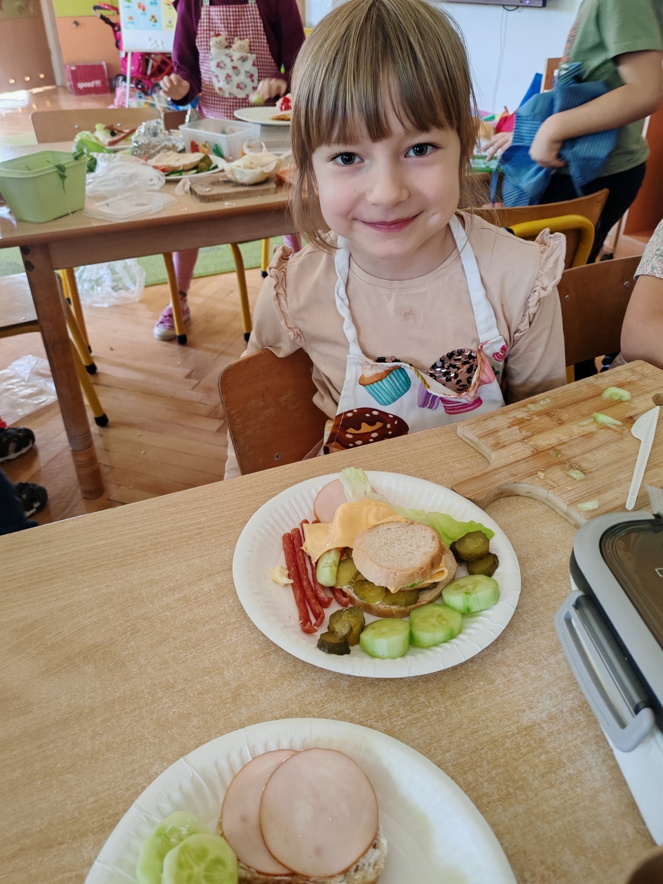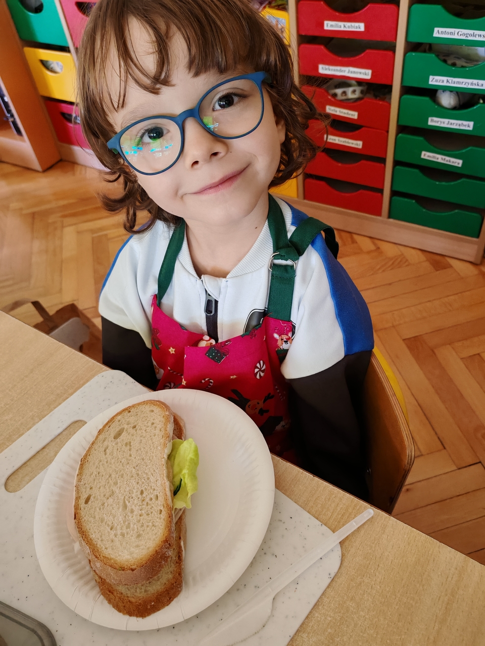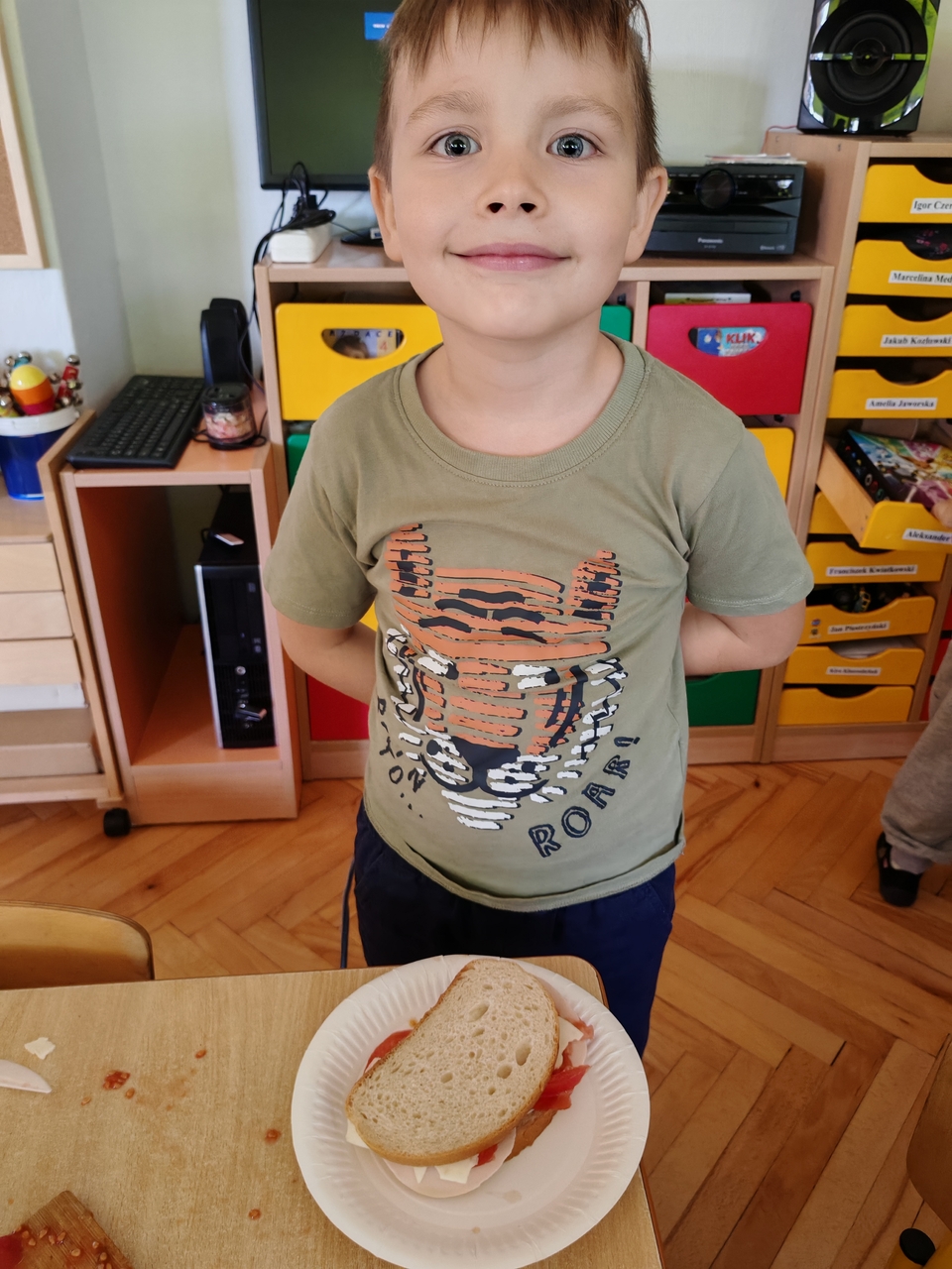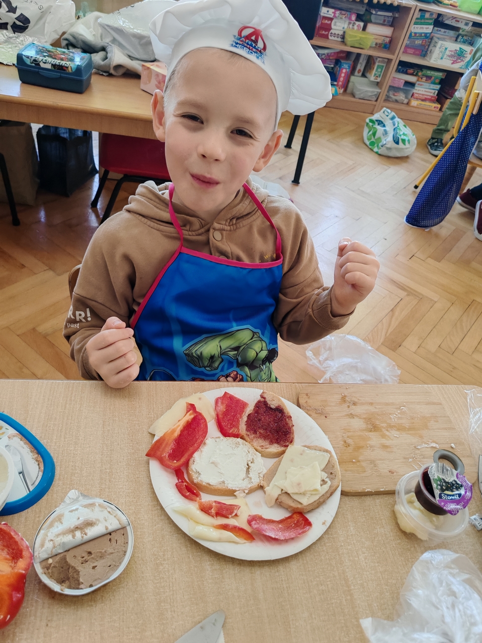 Dzisiaj obchodziliśmy Dzień Zdrowego Jedzenia. Na początku rozmawialiśmy o tym jak ważne są owoce i warzywa, zdrowe odżywianie i czego najlepiej unikać w swojej diecie. Było dużo owocowo- warzywnych zabaw min z ulubioną przez dzieci chustą animacyjną. Na zakończenie dzieci przygotowały z ogromnym zaangażowaniem pyszne kanapeczki ze swoich ulubionych produktów, które później z apetytem zjadły.