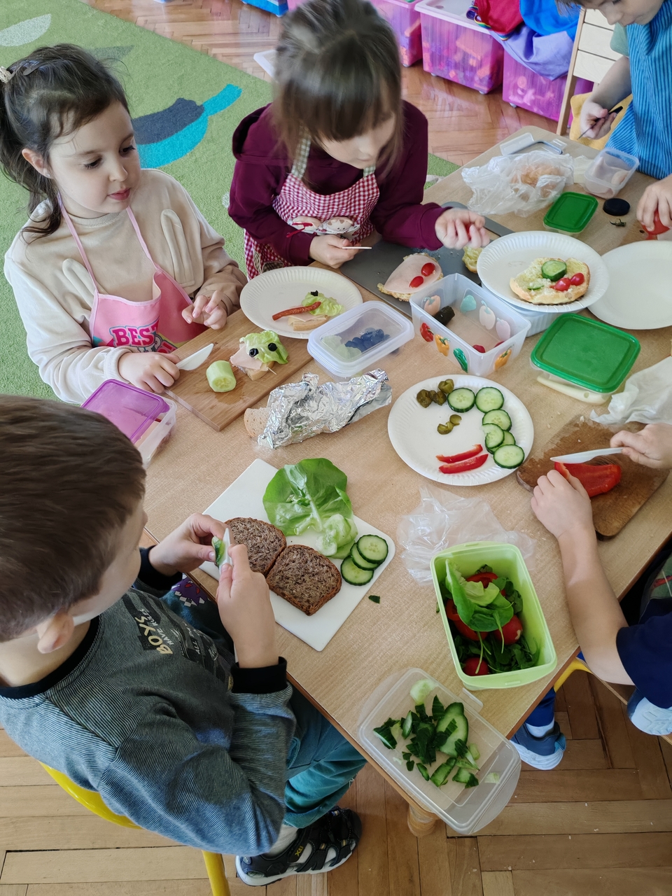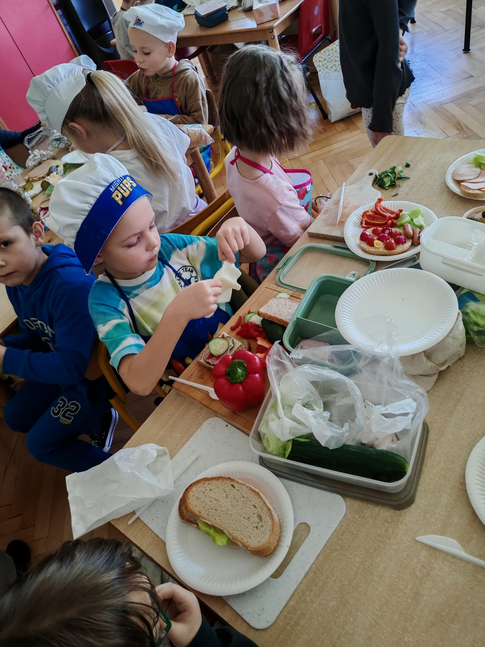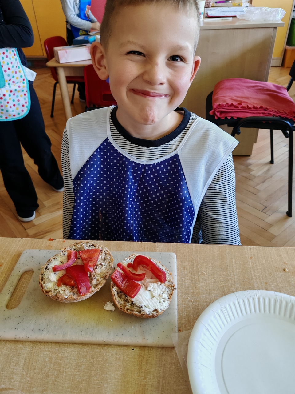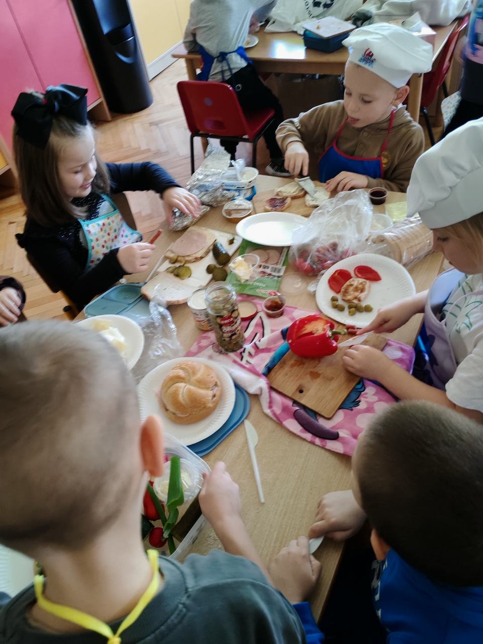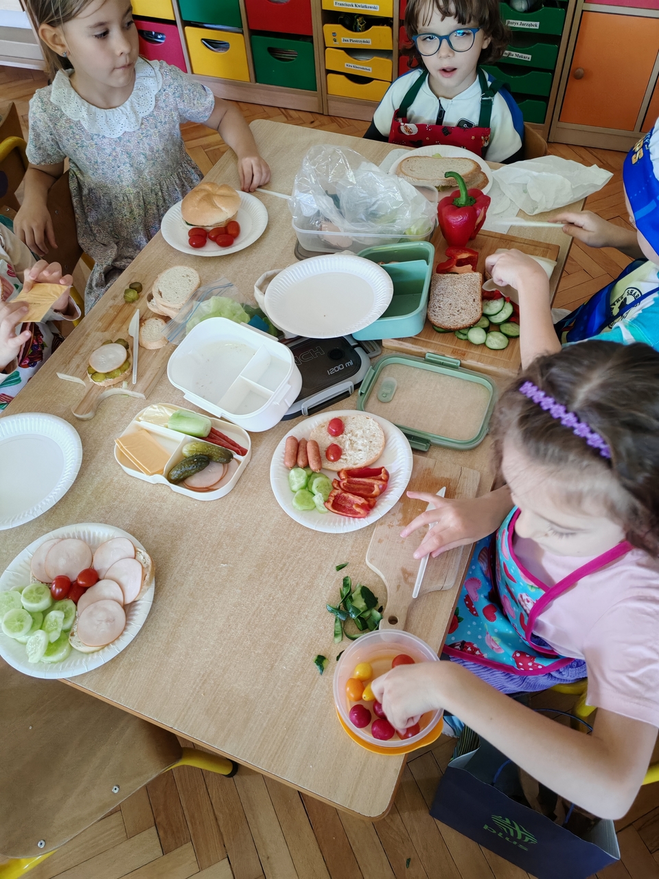 Dzisiaj obchodziliśmy Dzień Zdrowego Jedzenia. Na początku rozmawialiśmy o tym jak ważne są owoce i warzywa, zdrowe odżywianie i czego najlepiej unikać w swojej diecie. Było dużo owocowo- warzywnych zabaw min z ulubioną przez dzieci chustą animacyjną. Na zakończenie dzieci przygotowały z ogromnym zaangażowaniem pyszne kanapeczki ze swoich ulubionych produktów, które później z apetytem zjadły.