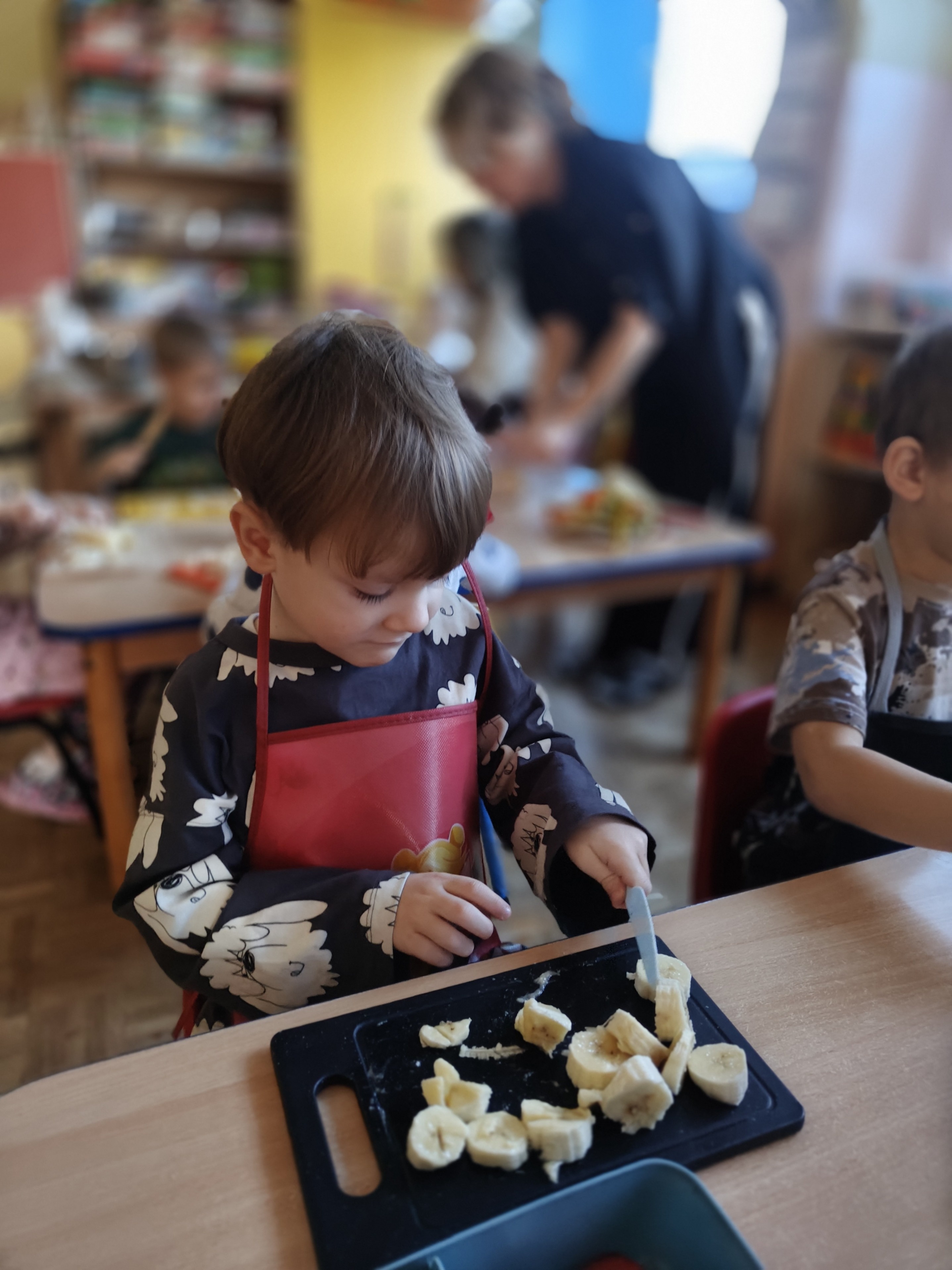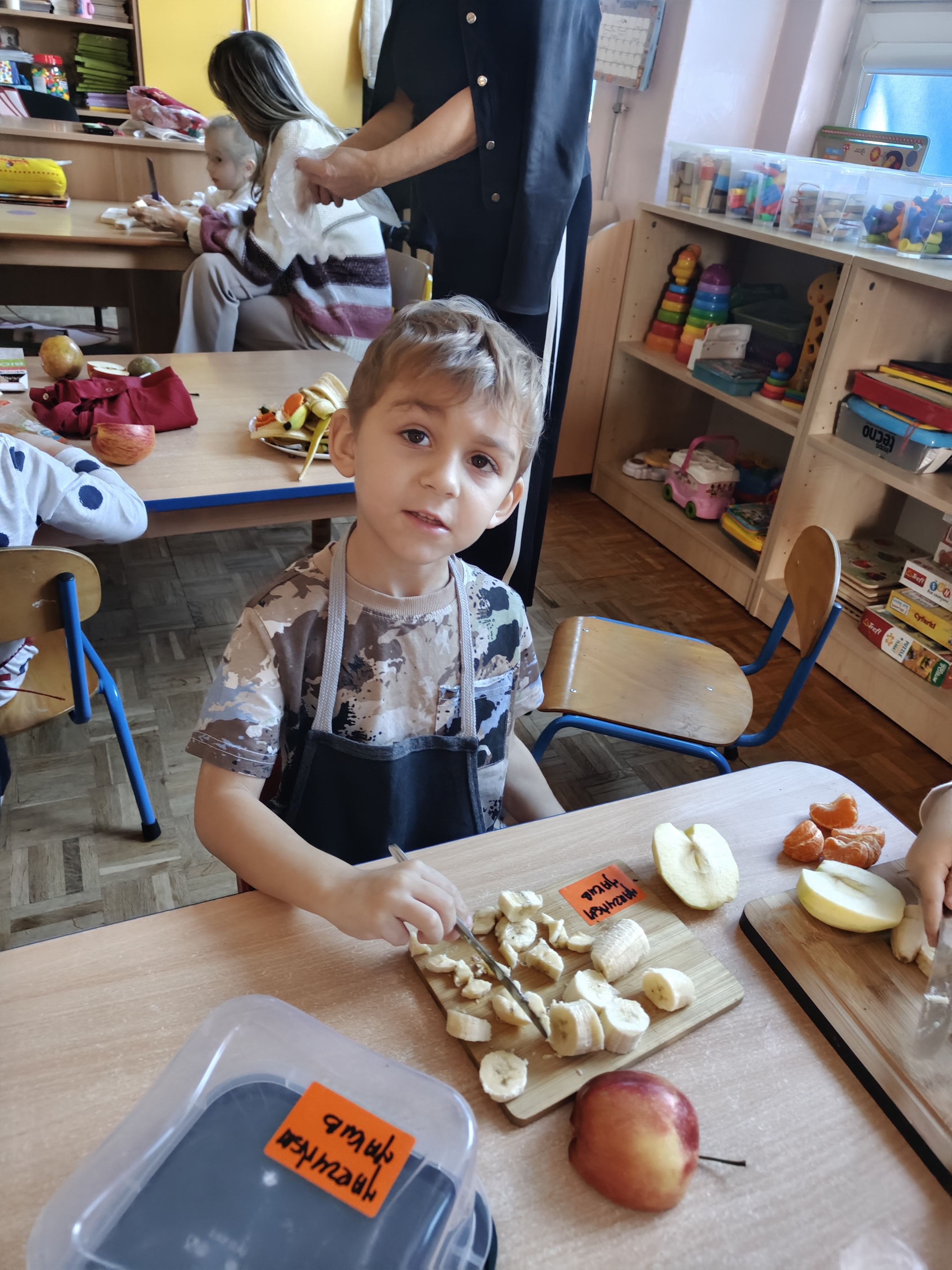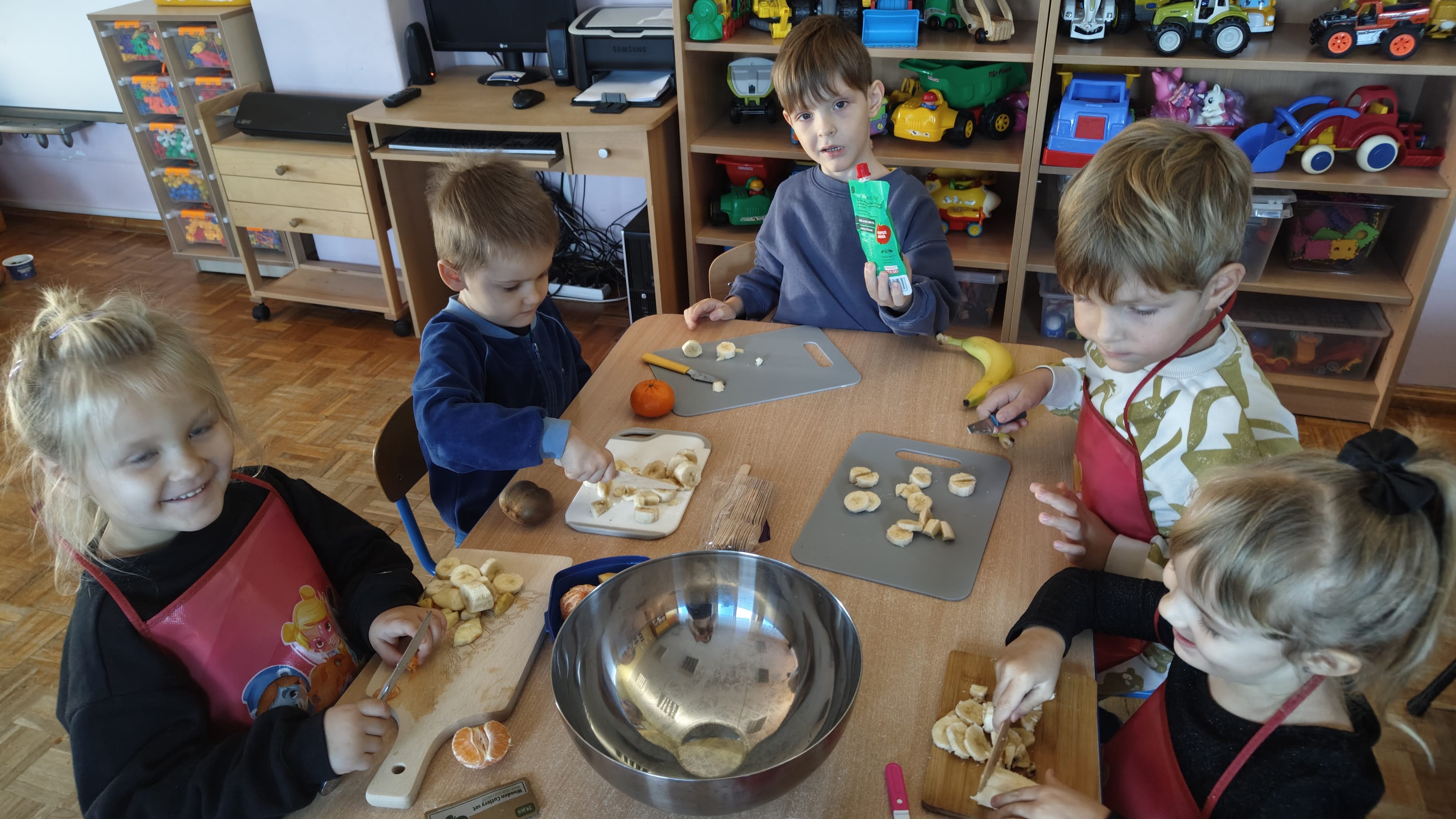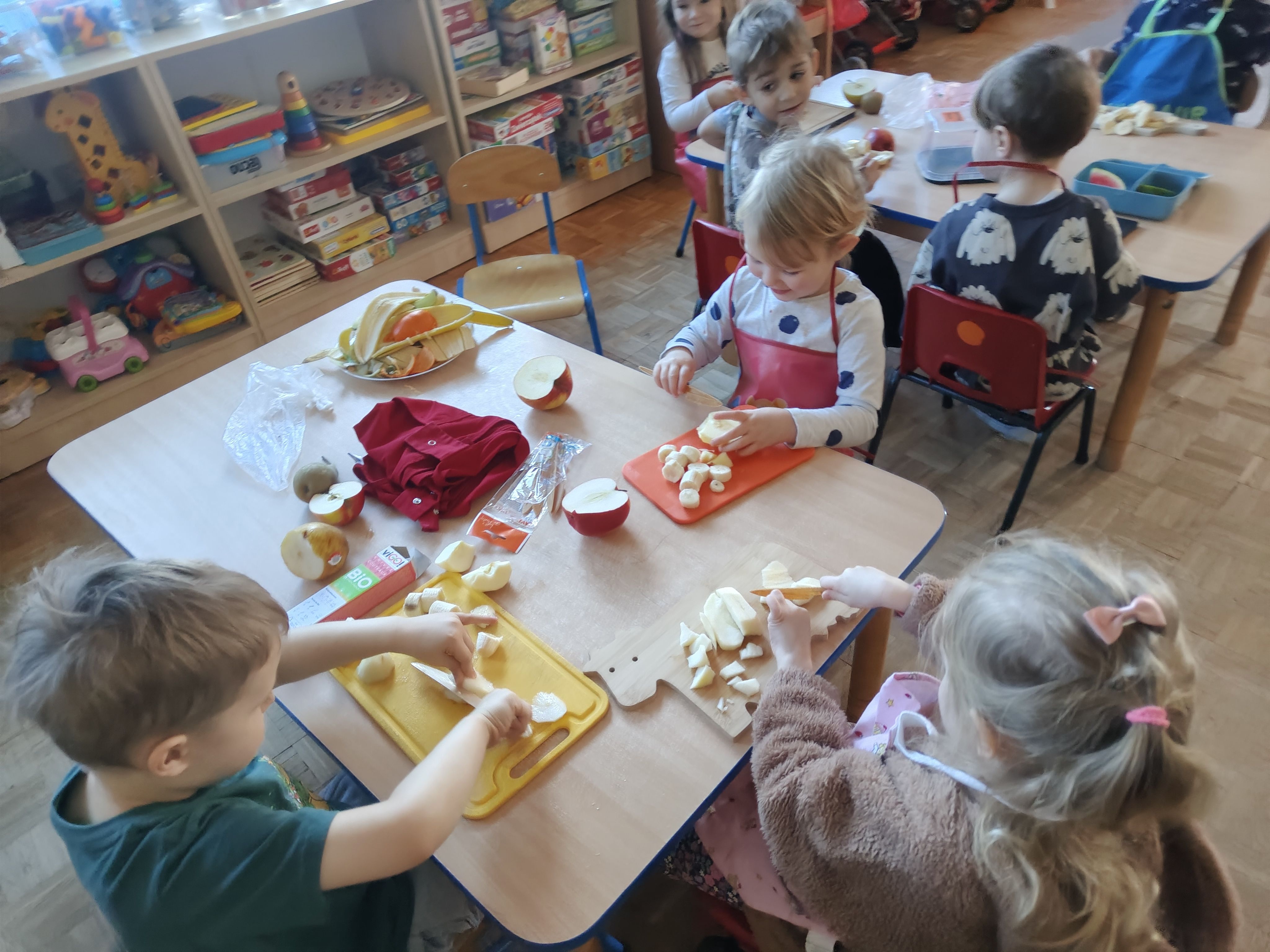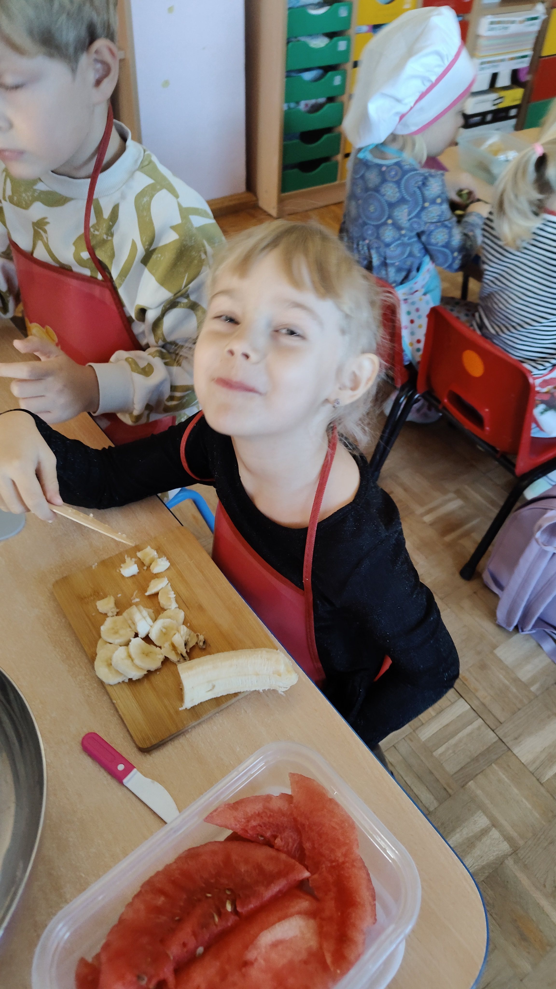 Dzisiejszy dzień upłynął nam pod znakiem zdrowia i dobrego humoru! Na początek dzieci bawiły się w owocowe memory, a potem próbowały rozpoznać produkty po dotyku- było przy tym mnóstwo śmiechu! Następnie wspólnie dzieliliśmy jedzenie na zdrowe i niezdrowe, ucząc się co warto jeść, by ieć dużo energii.Na zakończenie dzieci z wielkim zaangażowaniem kroiły kolorową sałatkę- przygotowanie jej sprawiło im wiele radości, a najwiekszą nagrodą było... jej wspólne zjedzenie!