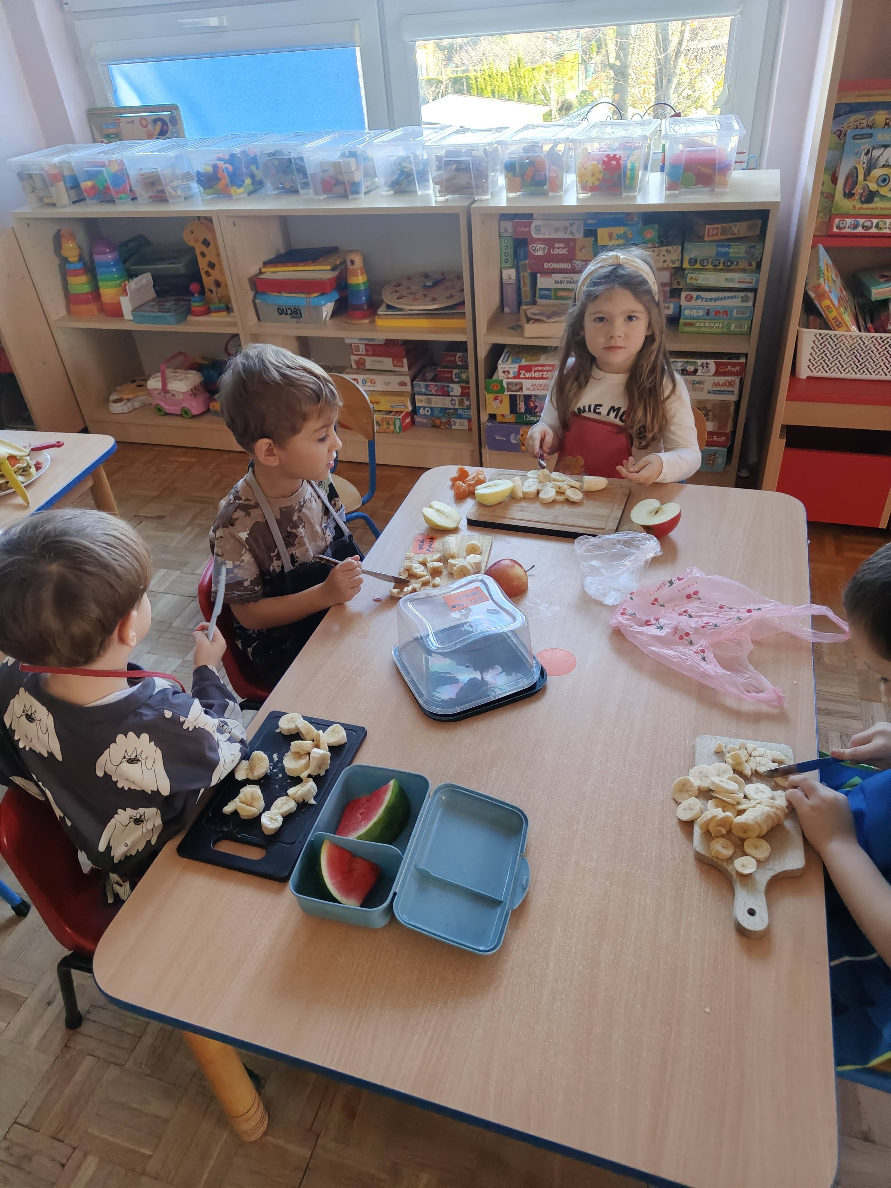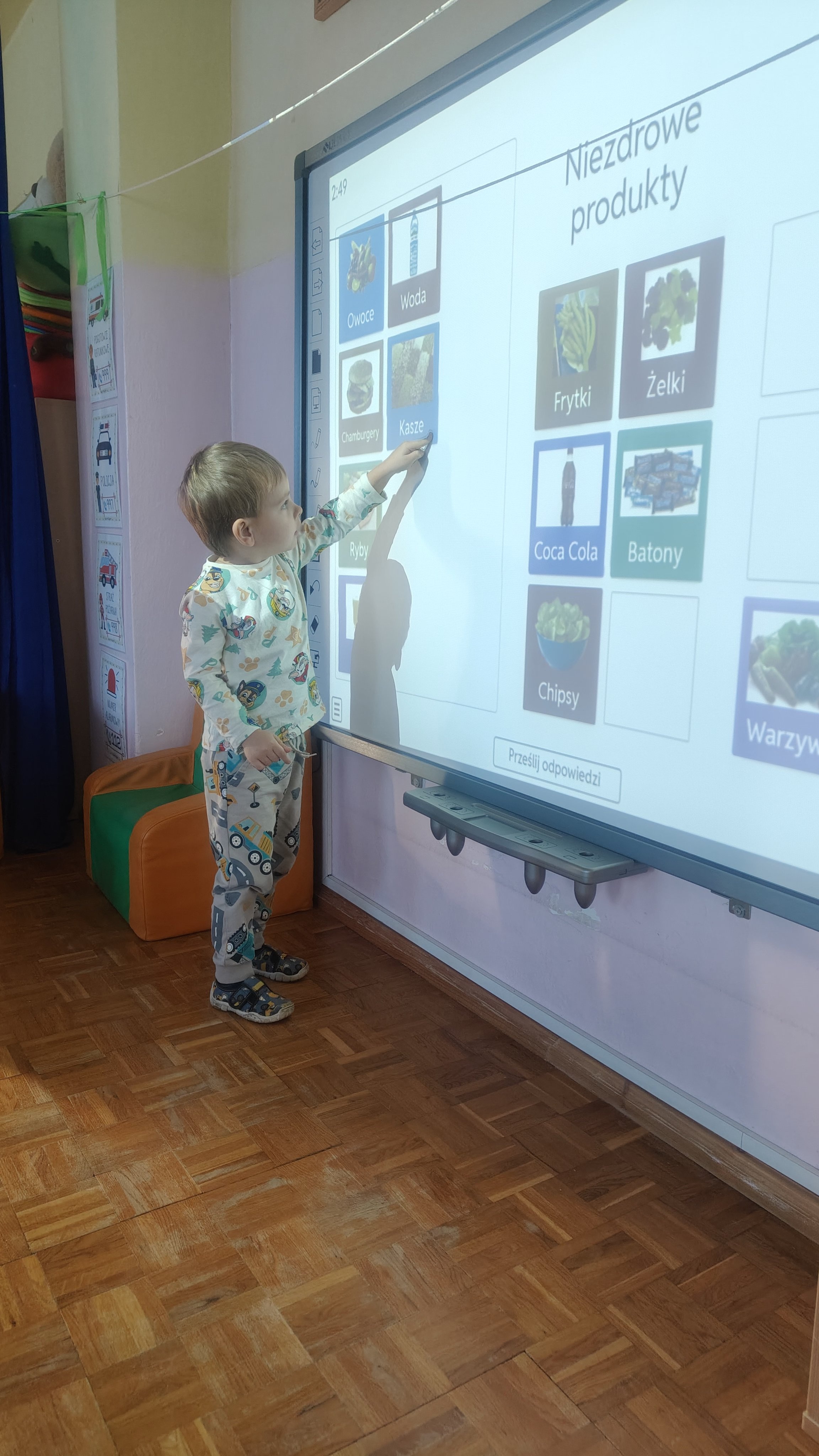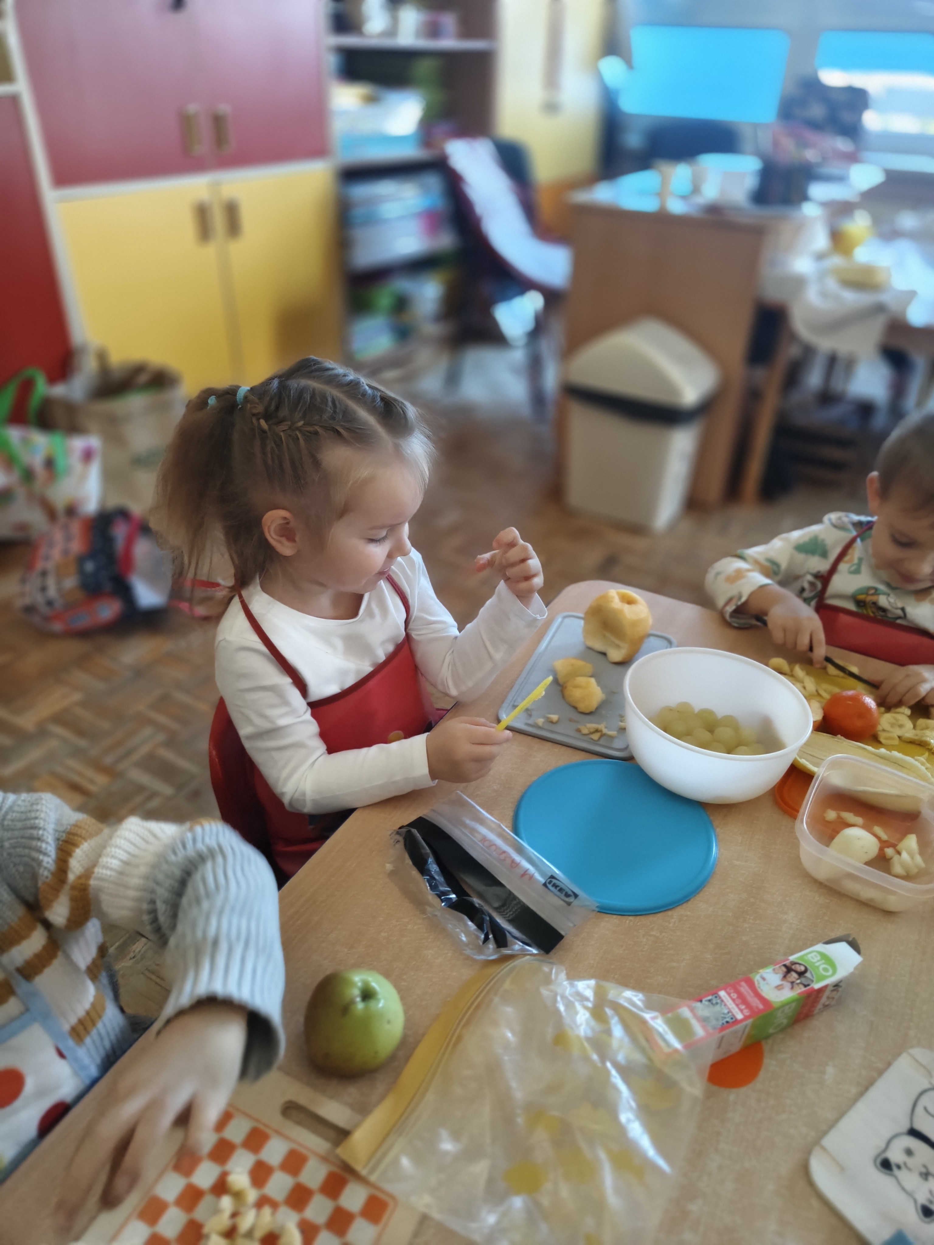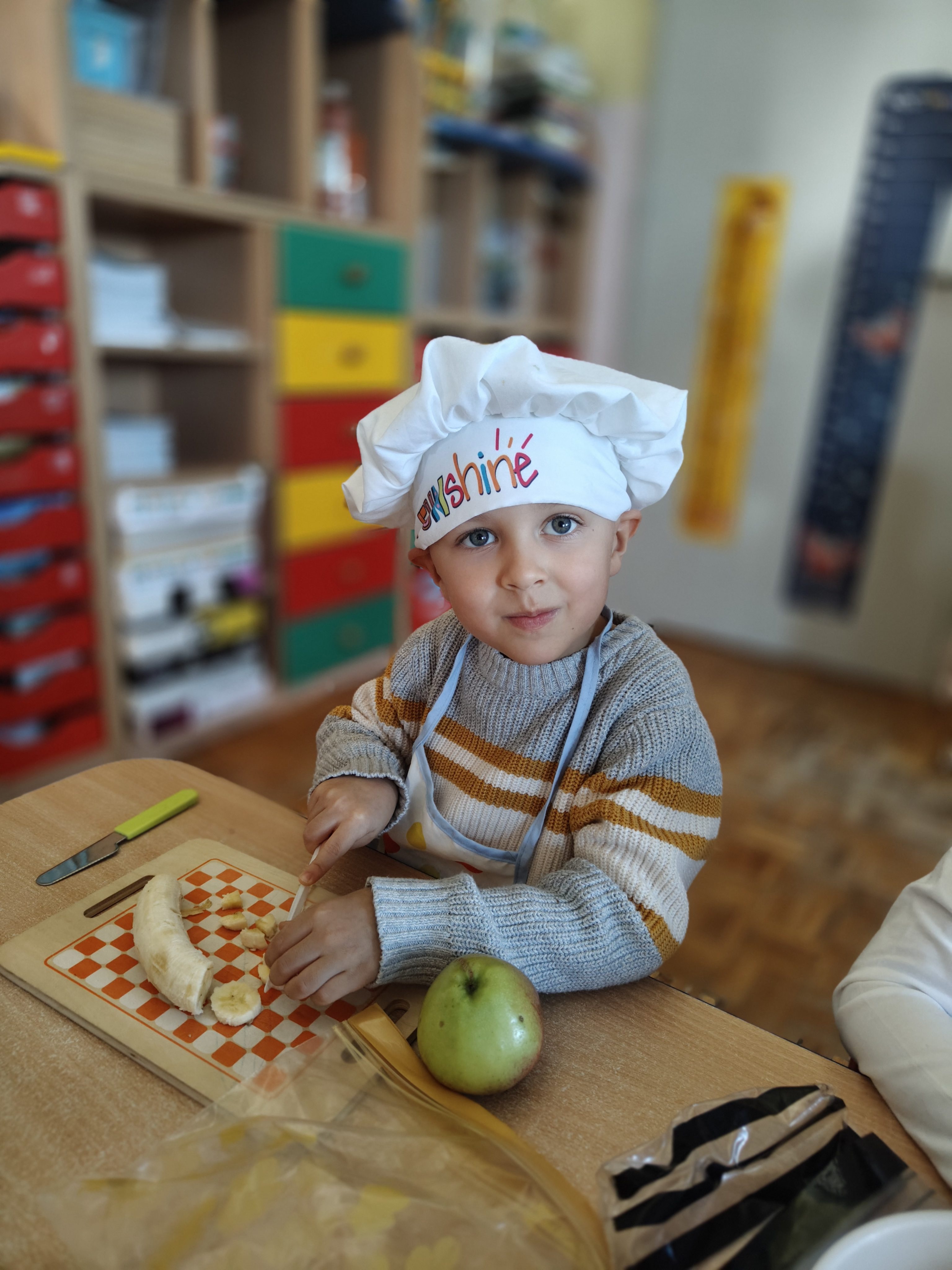 Dzisiejszy dzień upłynął nam pod znakiem zdrowia i dobrego humoru! Na początek dzieci bawiły się w owocowe memory, a potem próbowały rozpoznać produkty po dotyku- było przy tym mnóstwo śmiechu! Następnie wspólnie dzieliliśmy jedzenie na zdrowe i niezdrowe, ucząc się co warto jeść, by ieć dużo energii.Na zakończenie dzieci z wielkim zaangażowaniem kroiły kolorową sałatkę- przygotowanie jej sprawiło im wiele radości, a najwiekszą nagrodą było... jej wspólne zjedzenie!