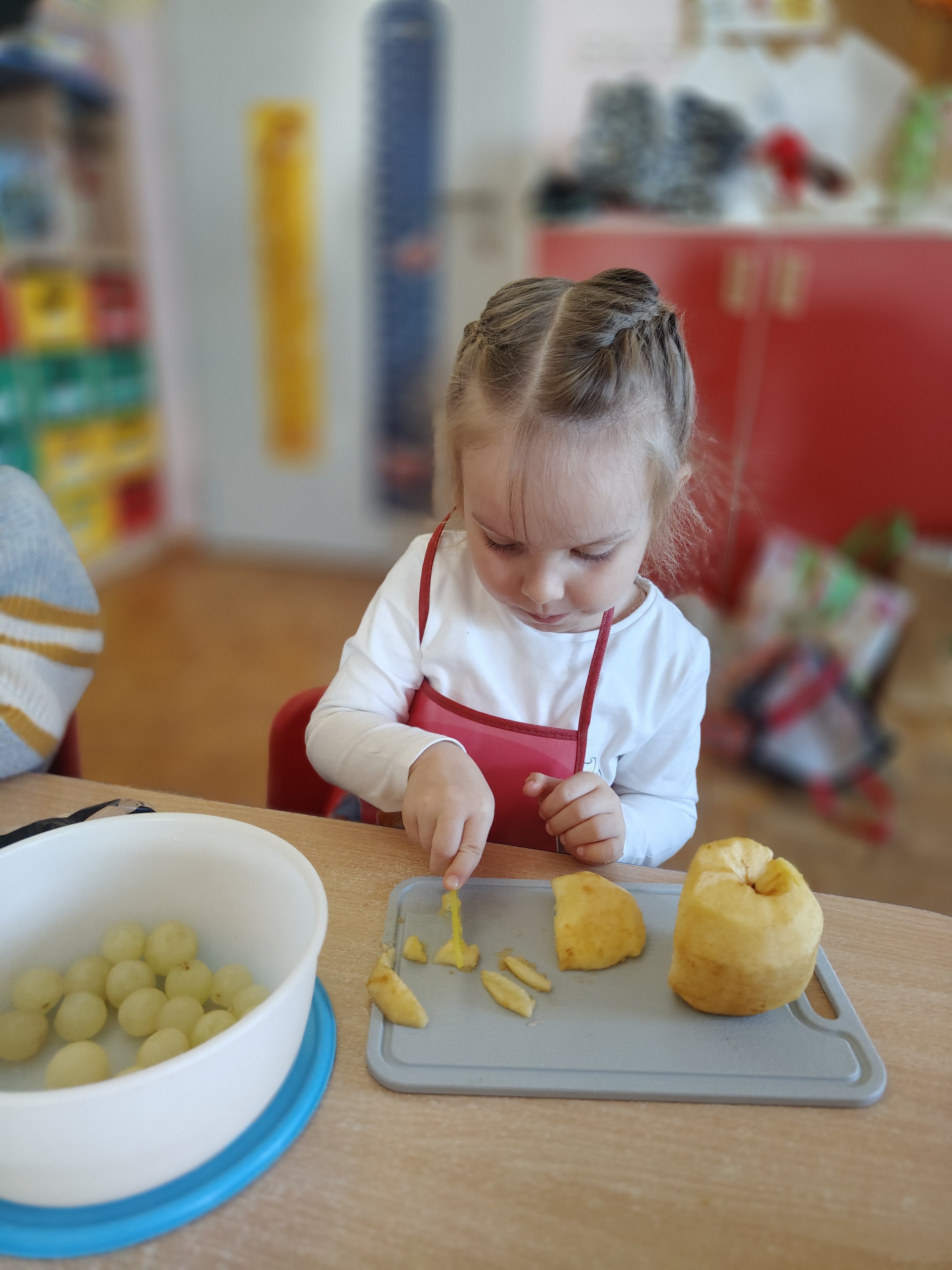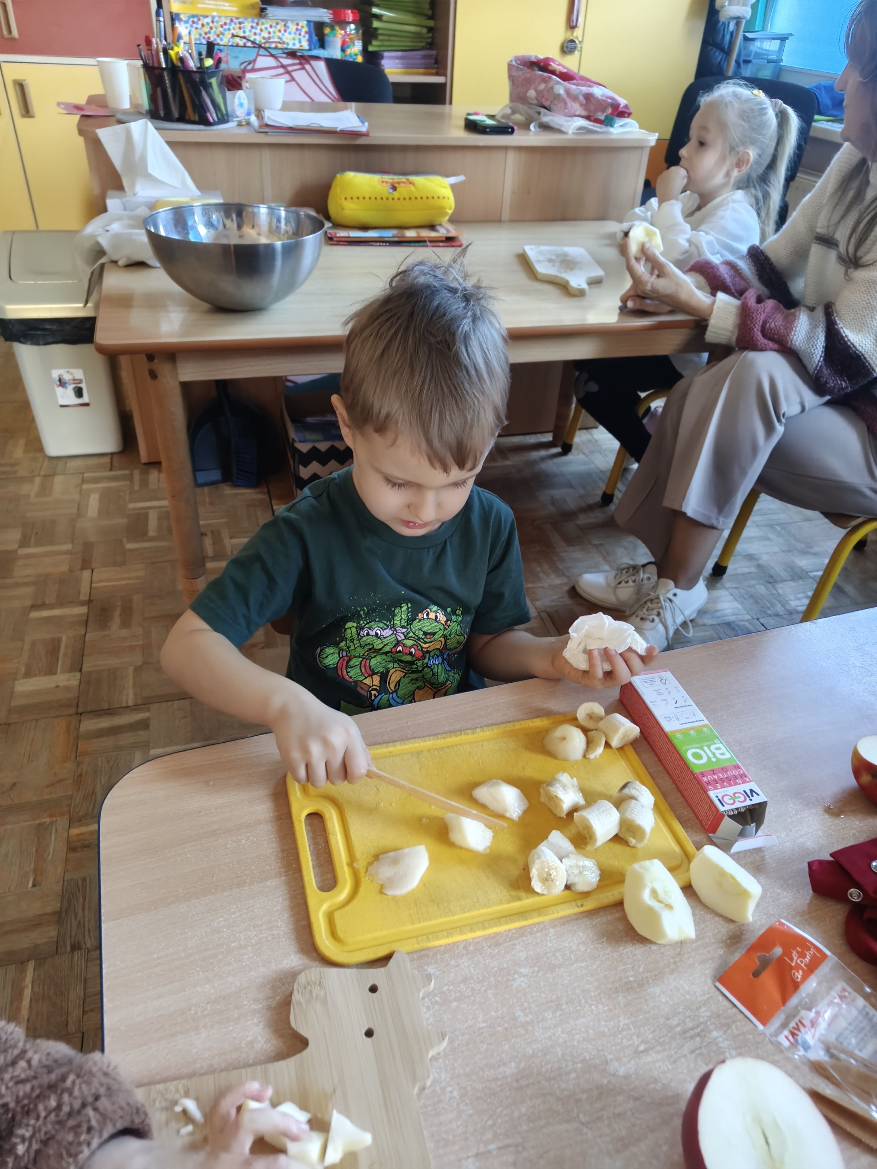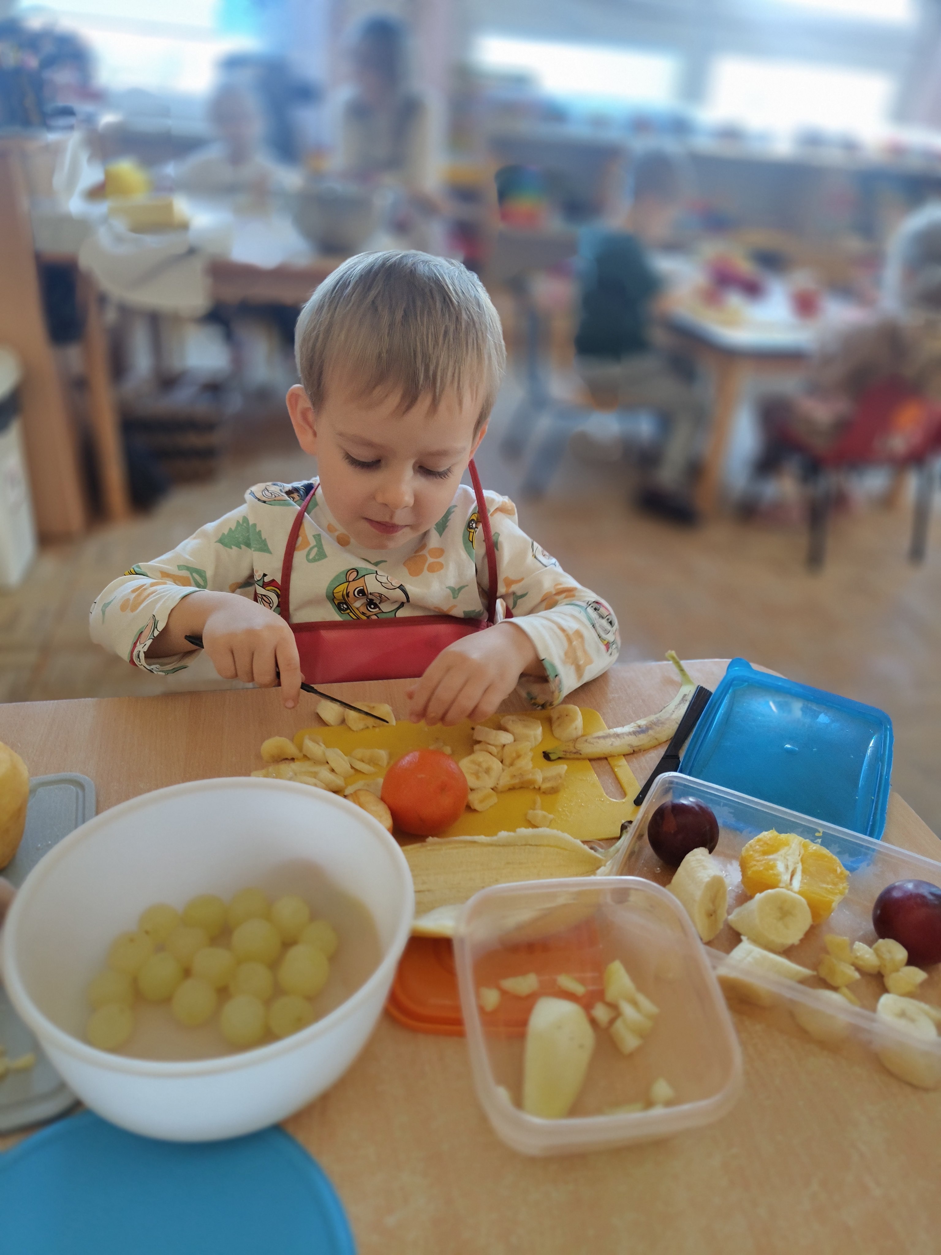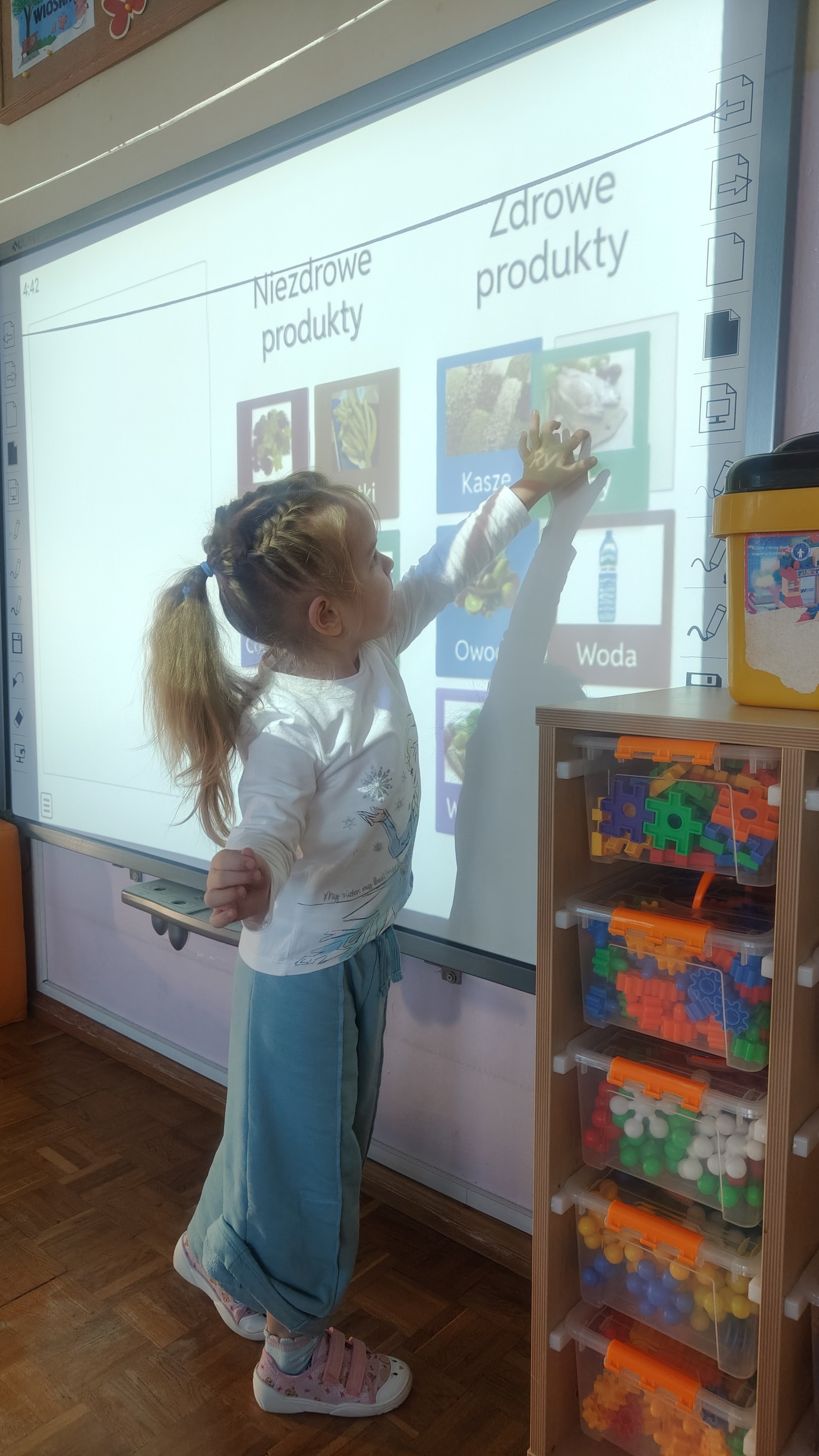 Dzisiejszy dzień upłynął nam pod znakiem zdrowia i dobrego humoru! Na początek dzieci bawiły się w owocowe memory, a potem próbowały rozpoznać produkty po dotyku- było przy tym mnóstwo śmiechu! Następnie wspólnie dzieliliśmy jedzenie na zdrowe i niezdrowe, ucząc się co warto jeść, by ieć dużo energii.Na zakończenie dzieci z wielkim zaangażowaniem kroiły kolorową sałatkę- przygotowanie jej sprawiło im wiele radości, a najwiekszą nagrodą było... jej wspólne zjedzenie!