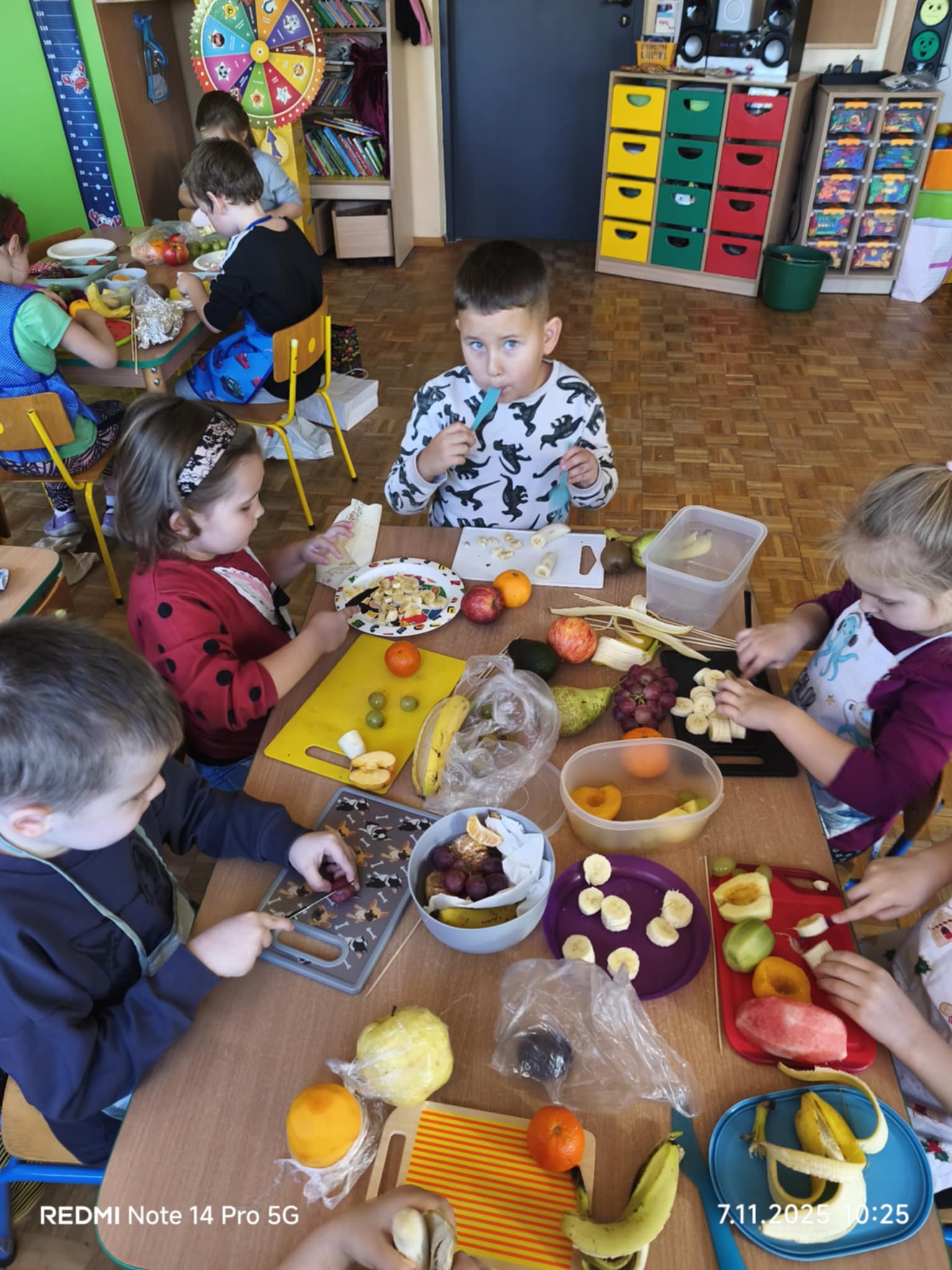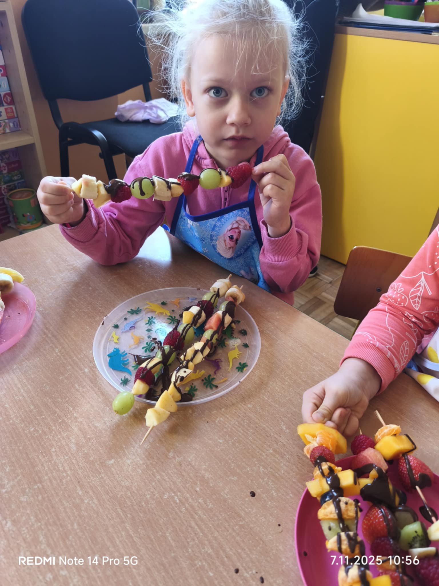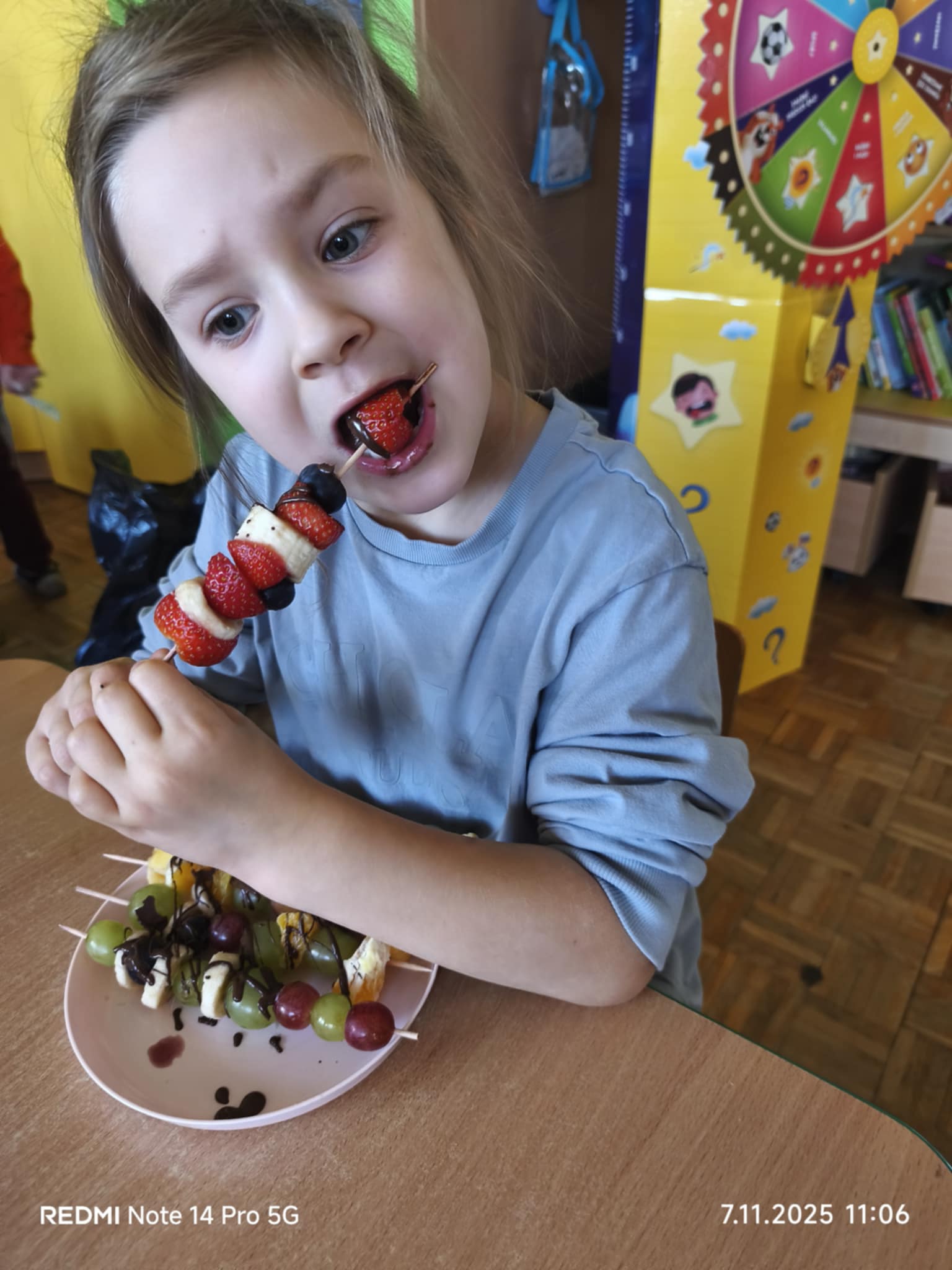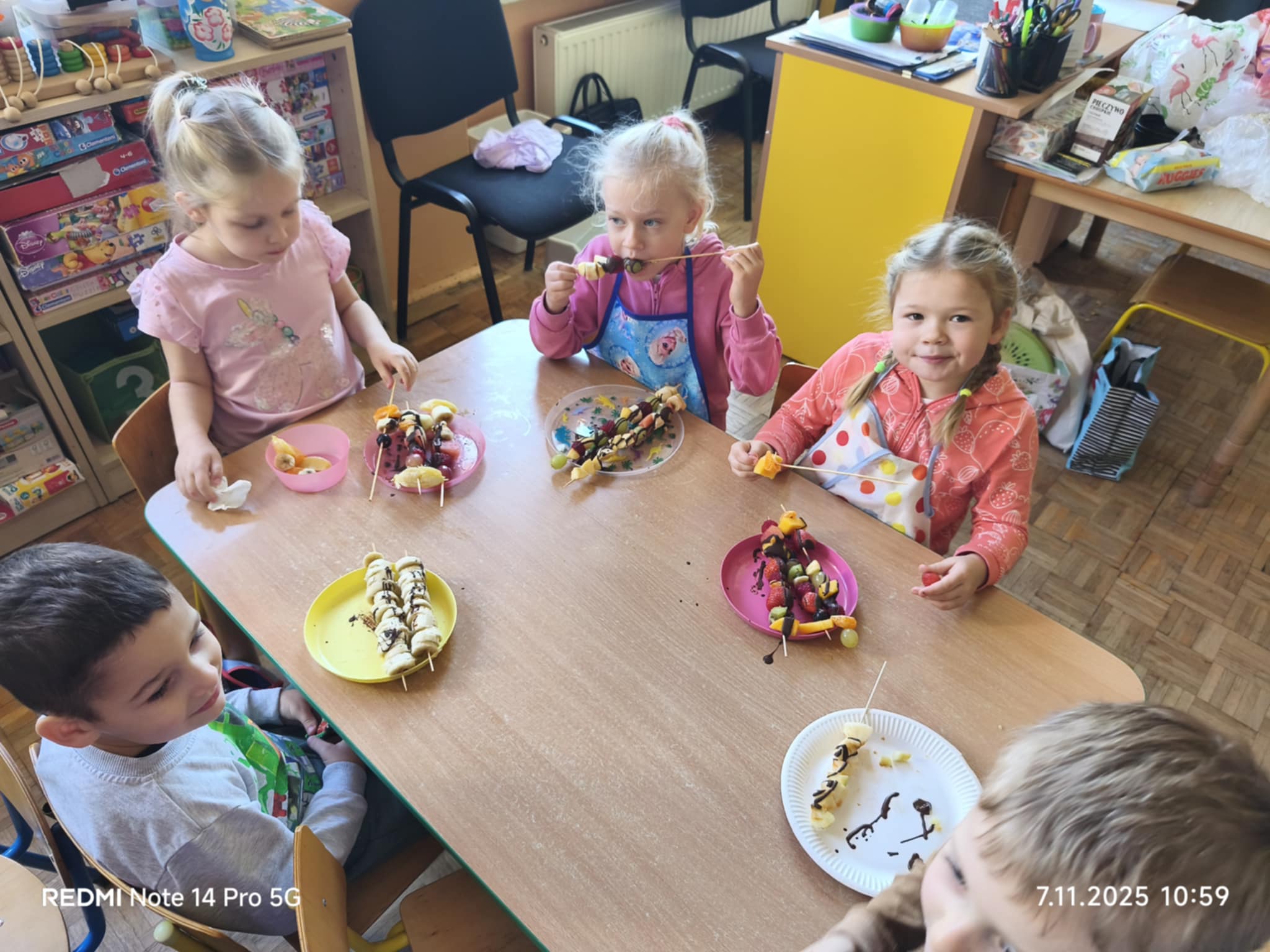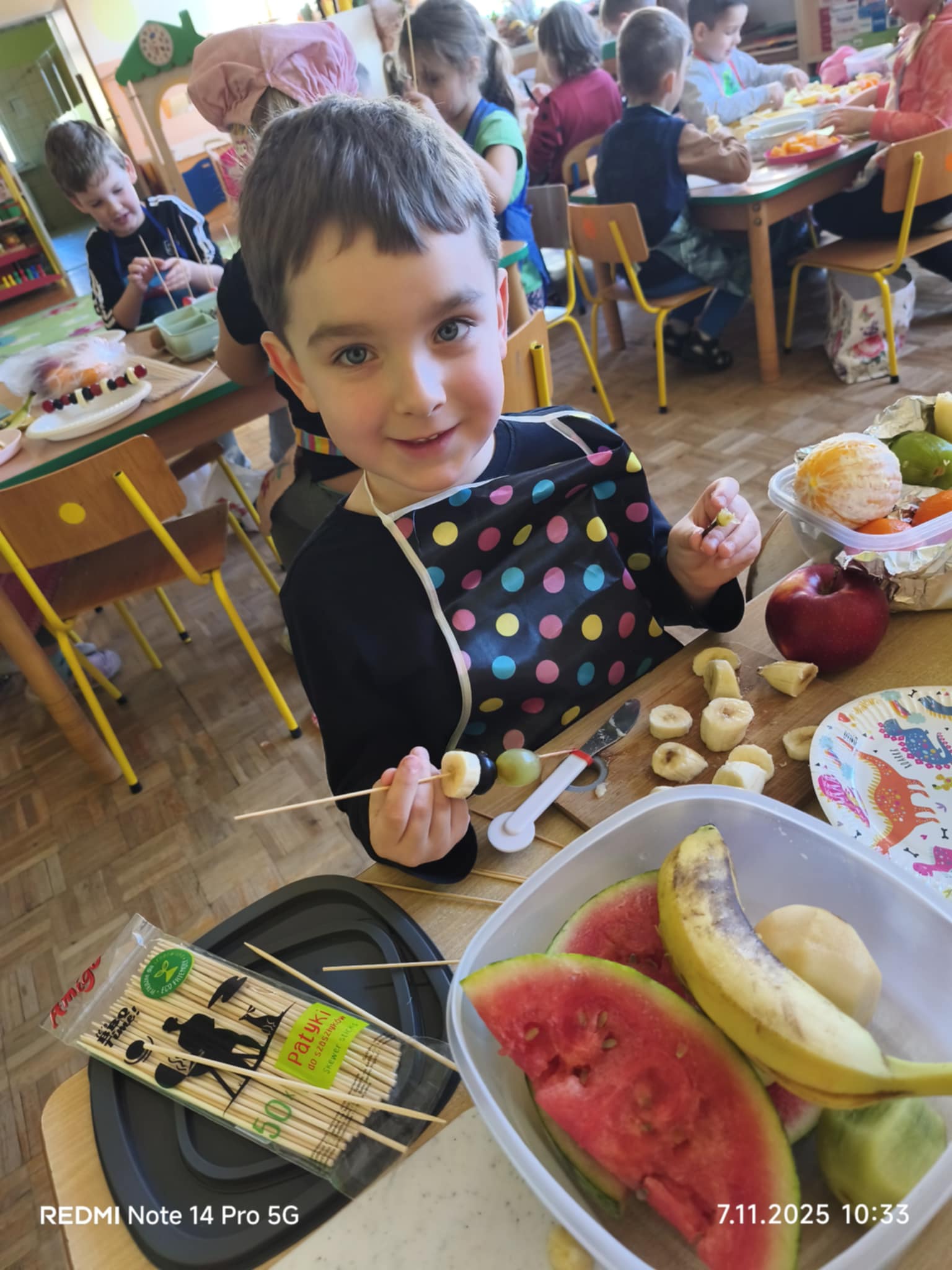 W grupie „Sówki” nuda nie ma wstępu – a już na pewno nie wtedy, gdy na stole pojawiają się owoce, warzywa i cała masa dobrej energii! Tego dnia nasze przedszkolaki zamieniły się w małych ekspertów od zdrowego stylu życia. Na początku rozmawialiśmy o tym, dlaczego jabłko to lepszy wybór niż baton, po co marchewka zagląda do talerza i dlaczego chipsy czasem warto zostawić na sklepowej półce. Potem przyszedł czas na owocowo-warzywne quizy i zagadki – tu dopiero było śmiechu! Kto by pomyślał, że brokuł może być „zielonym drzewkiem siły”, a banan to „żółta energia w skórce”? Dzieci popisywały się wiedzą, błyskotliwością i humorem, jak prawdziwi mistrzowie zdrowych przekąsek. A kiedy już głowy pękały od pomysłów (i śmiechu), zabraliśmy się za praktyczną część programu – przygotowywanie owocowych szaszłyków. Sówki chwyciły za nożyki (oczywiście bezpieczne!), i z zapałem kroiły, układały, przekładały i komponowały najpiękniejsze szaszłyki, jakie świat widział! Kawałki kiwi, jabłka, winogron, banana i truskawek tworzyły prawdziwe dzieła sztuki kulinarnej – kolorowe, pachnące i… aż szkoda było je zjeść! Ale że w naszym przedszkolu nie ma rzeczy niemożliwych, to pojawił się też mały, słodki „grzeszek” – pani delikatnie polała szaszłyki czekoladową polewą. No bo przecież nawet najbardziej fit sówka czasem potrzebuje odrobiny czekolady dla lepszego humoru!