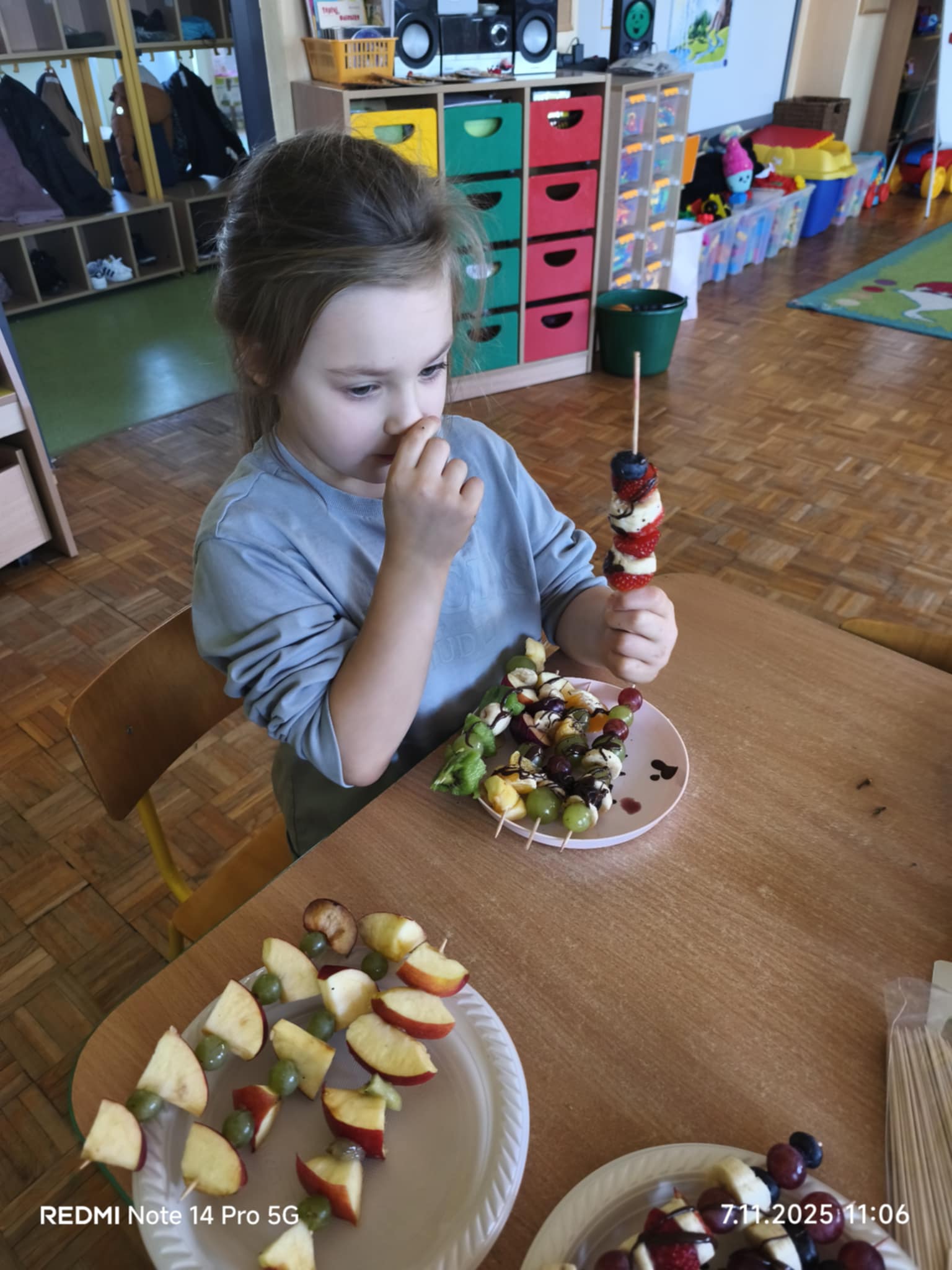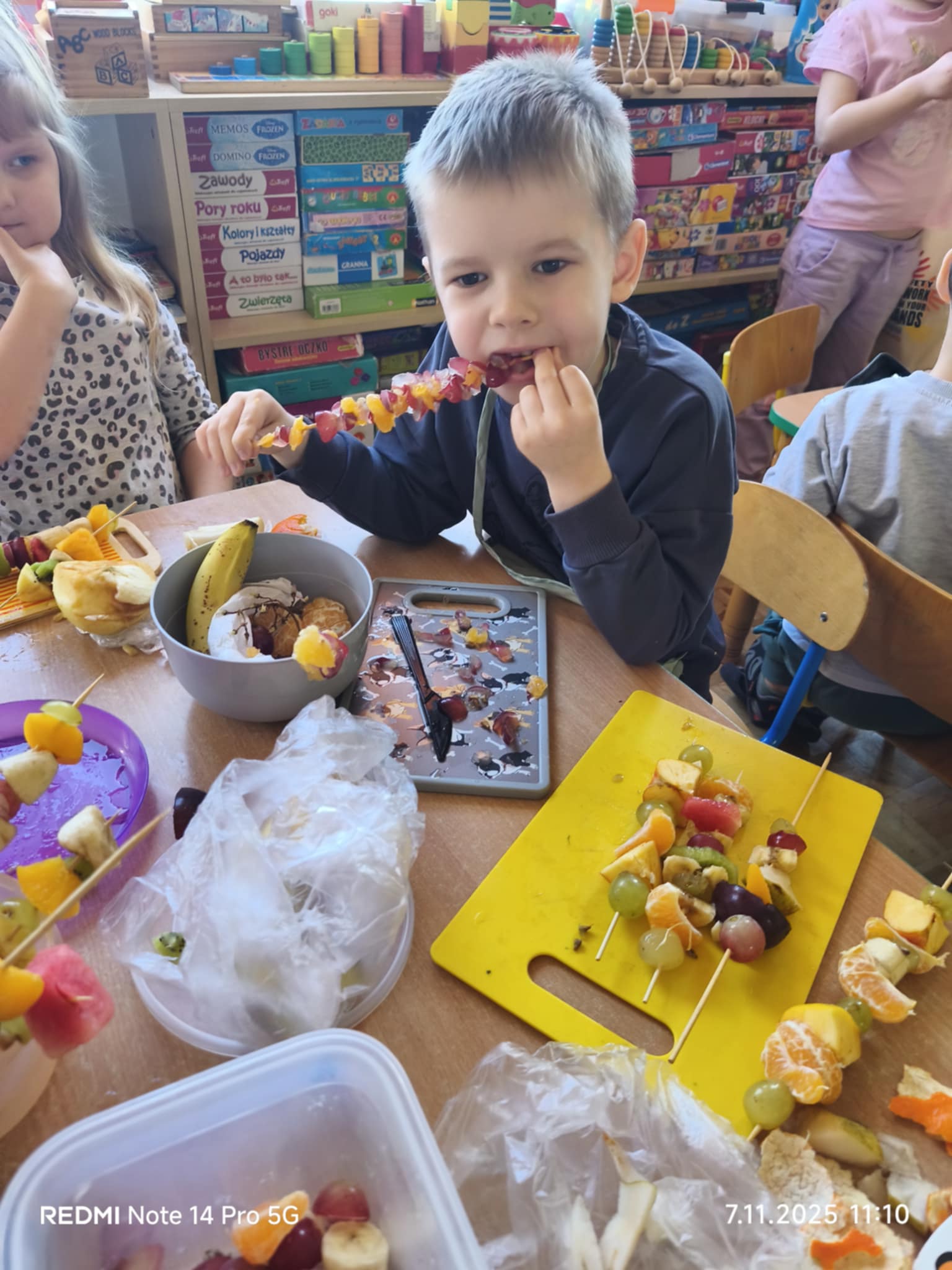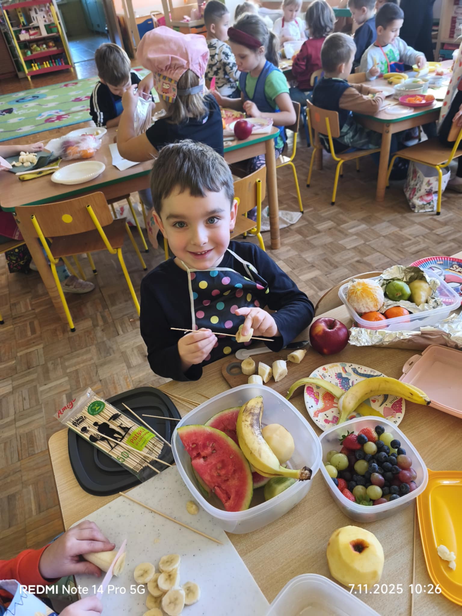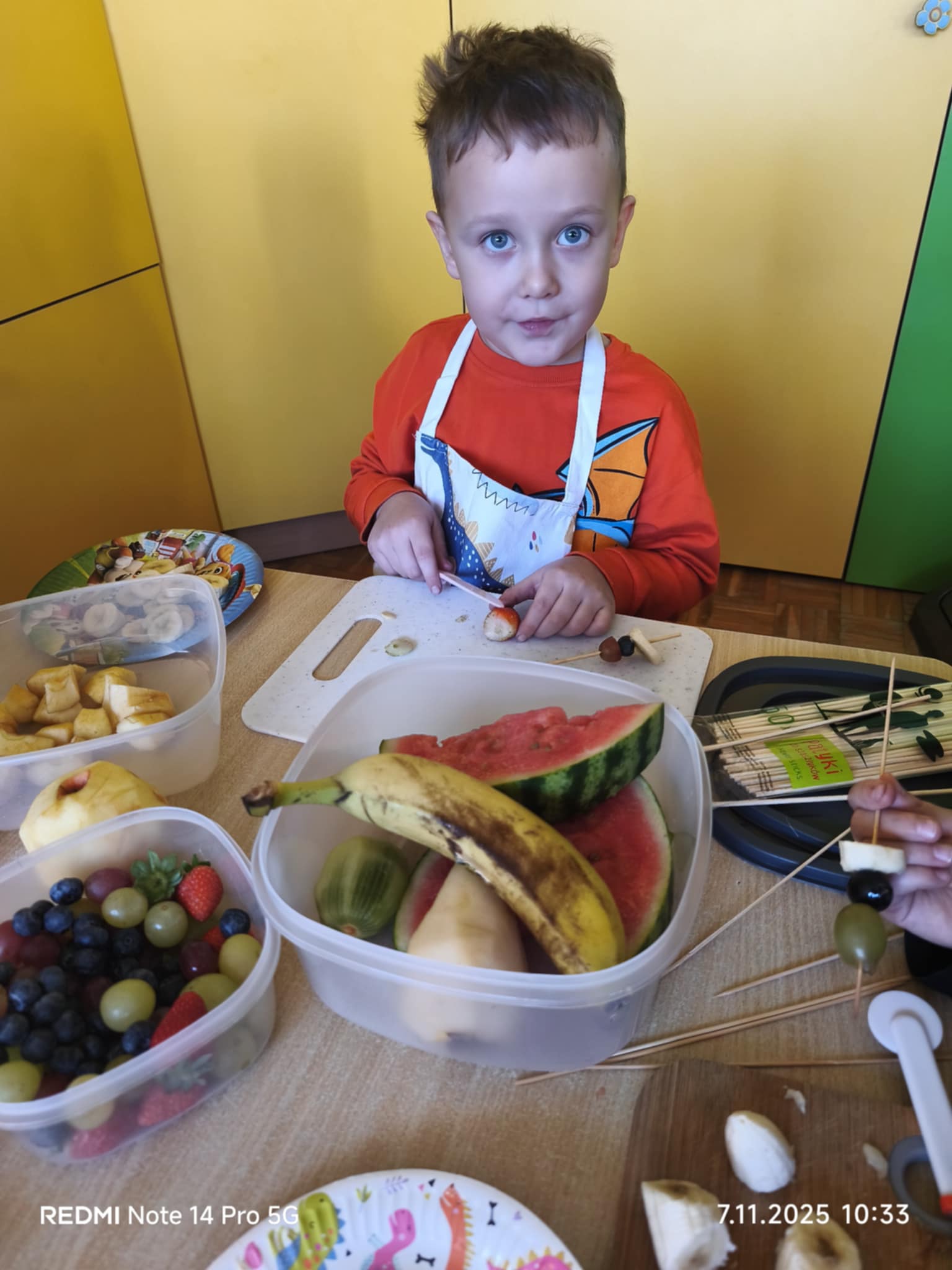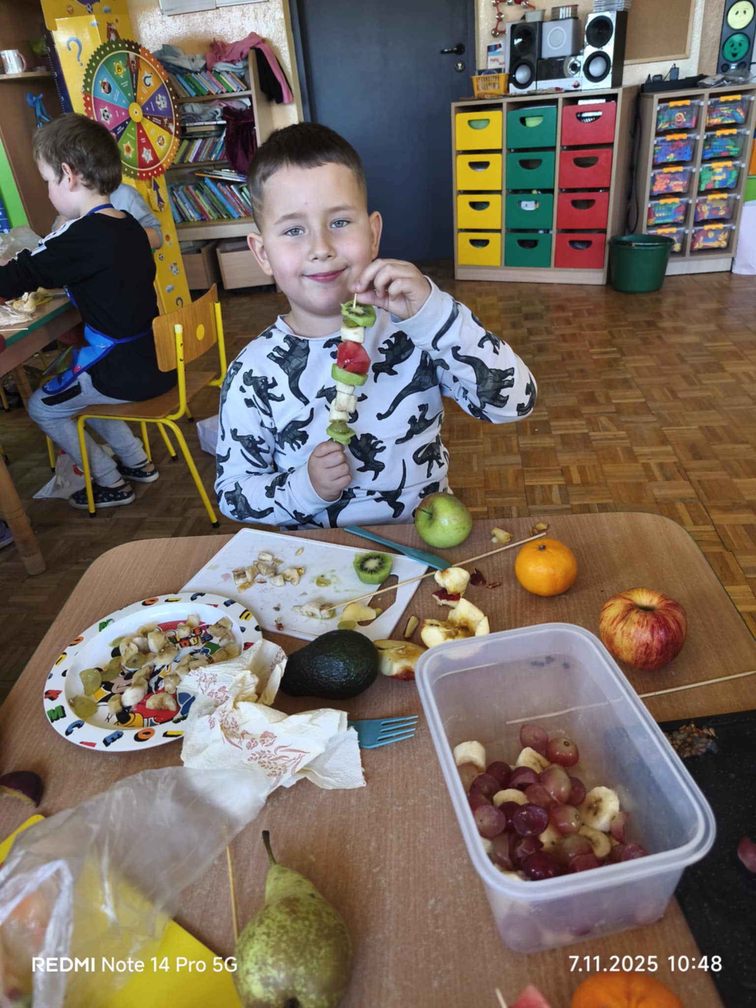 W grupie „Sówki” nuda nie ma wstępu – a już na pewno nie wtedy, gdy na stole pojawiają się owoce, warzywa i cała masa dobrej energii! Tego dnia nasze przedszkolaki zamieniły się w małych ekspertów od zdrowego stylu życia. Na początku rozmawialiśmy o tym, dlaczego jabłko to lepszy wybór niż baton, po co marchewka zagląda do talerza i dlaczego chipsy czasem warto zostawić na sklepowej półce. Potem przyszedł czas na owocowo-warzywne quizy i zagadki – tu dopiero było śmiechu! Kto by pomyślał, że brokuł może być „zielonym drzewkiem siły”, a banan to „żółta energia w skórce”? Dzieci popisywały się wiedzą, błyskotliwością i humorem, jak prawdziwi mistrzowie zdrowych przekąsek. A kiedy już głowy pękały od pomysłów (i śmiechu), zabraliśmy się za praktyczną część programu – przygotowywanie owocowych szaszłyków. Sówki chwyciły za nożyki (oczywiście bezpieczne!), i z zapałem kroiły, układały, przekładały i komponowały najpiękniejsze szaszłyki, jakie świat widział! Kawałki kiwi, jabłka, winogron, banana i truskawek tworzyły prawdziwe dzieła sztuki kulinarnej – kolorowe, pachnące i… aż szkoda było je zjeść! Ale że w naszym przedszkolu nie ma rzeczy niemożliwych, to pojawił się też mały, słodki „grzeszek” – pani delikatnie polała szaszłyki czekoladową polewą. No bo przecież nawet najbardziej fit sówka czasem potrzebuje odrobiny czekolady dla lepszego humoru!