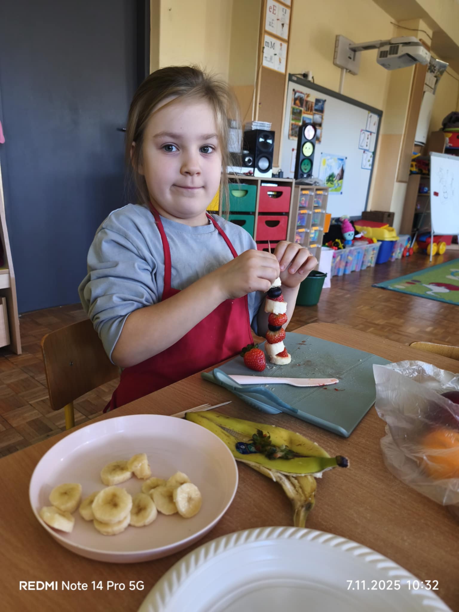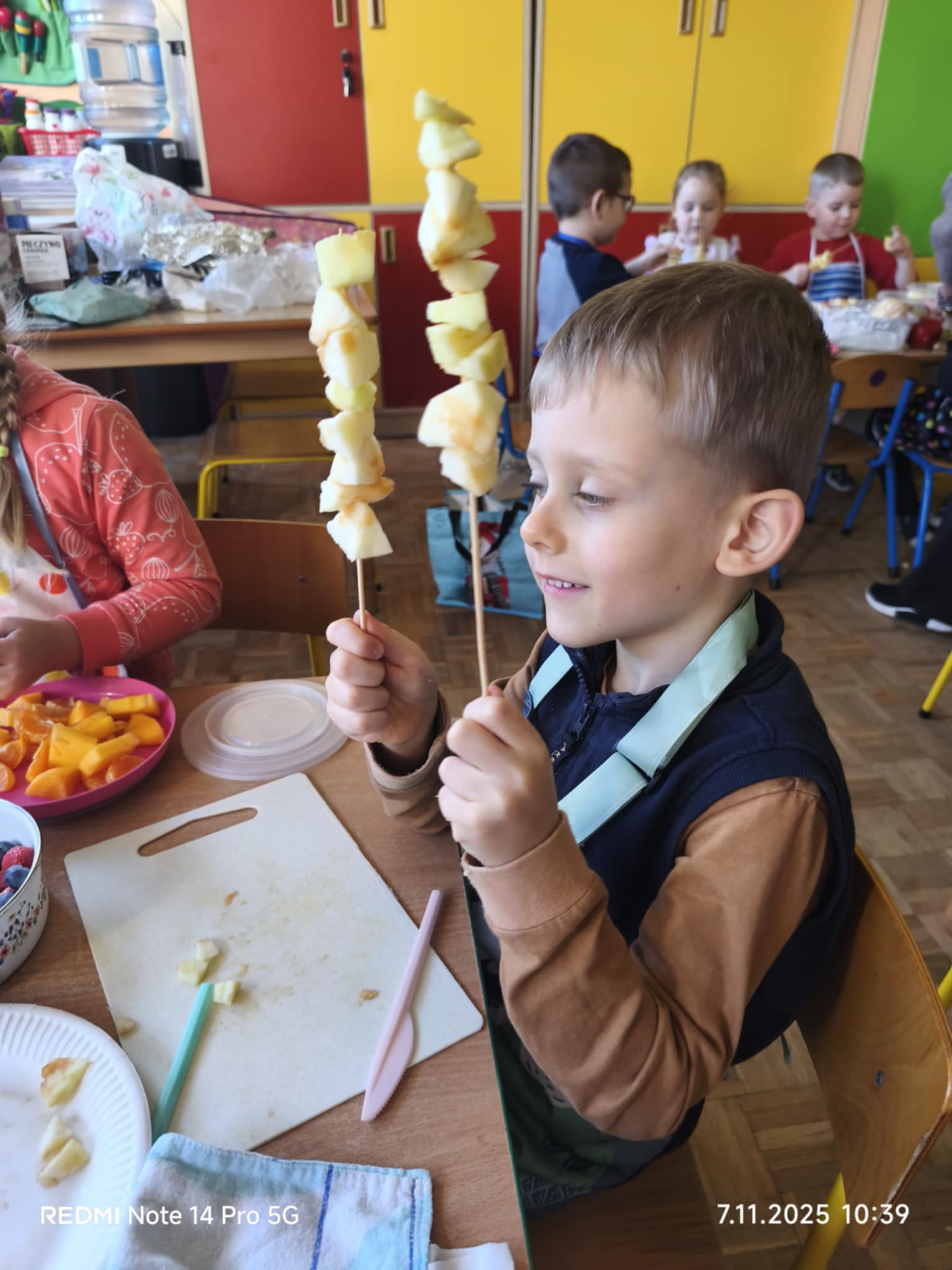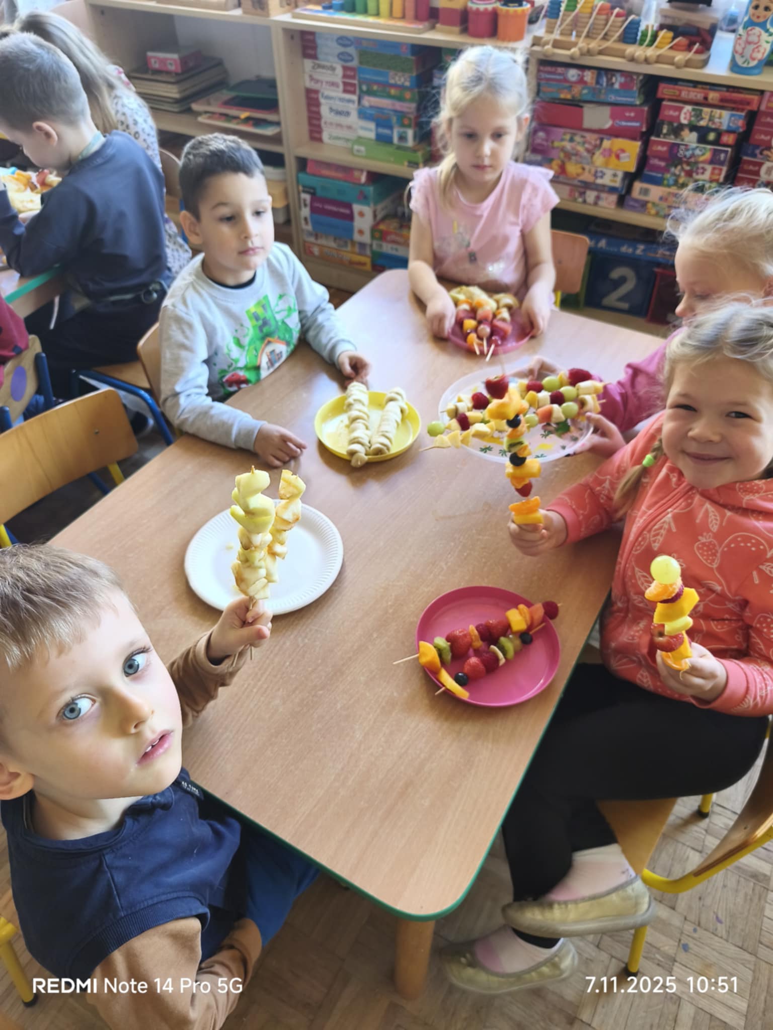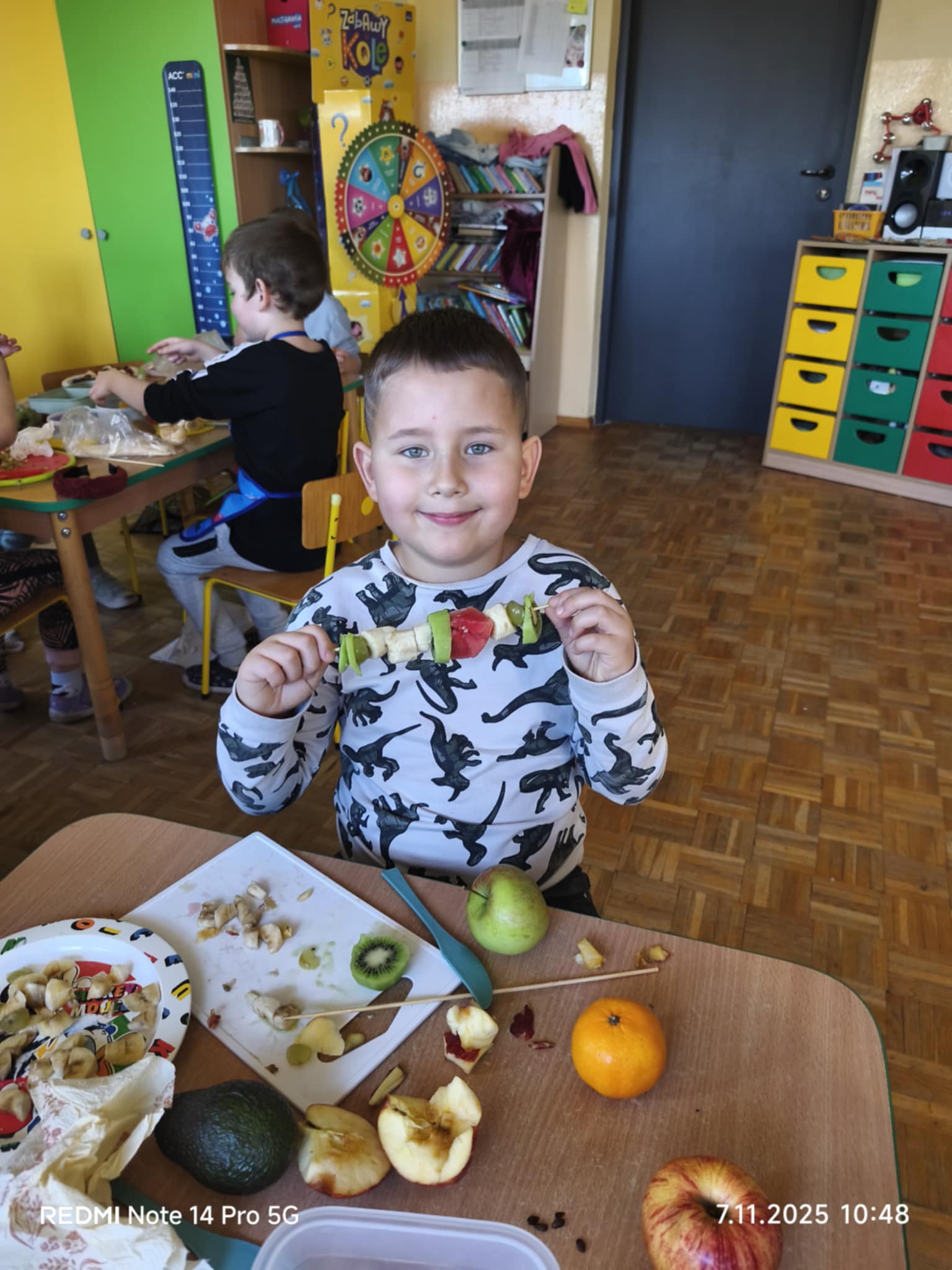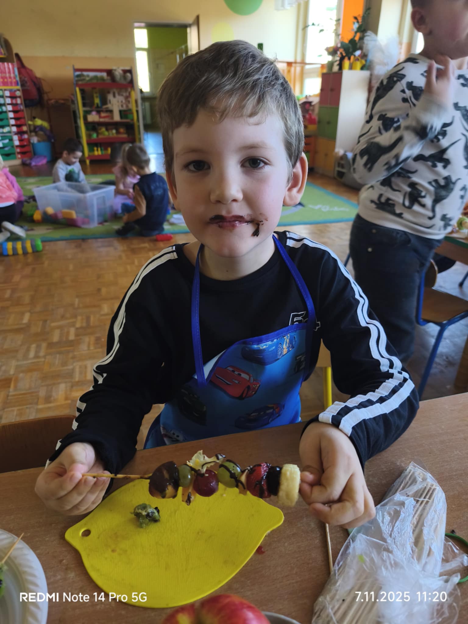 W grupie „Sówki” nuda nie ma wstępu – a już na pewno nie wtedy, gdy na stole pojawiają się owoce, warzywa i cała masa dobrej energii! Tego dnia nasze przedszkolaki zamieniły się w małych ekspertów od zdrowego stylu życia. Na początku rozmawialiśmy o tym, dlaczego jabłko to lepszy wybór niż baton, po co marchewka zagląda do talerza i dlaczego chipsy czasem warto zostawić na sklepowej półce. Potem przyszedł czas na owocowo-warzywne quizy i zagadki – tu dopiero było śmiechu! Kto by pomyślał, że brokuł może być „zielonym drzewkiem siły”, a banan to „żółta energia w skórce”? Dzieci popisywały się wiedzą, błyskotliwością i humorem, jak prawdziwi mistrzowie zdrowych przekąsek. A kiedy już głowy pękały od pomysłów (i śmiechu), zabraliśmy się za praktyczną część programu – przygotowywanie owocowych szaszłyków. Sówki chwyciły za nożyki (oczywiście bezpieczne!), i z zapałem kroiły, układały, przekładały i komponowały najpiękniejsze szaszłyki, jakie świat widział! Kawałki kiwi, jabłka, winogron, banana i truskawek tworzyły prawdziwe dzieła sztuki kulinarnej – kolorowe, pachnące i… aż szkoda było je zjeść! Ale że w naszym przedszkolu nie ma rzeczy niemożliwych, to pojawił się też mały, słodki „grzeszek” – pani delikatnie polała szaszłyki czekoladową polewą. No bo przecież nawet najbardziej fit sówka czasem potrzebuje odrobiny czekolady dla lepszego humoru!