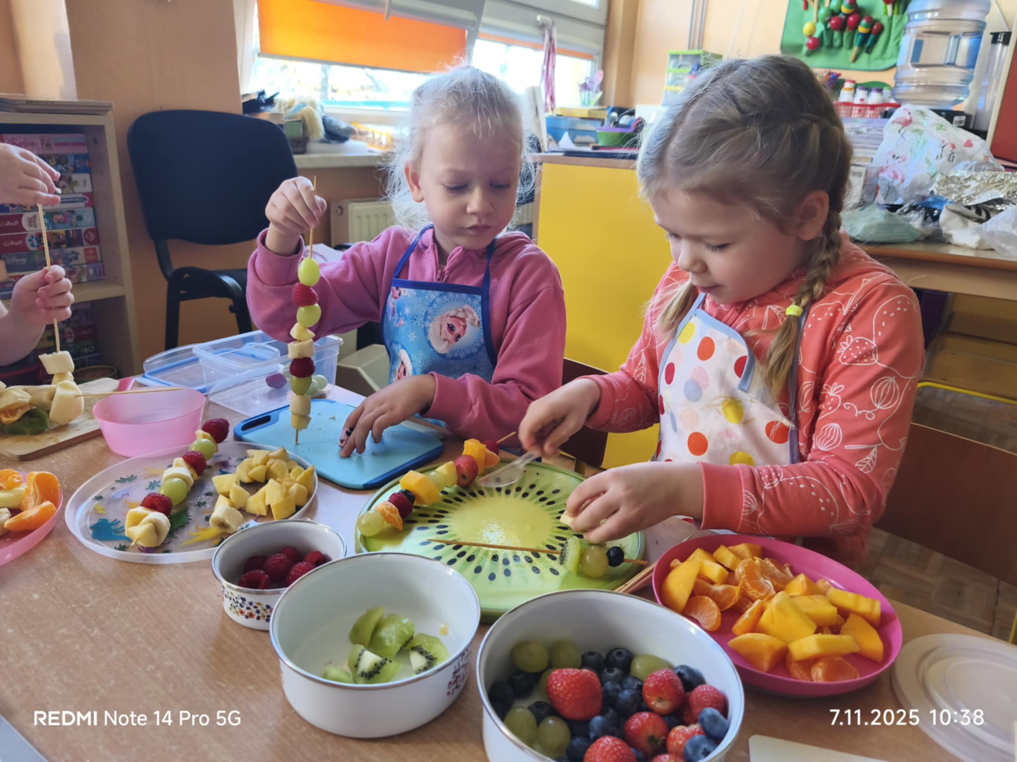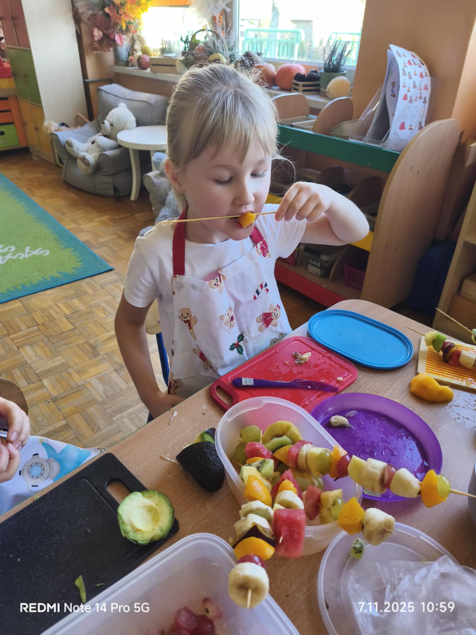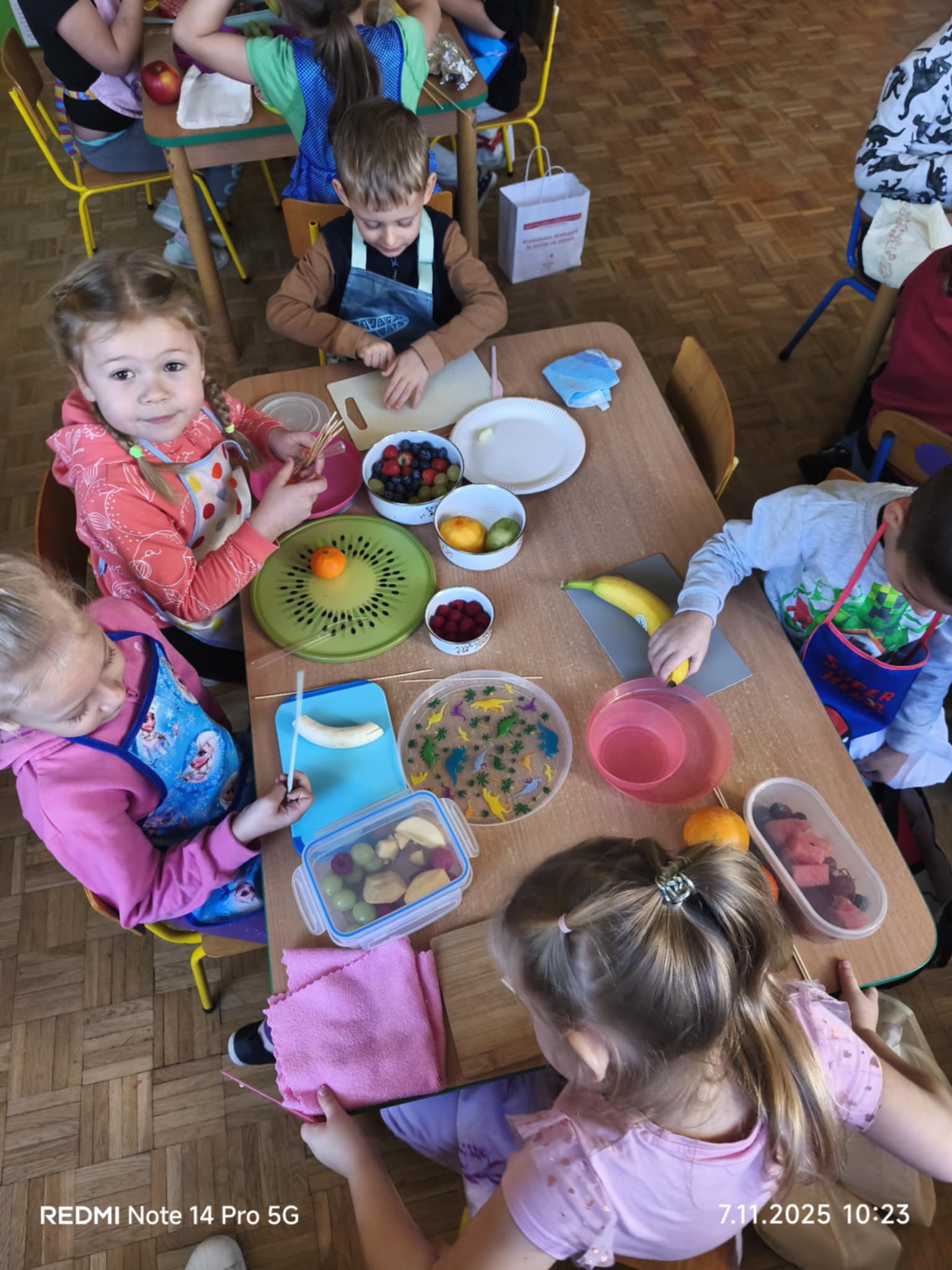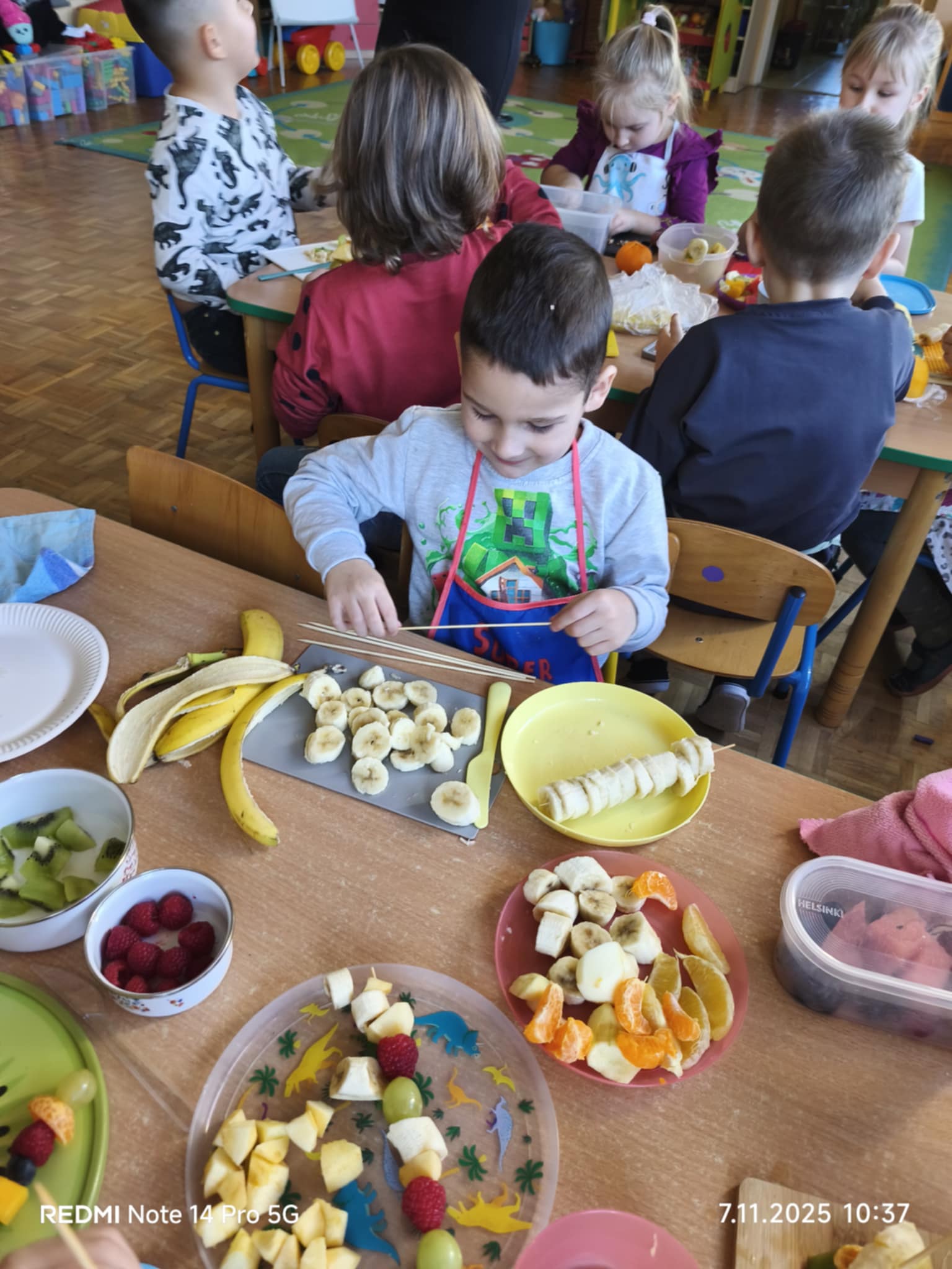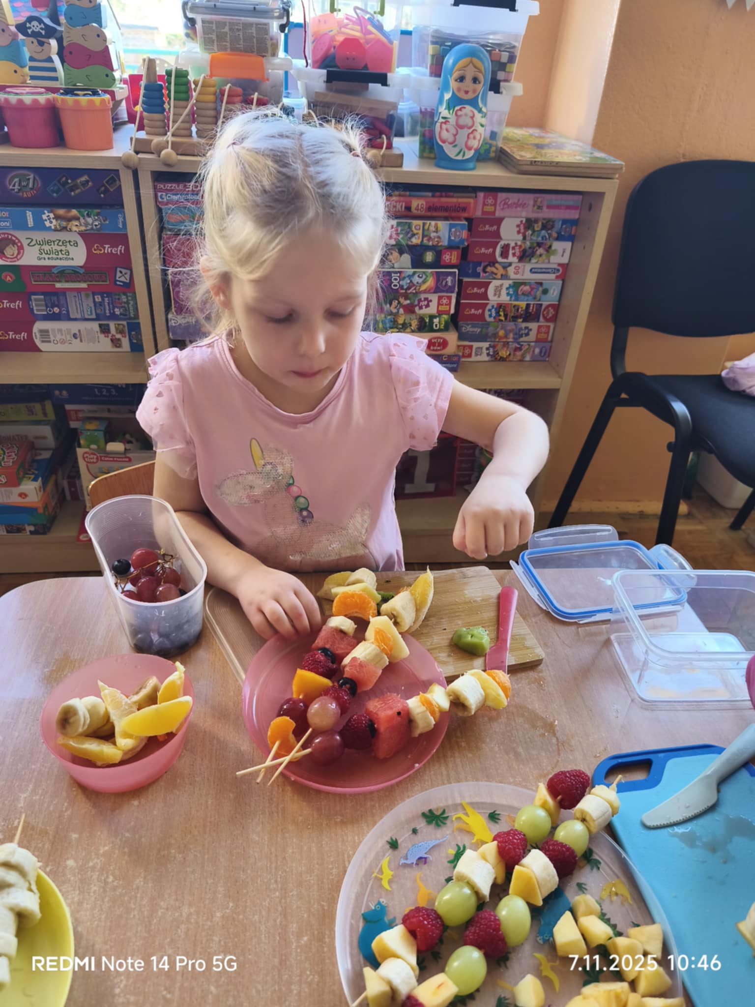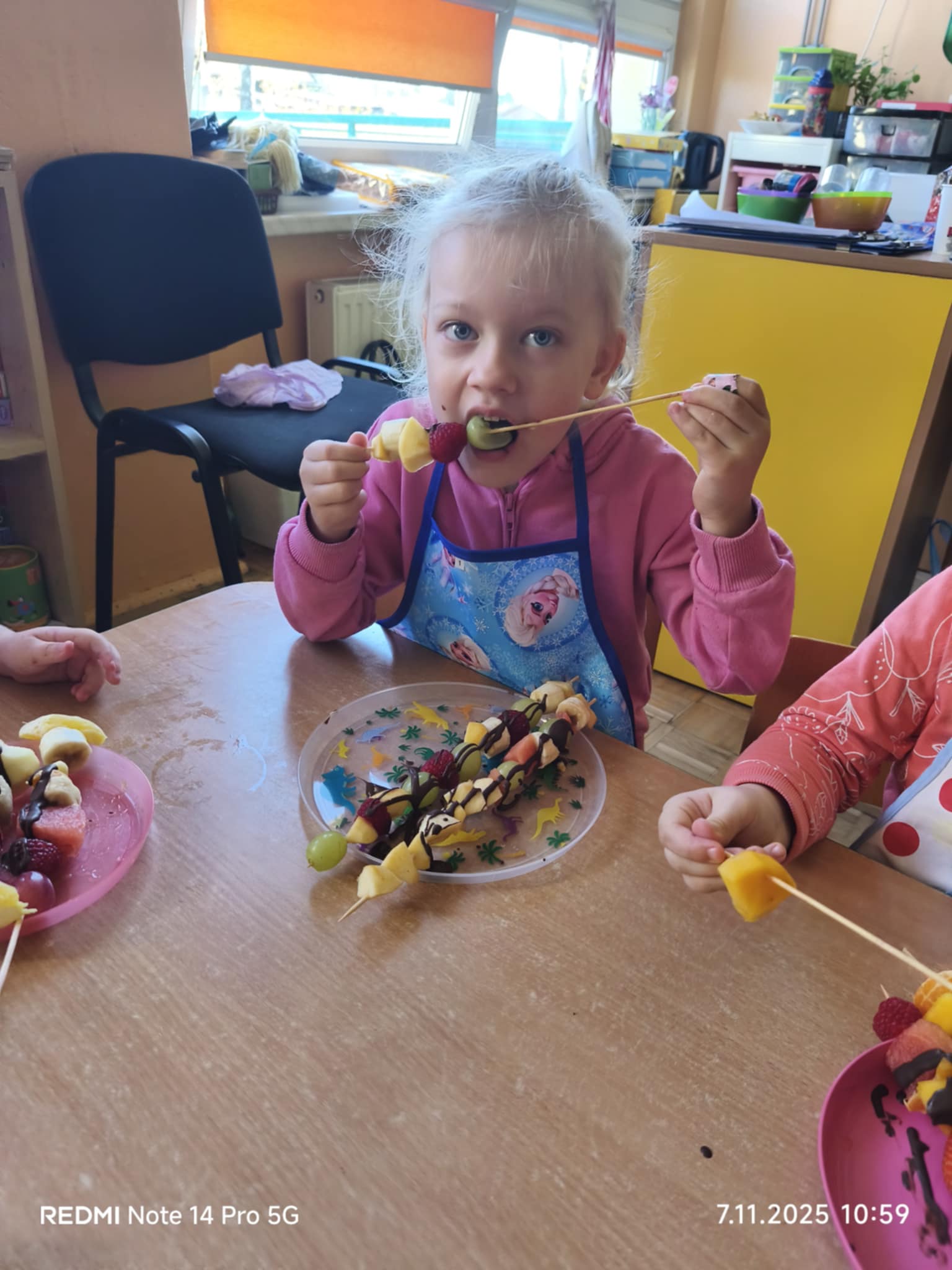 W grupie „Sówki” nuda nie ma wstępu – a już na pewno nie wtedy, gdy na stole pojawiają się owoce, warzywa i cała masa dobrej energii! Tego dnia nasze przedszkolaki zamieniły się w małych ekspertów od zdrowego stylu życia. Na początku rozmawialiśmy o tym, dlaczego jabłko to lepszy wybór niż baton, po co marchewka zagląda do talerza i dlaczego chipsy czasem warto zostawić na sklepowej półce. Potem przyszedł czas na owocowo-warzywne quizy i zagadki – tu dopiero było śmiechu! Kto by pomyślał, że brokuł może być „zielonym drzewkiem siły”, a banan to „żółta energia w skórce”? Dzieci popisywały się wiedzą, błyskotliwością i humorem, jak prawdziwi mistrzowie zdrowych przekąsek. A kiedy już głowy pękały od pomysłów (i śmiechu), zabraliśmy się za praktyczną część programu – przygotowywanie owocowych szaszłyków. Sówki chwyciły za nożyki (oczywiście bezpieczne!), i z zapałem kroiły, układały, przekładały i komponowały najpiękniejsze szaszłyki, jakie świat widział! Kawałki kiwi, jabłka, winogron, banana i truskawek tworzyły prawdziwe dzieła sztuki kulinarnej – kolorowe, pachnące i… aż szkoda było je zjeść! Ale że w naszym przedszkolu nie ma rzeczy niemożliwych, to pojawił się też mały, słodki „grzeszek” – pani delikatnie polała szaszłyki czekoladową polewą. No bo przecież nawet najbardziej fit sówka czasem potrzebuje odrobiny czekolady dla lepszego humoru!