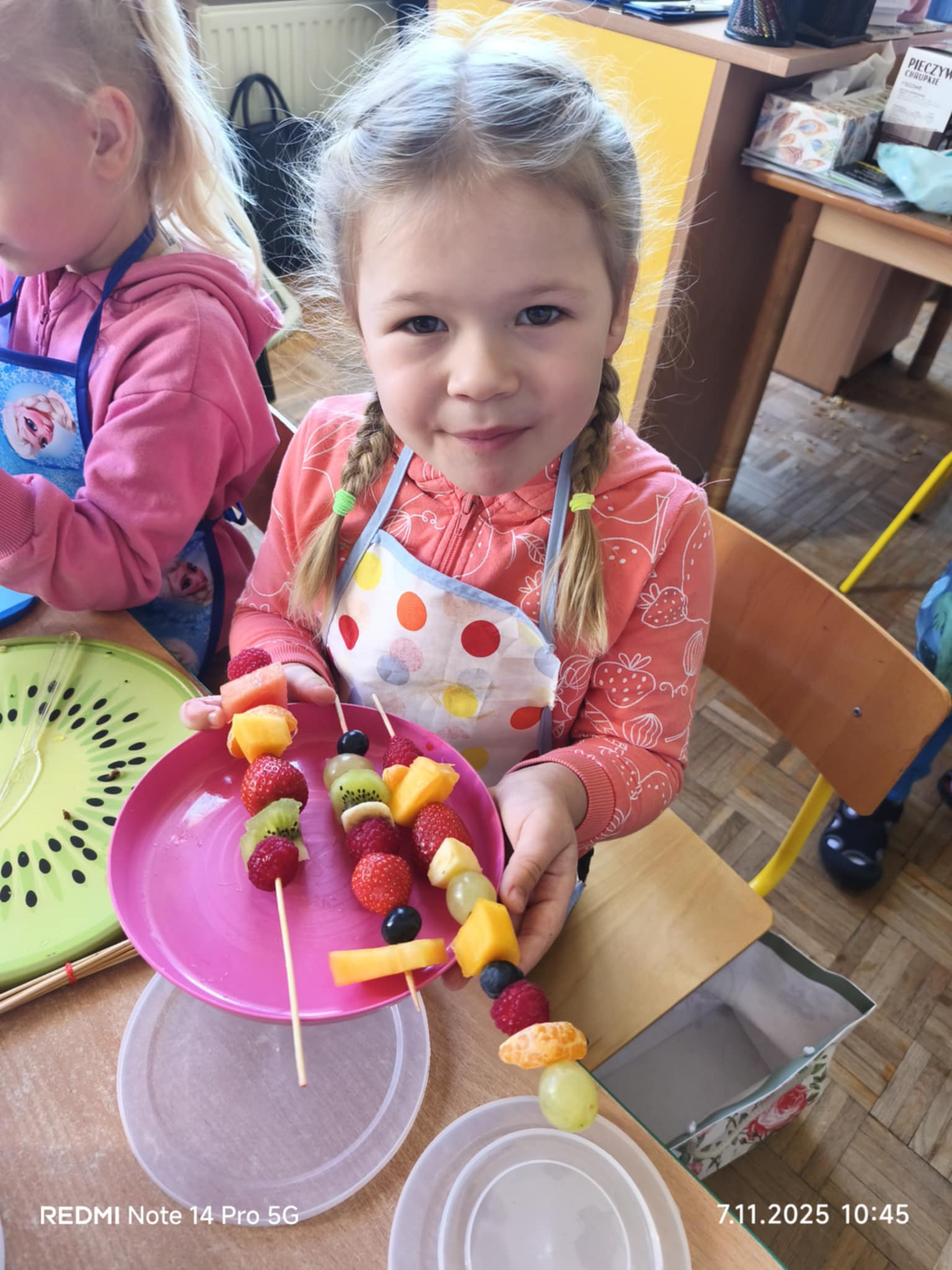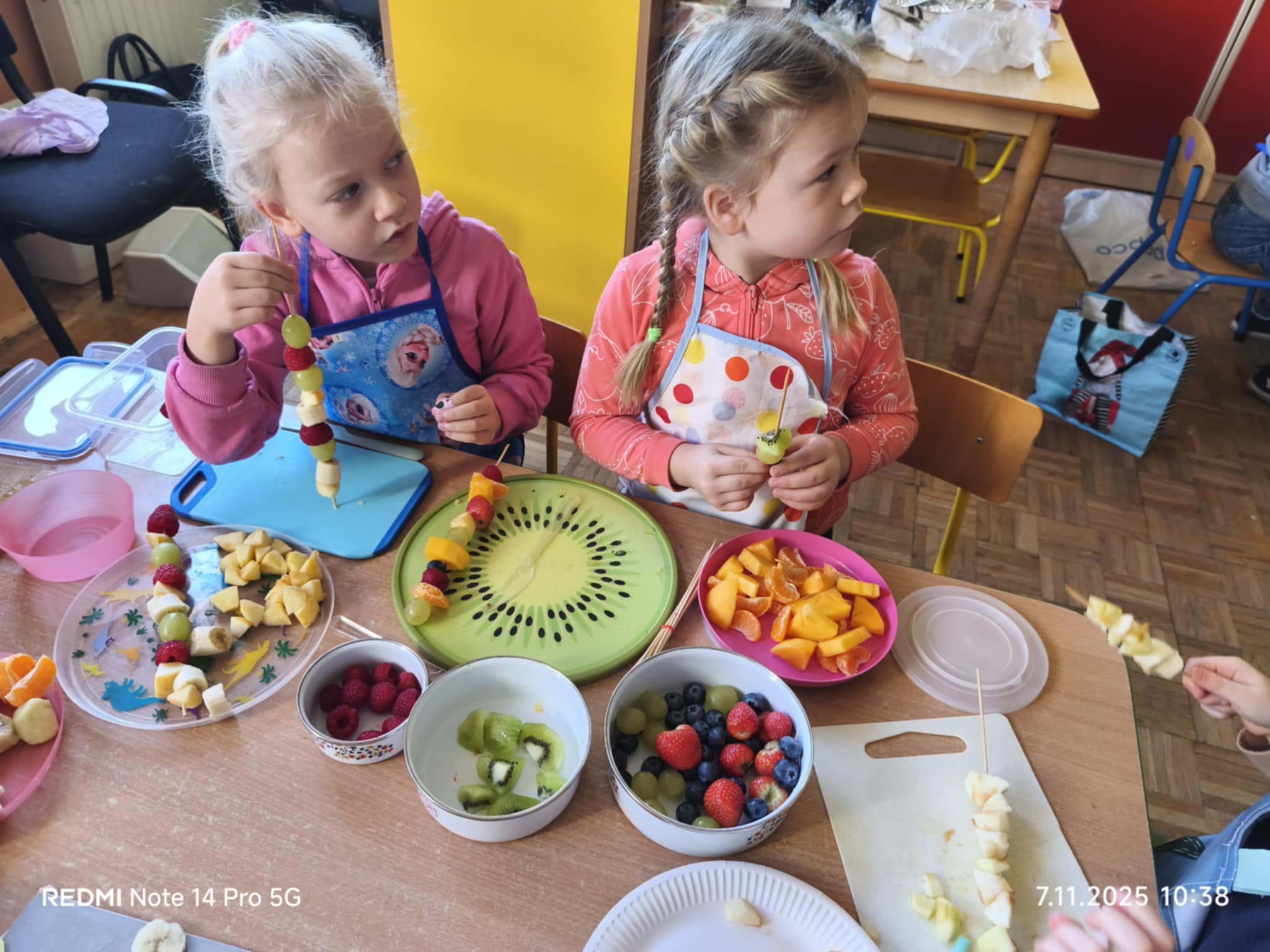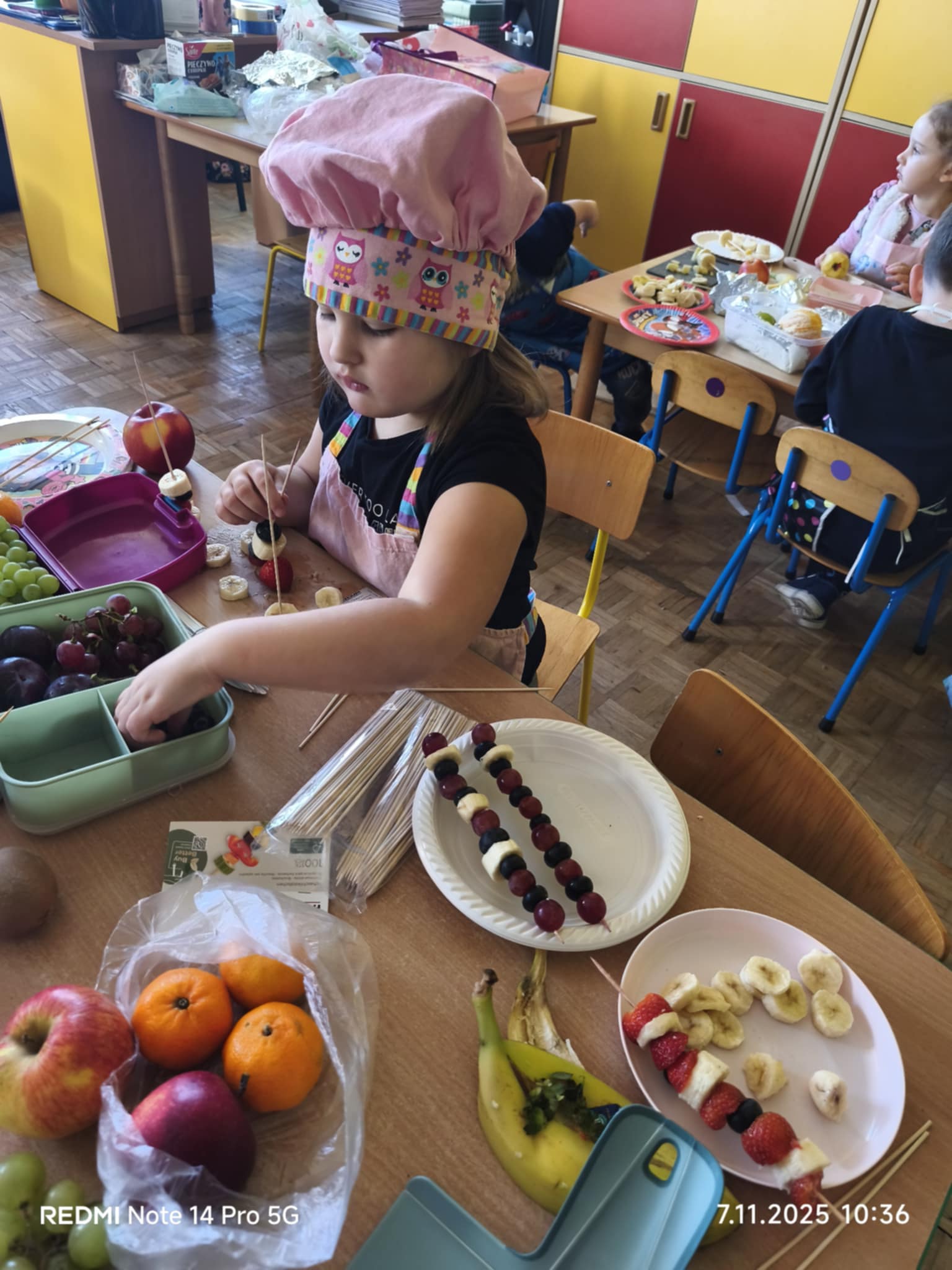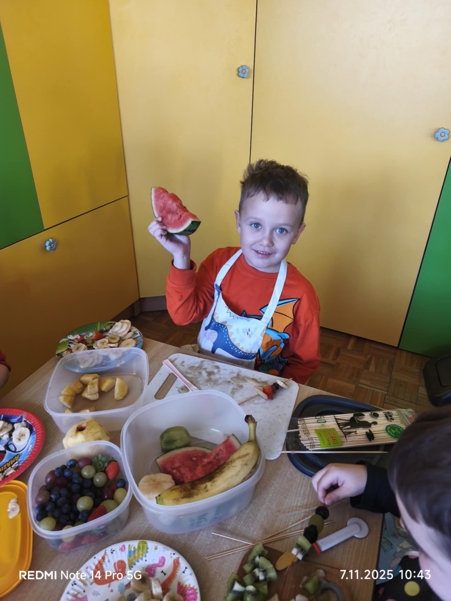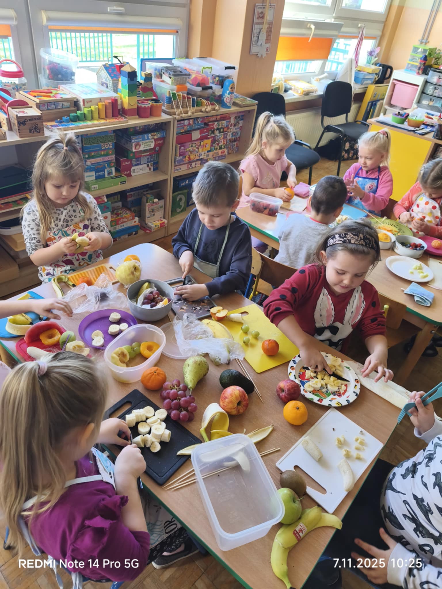 W grupie „Sówki” nuda nie ma wstępu – a już na pewno nie wtedy, gdy na stole pojawiają się owoce, warzywa i cała masa dobrej energii! Tego dnia nasze przedszkolaki zamieniły się w małych ekspertów od zdrowego stylu życia. Na początku rozmawialiśmy o tym, dlaczego jabłko to lepszy wybór niż baton, po co marchewka zagląda do talerza i dlaczego chipsy czasem warto zostawić na sklepowej półce. Potem przyszedł czas na owocowo-warzywne quizy i zagadki – tu dopiero było śmiechu! Kto by pomyślał, że brokuł może być „zielonym drzewkiem siły”, a banan to „żółta energia w skórce”? Dzieci popisywały się wiedzą, błyskotliwością i humorem, jak prawdziwi mistrzowie zdrowych przekąsek. A kiedy już głowy pękały od pomysłów (i śmiechu), zabraliśmy się za praktyczną część programu – przygotowywanie owocowych szaszłyków. Sówki chwyciły za nożyki (oczywiście bezpieczne!), i z zapałem kroiły, układały, przekładały i komponowały najpiękniejsze szaszłyki, jakie świat widział! Kawałki kiwi, jabłka, winogron, banana i truskawek tworzyły prawdziwe dzieła sztuki kulinarnej – kolorowe, pachnące i… aż szkoda było je zjeść! Ale że w naszym przedszkolu nie ma rzeczy niemożliwych, to pojawił się też mały, słodki „grzeszek” – pani delikatnie polała szaszłyki czekoladową polewą. No bo przecież nawet najbardziej fit sówka czasem potrzebuje odrobiny czekolady dla lepszego humoru!