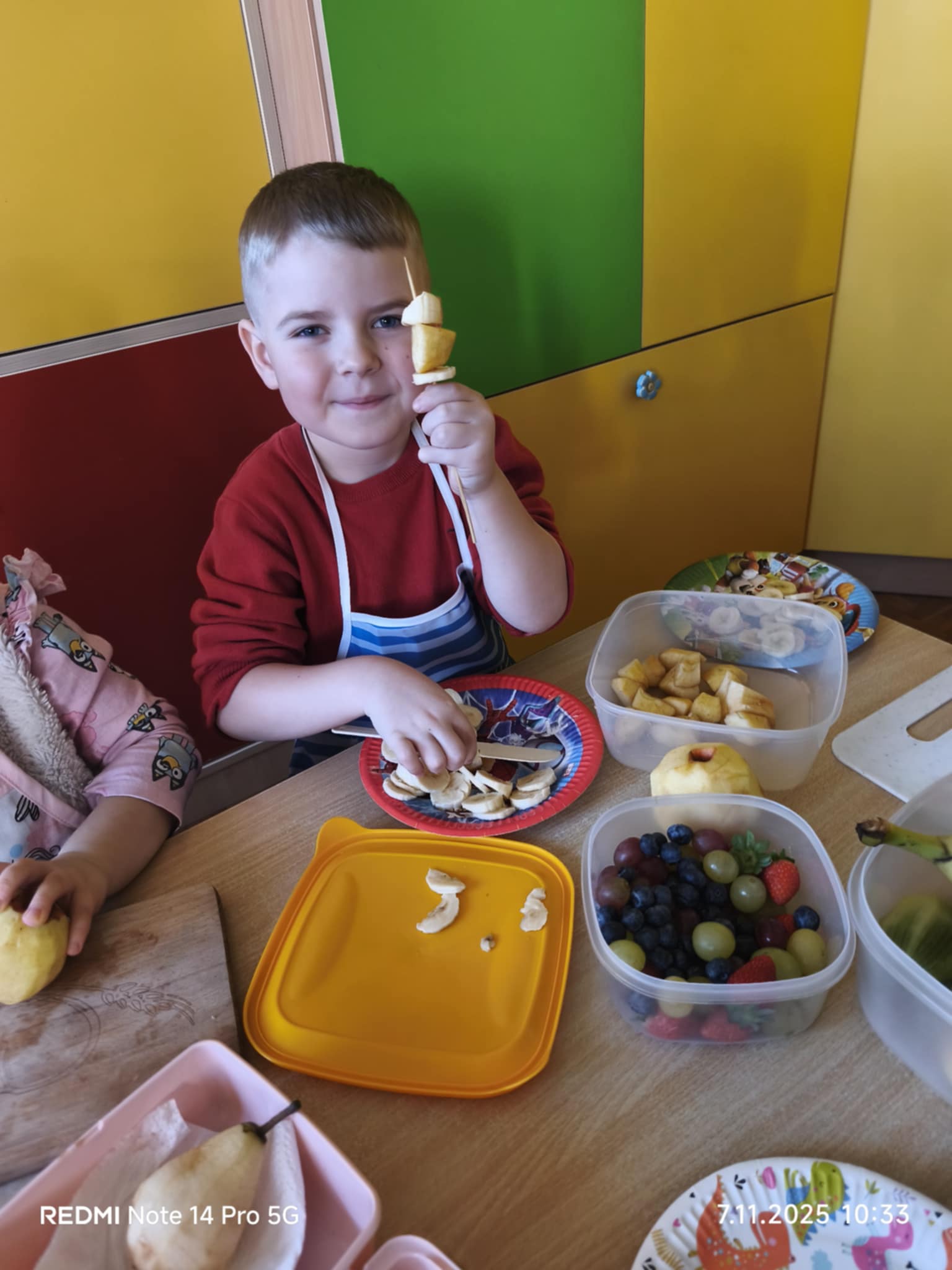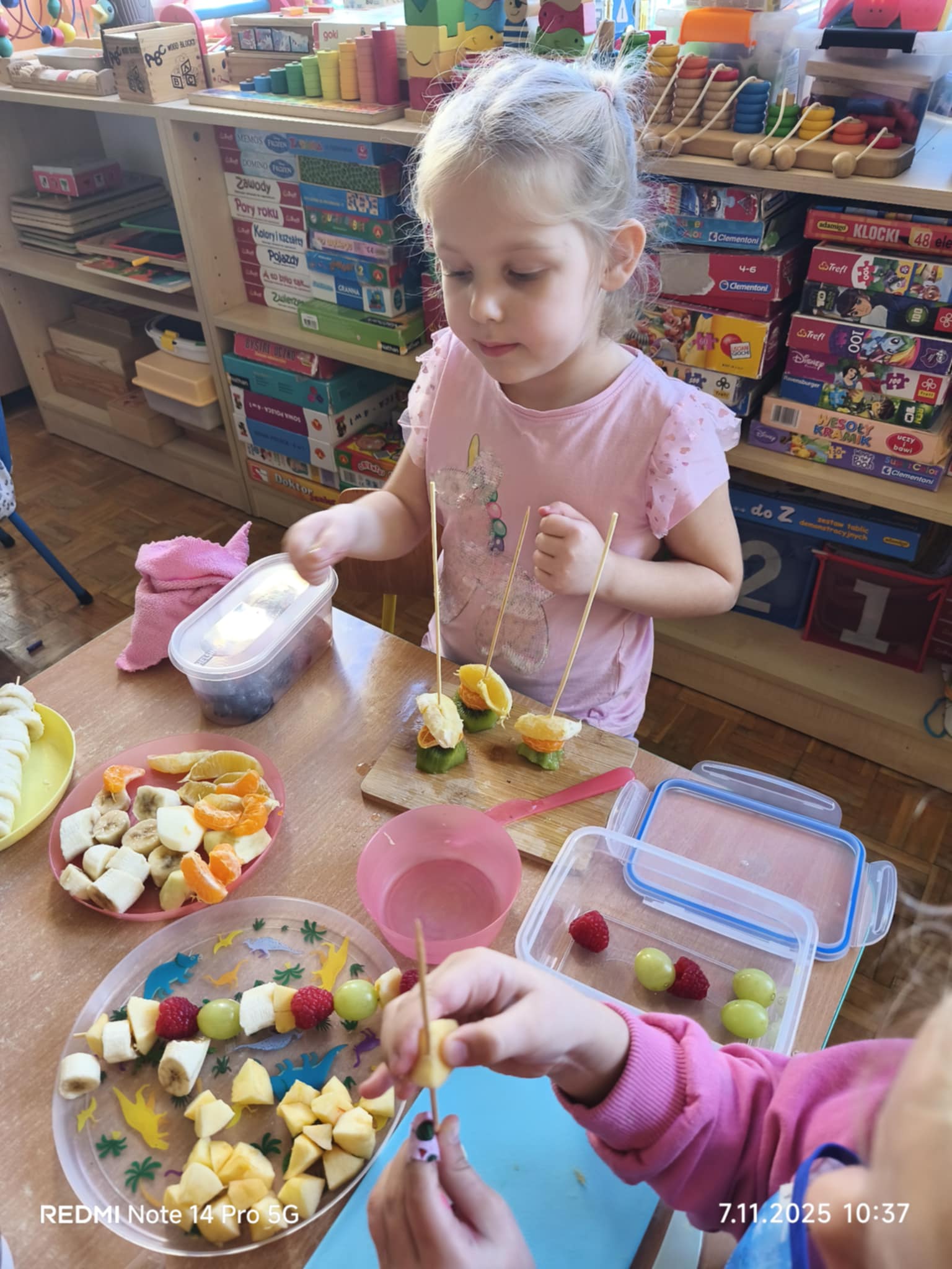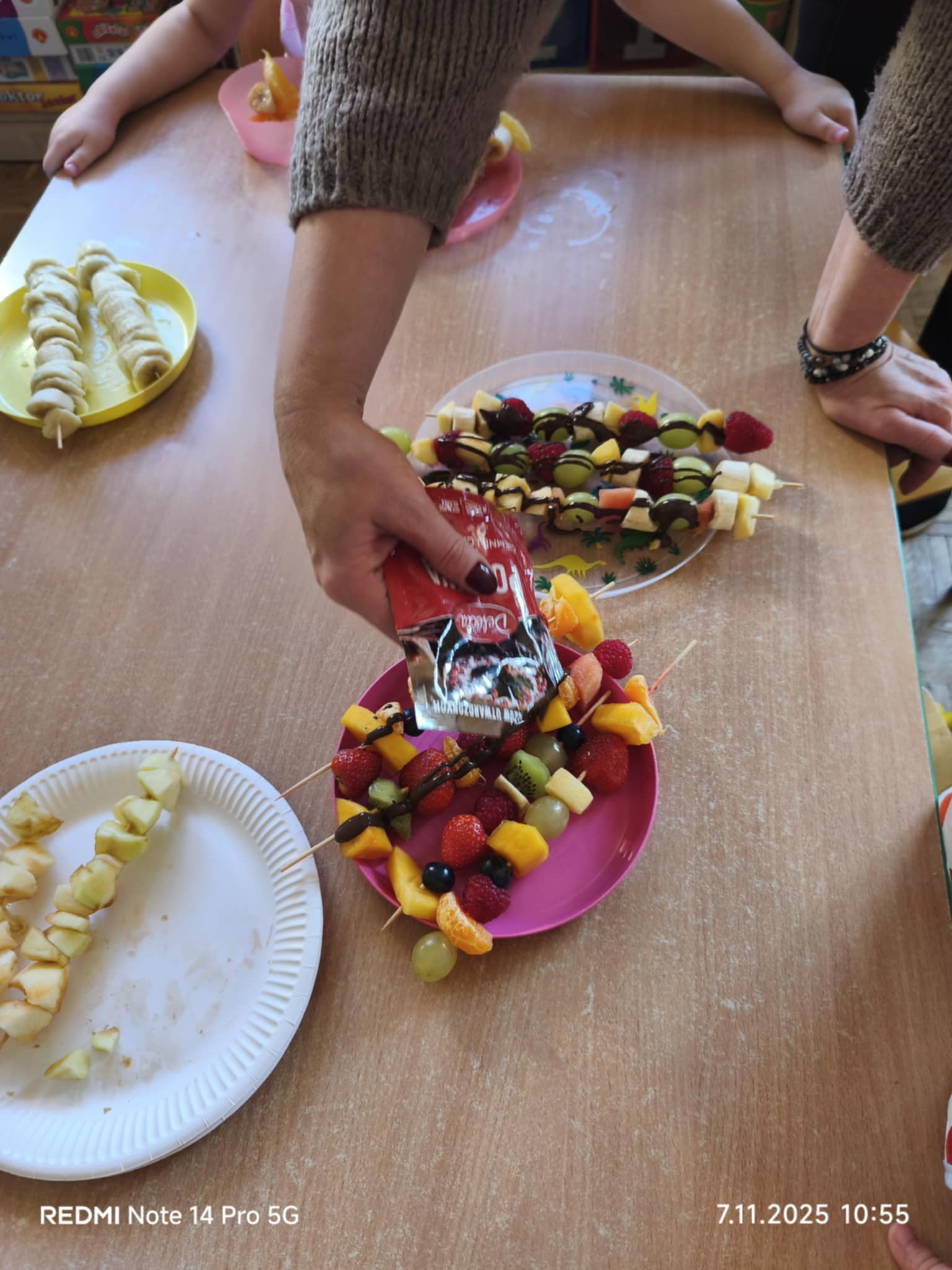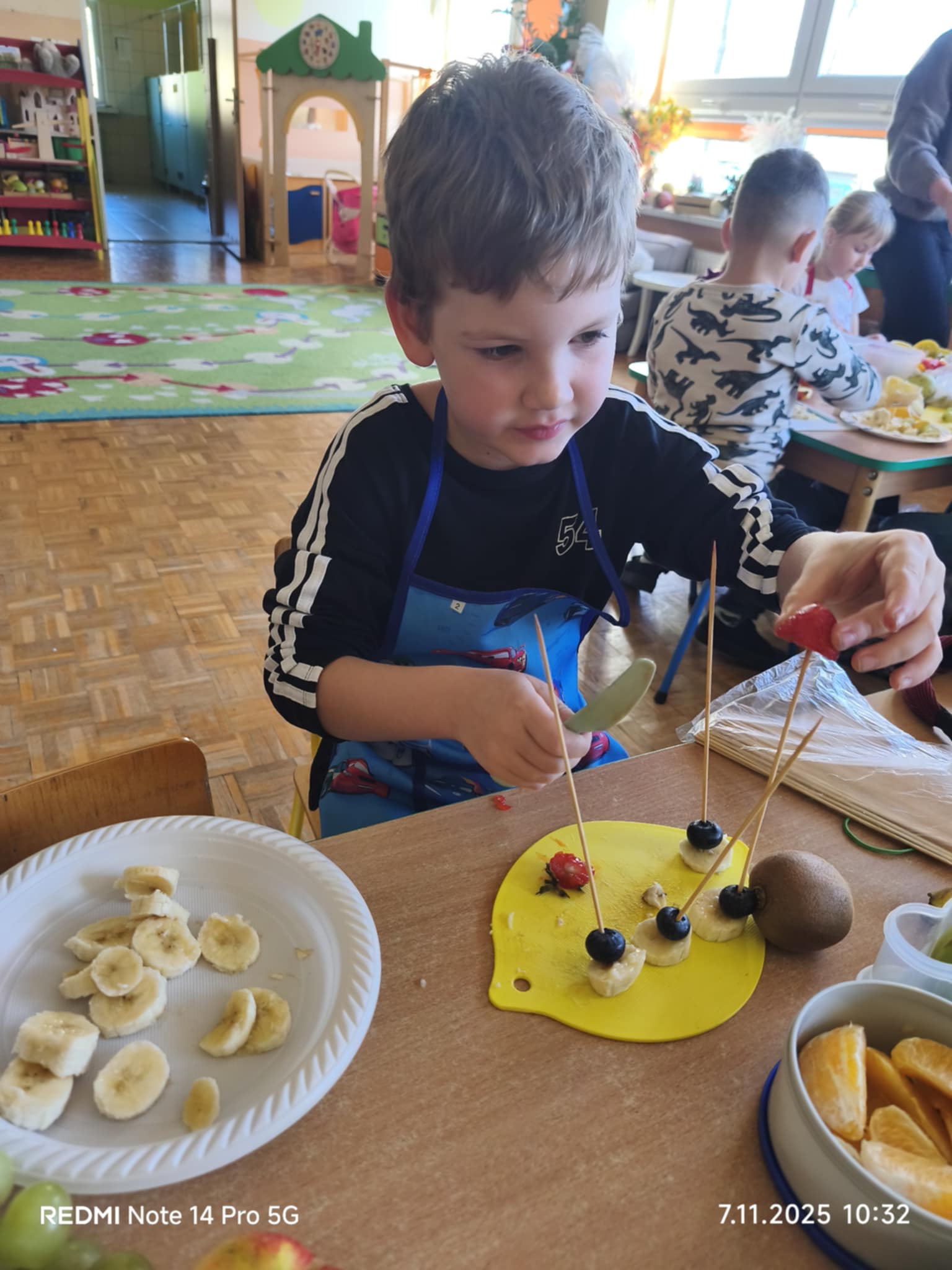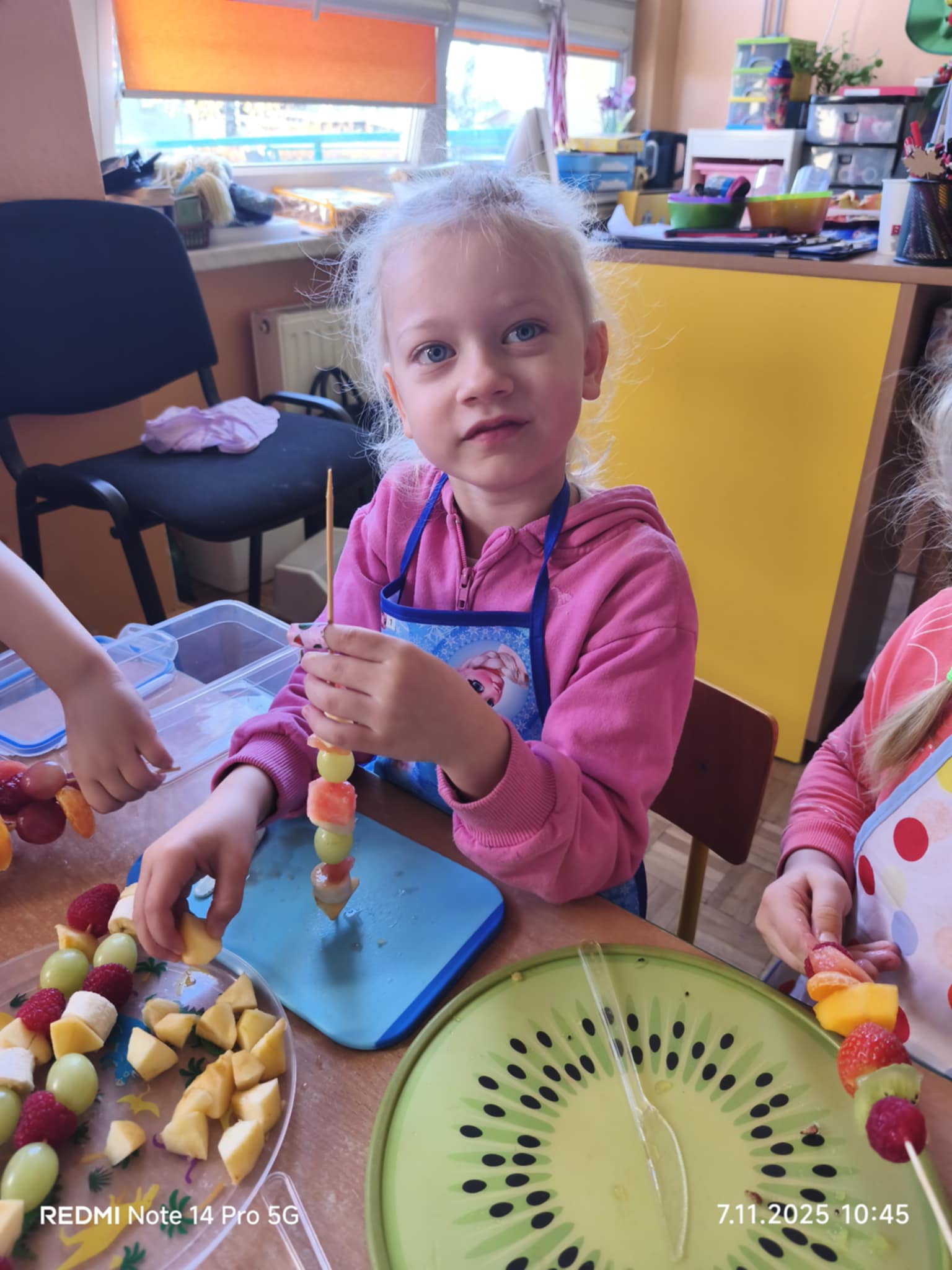 W grupie „Sówki” nuda nie ma wstępu – a już na pewno nie wtedy, gdy na stole pojawiają się owoce, warzywa i cała masa dobrej energii! Tego dnia nasze przedszkolaki zamieniły się w małych ekspertów od zdrowego stylu życia. Na początku rozmawialiśmy o tym, dlaczego jabłko to lepszy wybór niż baton, po co marchewka zagląda do talerza i dlaczego chipsy czasem warto zostawić na sklepowej półce. Potem przyszedł czas na owocowo-warzywne quizy i zagadki – tu dopiero było śmiechu! Kto by pomyślał, że brokuł może być „zielonym drzewkiem siły”, a banan to „żółta energia w skórce”? Dzieci popisywały się wiedzą, błyskotliwością i humorem, jak prawdziwi mistrzowie zdrowych przekąsek. A kiedy już głowy pękały od pomysłów (i śmiechu), zabraliśmy się za praktyczną część programu – przygotowywanie owocowych szaszłyków. Sówki chwyciły za nożyki (oczywiście bezpieczne!), i z zapałem kroiły, układały, przekładały i komponowały najpiękniejsze szaszłyki, jakie świat widział! Kawałki kiwi, jabłka, winogron, banana i truskawek tworzyły prawdziwe dzieła sztuki kulinarnej – kolorowe, pachnące i… aż szkoda było je zjeść! Ale że w naszym przedszkolu nie ma rzeczy niemożliwych, to pojawił się też mały, słodki „grzeszek” – pani delikatnie polała szaszłyki czekoladową polewą. No bo przecież nawet najbardziej fit sówka czasem potrzebuje odrobiny czekolady dla lepszego humoru!
