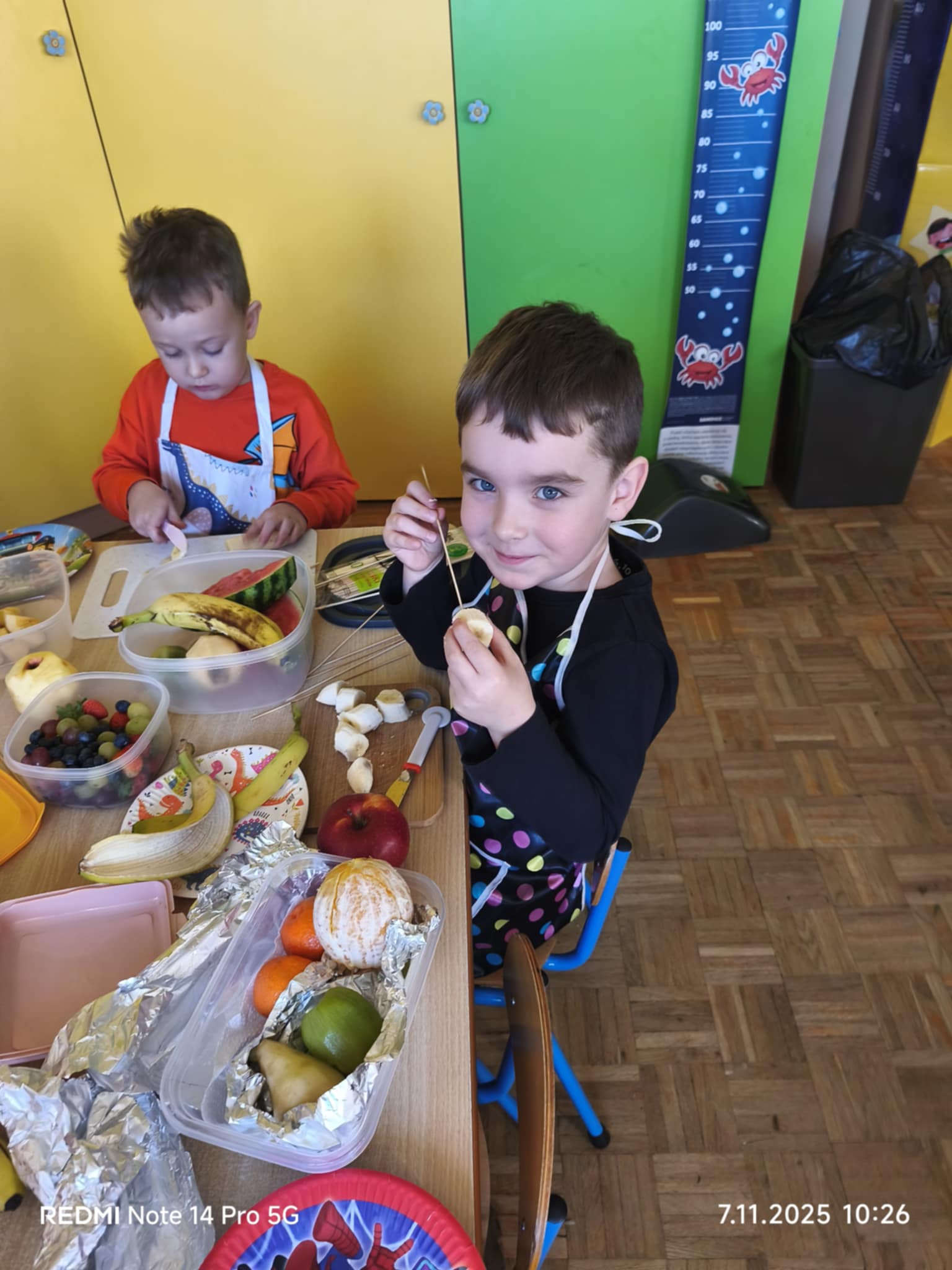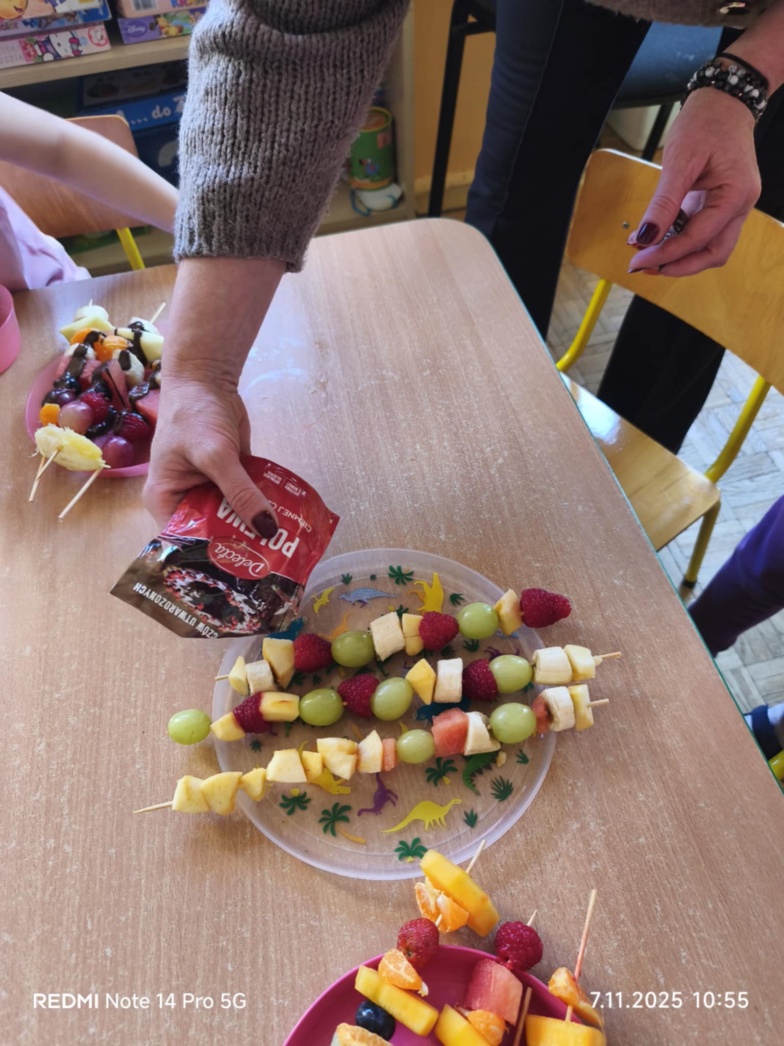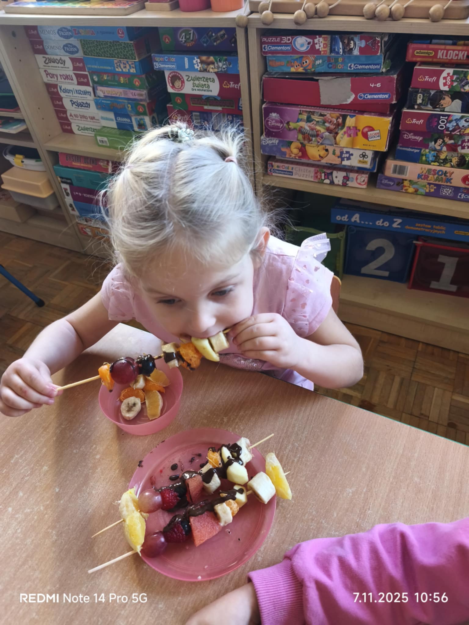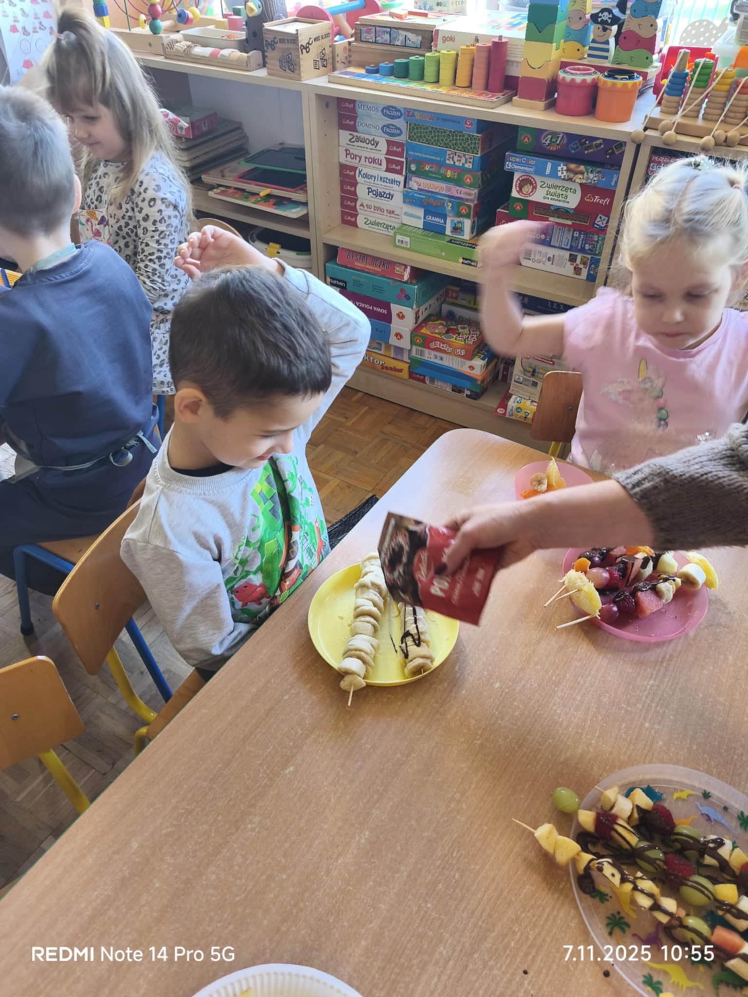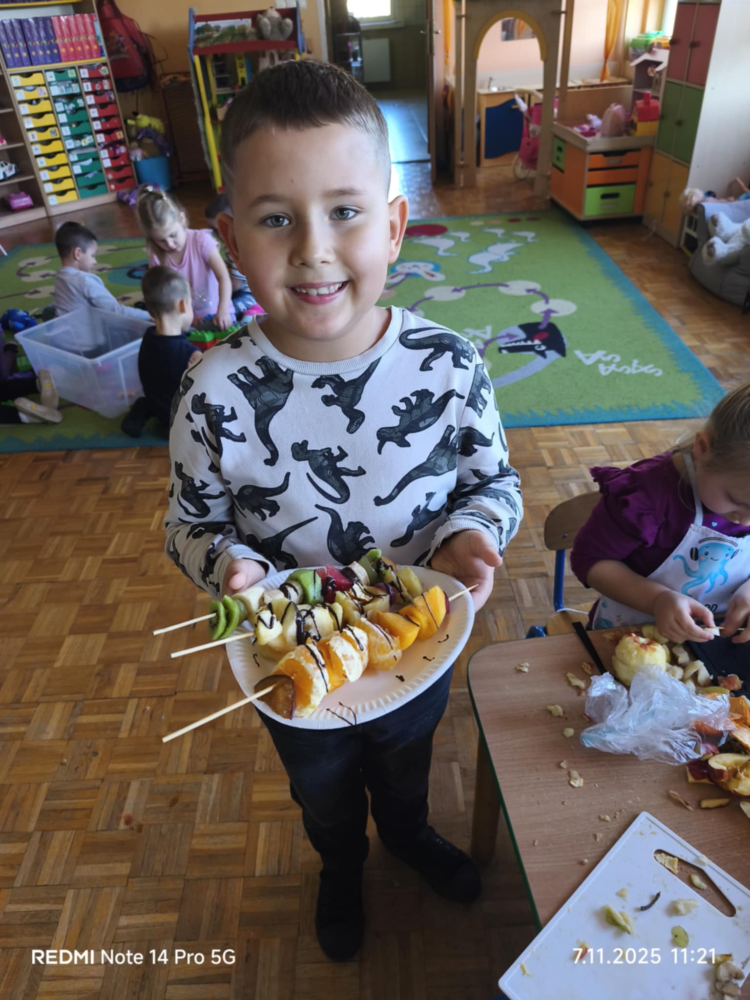W grupie „Sówki” nuda nie ma wstępu – a już na pewno nie wtedy, gdy na stole pojawiają się owoce, warzywa i cała masa dobrej energii! Tego dnia nasze przedszkolaki zamieniły się w małych ekspertów od zdrowego stylu życia. Na początku rozmawialiśmy o tym, dlaczego jabłko to lepszy wybór niż baton, po co marchewka zagląda do talerza i dlaczego chipsy czasem warto zostawić na sklepowej półce. Potem przyszedł czas na owocowo-warzywne quizy i zagadki – tu dopiero było śmiechu! Kto by pomyślał, że brokuł może być „zielonym drzewkiem siły”, a banan to „żółta energia w skórce”? Dzieci popisywały się wiedzą, błyskotliwością i humorem, jak prawdziwi mistrzowie zdrowych przekąsek. A kiedy już głowy pękały od pomysłów (i śmiechu), zabraliśmy się za praktyczną część programu – przygotowywanie owocowych szaszłyków. Sówki chwyciły za nożyki (oczywiście bezpieczne!), i z zapałem kroiły, układały, przekładały i komponowały najpiękniejsze szaszłyki, jakie świat widział! Kawałki kiwi, jabłka, winogron, banana i truskawek tworzyły prawdziwe dzieła sztuki kulinarnej – kolorowe, pachnące i… aż szkoda było je zjeść! Ale że w naszym przedszkolu nie ma rzeczy niemożliwych, to pojawił się też mały, słodki „grzeszek” – pani delikatnie polała szaszłyki czekoladową polewą. No bo przecież nawet najbardziej fit sówka czasem potrzebuje odrobiny czekolady dla lepszego humoru!