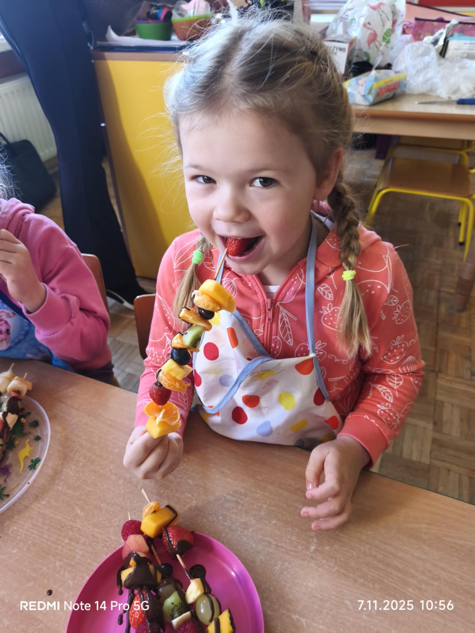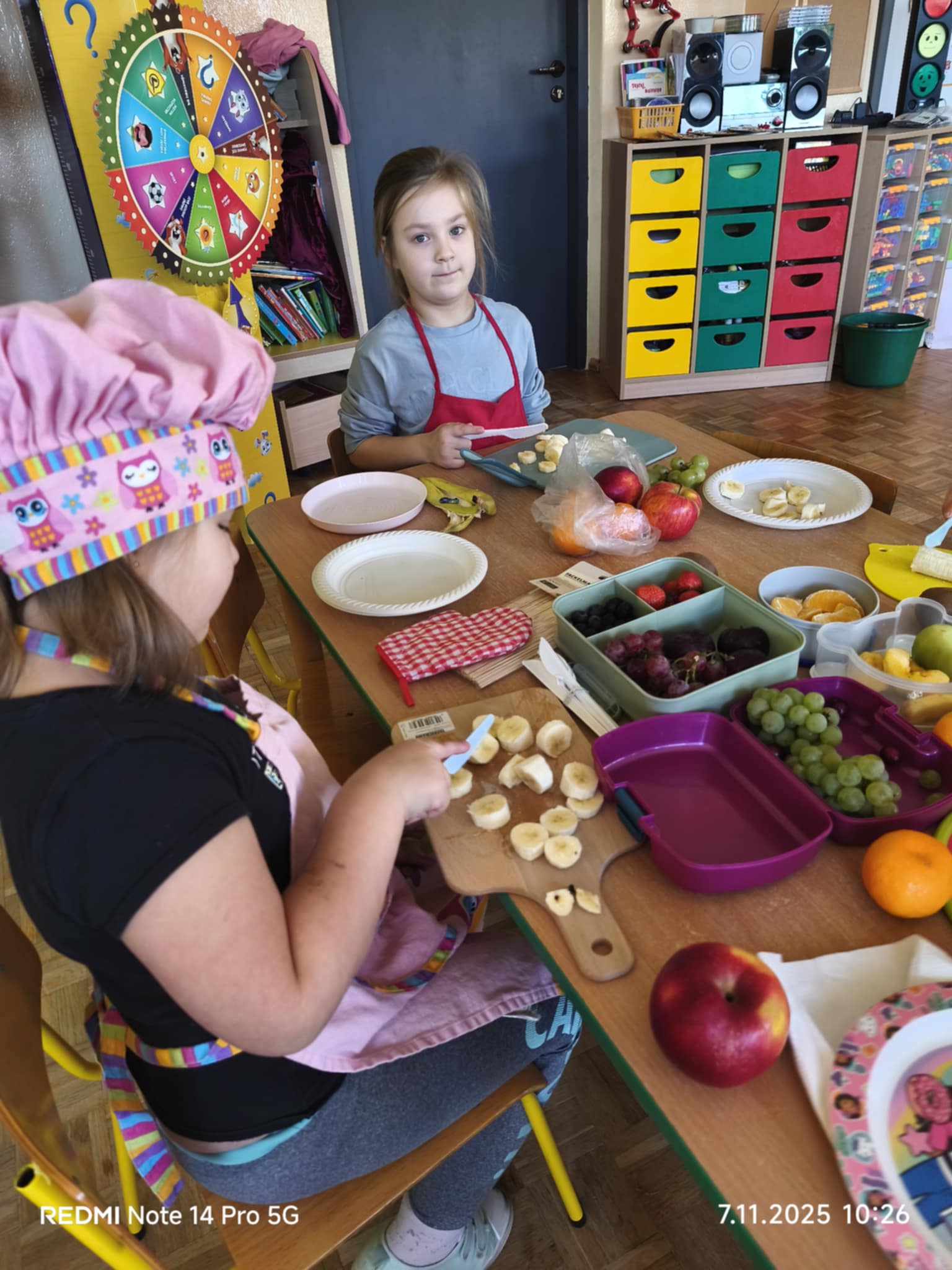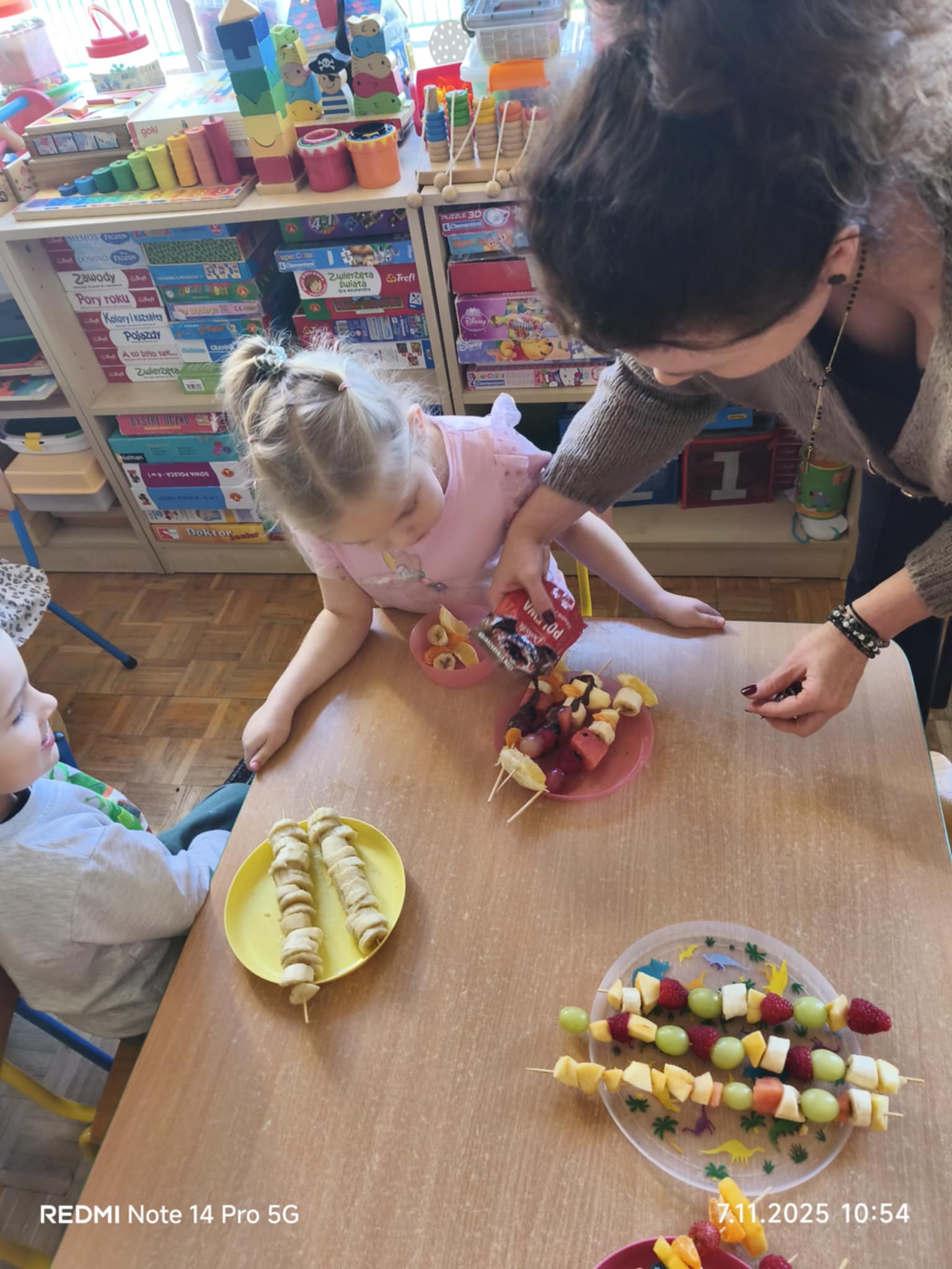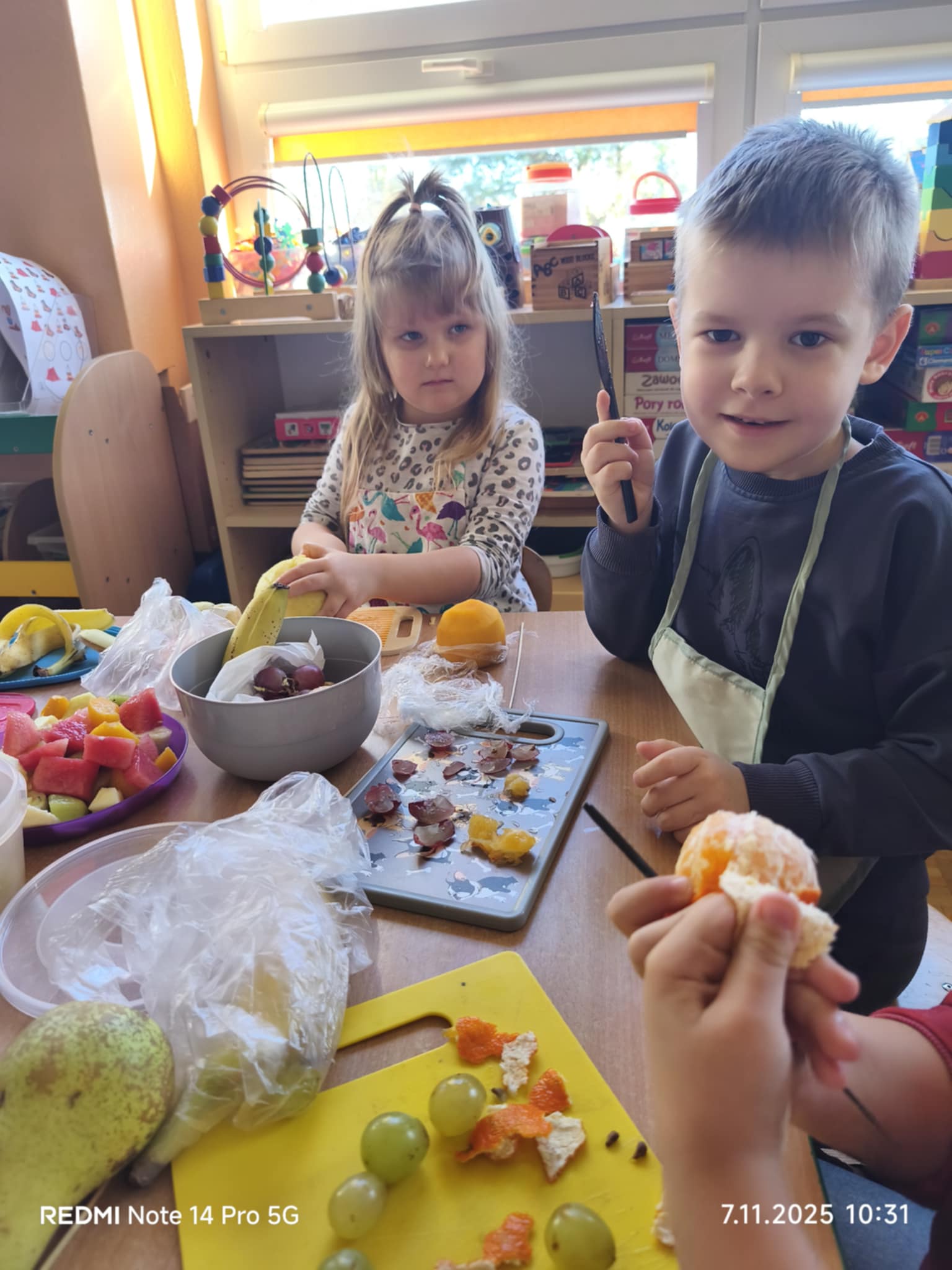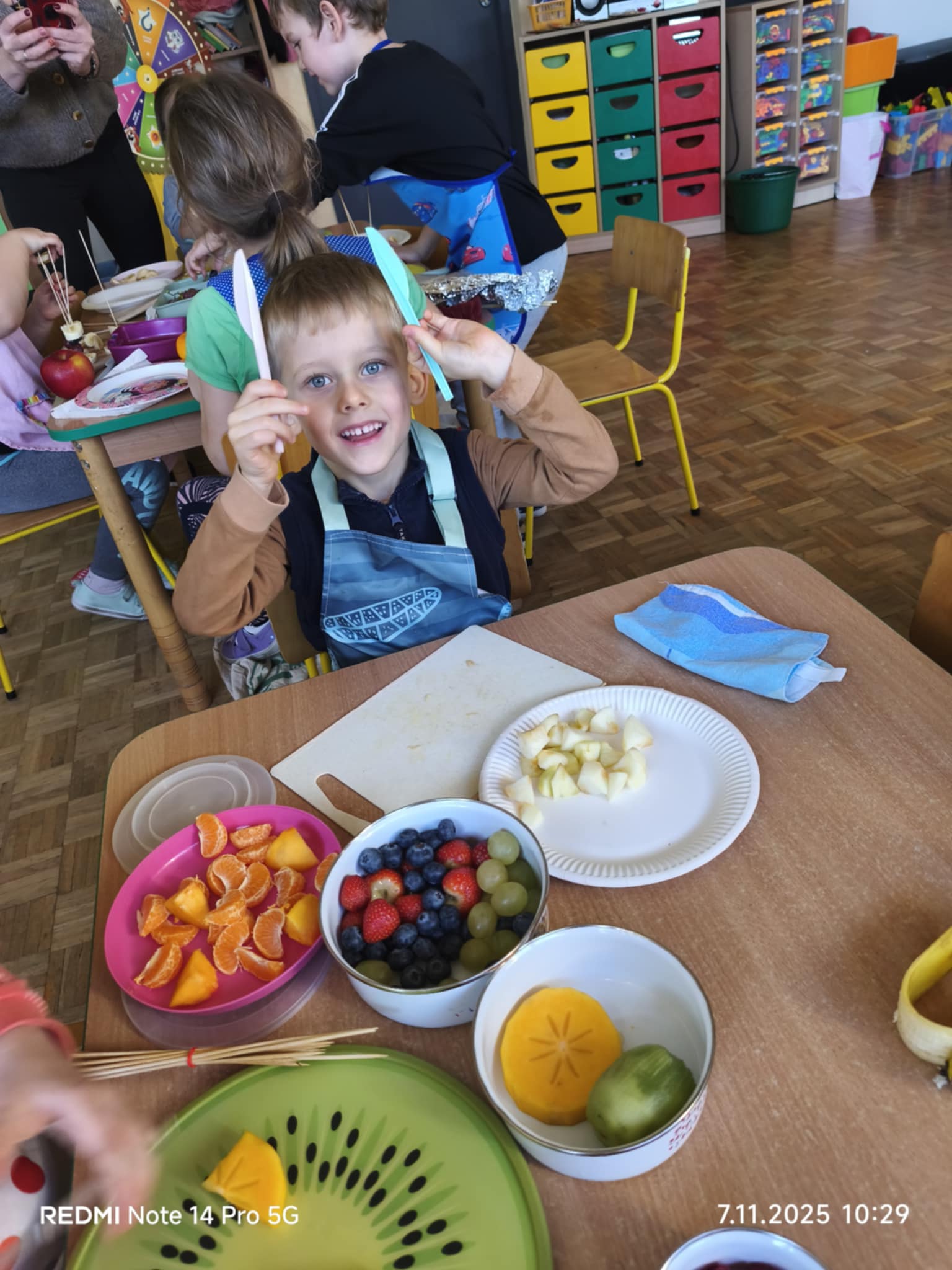 W grupie „Sówki” nuda nie ma wstępu – a już na pewno nie wtedy, gdy na stole pojawiają się owoce, warzywa i cała masa dobrej energii! Tego dnia nasze przedszkolaki zamieniły się w małych ekspertów od zdrowego stylu życia. Na początku rozmawialiśmy o tym, dlaczego jabłko to lepszy wybór niż baton, po co marchewka zagląda do talerza i dlaczego chipsy czasem warto zostawić na sklepowej półce. Potem przyszedł czas na owocowo-warzywne quizy i zagadki – tu dopiero było śmiechu! Kto by pomyślał, że brokuł może być „zielonym drzewkiem siły”, a banan to „żółta energia w skórce”? Dzieci popisywały się wiedzą, błyskotliwością i humorem, jak prawdziwi mistrzowie zdrowych przekąsek. A kiedy już głowy pękały od pomysłów (i śmiechu), zabraliśmy się za praktyczną część programu – przygotowywanie owocowych szaszłyków. Sówki chwyciły za nożyki (oczywiście bezpieczne!), i z zapałem kroiły, układały, przekładały i komponowały najpiękniejsze szaszłyki, jakie świat widział! Kawałki kiwi, jabłka, winogron, banana i truskawek tworzyły prawdziwe dzieła sztuki kulinarnej – kolorowe, pachnące i… aż szkoda było je zjeść! Ale że w naszym przedszkolu nie ma rzeczy niemożliwych, to pojawił się też mały, słodki „grzeszek” – pani delikatnie polała szaszłyki czekoladową polewą. No bo przecież nawet najbardziej fit sówka czasem potrzebuje odrobiny czekolady dla lepszego humoru!