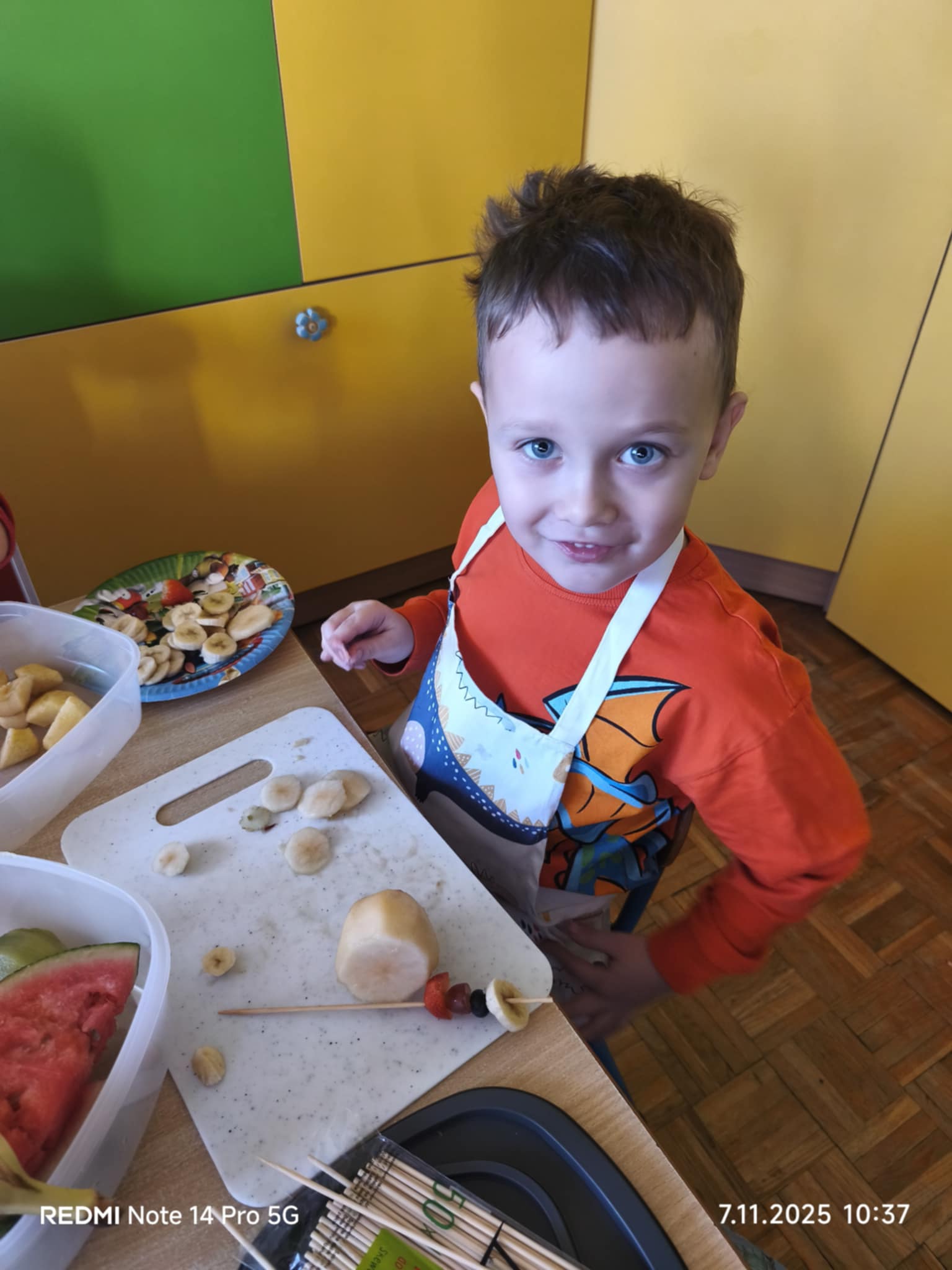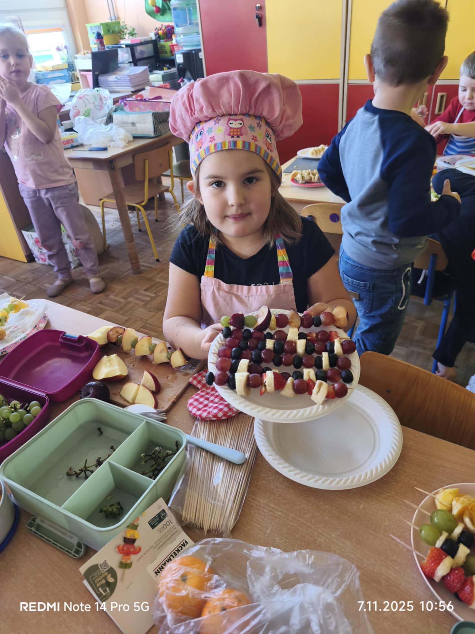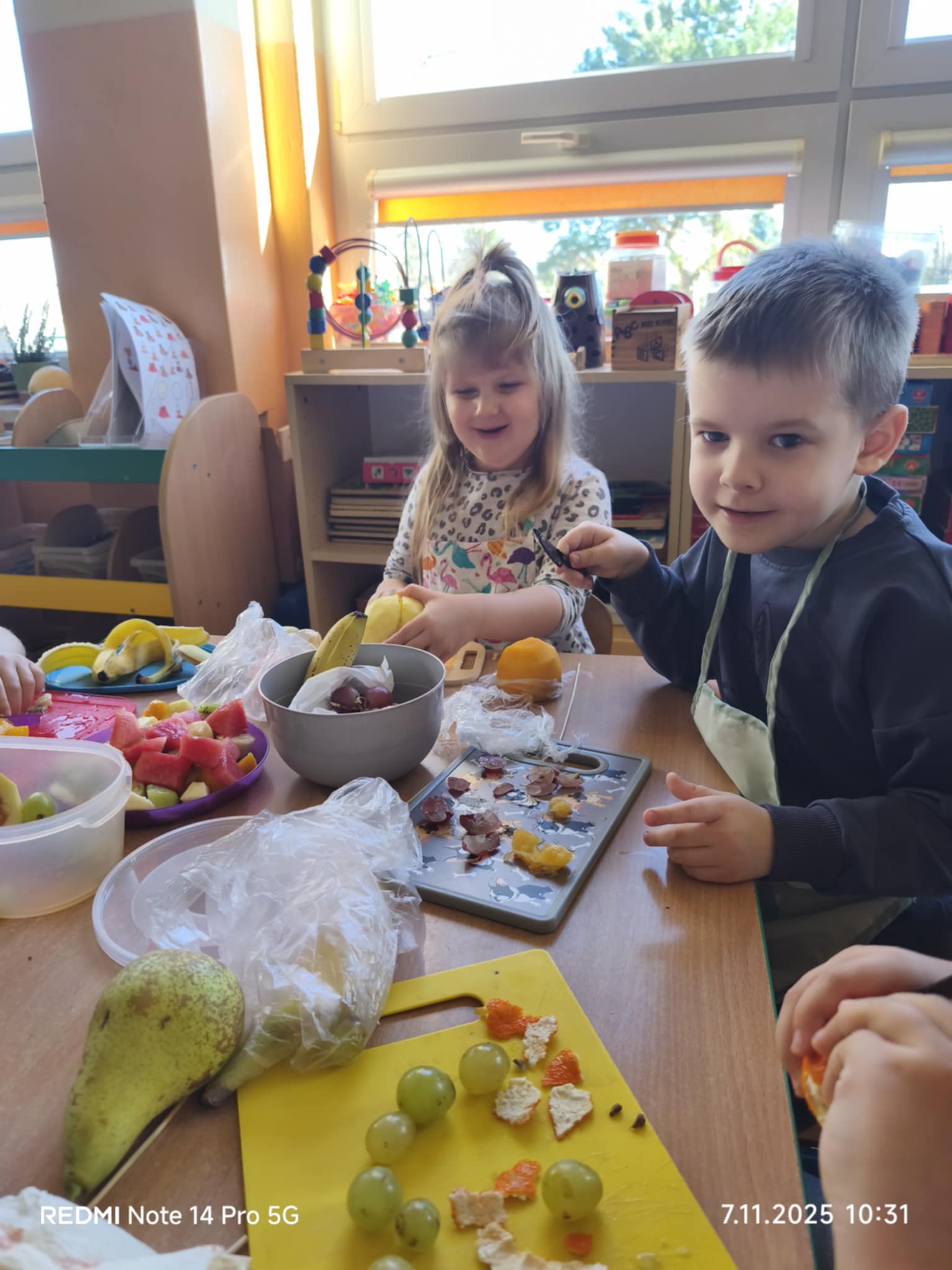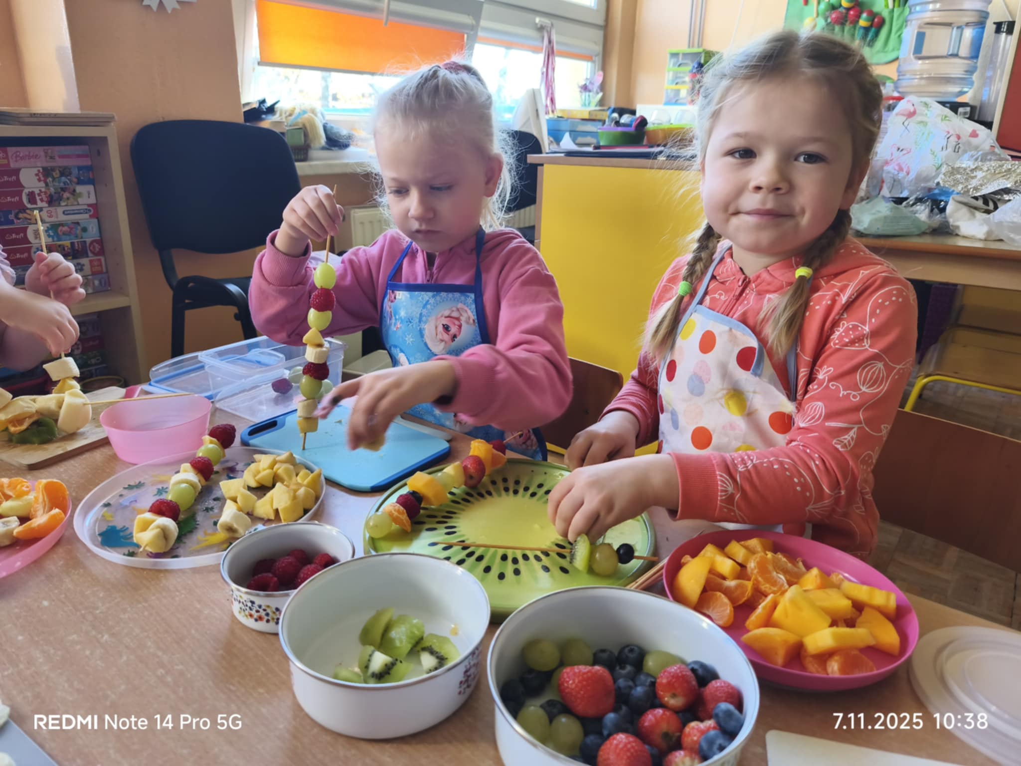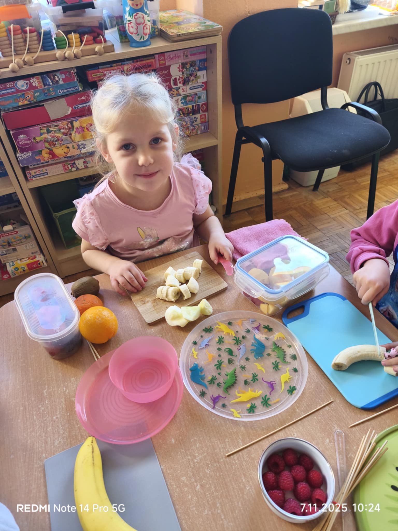 W grupie „Sówki” nuda nie ma wstępu – a już na pewno nie wtedy, gdy na stole pojawiają się owoce, warzywa i cała masa dobrej energii! Tego dnia nasze przedszkolaki zamieniły się w małych ekspertów od zdrowego stylu życia. Na początku rozmawialiśmy o tym, dlaczego jabłko to lepszy wybór niż baton, po co marchewka zagląda do talerza i dlaczego chipsy czasem warto zostawić na sklepowej półce. Potem przyszedł czas na owocowo-warzywne quizy i zagadki – tu dopiero było śmiechu! Kto by pomyślał, że brokuł może być „zielonym drzewkiem siły”, a banan to „żółta energia w skórce”? Dzieci popisywały się wiedzą, błyskotliwością i humorem, jak prawdziwi mistrzowie zdrowych przekąsek. A kiedy już głowy pękały od pomysłów (i śmiechu), zabraliśmy się za praktyczną część programu – przygotowywanie owocowych szaszłyków. Sówki chwyciły za nożyki (oczywiście bezpieczne!), i z zapałem kroiły, układały, przekładały i komponowały najpiękniejsze szaszłyki, jakie świat widział! Kawałki kiwi, jabłka, winogron, banana i truskawek tworzyły prawdziwe dzieła sztuki kulinarnej – kolorowe, pachnące i… aż szkoda było je zjeść! Ale że w naszym przedszkolu nie ma rzeczy niemożliwych, to pojawił się też mały, słodki „grzeszek” – pani delikatnie polała szaszłyki czekoladową polewą. No bo przecież nawet najbardziej fit sówka czasem potrzebuje odrobiny czekolady dla lepszego humoru!
