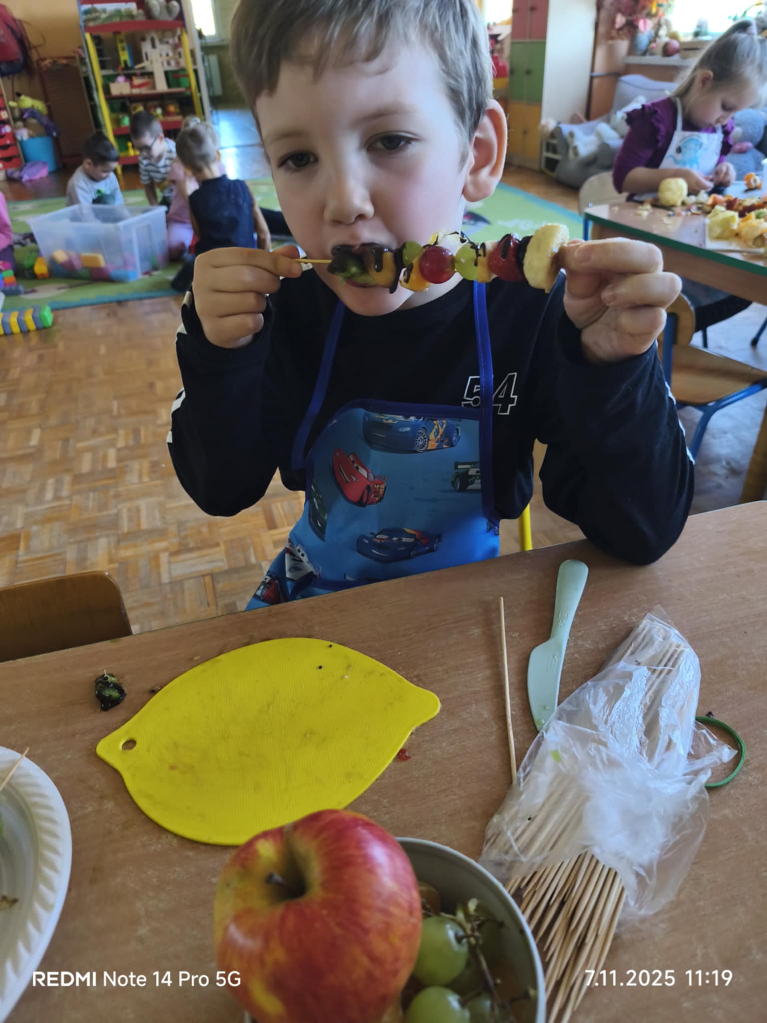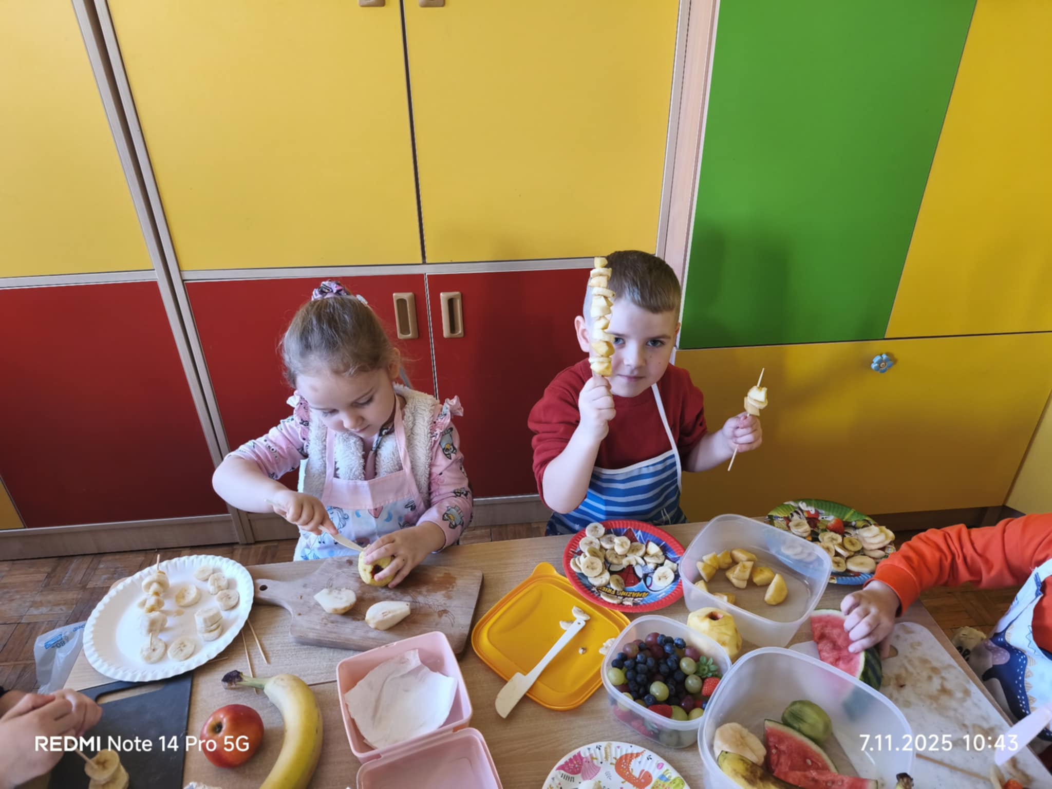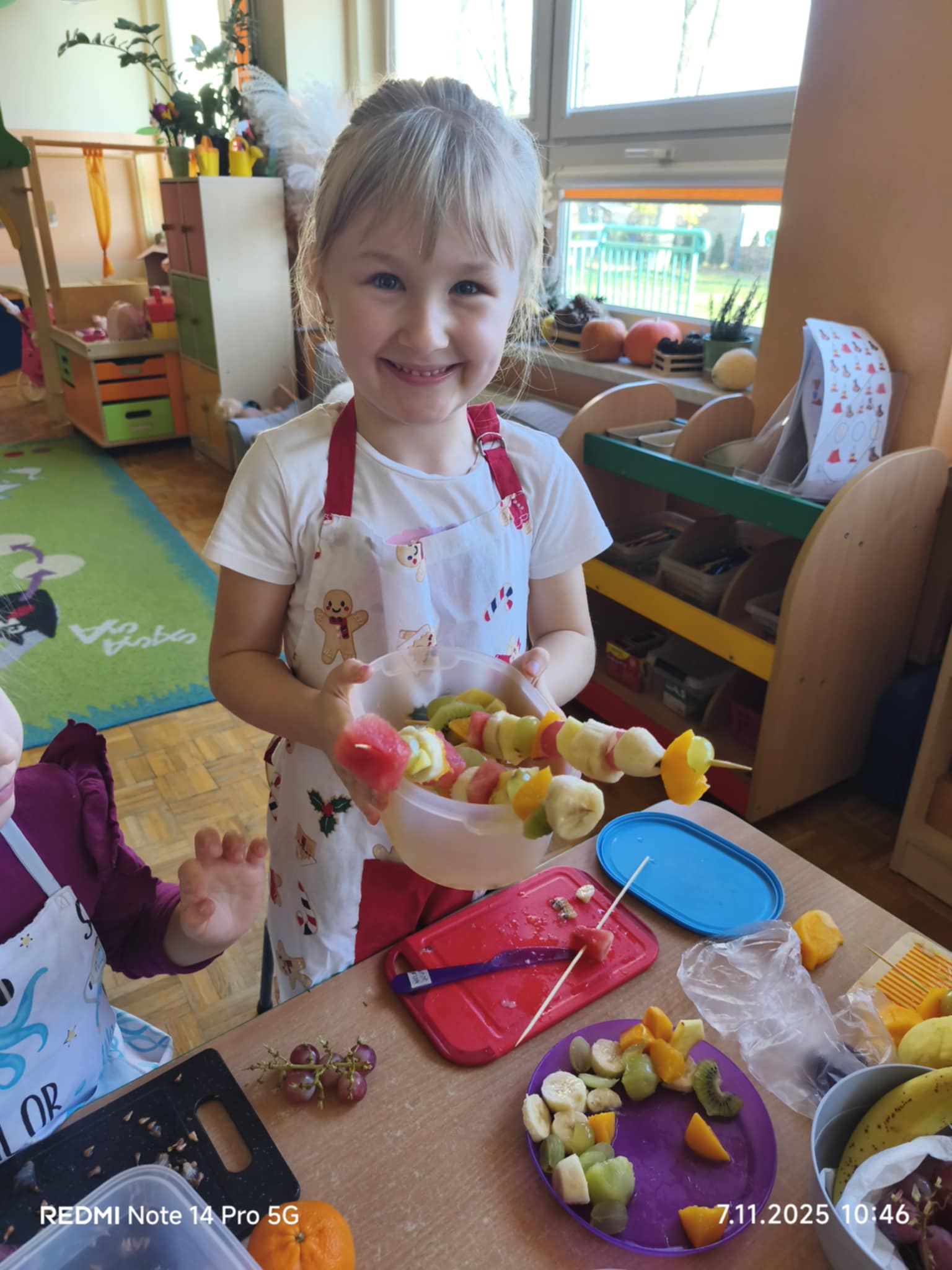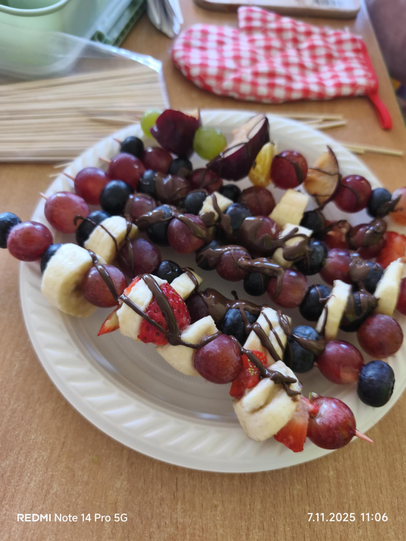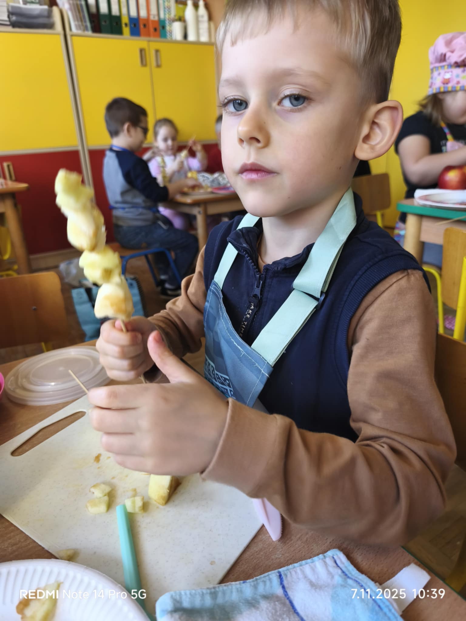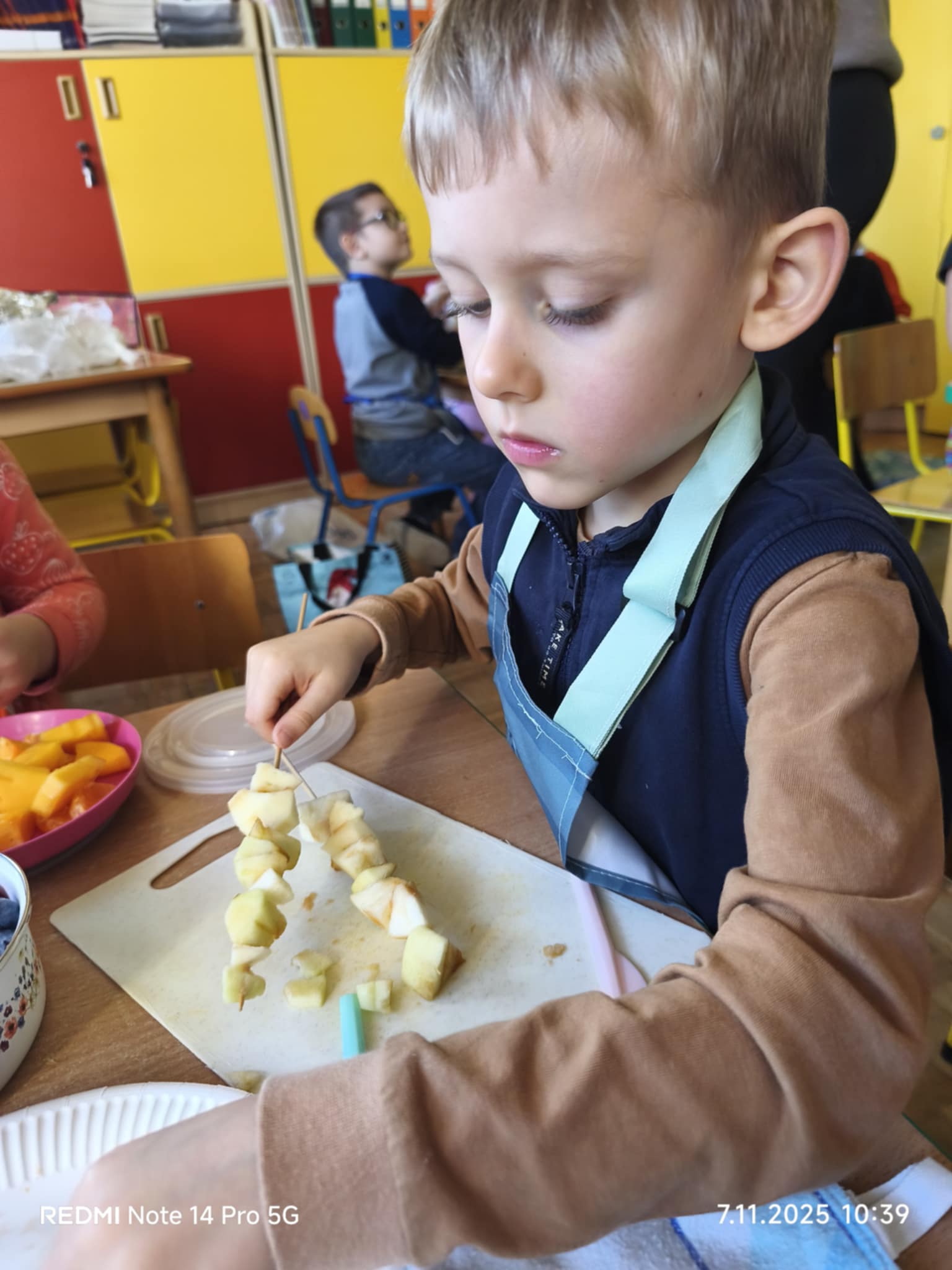 W grupie „Sówki” nuda nie ma wstępu – a już na pewno nie wtedy, gdy na stole pojawiają się owoce, warzywa i cała masa dobrej energii! Tego dnia nasze przedszkolaki zamieniły się w małych ekspertów od zdrowego stylu życia. Na początku rozmawialiśmy o tym, dlaczego jabłko to lepszy wybór niż baton, po co marchewka zagląda do talerza i dlaczego chipsy czasem warto zostawić na sklepowej półce. Potem przyszedł czas na owocowo-warzywne quizy i zagadki – tu dopiero było śmiechu! Kto by pomyślał, że brokuł może być „zielonym drzewkiem siły”, a banan to „żółta energia w skórce”? Dzieci popisywały się wiedzą, błyskotliwością i humorem, jak prawdziwi mistrzowie zdrowych przekąsek. A kiedy już głowy pękały od pomysłów (i śmiechu), zabraliśmy się za praktyczną część programu – przygotowywanie owocowych szaszłyków. Sówki chwyciły za nożyki (oczywiście bezpieczne!), i z zapałem kroiły, układały, przekładały i komponowały najpiękniejsze szaszłyki, jakie świat widział! Kawałki kiwi, jabłka, winogron, banana i truskawek tworzyły prawdziwe dzieła sztuki kulinarnej – kolorowe, pachnące i… aż szkoda było je zjeść! Ale że w naszym przedszkolu nie ma rzeczy niemożliwych, to pojawił się też mały, słodki „grzeszek” – pani delikatnie polała szaszłyki czekoladową polewą. No bo przecież nawet najbardziej fit sówka czasem potrzebuje odrobiny czekolady dla lepszego humoru!