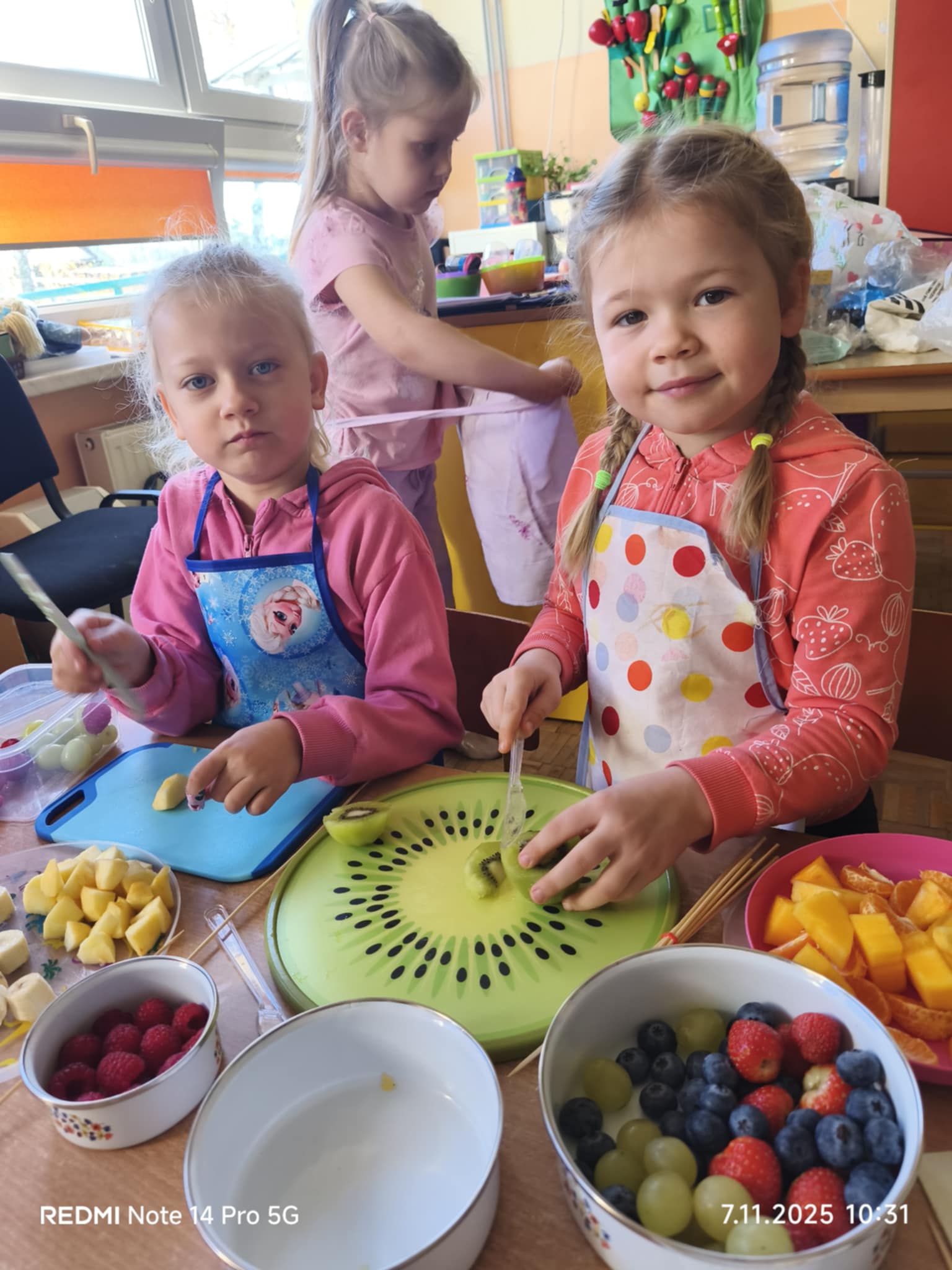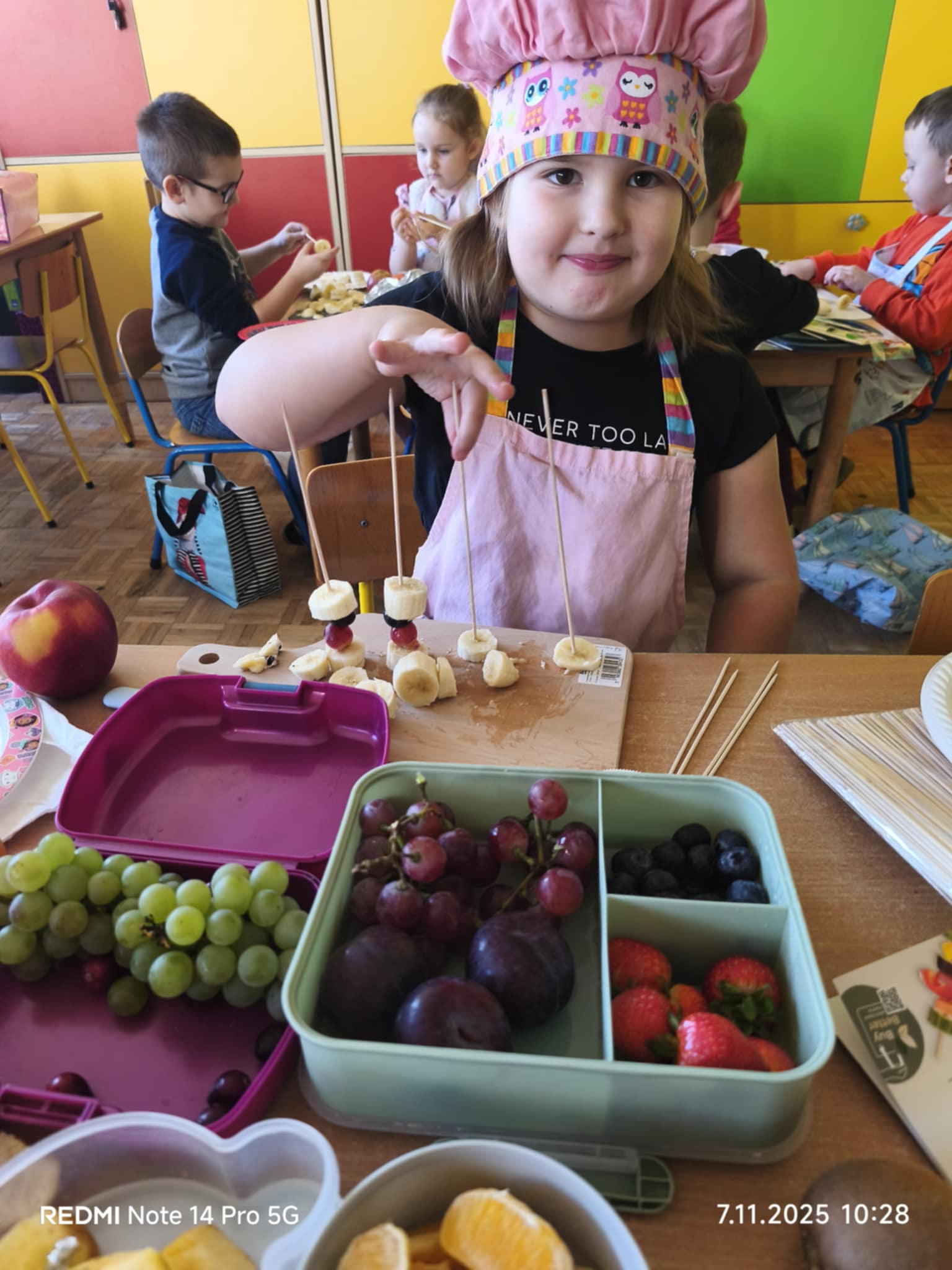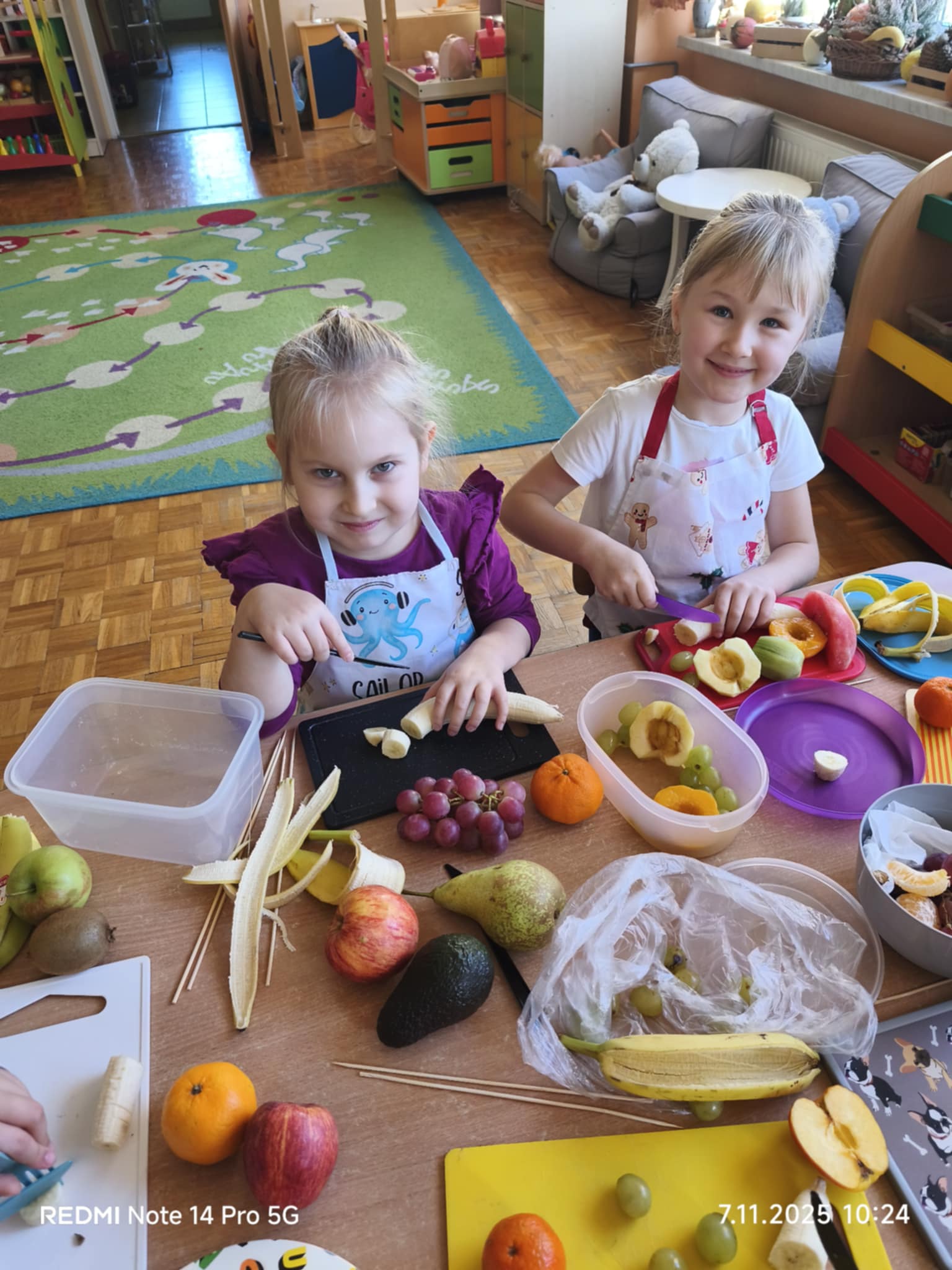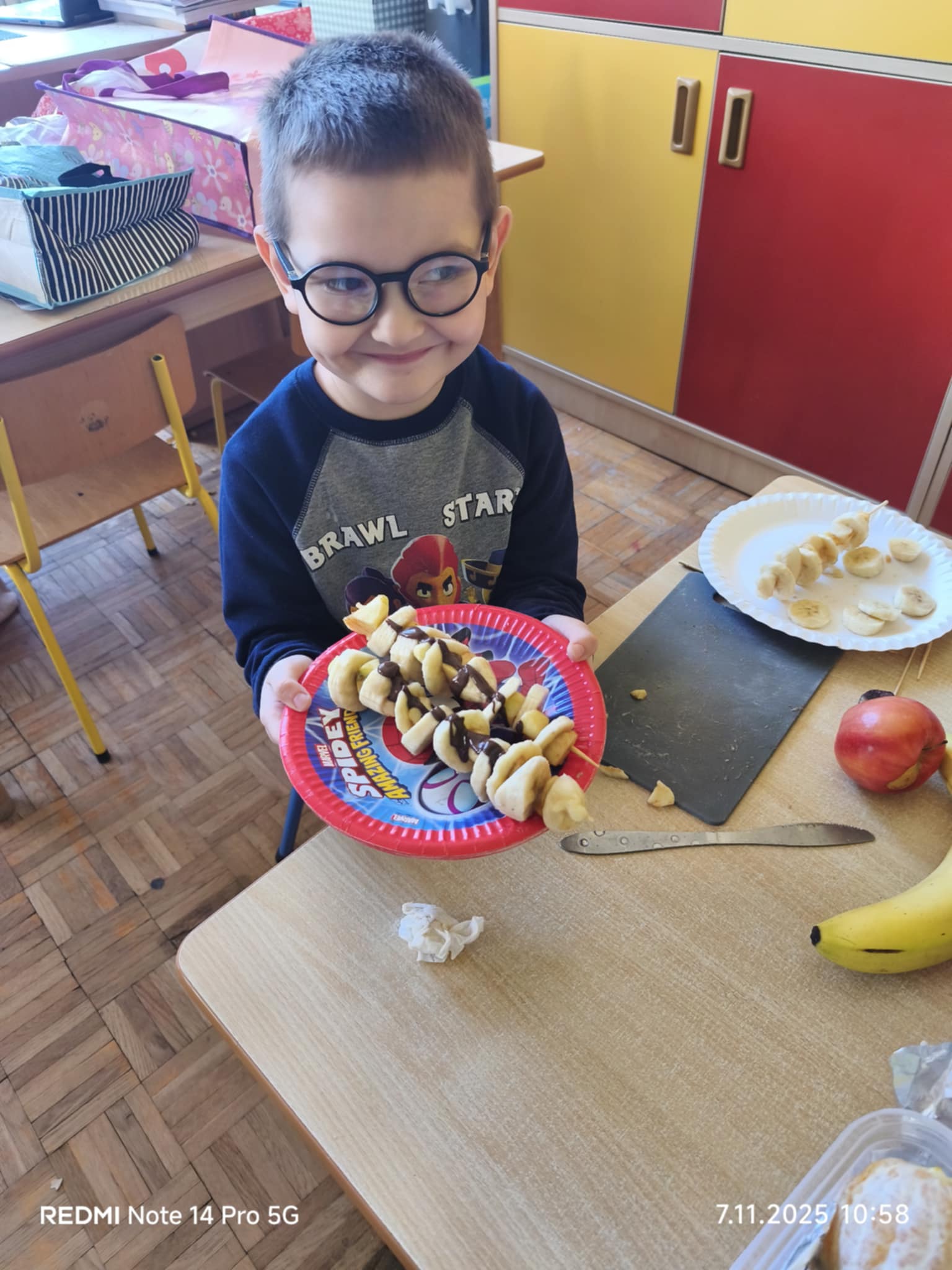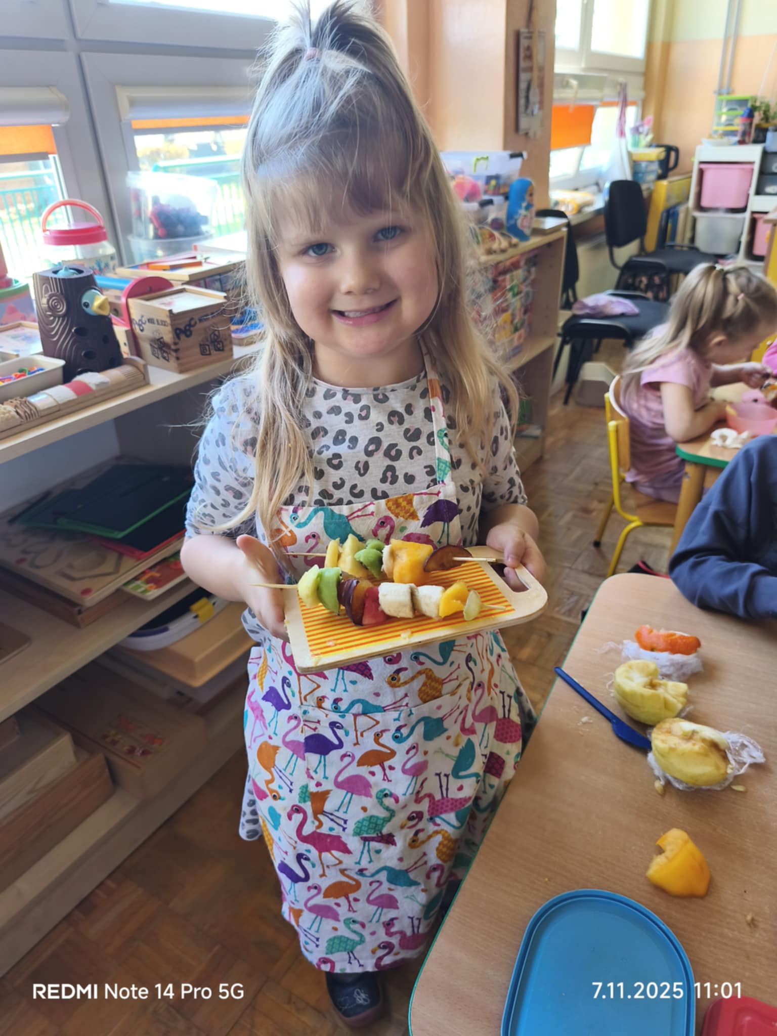 W grupie „Sówki” nuda nie ma wstępu – a już na pewno nie wtedy, gdy na stole pojawiają się owoce, warzywa i cała masa dobrej energii! Tego dnia nasze przedszkolaki zamieniły się w małych ekspertów od zdrowego stylu życia. Na początku rozmawialiśmy o tym, dlaczego jabłko to lepszy wybór niż baton, po co marchewka zagląda do talerza i dlaczego chipsy czasem warto zostawić na sklepowej półce. Potem przyszedł czas na owocowo-warzywne quizy i zagadki – tu dopiero było śmiechu! Kto by pomyślał, że brokuł może być „zielonym drzewkiem siły”, a banan to „żółta energia w skórce”? Dzieci popisywały się wiedzą, błyskotliwością i humorem, jak prawdziwi mistrzowie zdrowych przekąsek. A kiedy już głowy pękały od pomysłów (i śmiechu), zabraliśmy się za praktyczną część programu – przygotowywanie owocowych szaszłyków. Sówki chwyciły za nożyki (oczywiście bezpieczne!), i z zapałem kroiły, układały, przekładały i komponowały najpiękniejsze szaszłyki, jakie świat widział! Kawałki kiwi, jabłka, winogron, banana i truskawek tworzyły prawdziwe dzieła sztuki kulinarnej – kolorowe, pachnące i… aż szkoda było je zjeść! Ale że w naszym przedszkolu nie ma rzeczy niemożliwych, to pojawił się też mały, słodki „grzeszek” – pani delikatnie polała szaszłyki czekoladową polewą. No bo przecież nawet najbardziej fit sówka czasem potrzebuje odrobiny czekolady dla lepszego humoru!