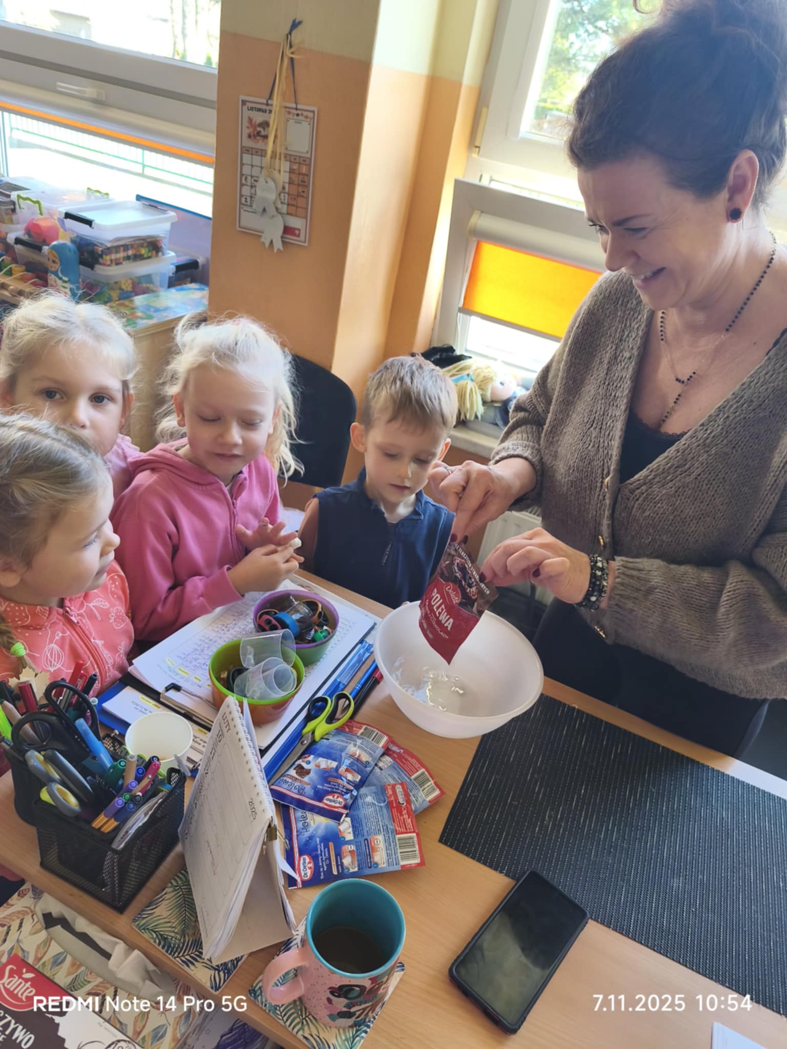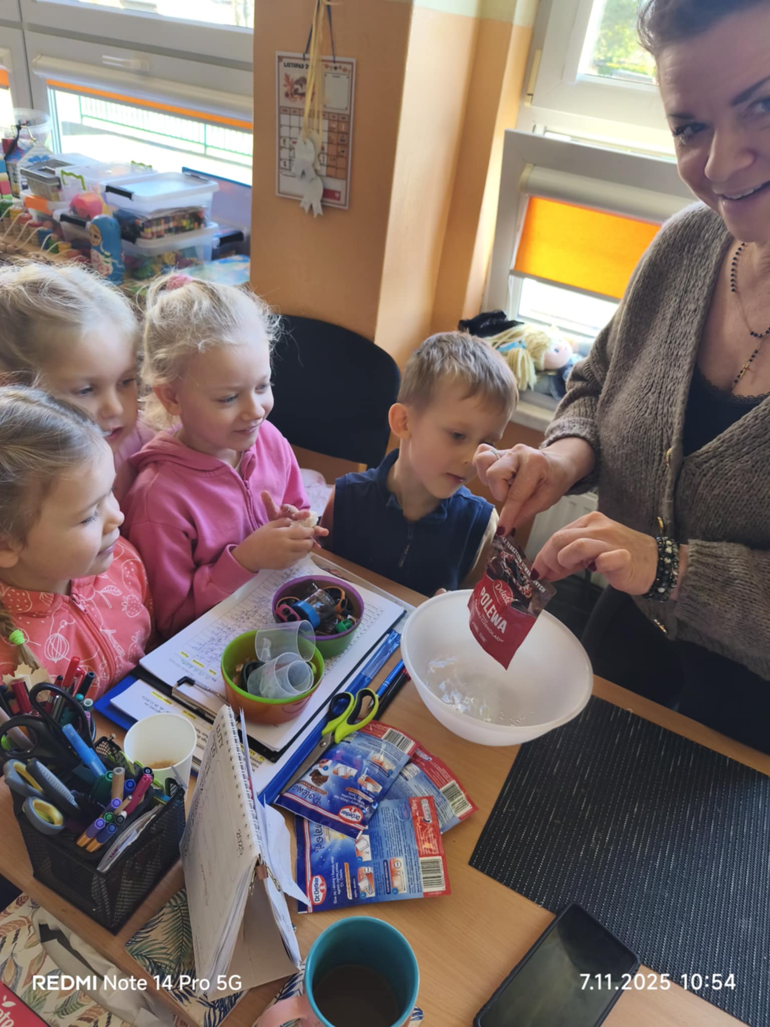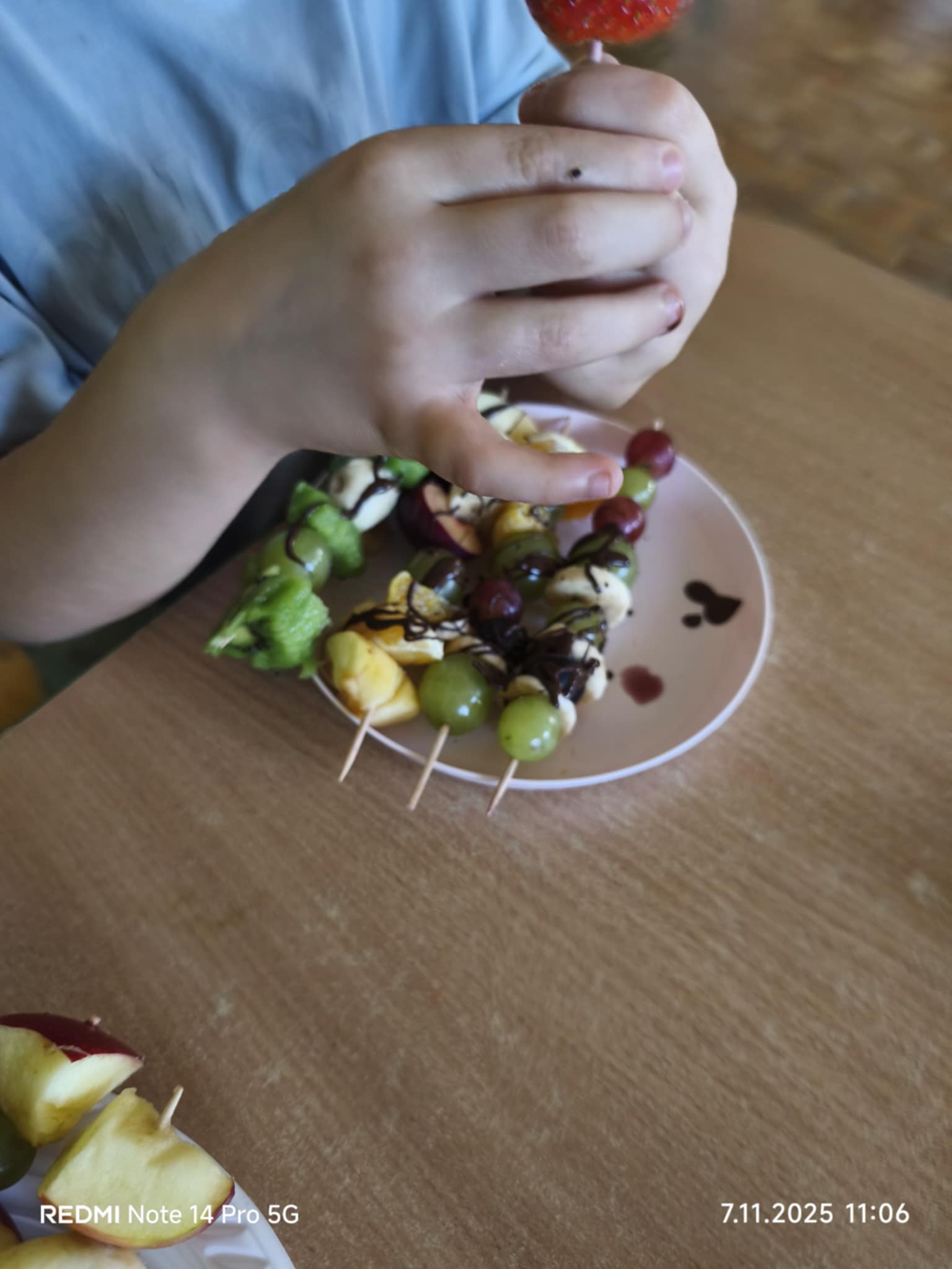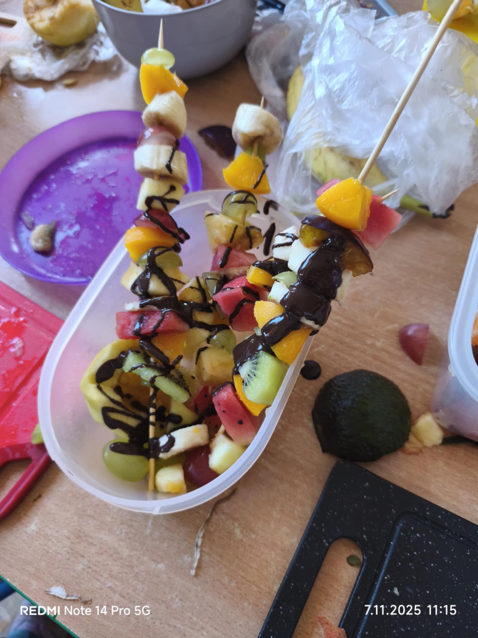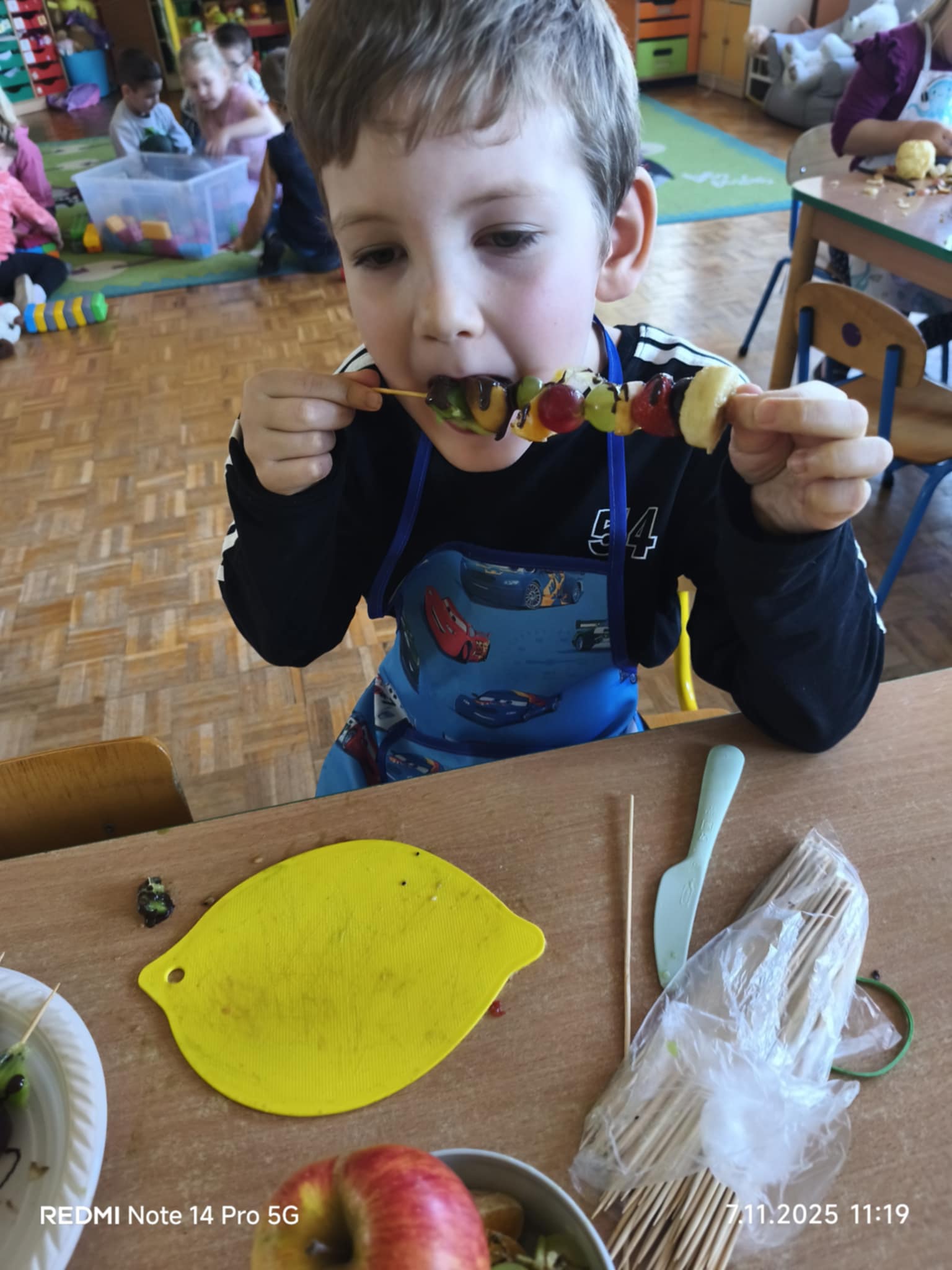 W grupie „Sówki” nuda nie ma wstępu – a już na pewno nie wtedy, gdy na stole pojawiają się owoce, warzywa i cała masa dobrej energii! Tego dnia nasze przedszkolaki zamieniły się w małych ekspertów od zdrowego stylu życia. Na początku rozmawialiśmy o tym, dlaczego jabłko to lepszy wybór niż baton, po co marchewka zagląda do talerza i dlaczego chipsy czasem warto zostawić na sklepowej półce. Potem przyszedł czas na owocowo-warzywne quizy i zagadki – tu dopiero było śmiechu! Kto by pomyślał, że brokuł może być „zielonym drzewkiem siły”, a banan to „żółta energia w skórce”? Dzieci popisywały się wiedzą, błyskotliwością i humorem, jak prawdziwi mistrzowie zdrowych przekąsek. A kiedy już głowy pękały od pomysłów (i śmiechu), zabraliśmy się za praktyczną część programu – przygotowywanie owocowych szaszłyków. Sówki chwyciły za nożyki (oczywiście bezpieczne!), i z zapałem kroiły, układały, przekładały i komponowały najpiękniejsze szaszłyki, jakie świat widział! Kawałki kiwi, jabłka, winogron, banana i truskawek tworzyły prawdziwe dzieła sztuki kulinarnej – kolorowe, pachnące i… aż szkoda było je zjeść! Ale że w naszym przedszkolu nie ma rzeczy niemożliwych, to pojawił się też mały, słodki „grzeszek” – pani delikatnie polała szaszłyki czekoladową polewą. No bo przecież nawet najbardziej fit sówka czasem potrzebuje odrobiny czekolady dla lepszego humoru!