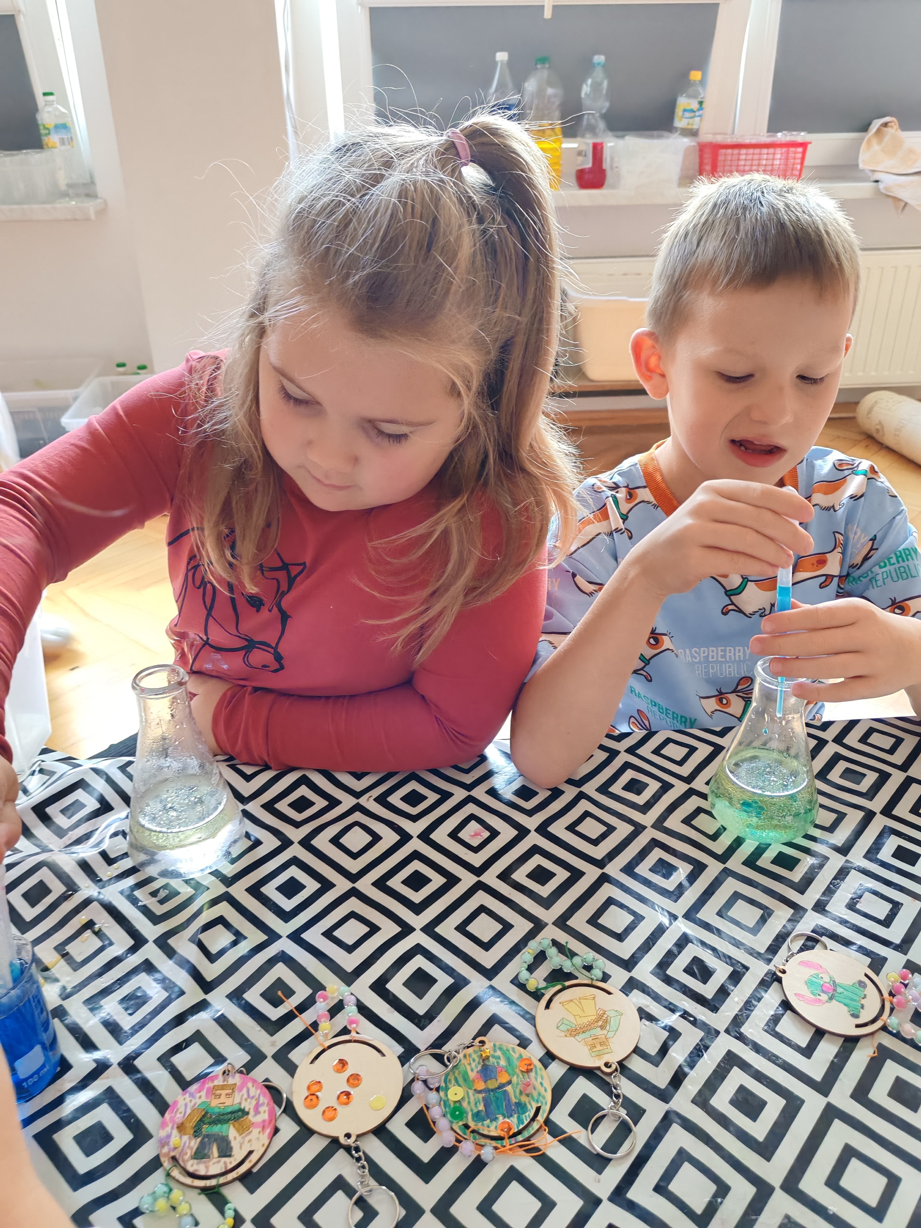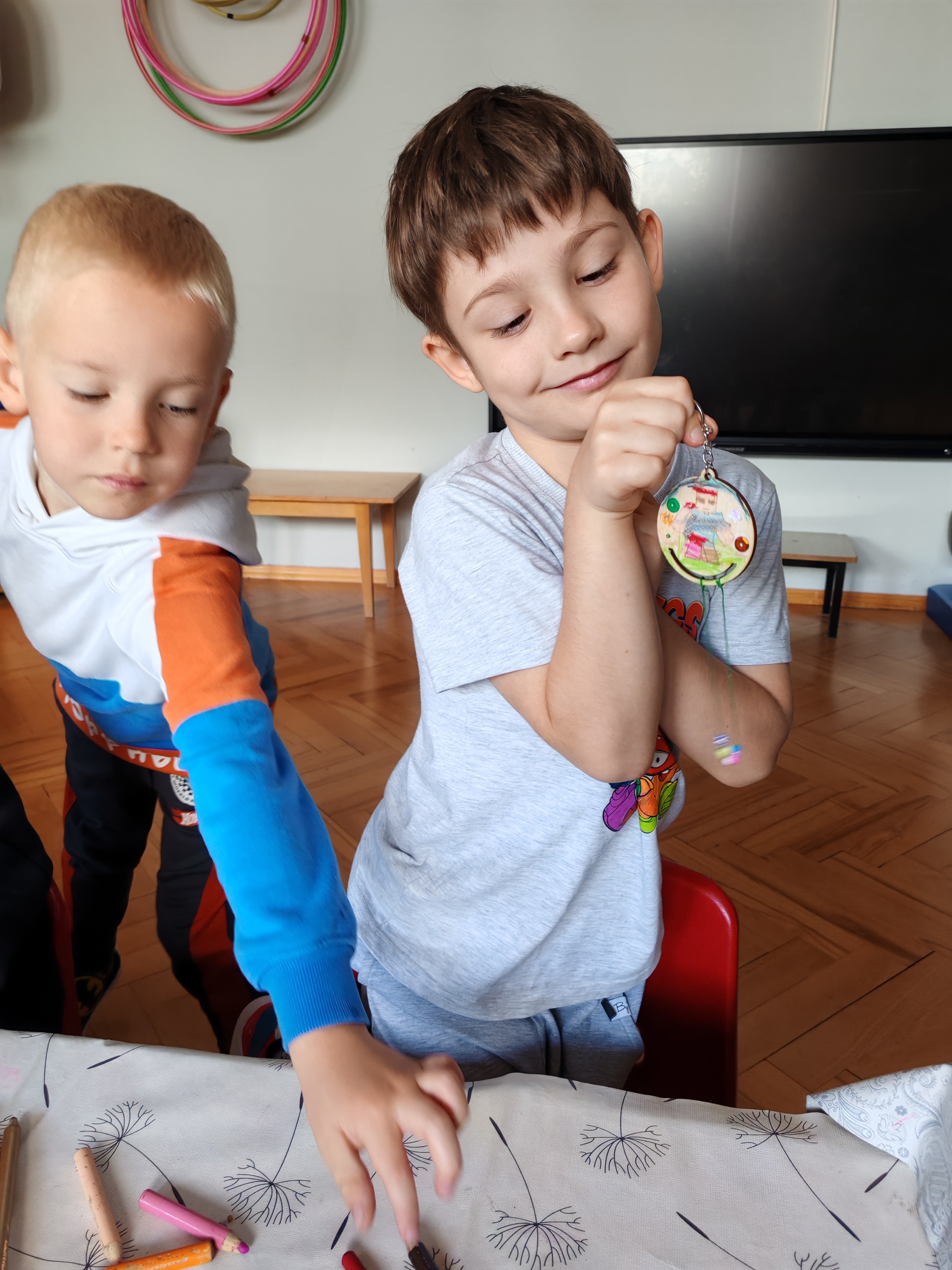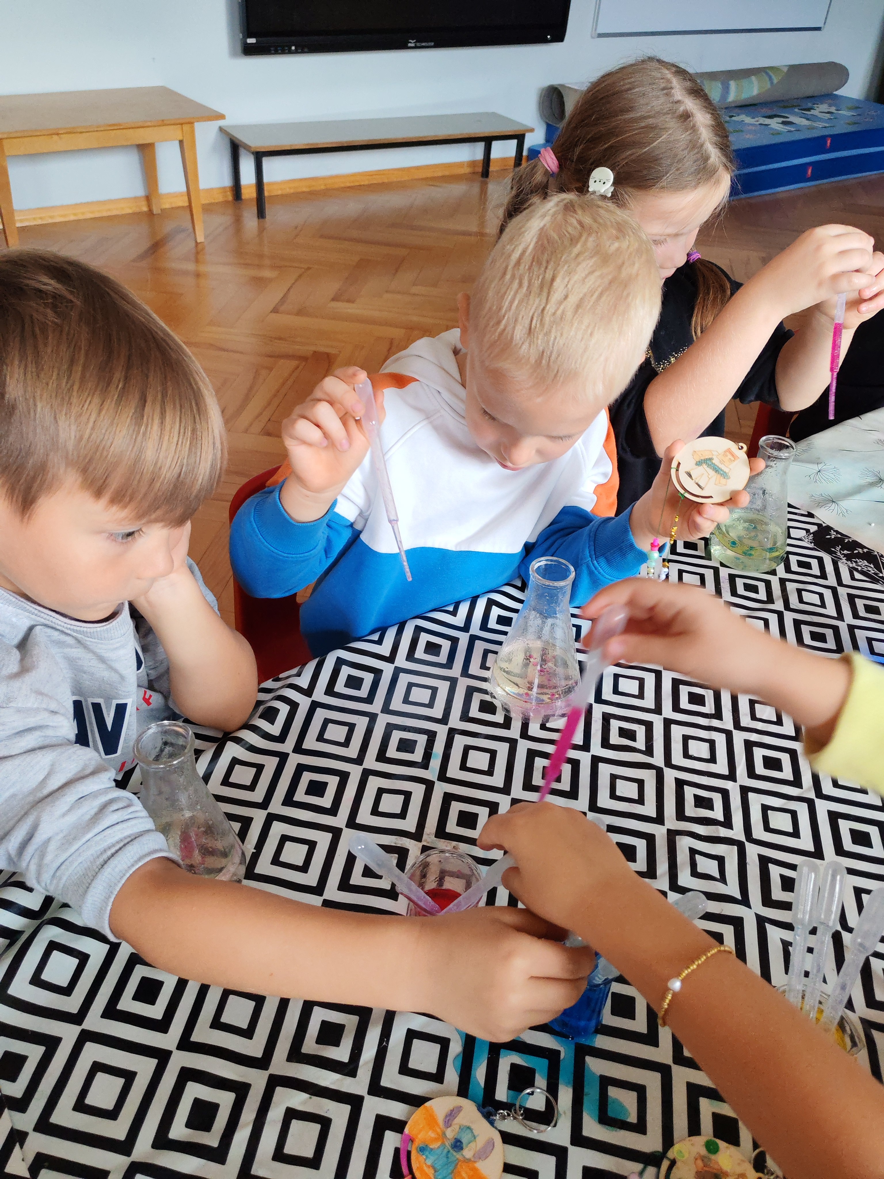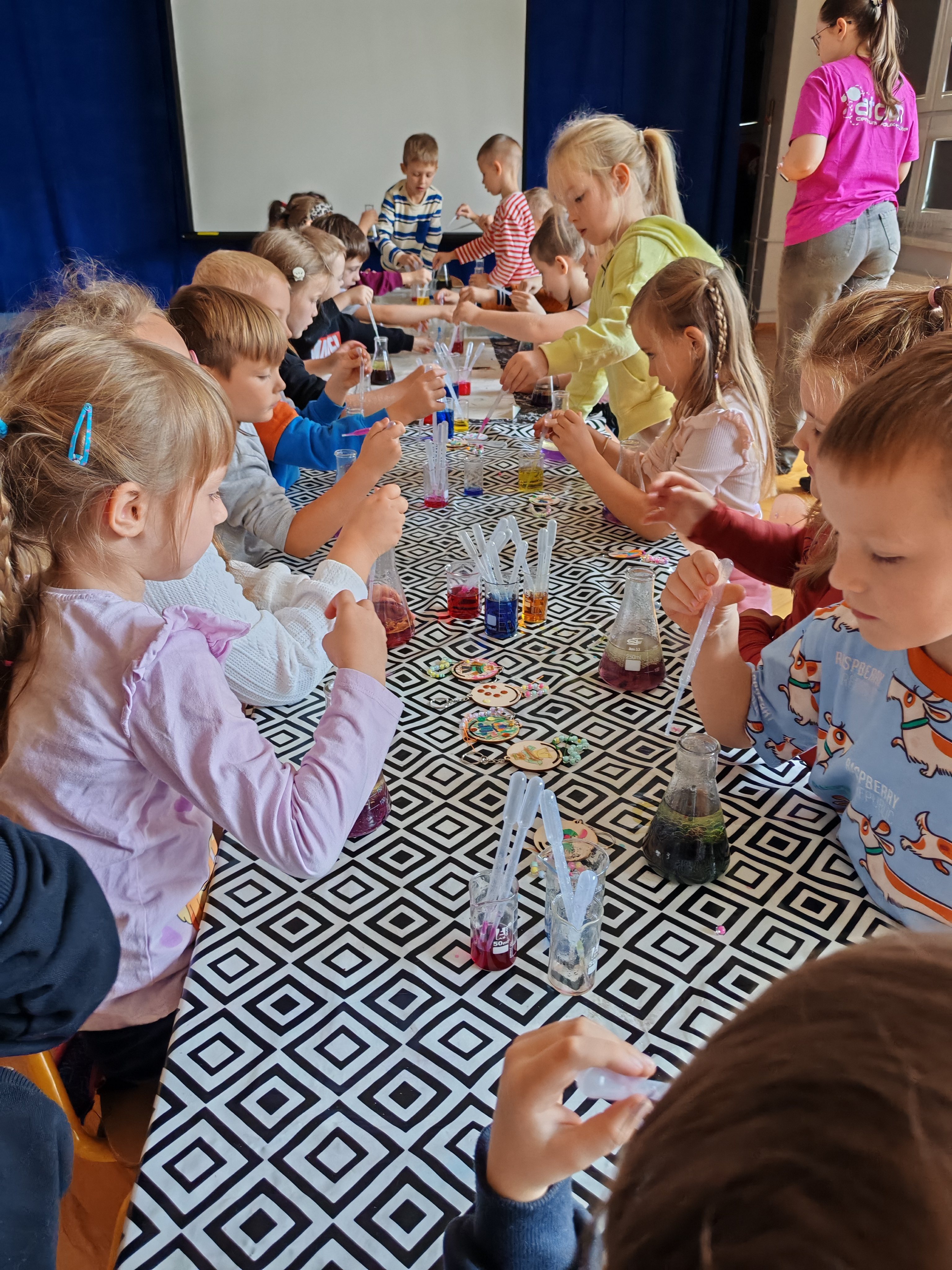 Z okazji Dnia Chłopaka odbyły się zajęcia z Atomem. Dzieci wykonały breloczki z ulubionymi postaciami: malowały, nawlekały koraliki. Następnie ulubione przez dzieci eksperymentowanie, mieszanie płynów, kolorów. Dużo dobrej zabawy.