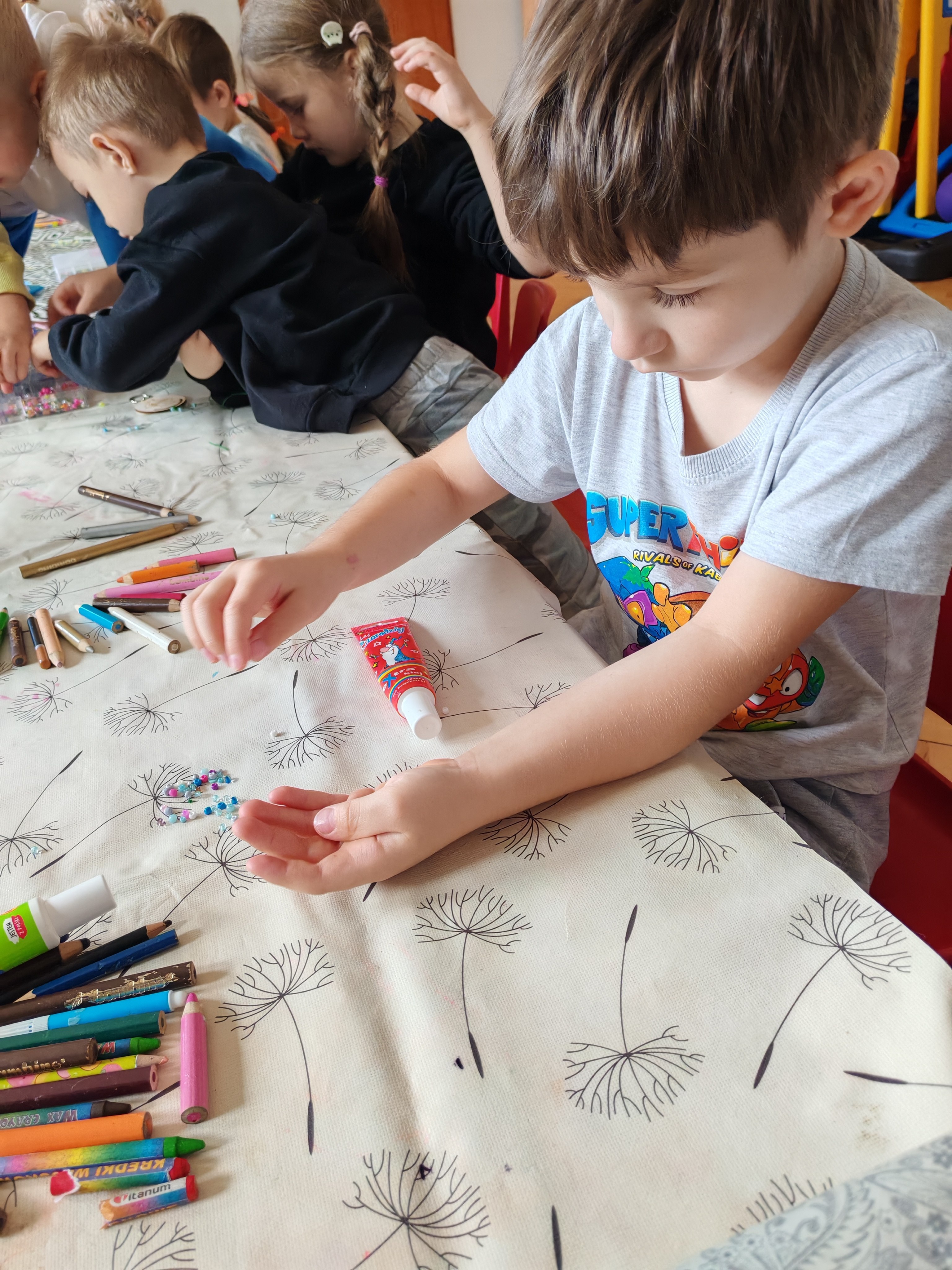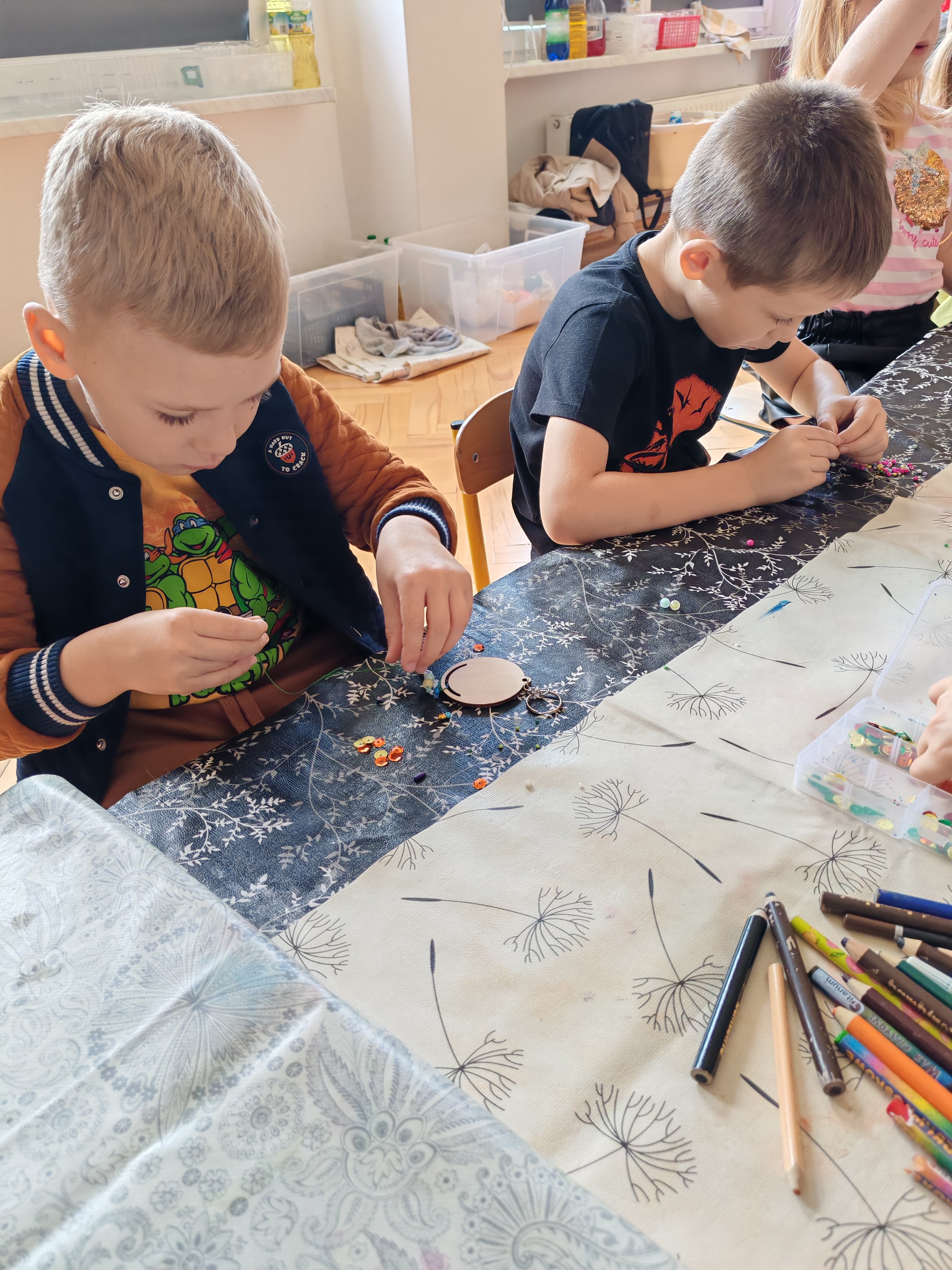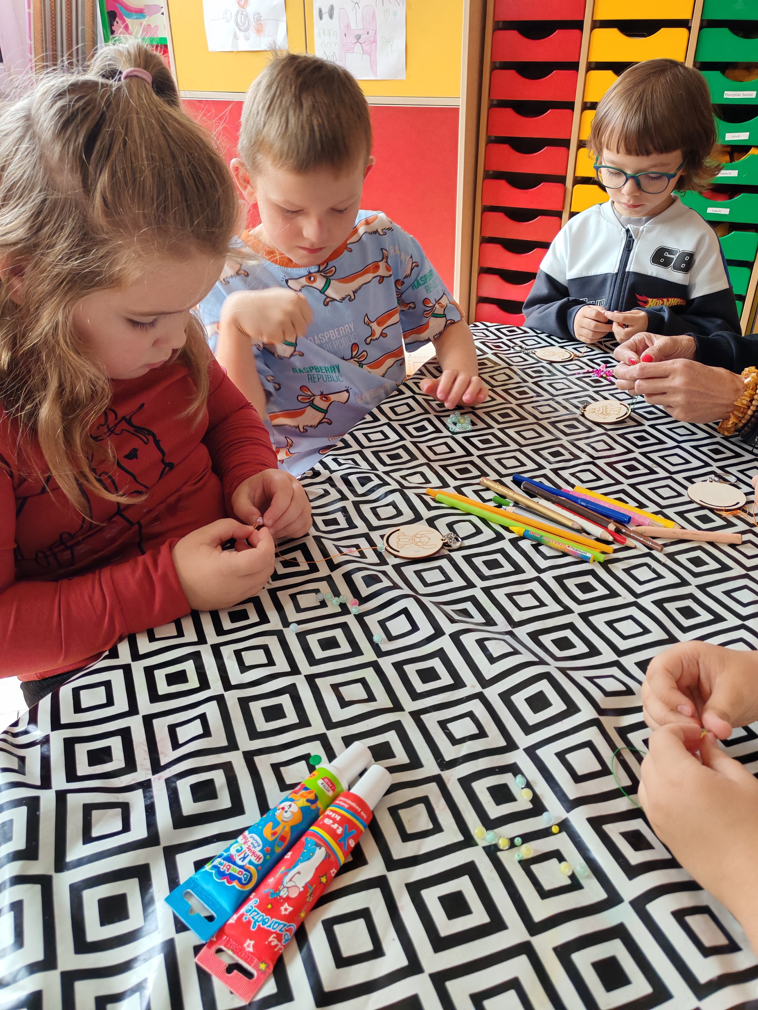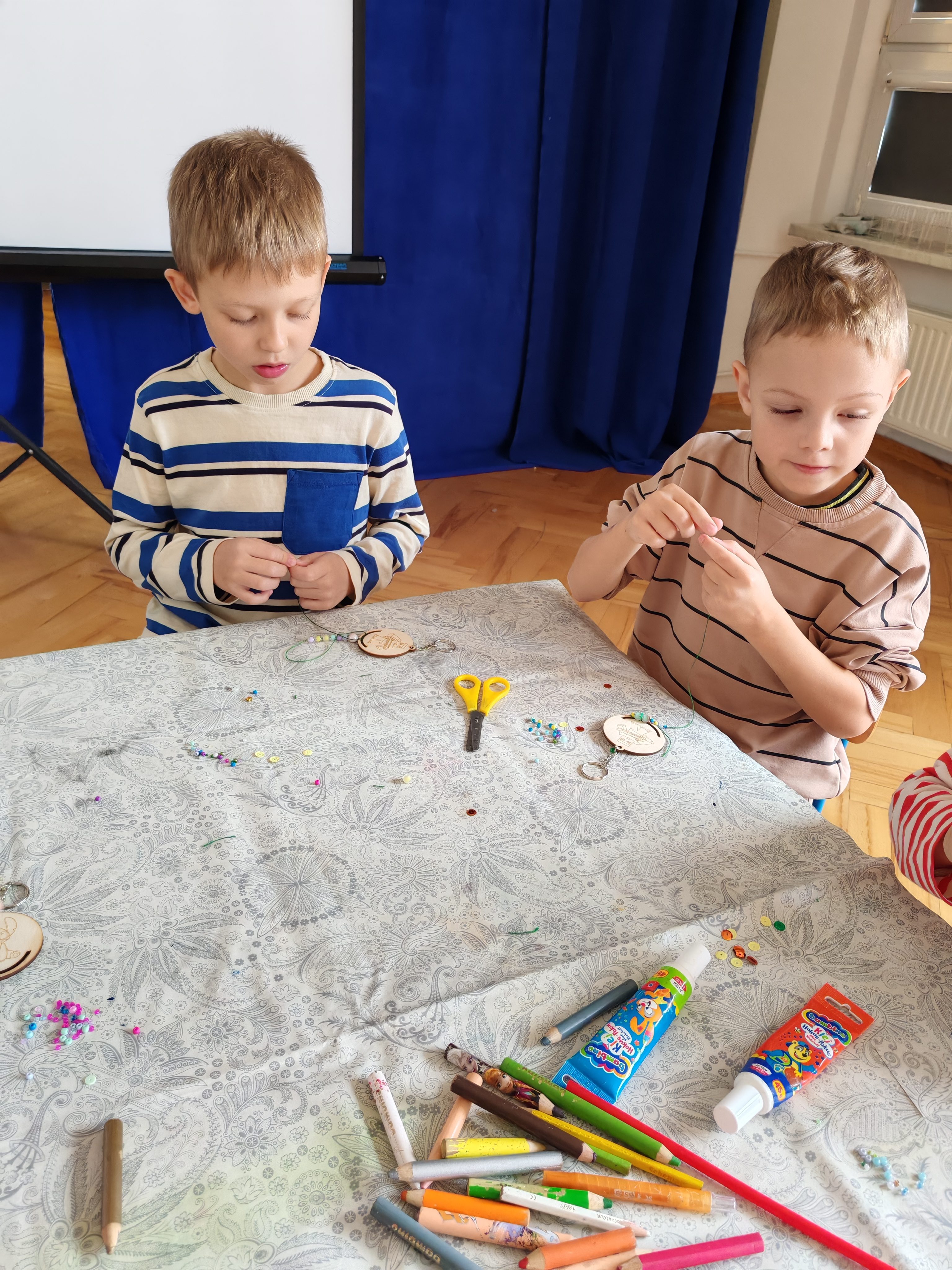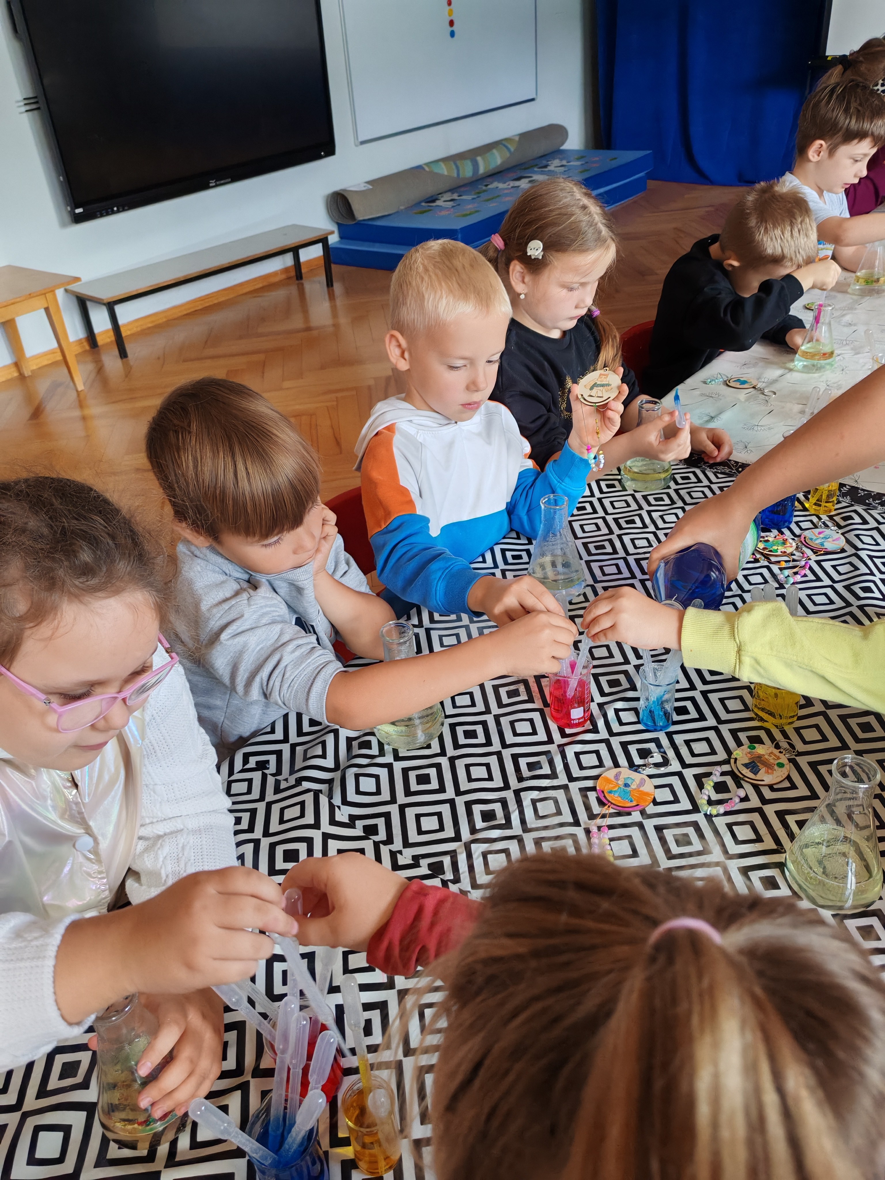 Z okazji Dnia Chłopaka odbyły się zajęcia z Atomem. Dzieci wykonały breloczki z ulubionymi postaciami: malowały, nawlekały koraliki. Następnie ulubione przez dzieci eksperymentowanie, mieszanie płynów, kolorów. Dużo dobrej zabawy.