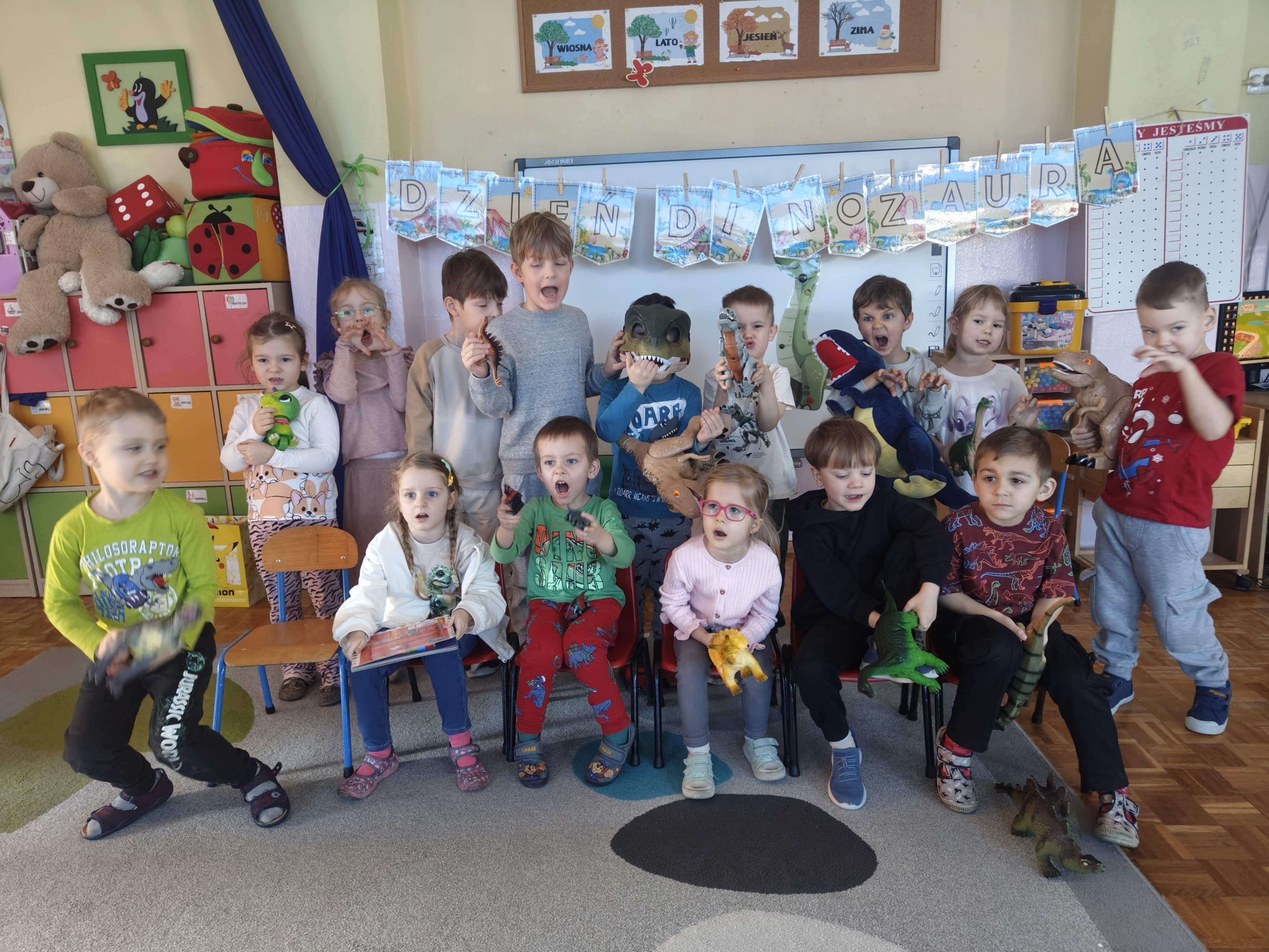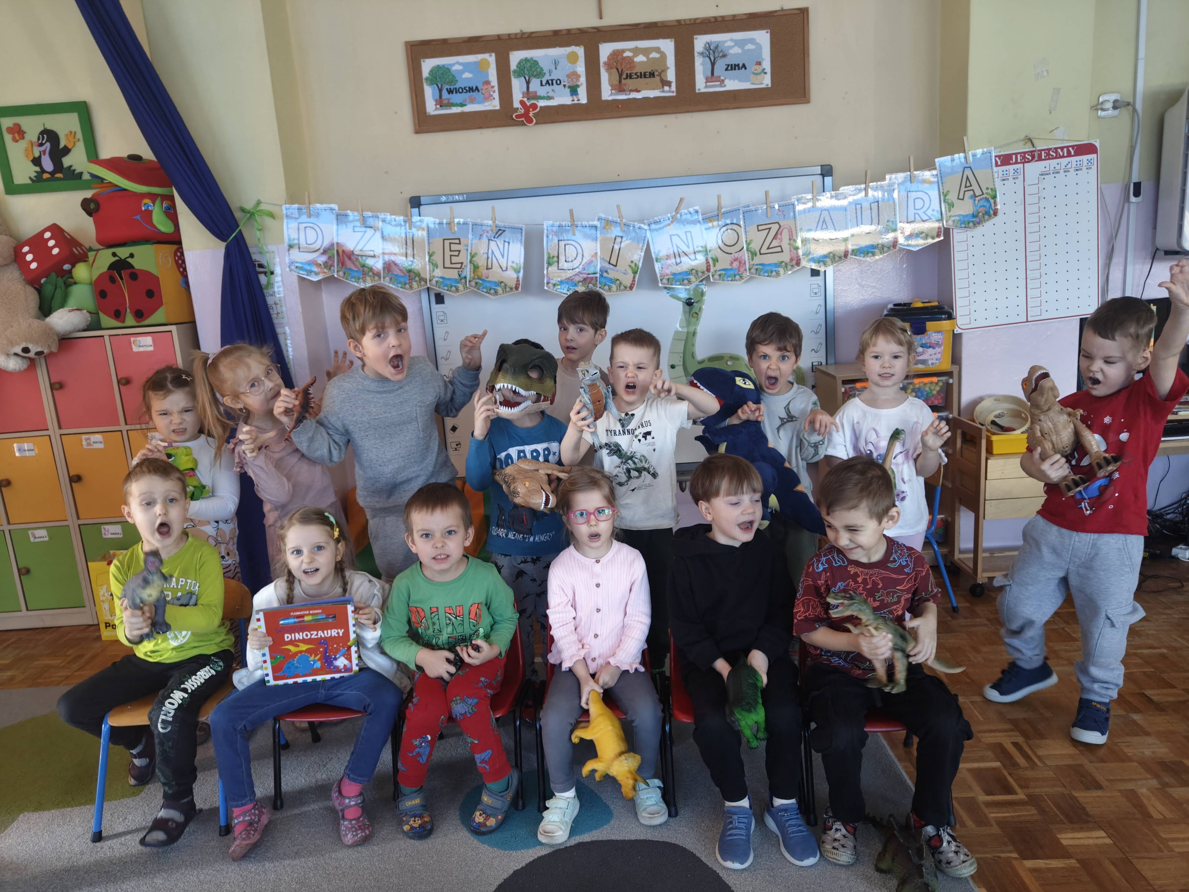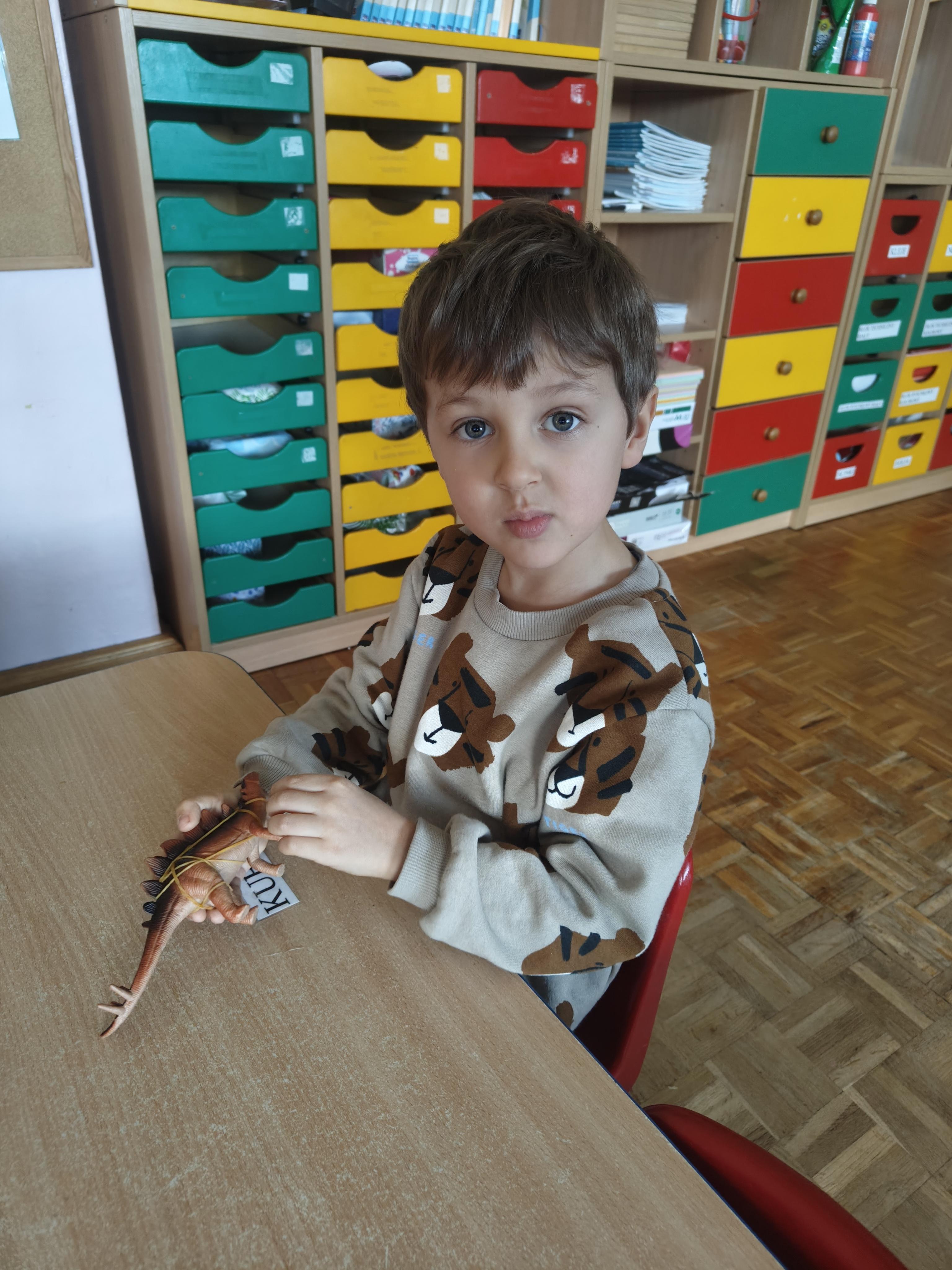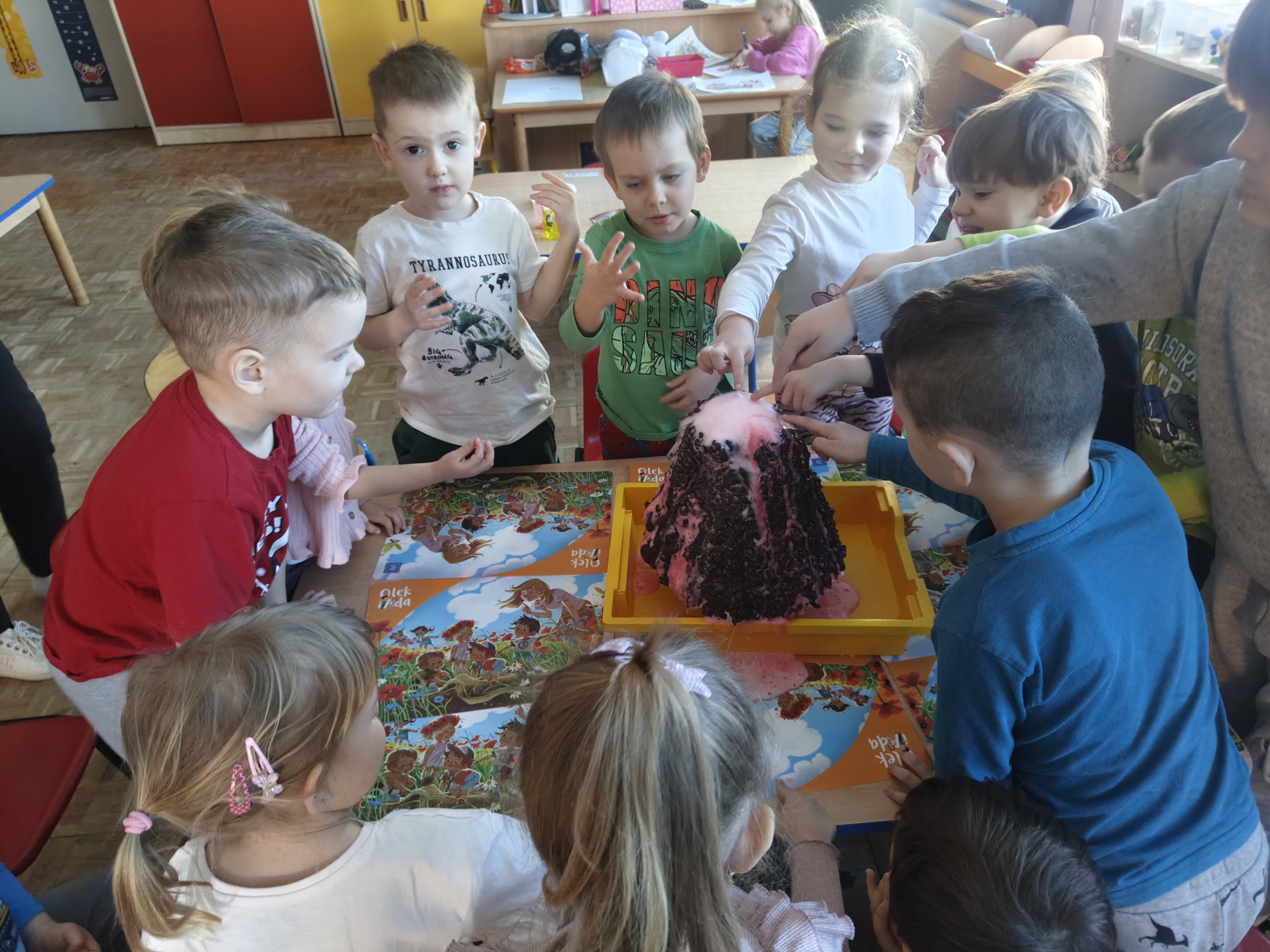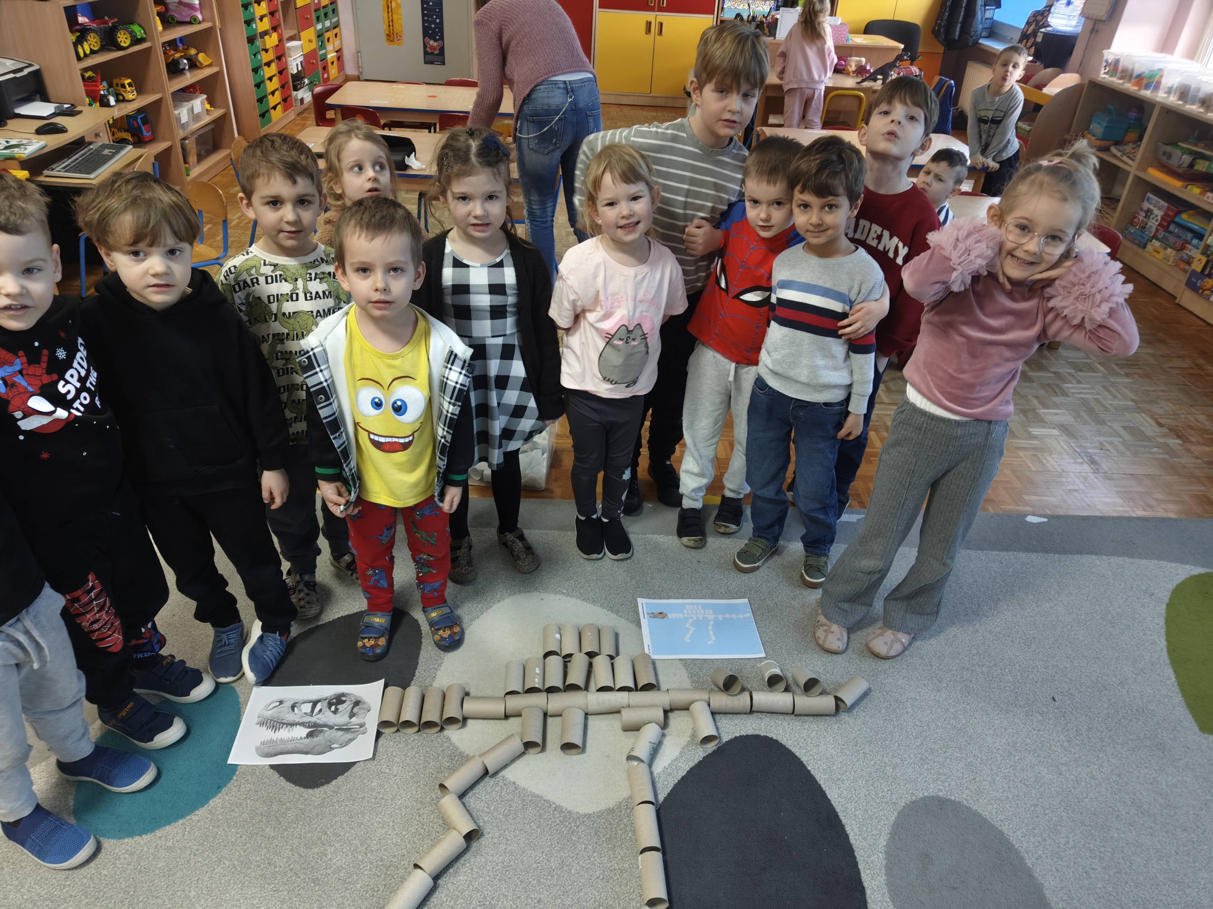 Pszczółki przeniosły się do prehistorycznego świata dinozaurów! Podczas zajęć mali odkrywcy budowali szkielety dinozaurów, poznając przy tym części ich ciała . Każdy mógł poczuć się jak prawdziwy paleontolog, składając kości w całość i odkrywając, jak wyglądały te niezwykłe stworzenia miliony lat temu. Rozmawialiśmy również o różnych gatunkach dinozaurów – takich jak Tyranozaur, Triceratops czy Brachiozaur – i uczyliśmy się ich nazw. Największą atrakcją dnia był oczywiście wybuch wulkanu! To widowiskowe doświadczenie wzbudziło ogromne emocje i zachwyt wśród dzieci. To był dzień pełen nauki, zabawy i niezapomnianych wrażeń!