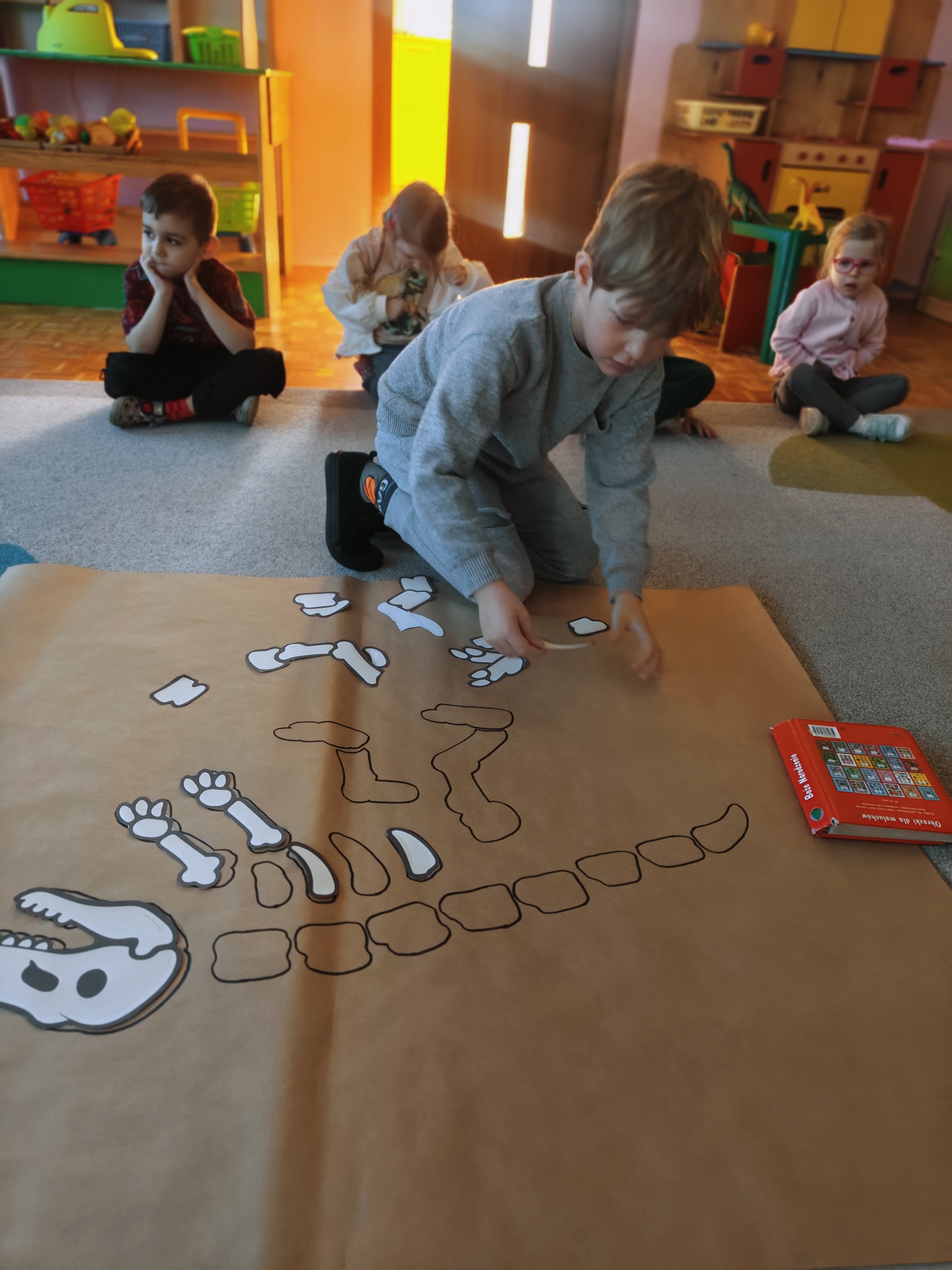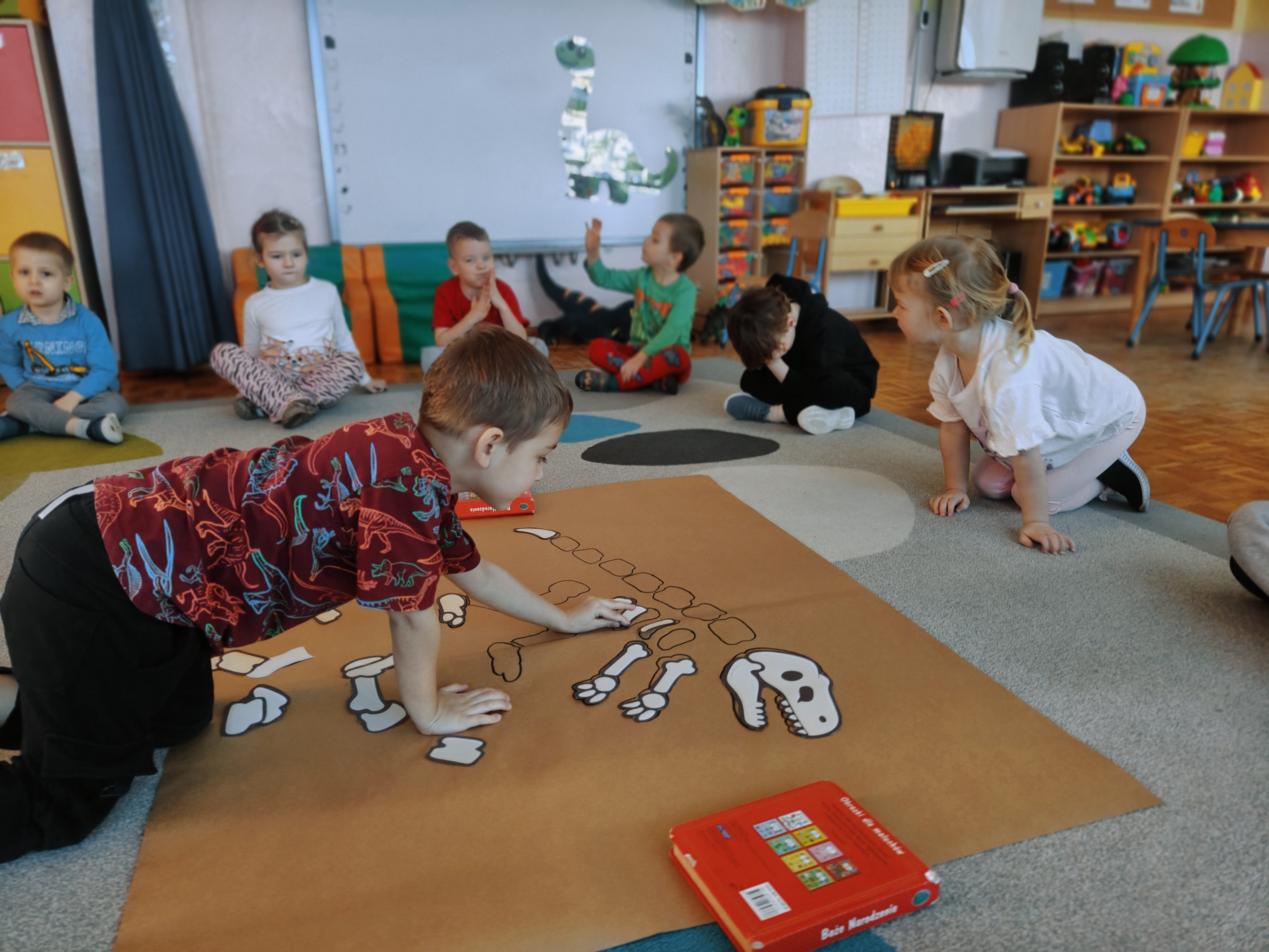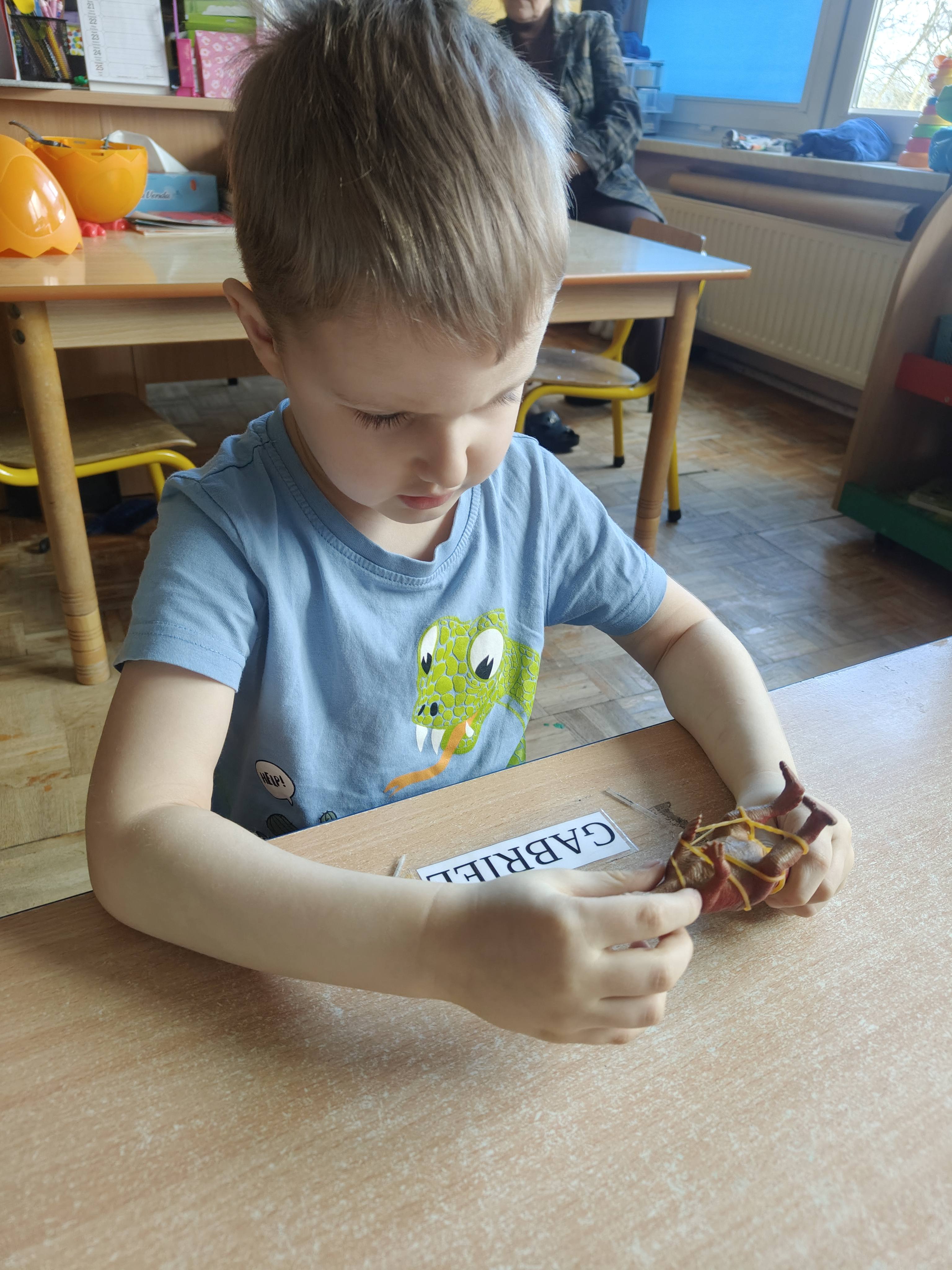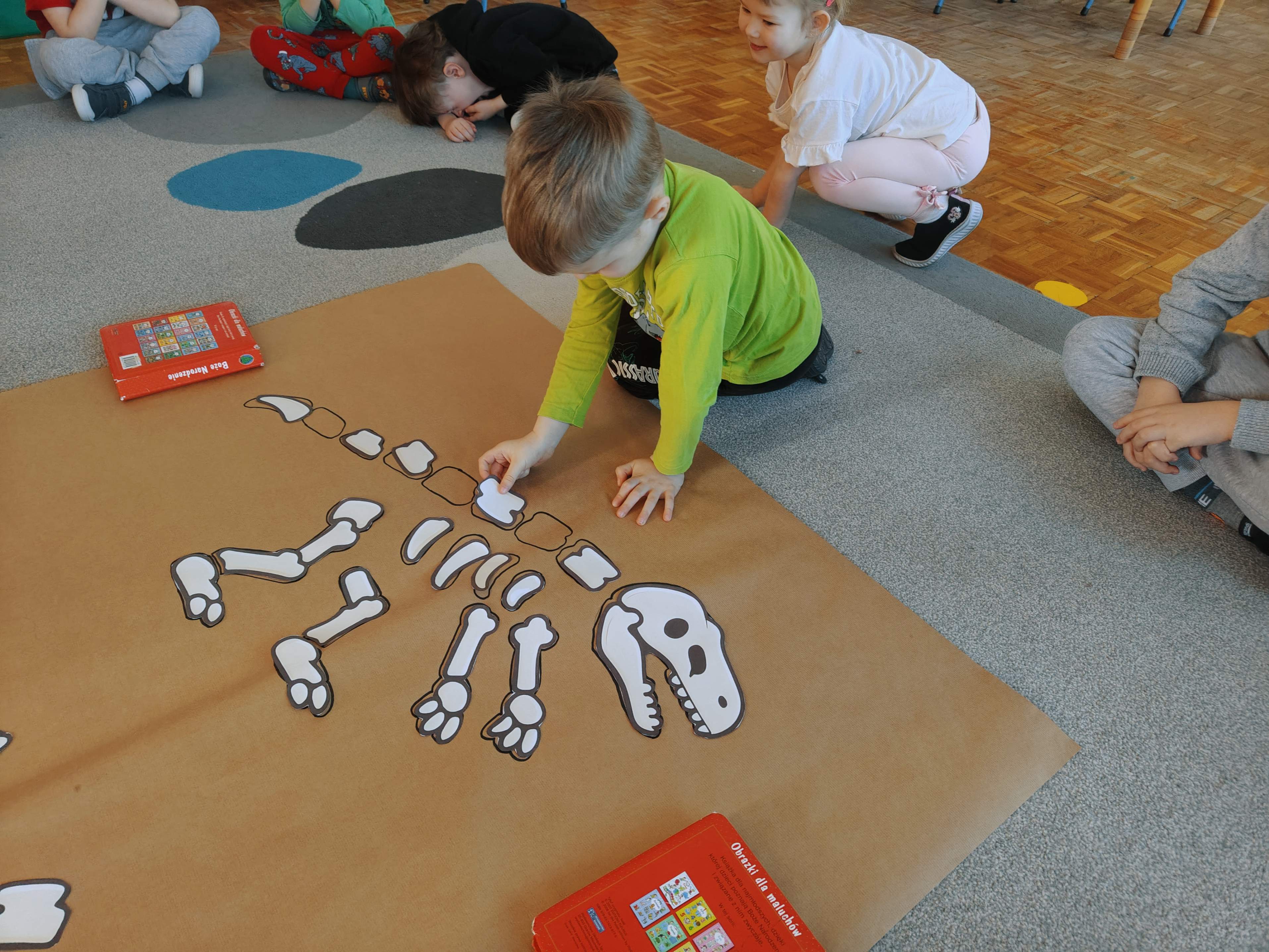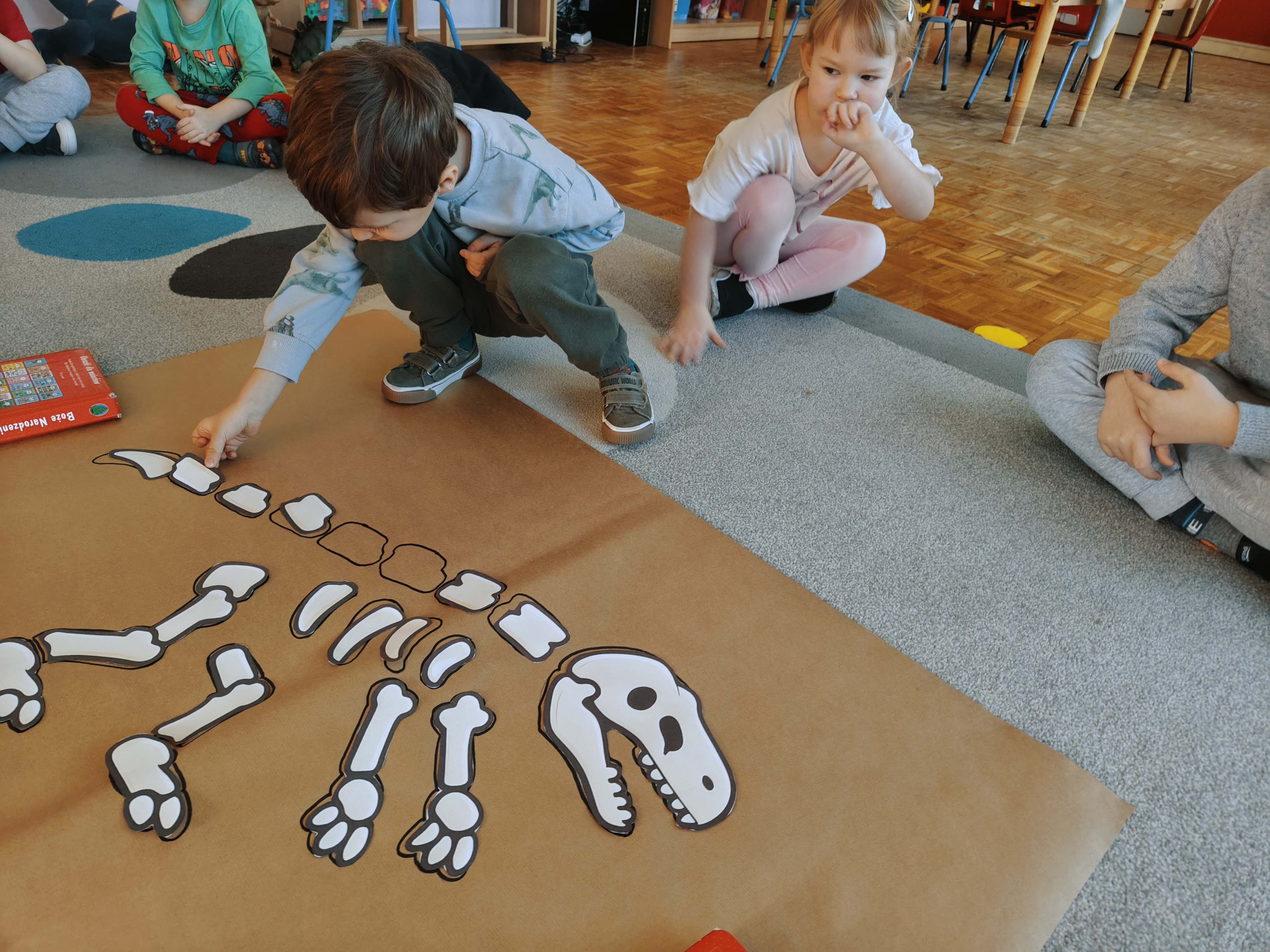 Pszczółki przeniosły się do prehistorycznego świata dinozaurów! Podczas zajęć mali odkrywcy budowali szkielety dinozaurów, poznając przy tym części ich ciała . Każdy mógł poczuć się jak prawdziwy paleontolog, składając kości w całość i odkrywając, jak wyglądały te niezwykłe stworzenia miliony lat temu. Rozmawialiśmy również o różnych gatunkach dinozaurów – takich jak Tyranozaur, Triceratops czy Brachiozaur – i uczyliśmy się ich nazw. Największą atrakcją dnia był oczywiście wybuch wulkanu! To widowiskowe doświadczenie wzbudziło ogromne emocje i zachwyt wśród dzieci. To był dzień pełen nauki, zabawy i niezapomnianych wrażeń!