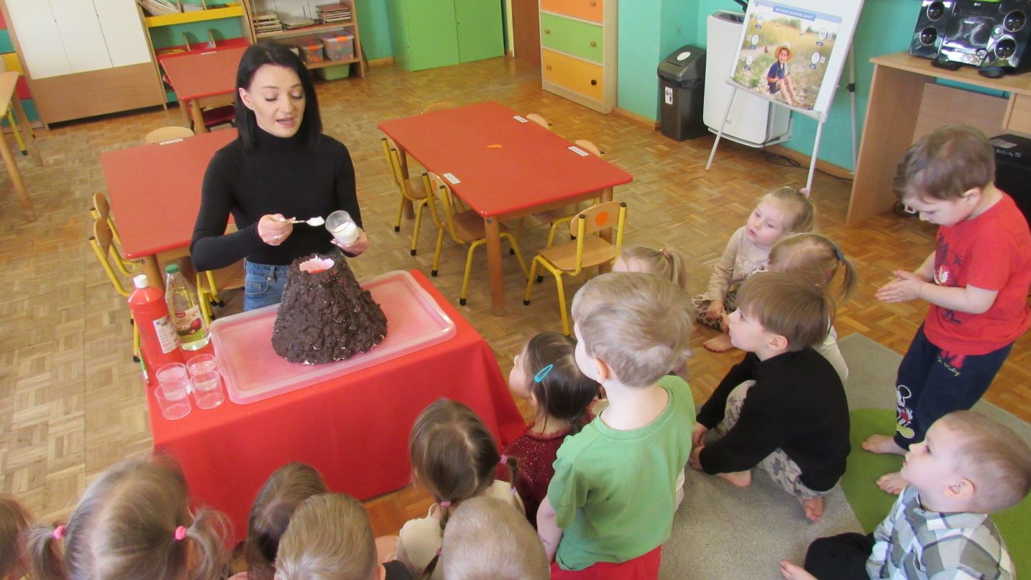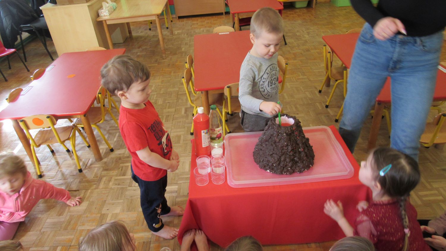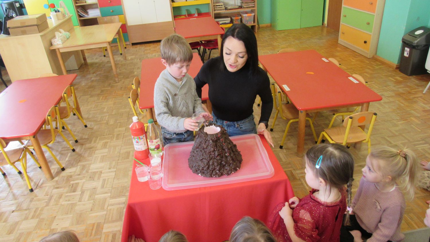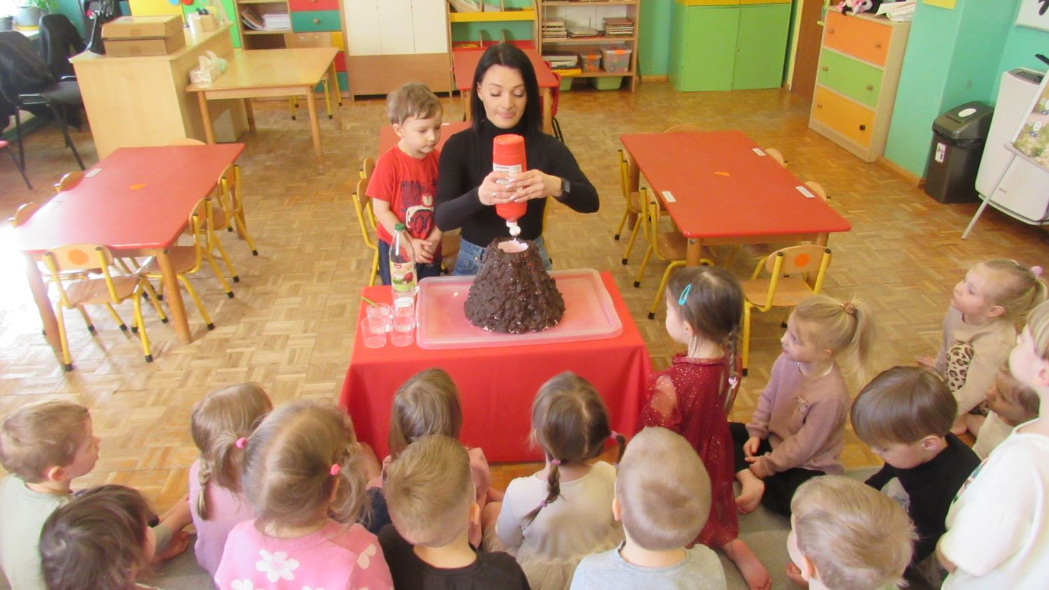 W Tygodnia Małego Naukowca – Chemika na dzieci czekały kolejne doświadczenia. Tym razem przedszkolaki miały okazję poznać różne faktury i konsystencje podczas zabawy z matami sensorycznymi. Dzieci chodziły po nich bosymi stopami, dzięki czemu mogły poczuć różne struktury, miękkie, twarde, gładkie i chropowate. Było to nie tylko świetne doświadczenie sensoryczne, ale także wspaniała zabawa, która wywołała wiele radości i śmiechu. Na zakończenie zajęć mali naukowcy wykonali wspólnie niezwykle efektowny eksperyment – wybuch wulkanu lawy. Dzieci z ogromnym zainteresowaniem obserwowały, jak po dodaniu odpowiednich składników z wulkanu zaczęła wypływać kolorowa „lawa”. Eksperyment wzbudził ogromne emocje i zachwyt wśród przedszkolaków. Dzięki takim doświadczeniom dzieci mogły jeszcze lepiej poczuć się jak prawdziwi mali naukowcy, odkrywać nowe zjawiska oraz przekonać się, że nauka może być fascynującą przygodą pełną niespodzianek.