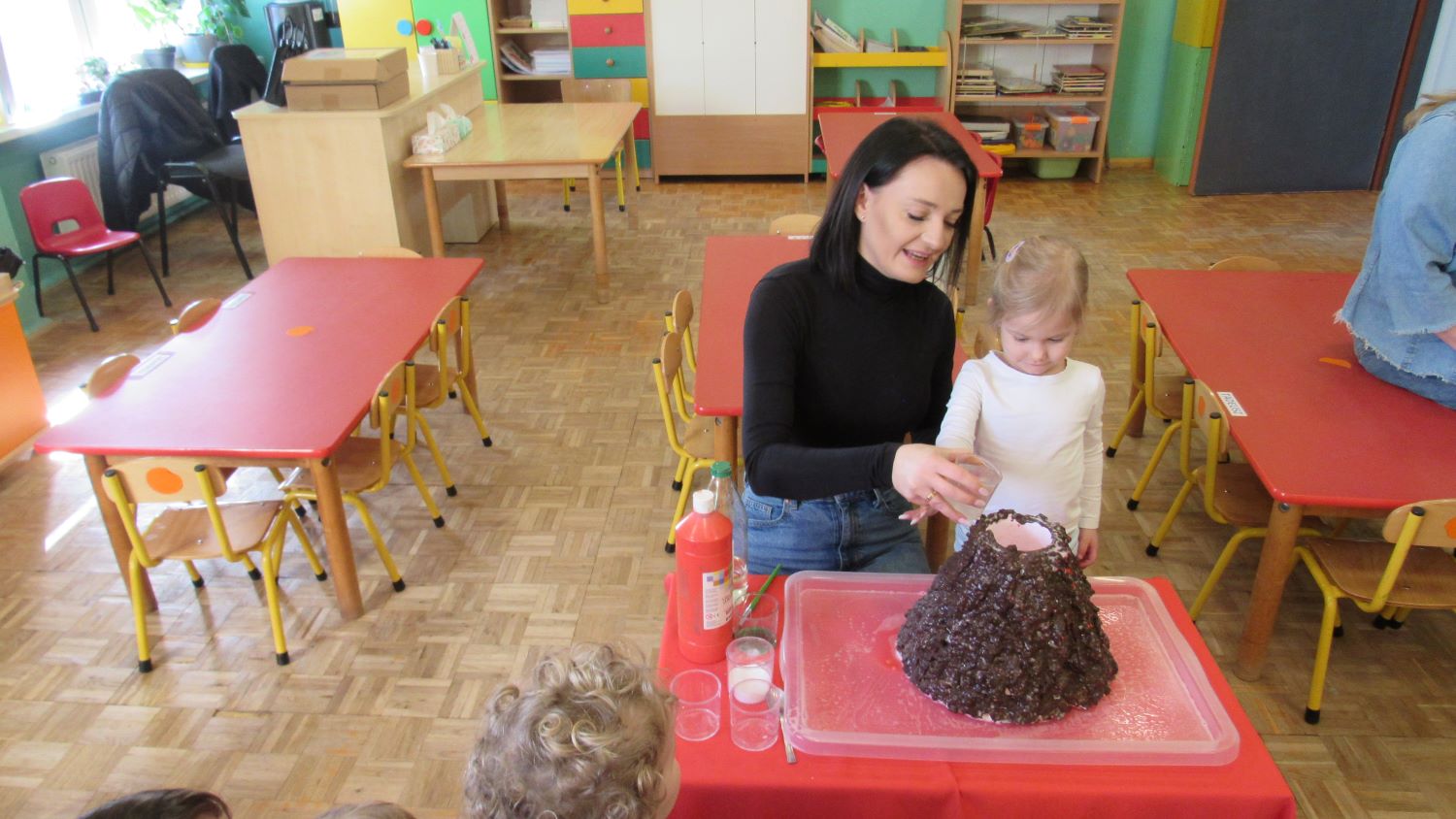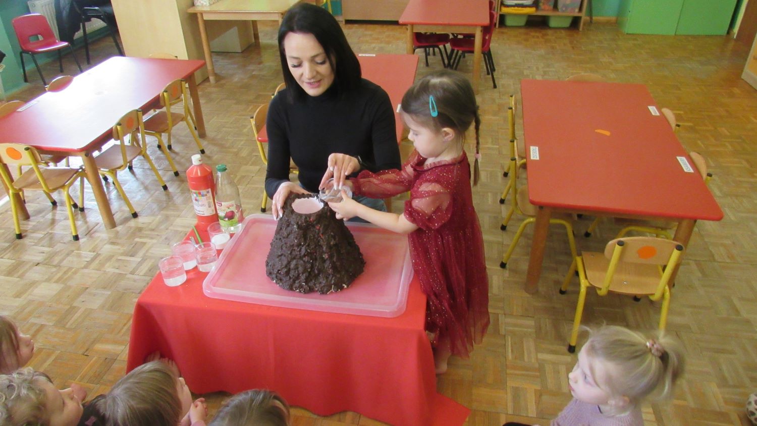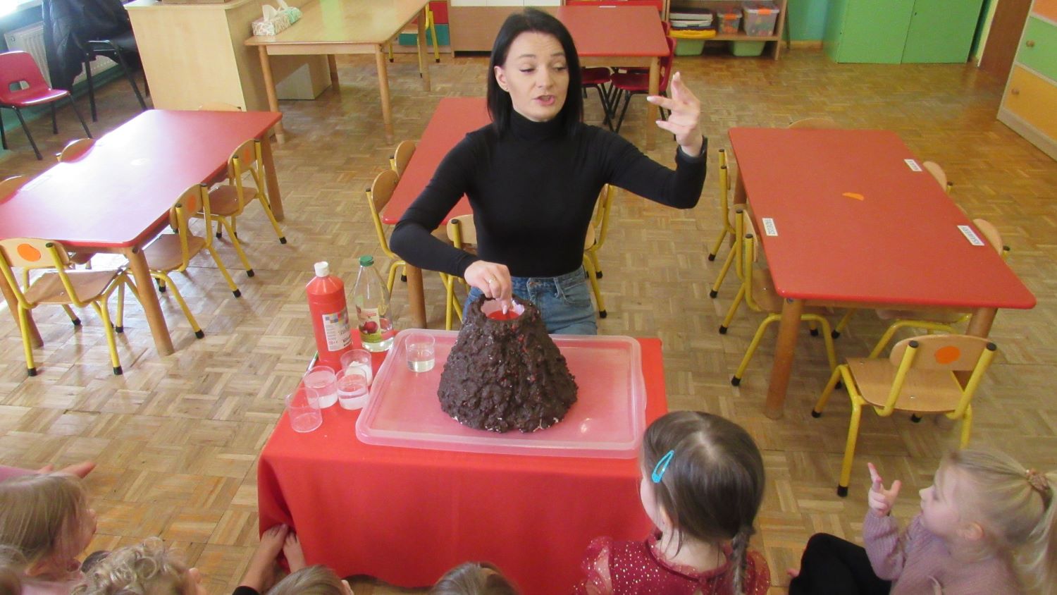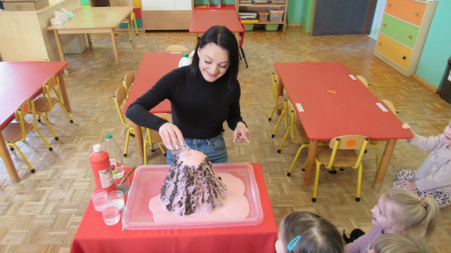 W Tygodnia Małego Naukowca – Chemika na dzieci czekały kolejne doświadczenia. Tym razem przedszkolaki miały okazję poznać różne faktury i konsystencje podczas zabawy z matami sensorycznymi. Dzieci chodziły po nich bosymi stopami, dzięki czemu mogły poczuć różne struktury, miękkie, twarde, gładkie i chropowate. Było to nie tylko świetne doświadczenie sensoryczne, ale także wspaniała zabawa, która wywołała wiele radości i śmiechu. Na zakończenie zajęć mali naukowcy wykonali wspólnie niezwykle efektowny eksperyment – wybuch wulkanu lawy. Dzieci z ogromnym zainteresowaniem obserwowały, jak po dodaniu odpowiednich składników z wulkanu zaczęła wypływać kolorowa „lawa”. Eksperyment wzbudził ogromne emocje i zachwyt wśród przedszkolaków. Dzięki takim doświadczeniom dzieci mogły jeszcze lepiej poczuć się jak prawdziwi mali naukowcy, odkrywać nowe zjawiska oraz przekonać się, że nauka może być fascynującą przygodą pełną niespodzianek.