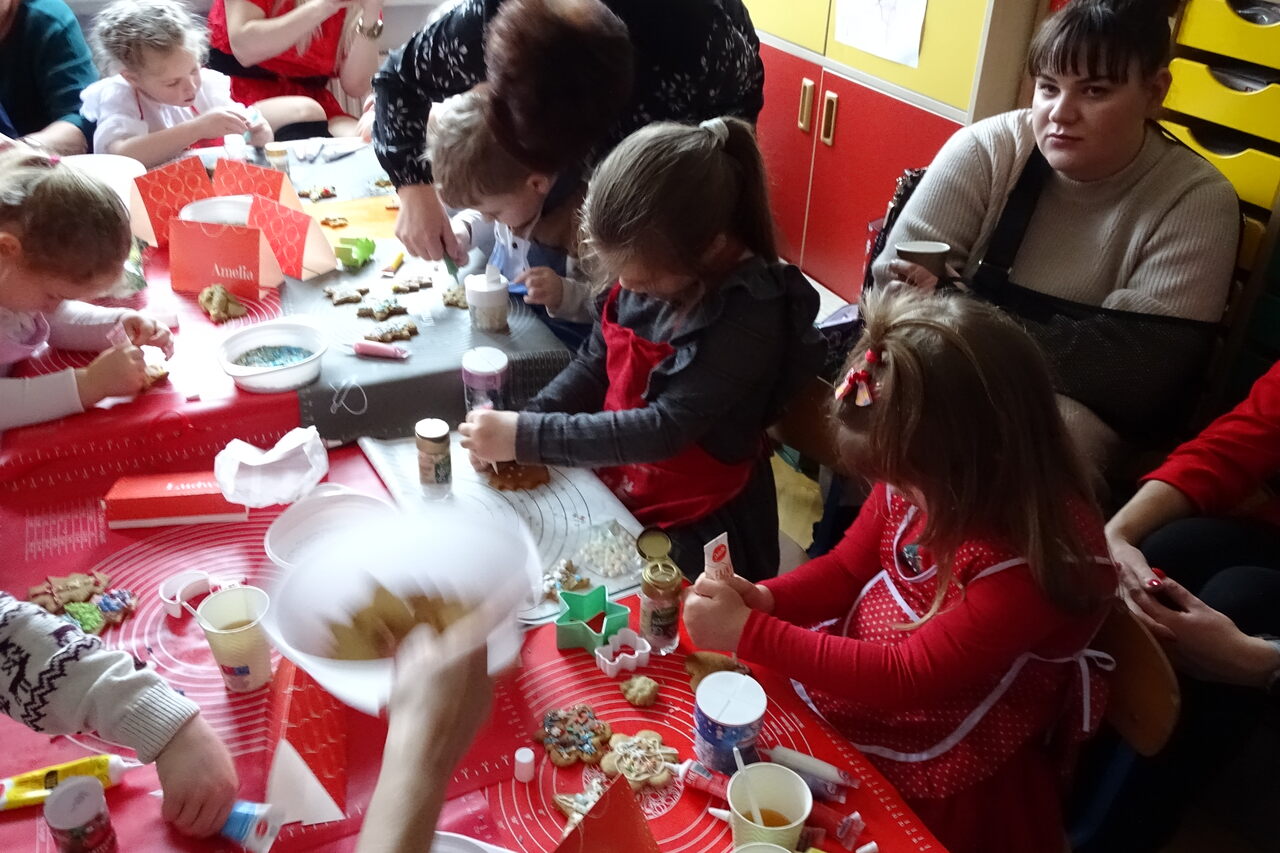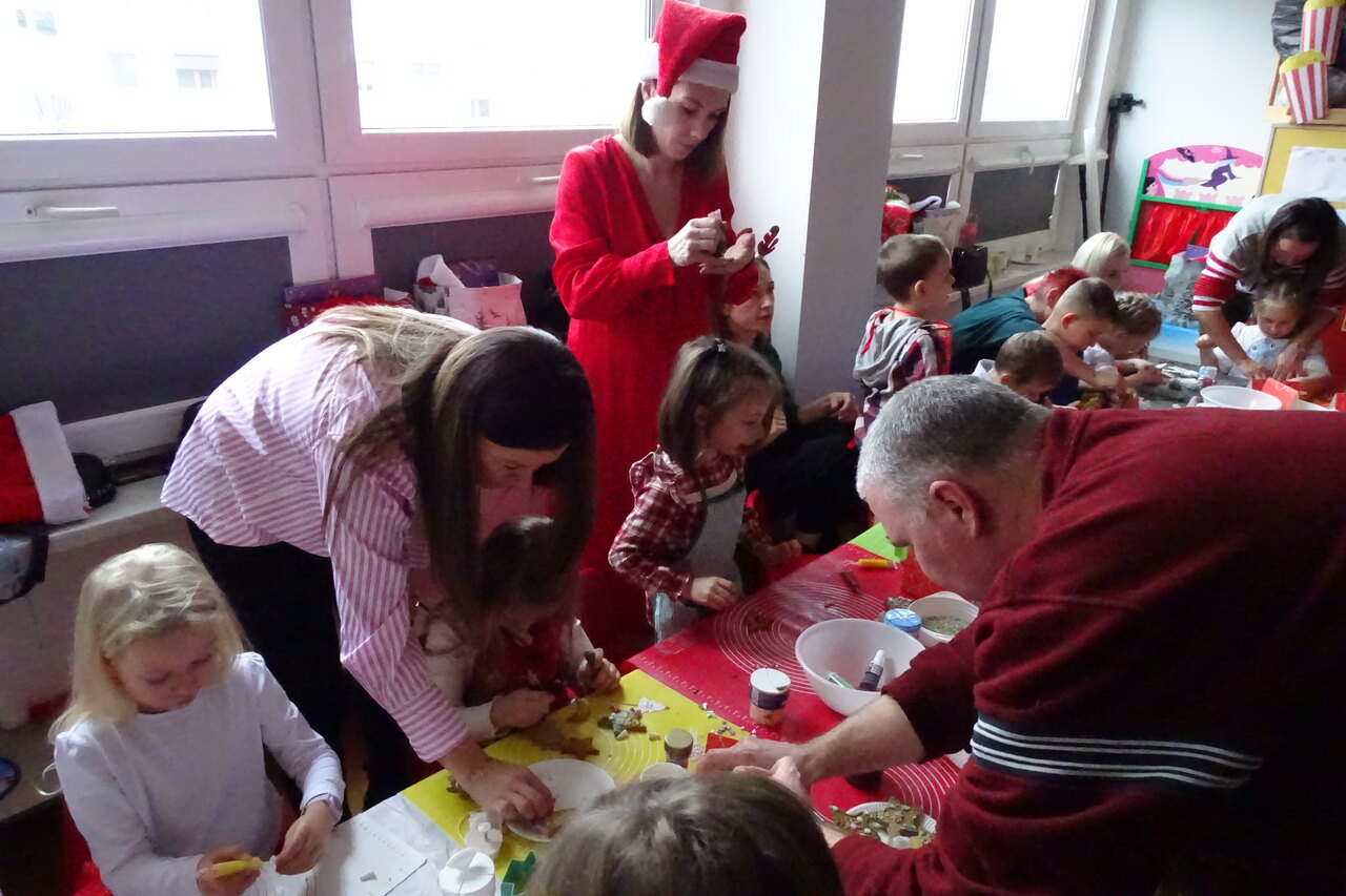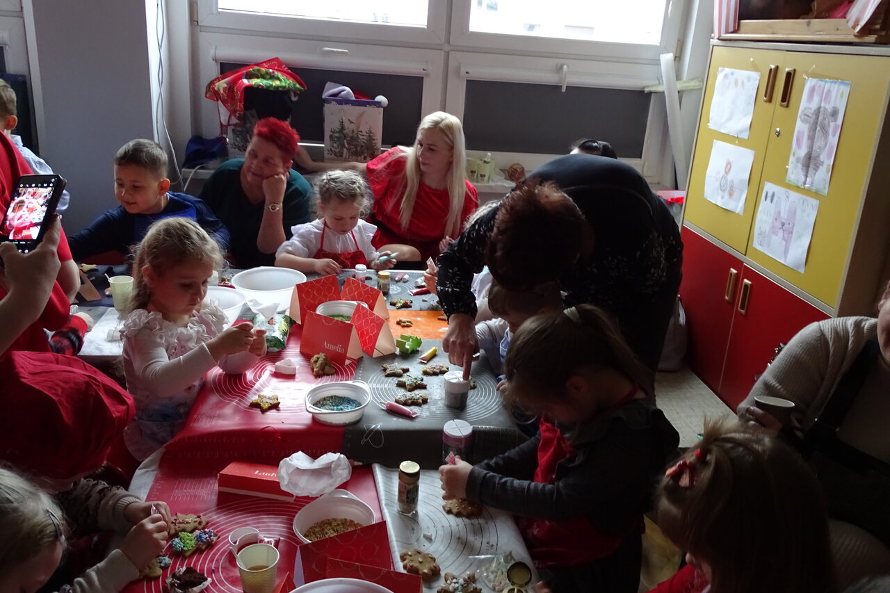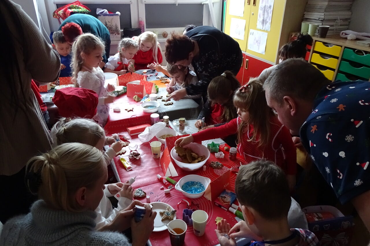 W piątek 05 grudnia w grupie Sówki odbyło się spotkanie Mikołajkowe z rodzicami. Dzieci zaprezentowały rodzicom montaż słowno – muzyczny o tematyce świątecznej oraz zebrały się wraz z rodzicami, aby udekorować świąteczne pierniczki. Na stołach pojawił się kolorowy lukier, czekolada, rysiki dekoracyjne oraz pisaki cukrowe, które królowały podczas dekorowania pierników. W tle słychać było świąteczne piosenki oraz kolędy, a w sali panowała ciepła i świąteczna atmosfera. Na zakończenie odwiedził dzieci Mikołaj i obdarował je pięknymi prezentami.