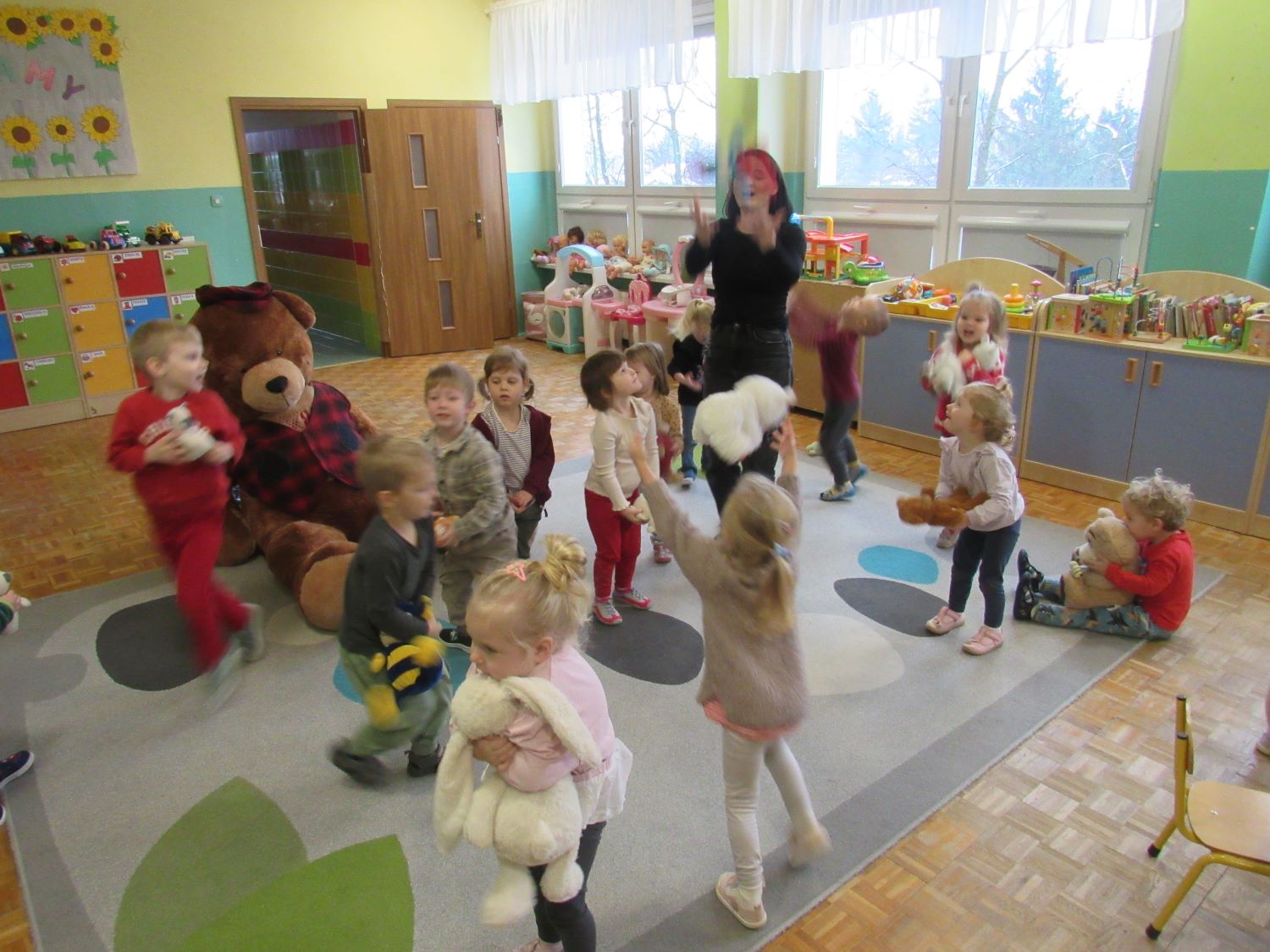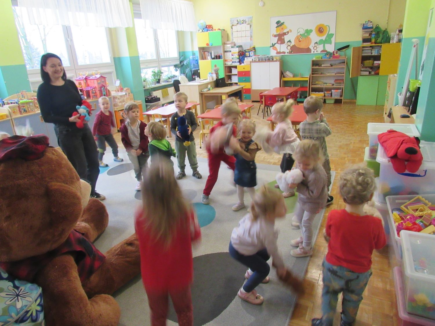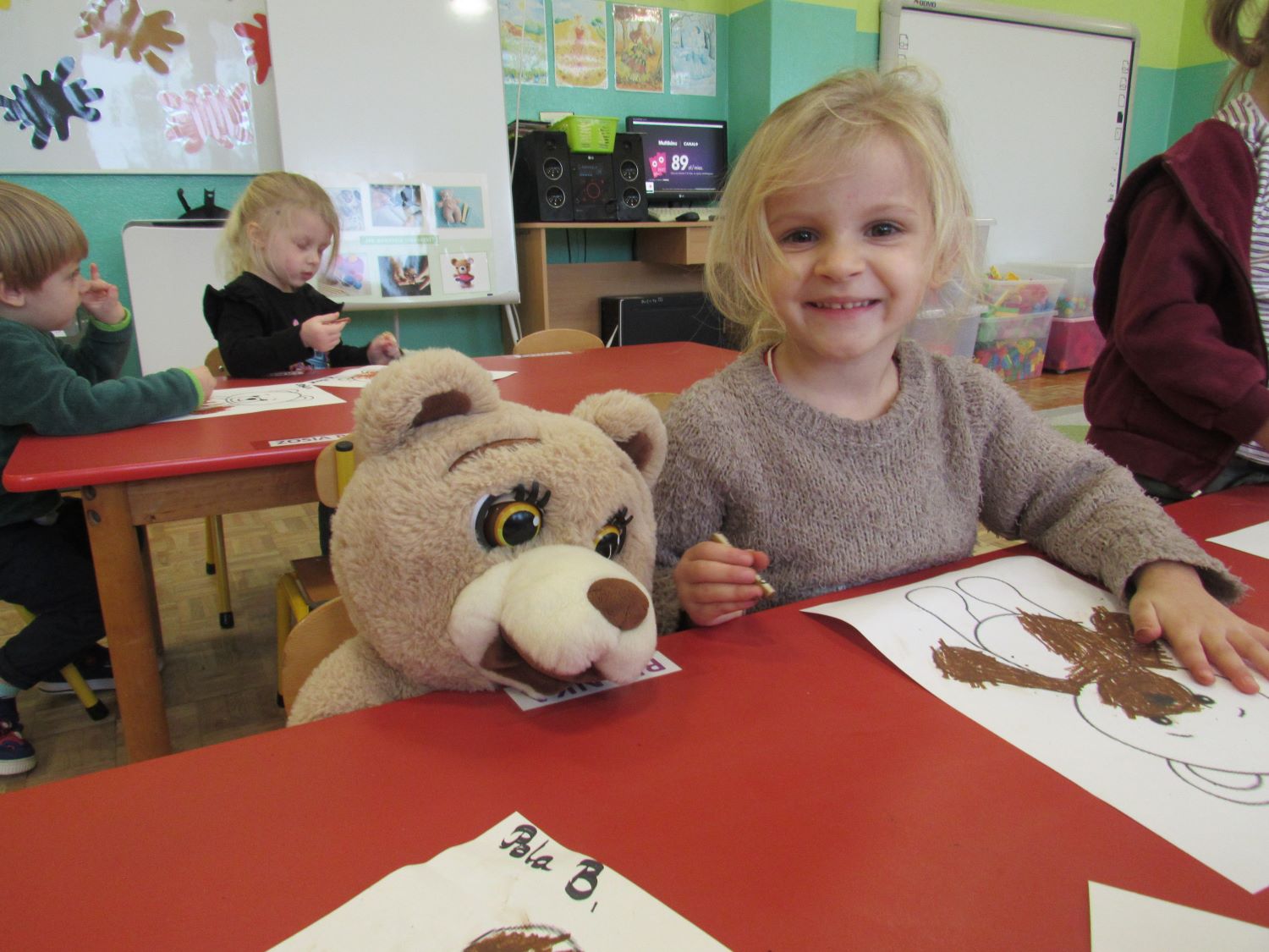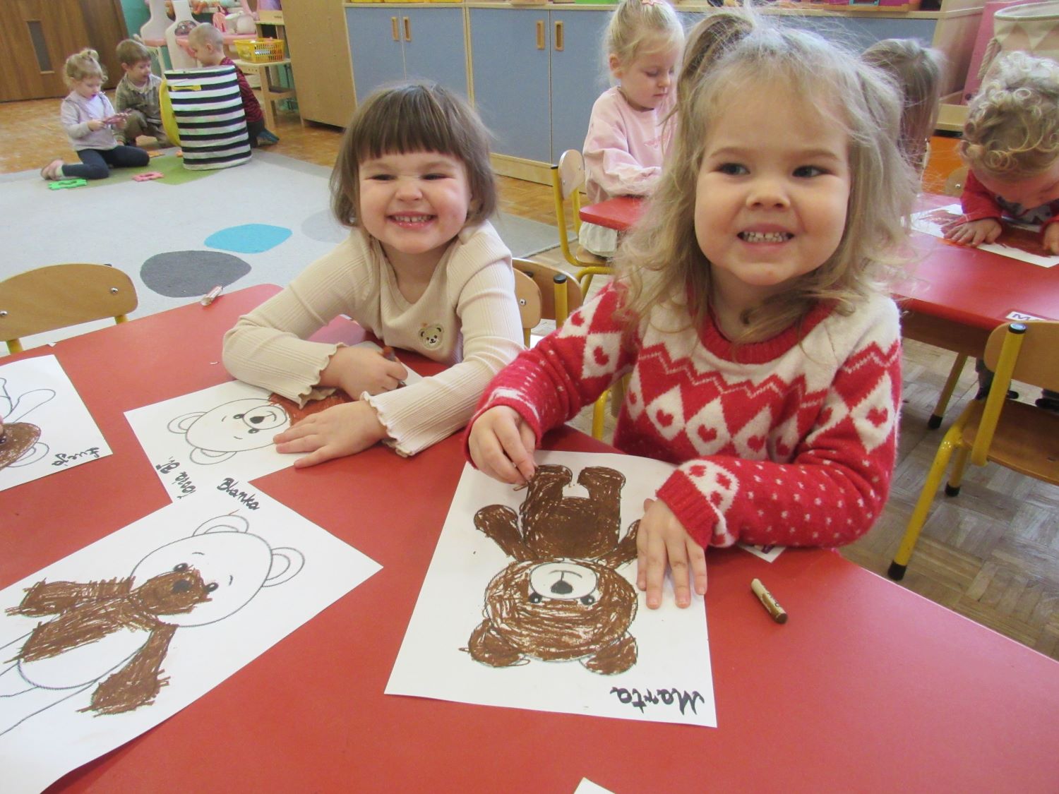 W naszym przedszkolu odbył się radosny Dzień Pluszowego Misia, który przyniósł dzieciom wiele uśmiechu i wspaniałej zabawy. Przedszkolaki przyszły tego dnia ze swoimi ukochanymi pluszakami, a misie towarzyszyły im we wszystkich aktywnościach. Na początku dzieci bawiły się ze swoimi misiami i tańczyły w kółeczku, trzymając je za łapki i śpiewając wesołe piosenki. Następnie brały udział w zabawie, podczas której karmiły misia „miodkiem” rzucając piłeczką do celu, ćwicząc celność i koordynację. Kolejnym punktem dnia było oglądanie bajki „Miś Uszatek”, która wprowadziła wszystkich w ciepły, bajkowy nastrój. Na zakończenie dzieci wykonały pracę plastyczną – kolorowały sylwetę misia, tworząc piękne i kolorowe obrazki, które ozdobiły przedszkolną galerię.
