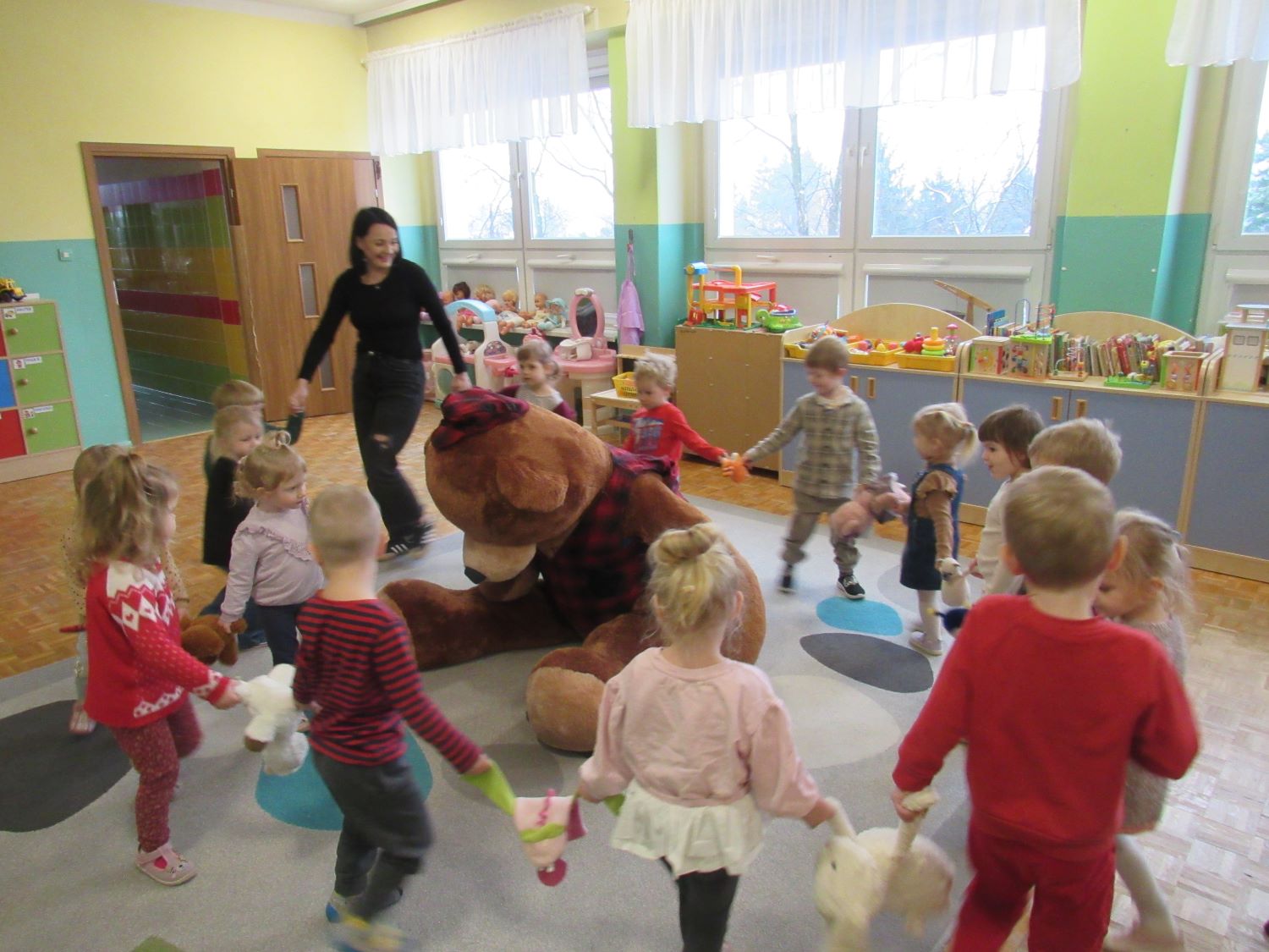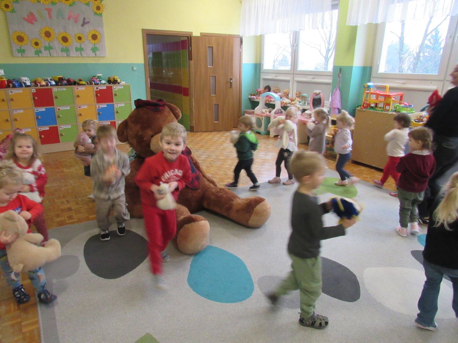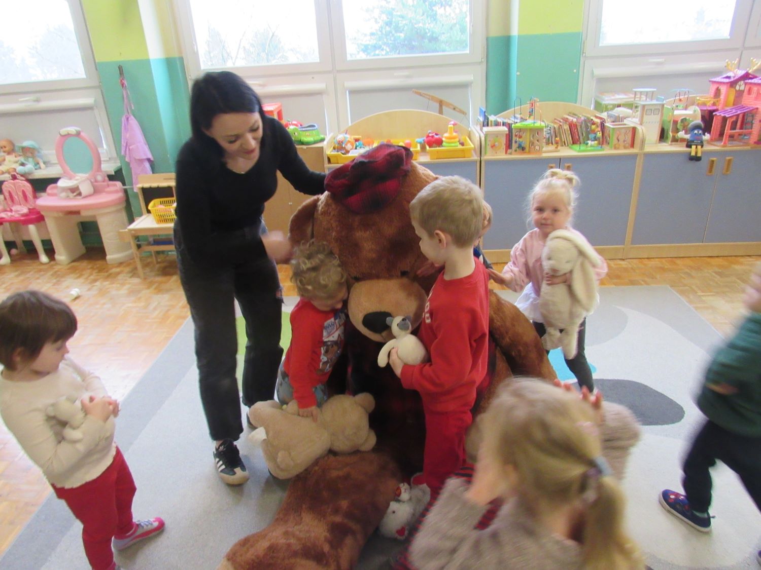 W naszym przedszkolu odbył się radosny Dzień Pluszowego Misia, który przyniósł dzieciom wiele uśmiechu i wspaniałej zabawy. Przedszkolaki przyszły tego dnia ze swoimi ukochanymi pluszakami, a misie towarzyszyły im we wszystkich aktywnościach. Na początku dzieci bawiły się ze swoimi misiami i tańczyły w kółeczku, trzymając je za łapki i śpiewając wesołe piosenki. Następnie brały udział w zabawie, podczas której karmiły misia „miodkiem” rzucając piłeczką do celu, ćwicząc celność i koordynację. Kolejnym punktem dnia było oglądanie bajki „Miś Uszatek”, która wprowadziła wszystkich w ciepły, bajkowy nastrój. Na zakończenie dzieci wykonały pracę plastyczną – kolorowały sylwetę misia, tworząc piękne i kolorowe obrazki, które ozdobiły przedszkolną galerię.