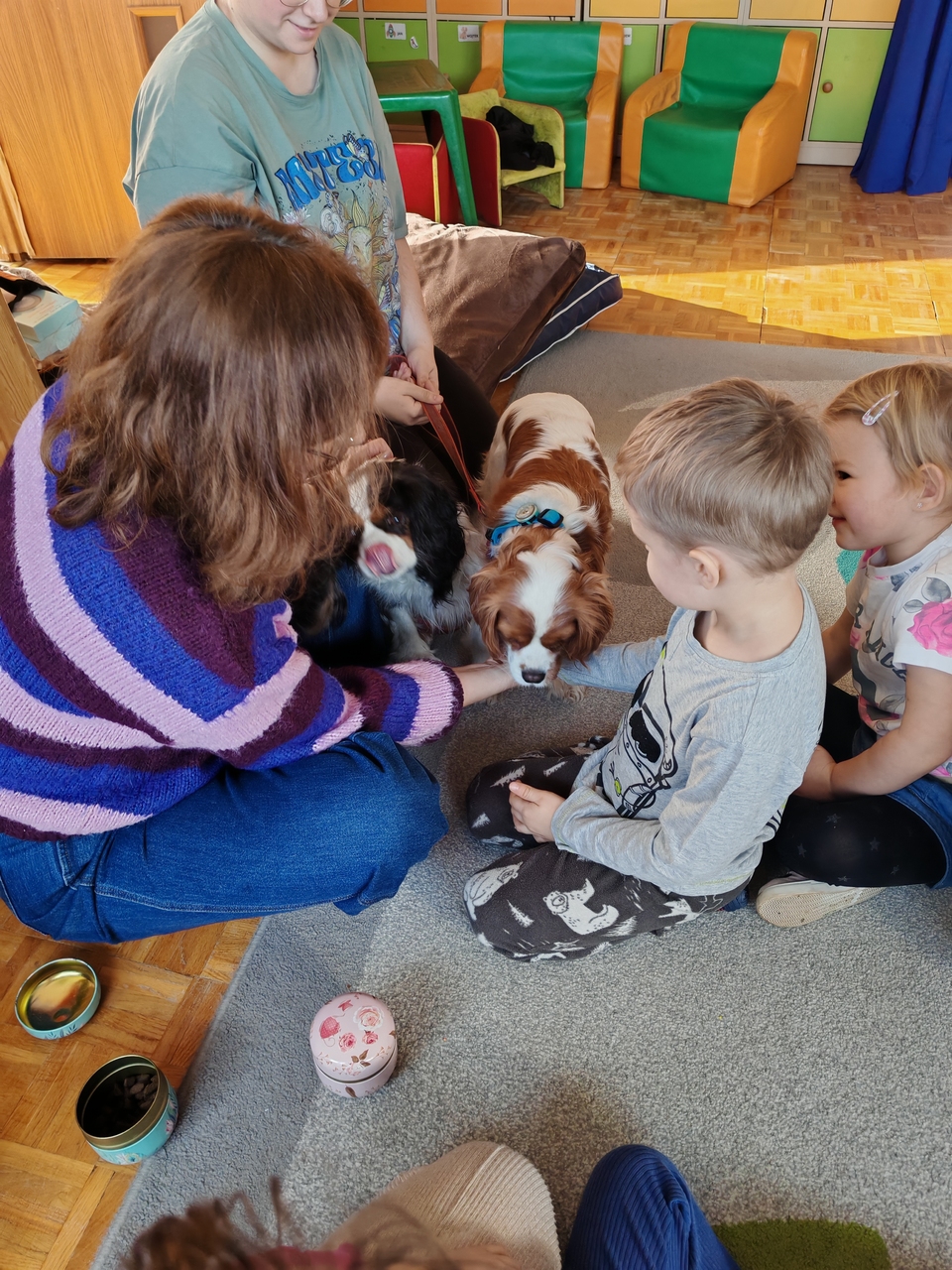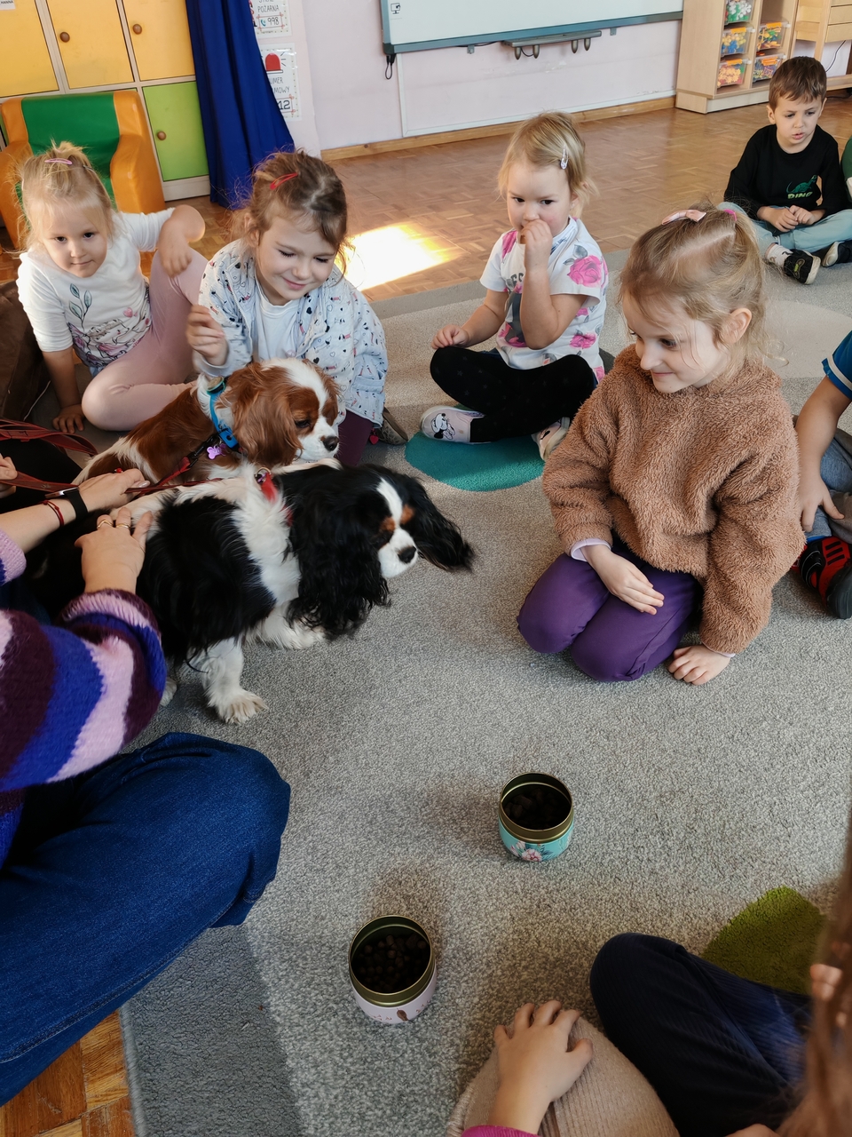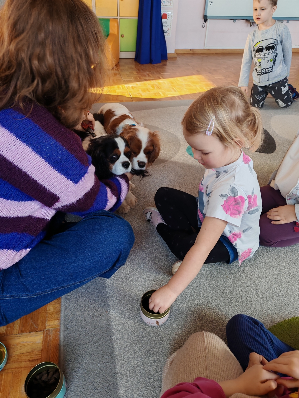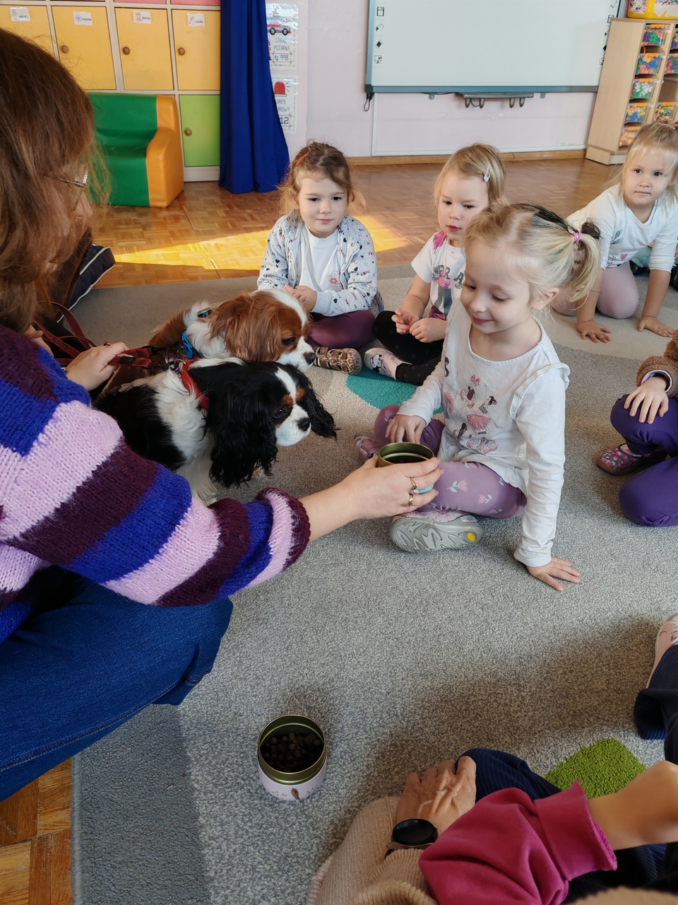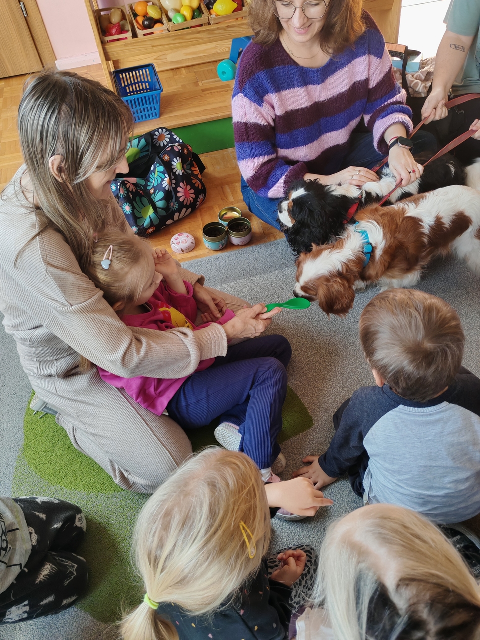 Pszczółki miały dzisiaj bardzo miłe spotkanie, odwiedziły je Pani Magdalenie Nowak, z córką Basią oraz ze swoimi pieskami rasy Cavalier King Charles Spaniel. Dzieci dowiedziały się jak opiekować się pieskami, co jest potrzebne do ich pielęgnacji, a także jakie umiejętności mają pieski. Miały również okazję nakarmić małych gości smakołykami.