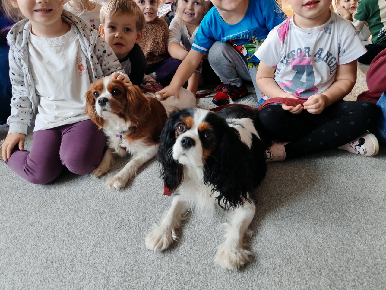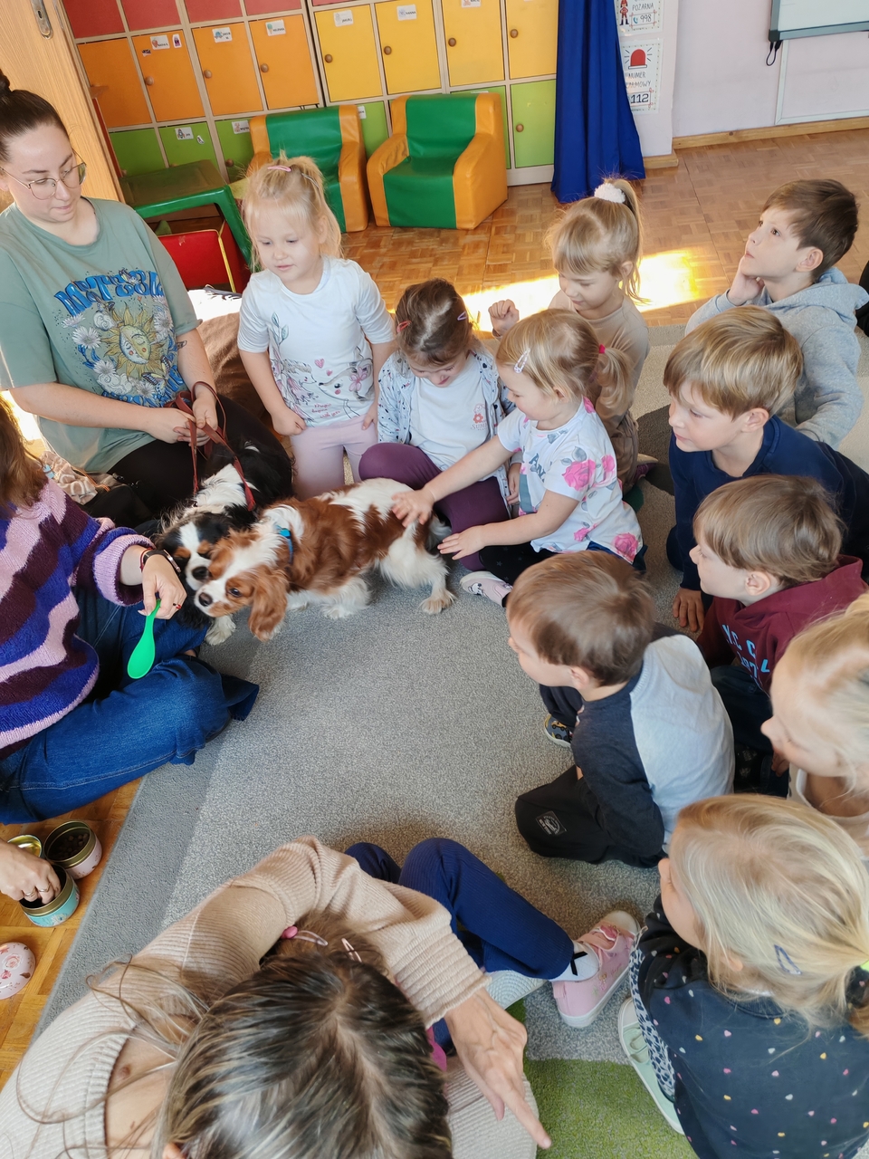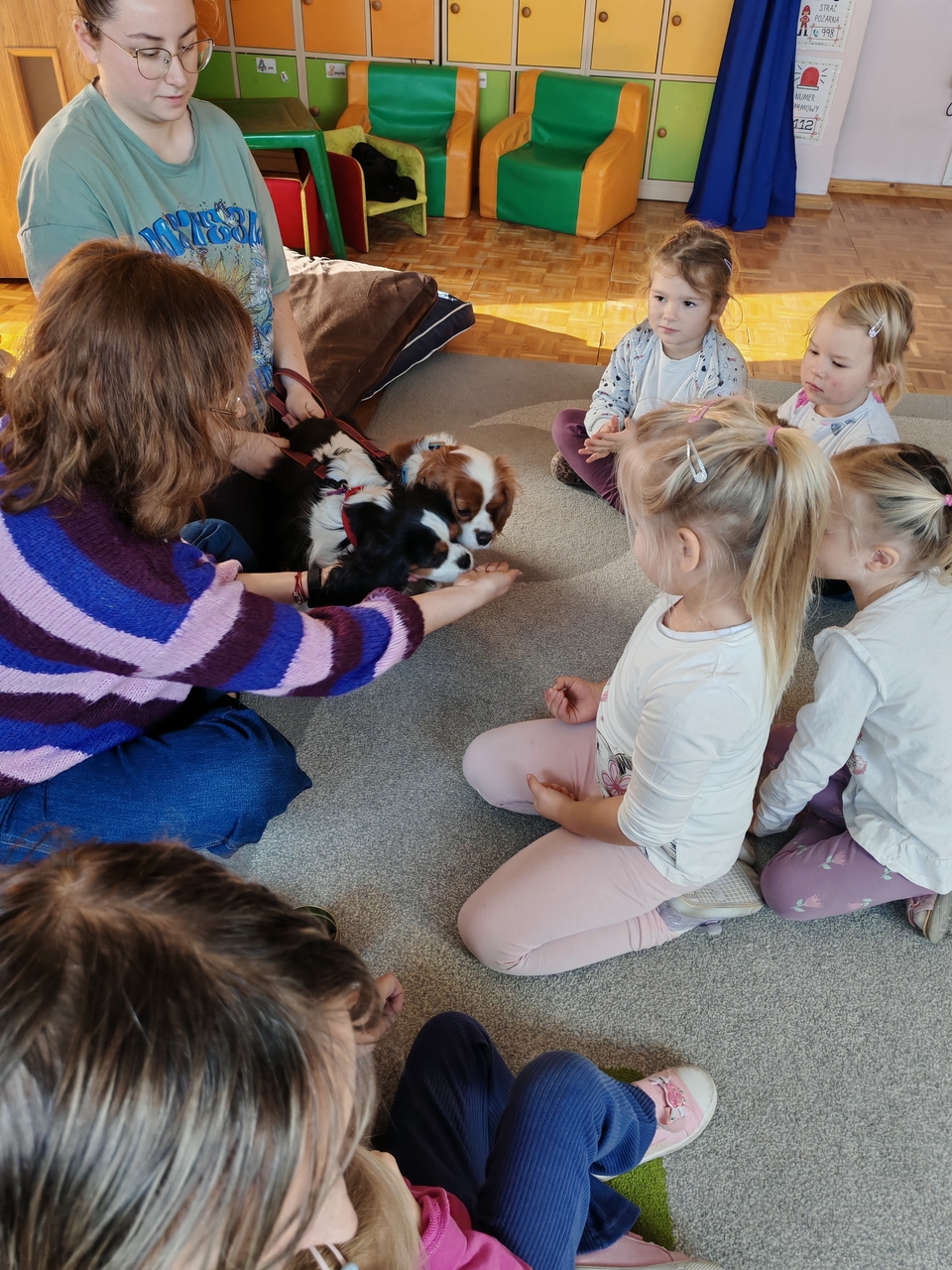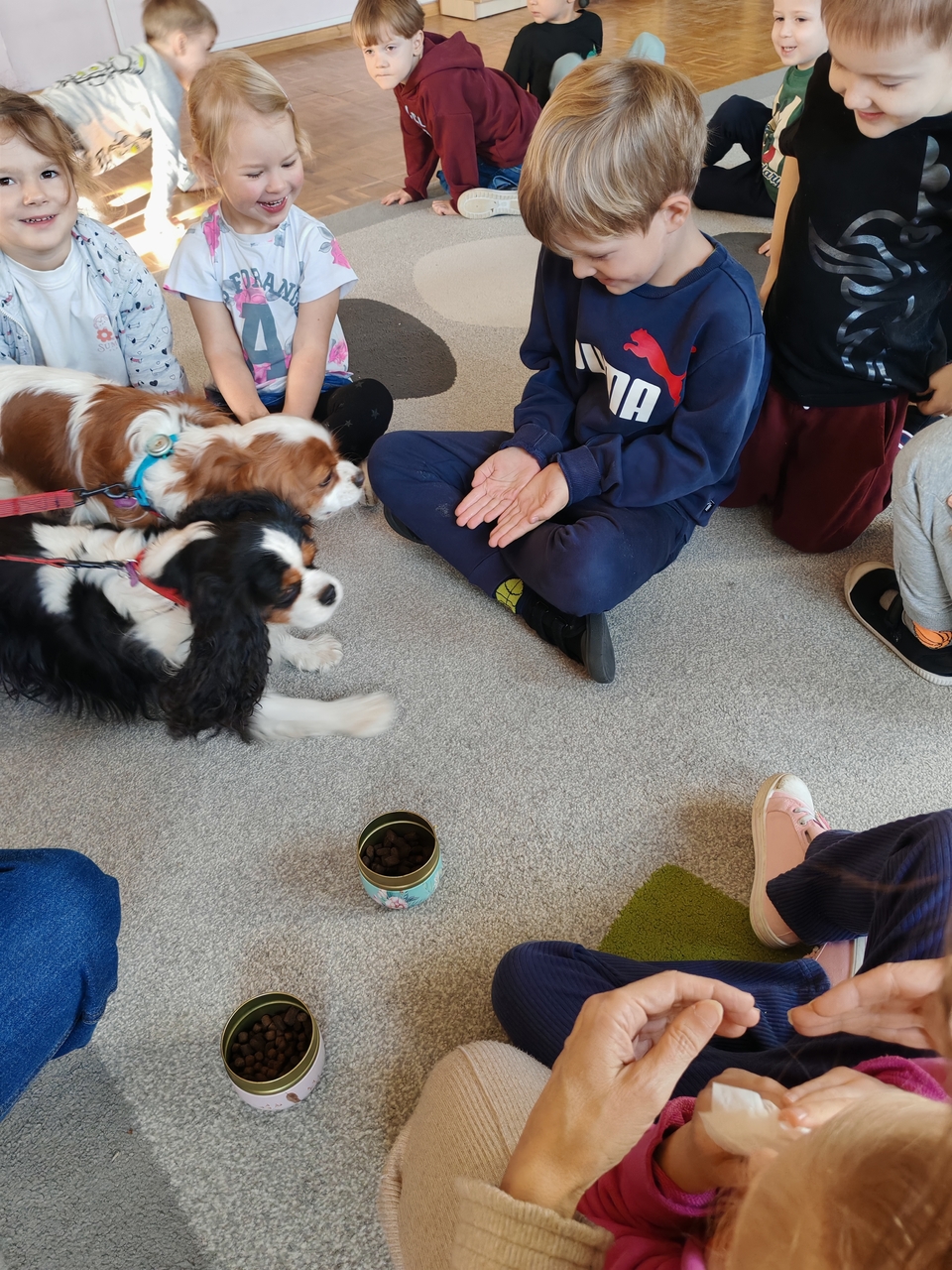 Pszczółki miały dzisiaj bardzo miłe spotkanie, odwiedziły je Pani Magdalenie Nowak, z córką Basią oraz ze swoimi pieskami rasy Cavalier King Charles Spaniel. Dzieci dowiedziały się jak opiekować się pieskami, co jest potrzebne do ich pielęgnacji, a także jakie umiejętności mają pieski. Miały również okazję nakarmić małych gości smakołykami.