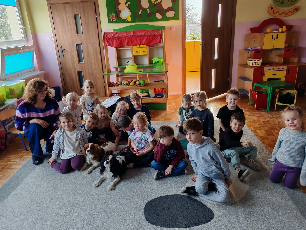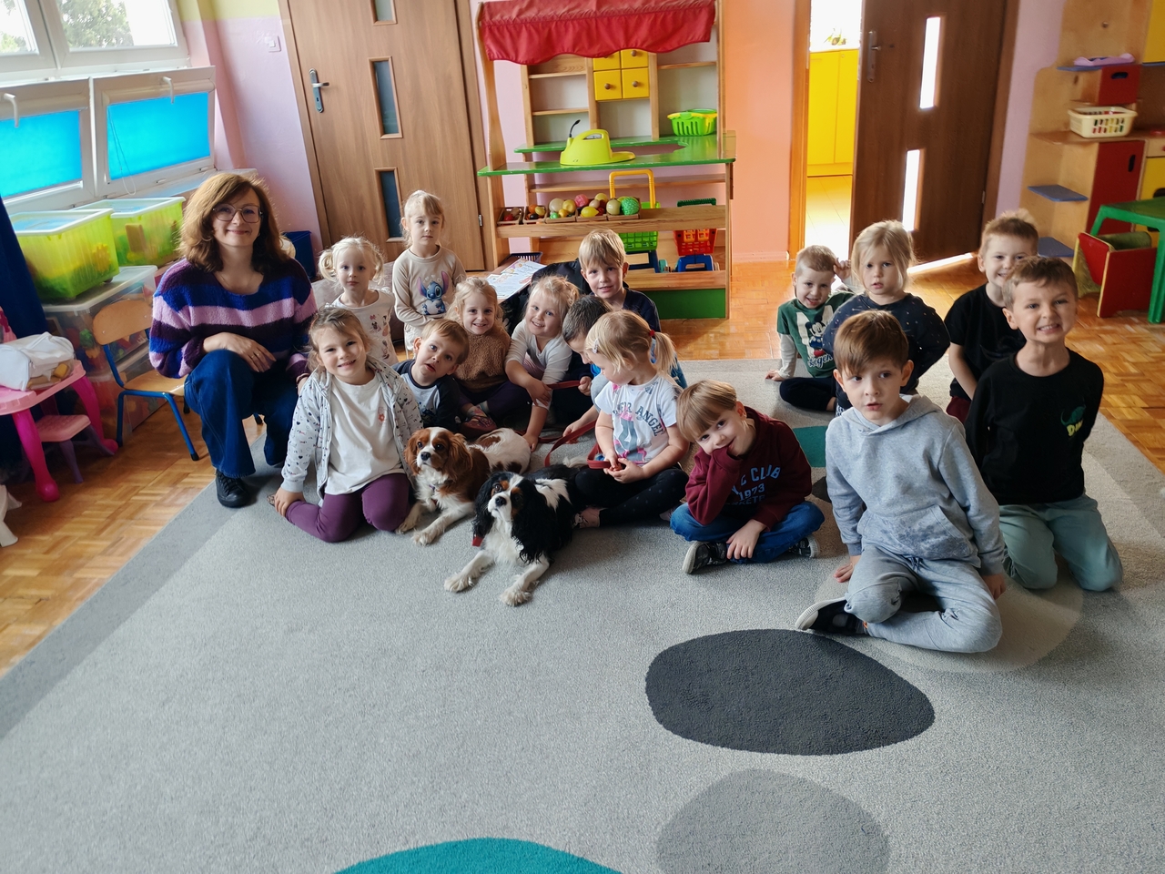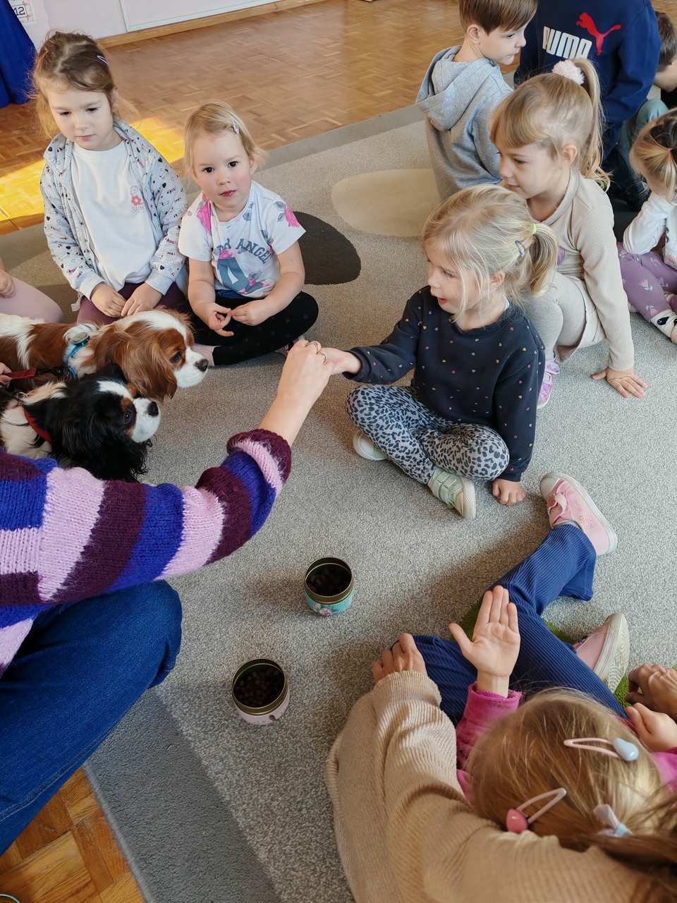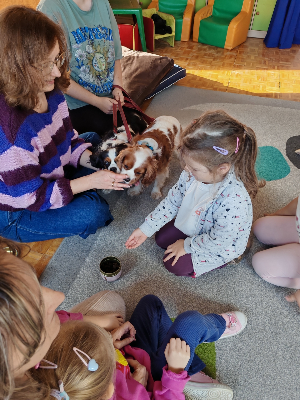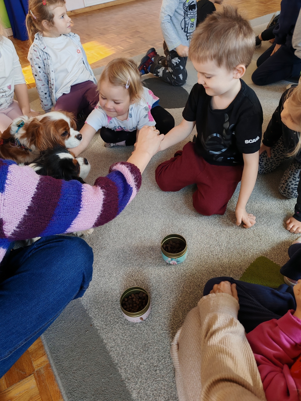 Pszczółki miały dzisiaj bardzo miłe spotkanie, odwiedziły je Pani Magdalenie Nowak, z córką Basią oraz ze swoimi pieskami rasy Cavalier King Charles Spaniel. Dzieci dowiedziały się jak opiekować się pieskami, co jest potrzebne do ich pielęgnacji, a także jakie umiejętności mają pieski. Miały również okazję nakarmić małych gości smakołykami.