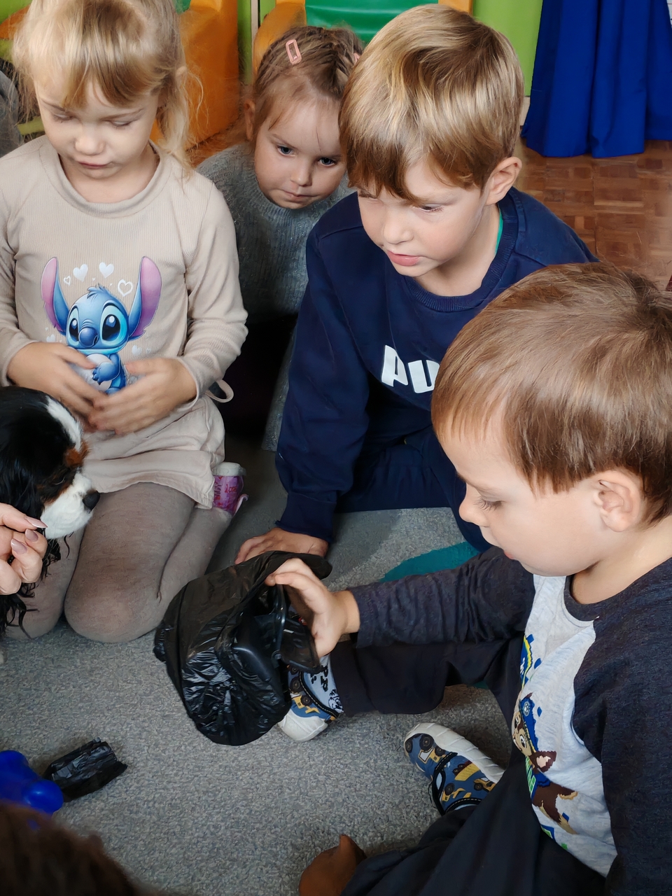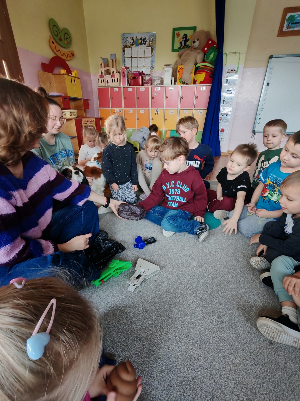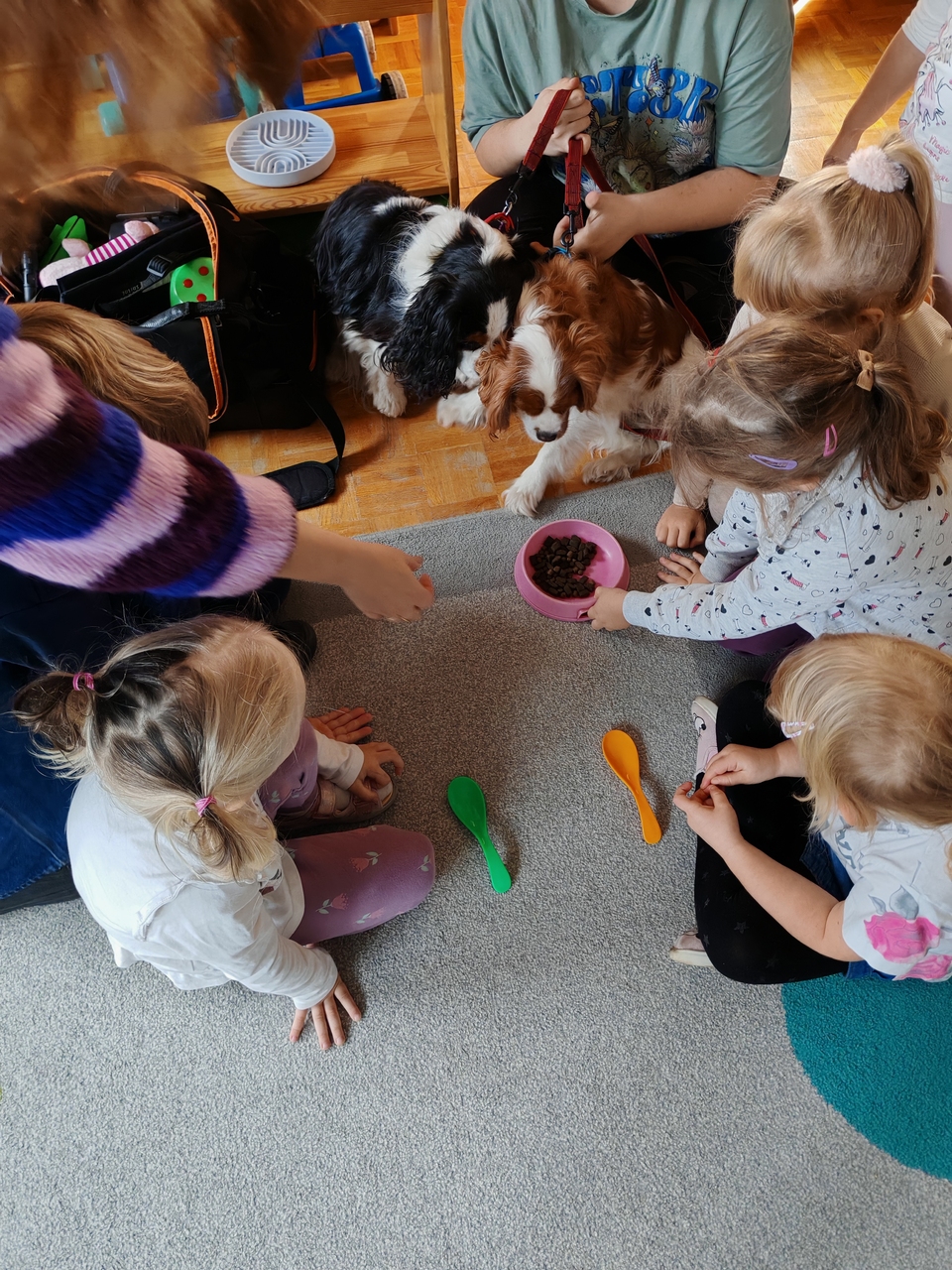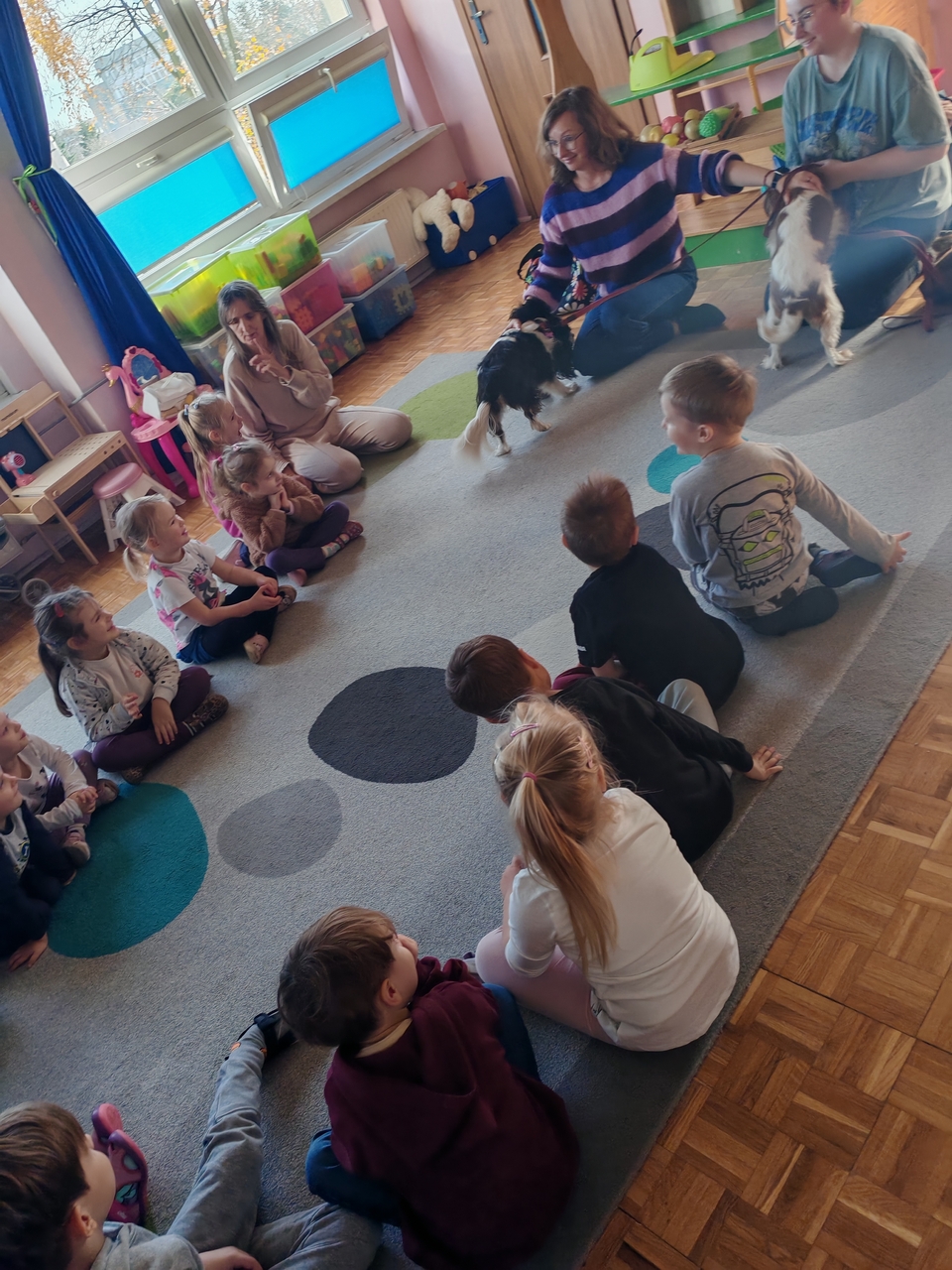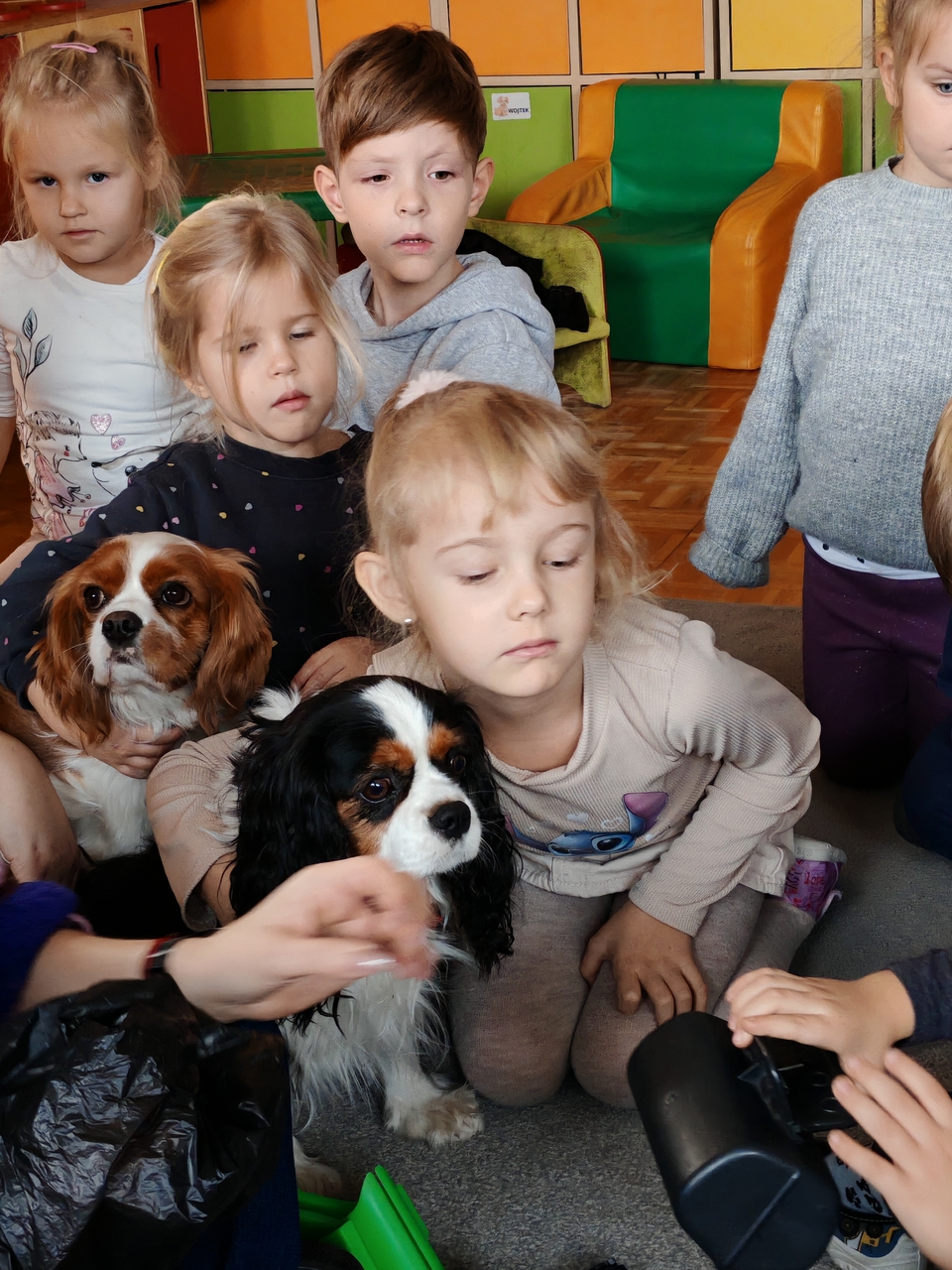 Pszczółki miały dzisiaj bardzo miłe spotkanie, odwiedziły je Pani Magdalenie Nowak, z córką Basią oraz ze swoimi pieskami rasy Cavalier King Charles Spaniel. Dzieci dowiedziały się jak opiekować się pieskami, co jest potrzebne do ich pielęgnacji, a także jakie umiejętności mają pieski. Miały również okazję nakarmić małych gości smakołykami.