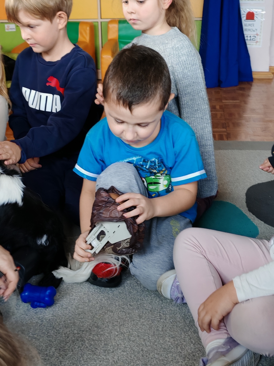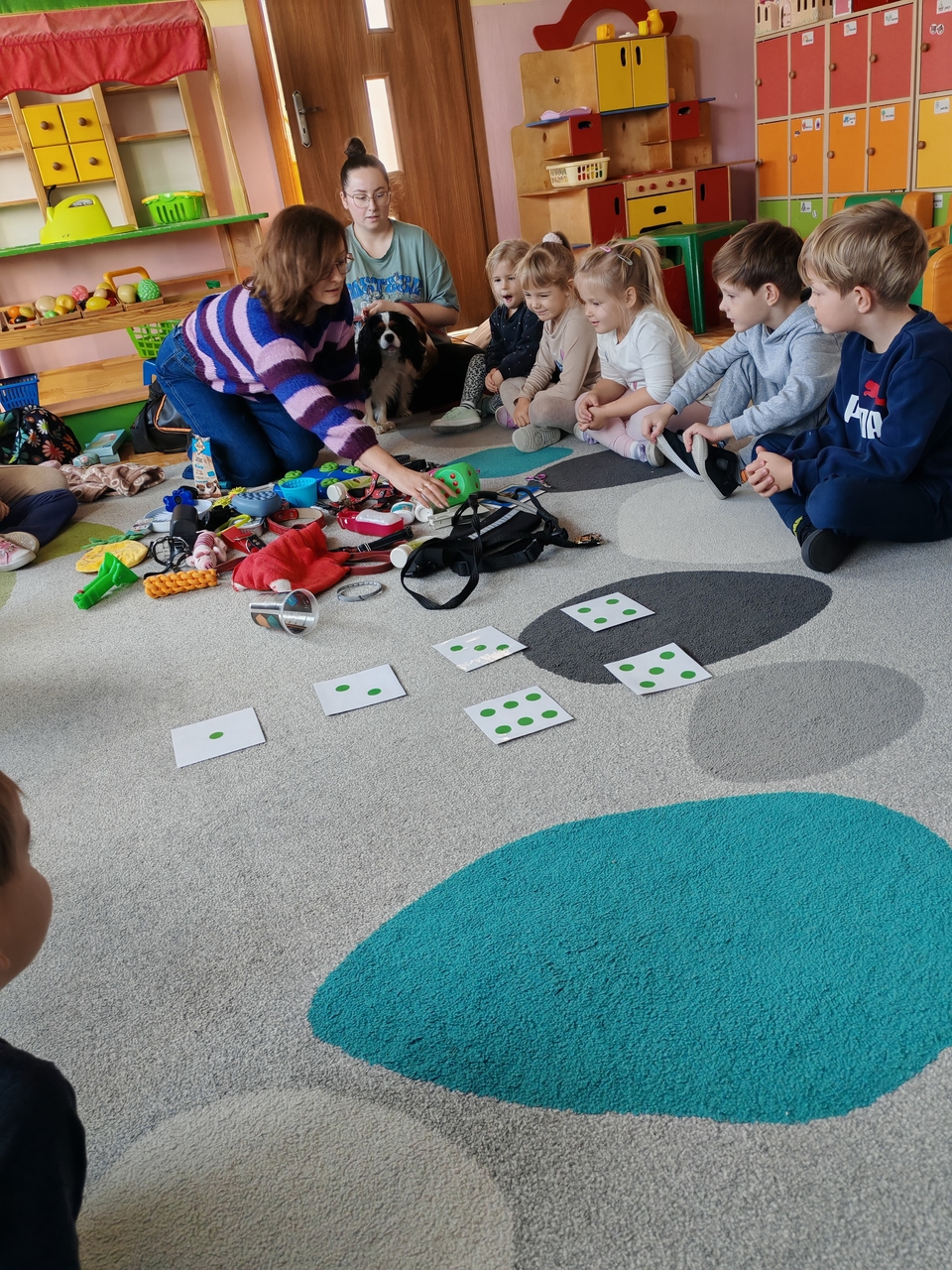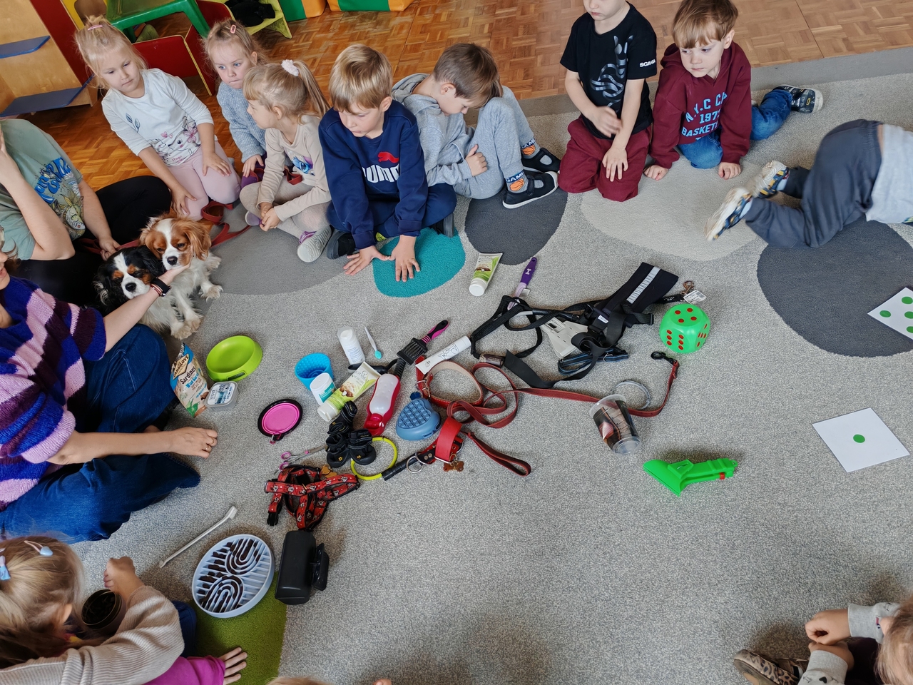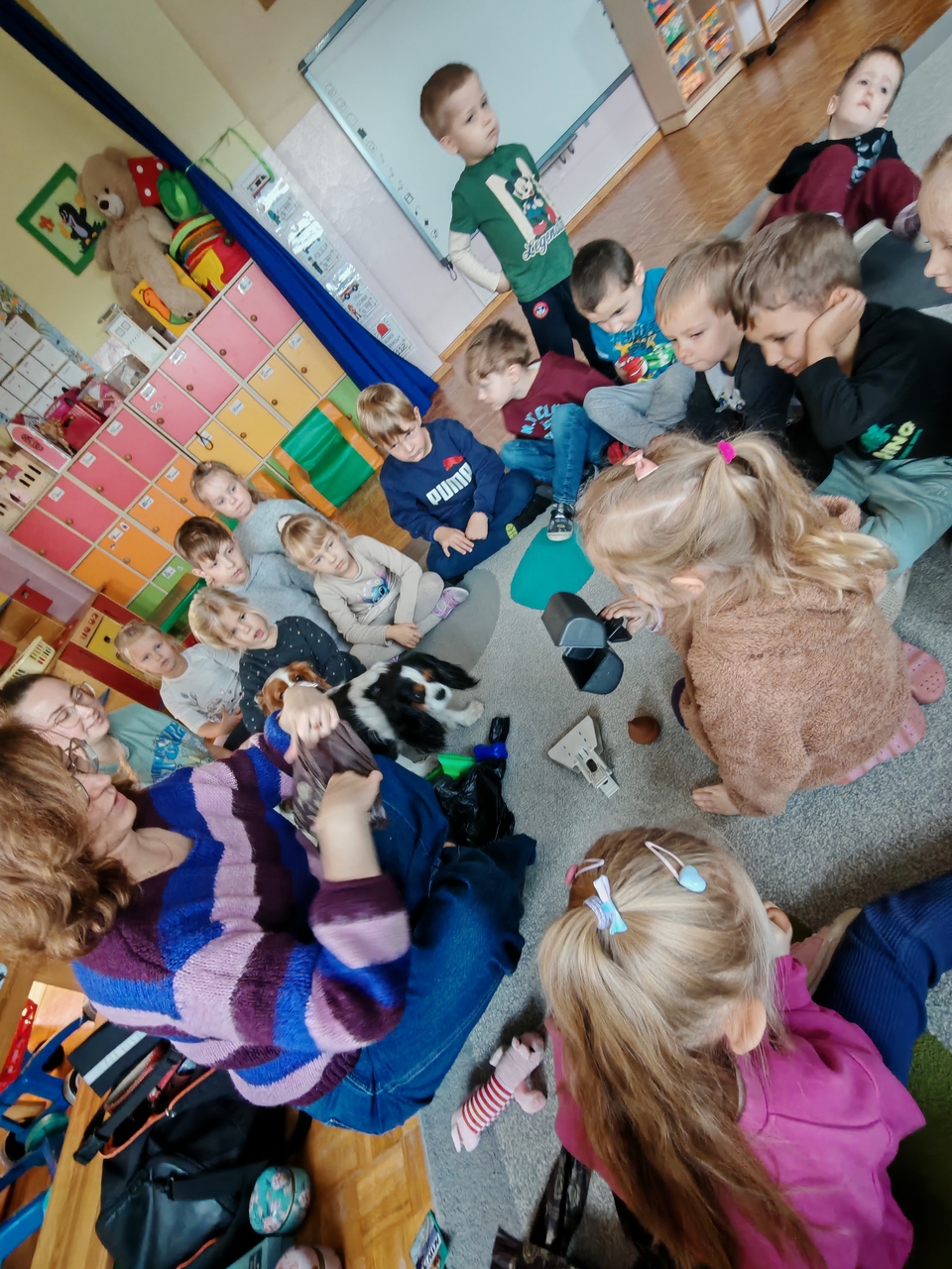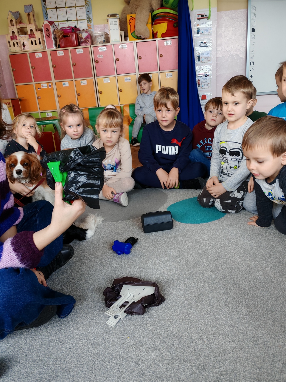 Pszczółki miały dzisiaj bardzo miłe spotkanie, odwiedziły je Pani Magdalenie Nowak, z córką Basią oraz ze swoimi pieskami rasy Cavalier King Charles Spaniel. Dzieci dowiedziały się jak opiekować się pieskami, co jest potrzebne do ich pielęgnacji, a także jakie umiejętności mają pieski. Miały również okazję nakarmić małych gości smakołykami.